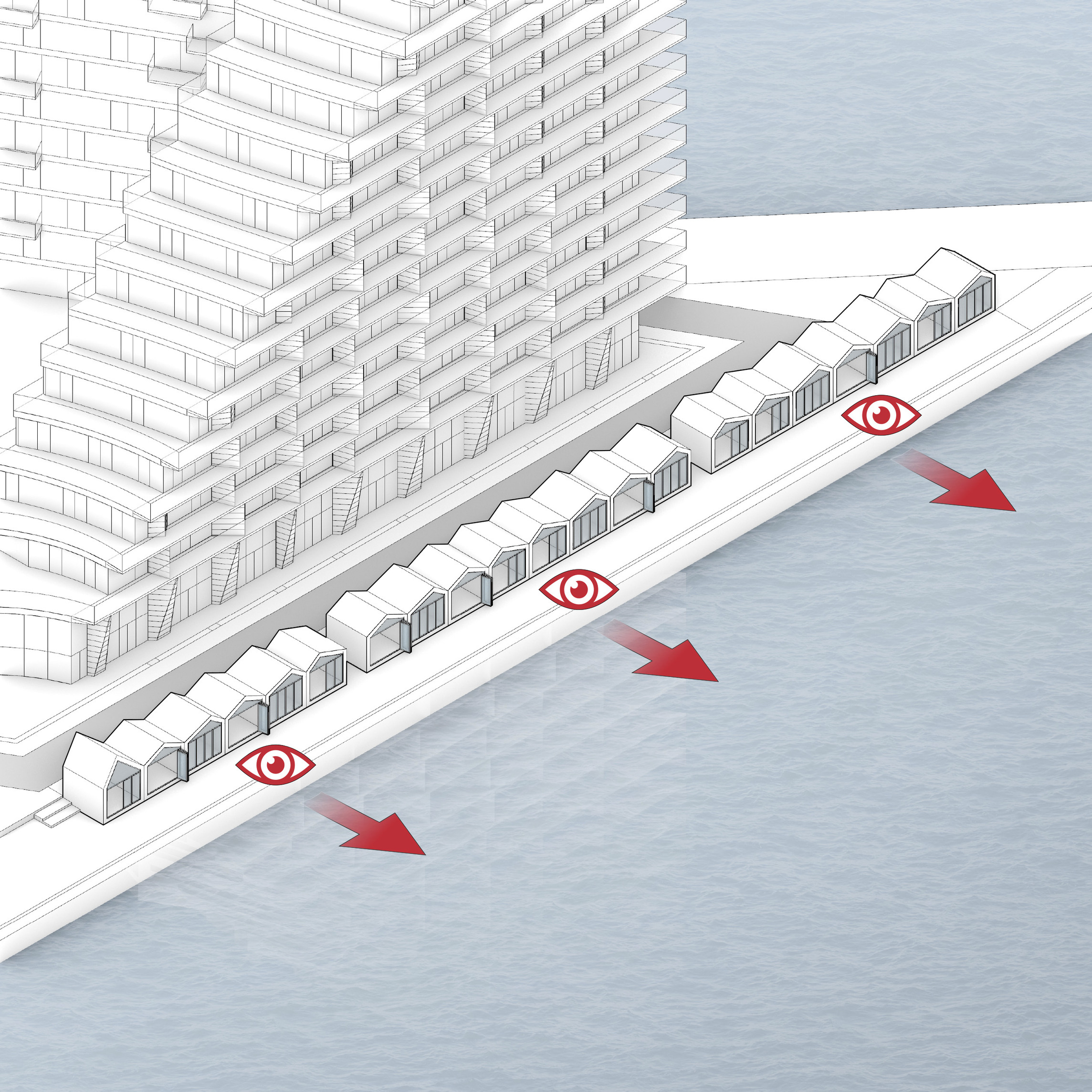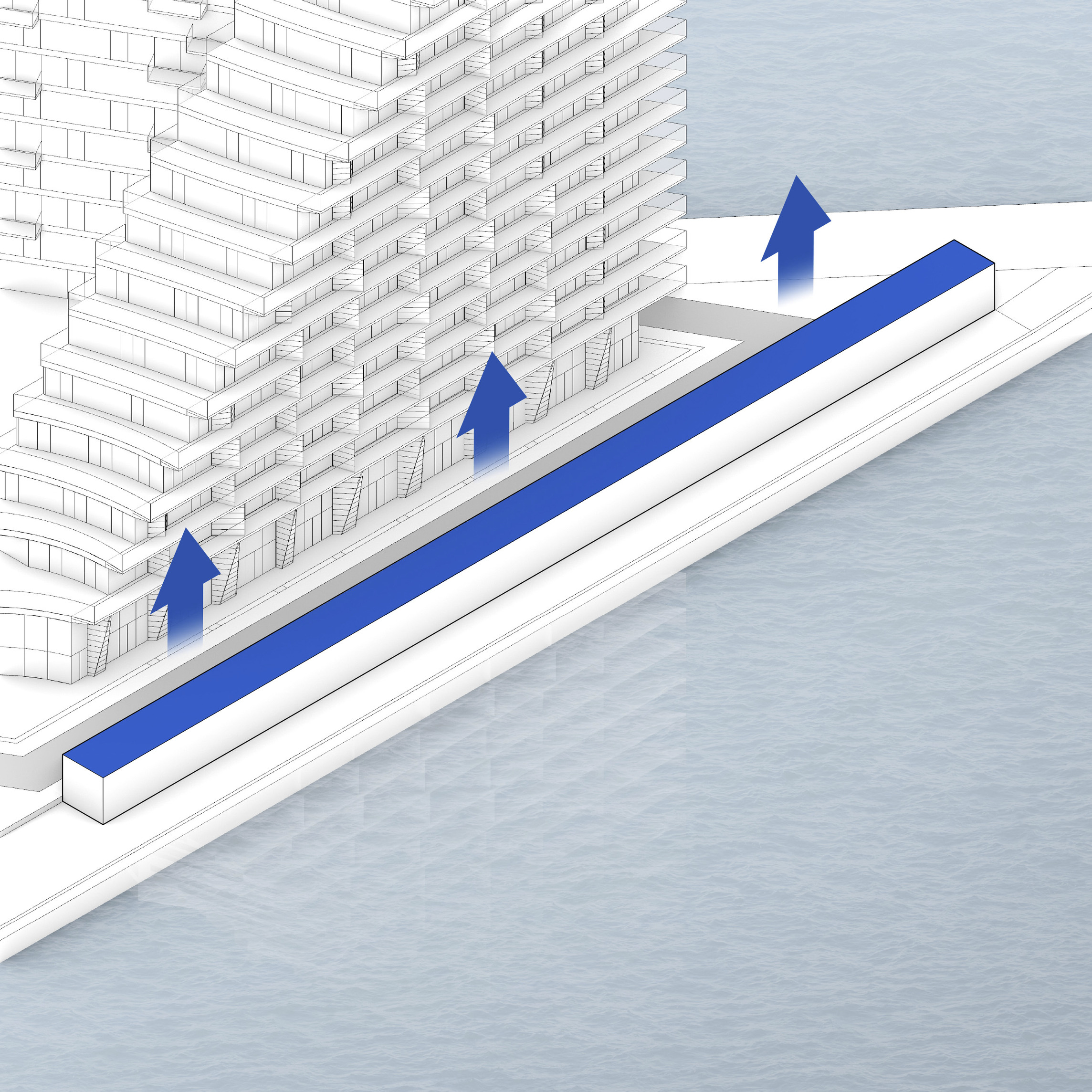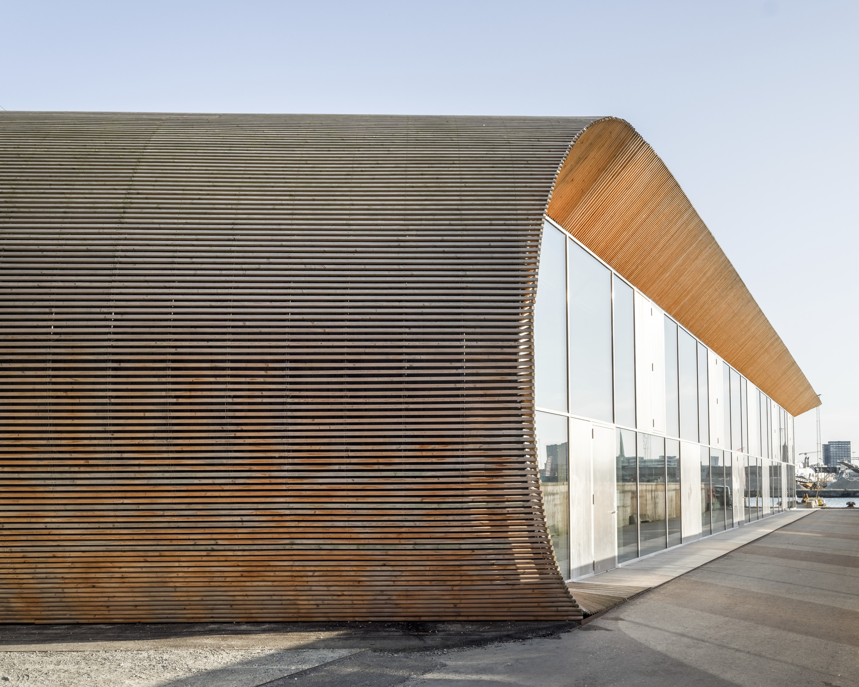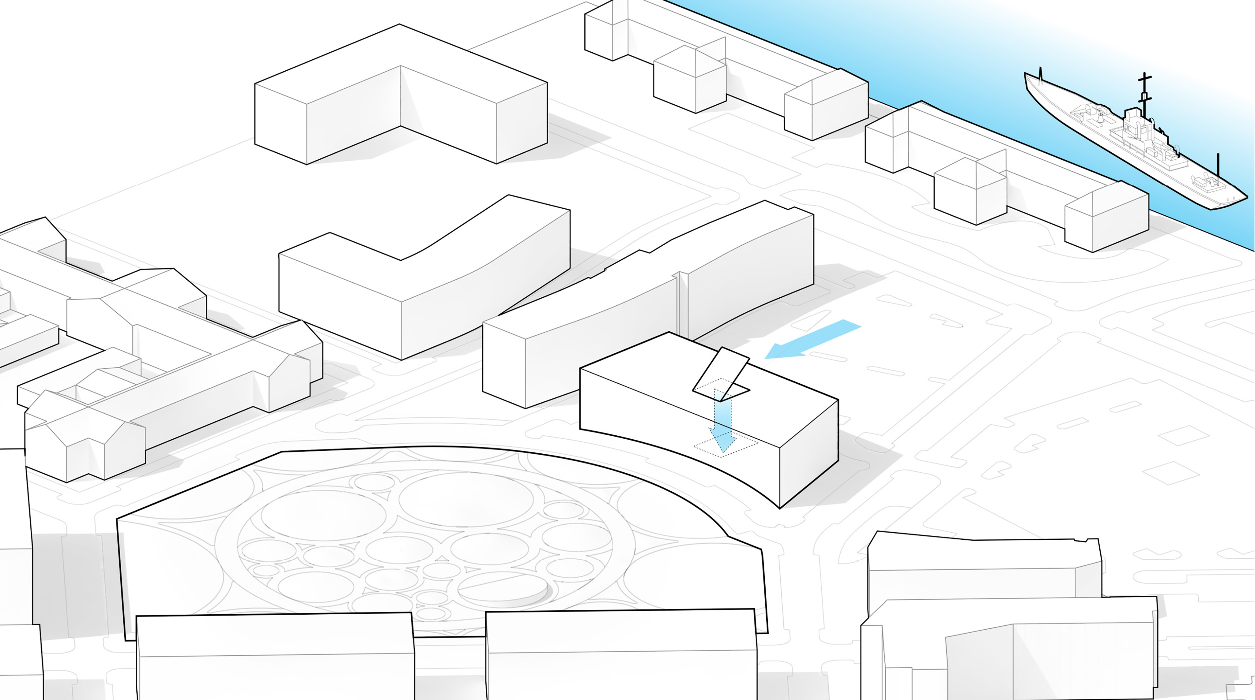“The ‘shock wave’ of the public space spreads like rings in the water, invading the footprint of the building to create a generous urban canopy at the entrance. The resultant double-curved façade echoes the complex yet rational geometries of maritime architecture. Inside, the elevator lobby forms an actual periscope, allowing people to admire the mothballed ships at the adjacent docks.”