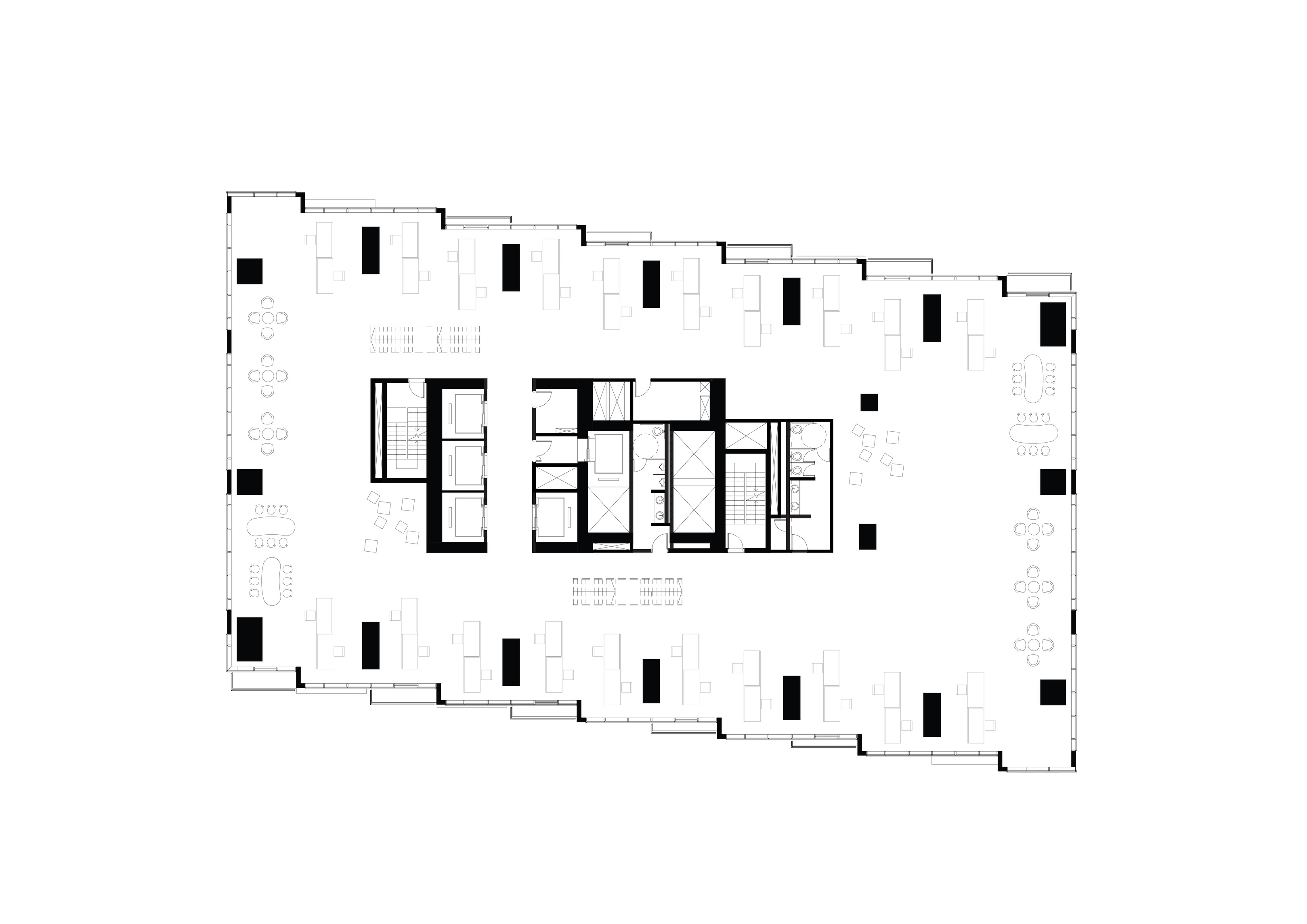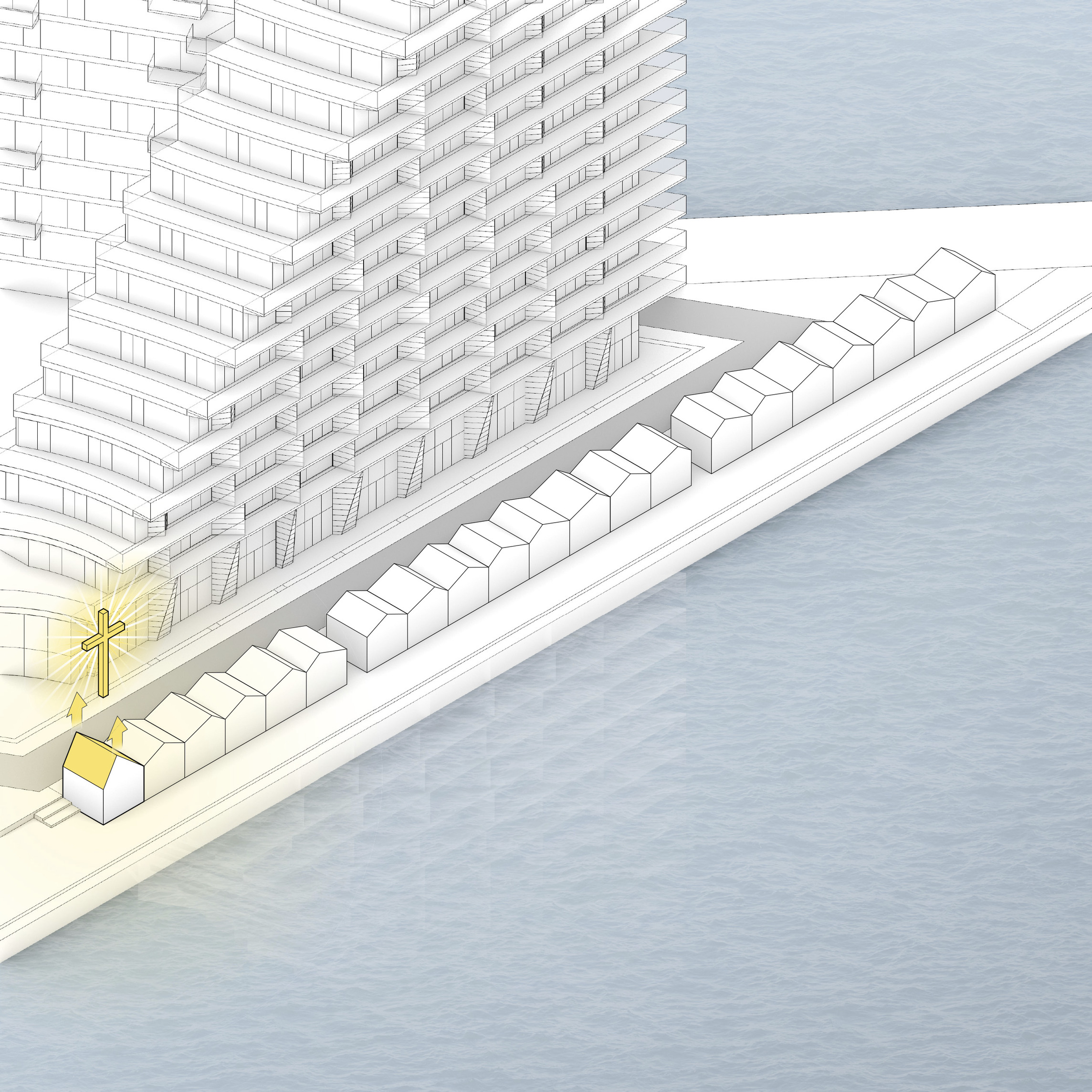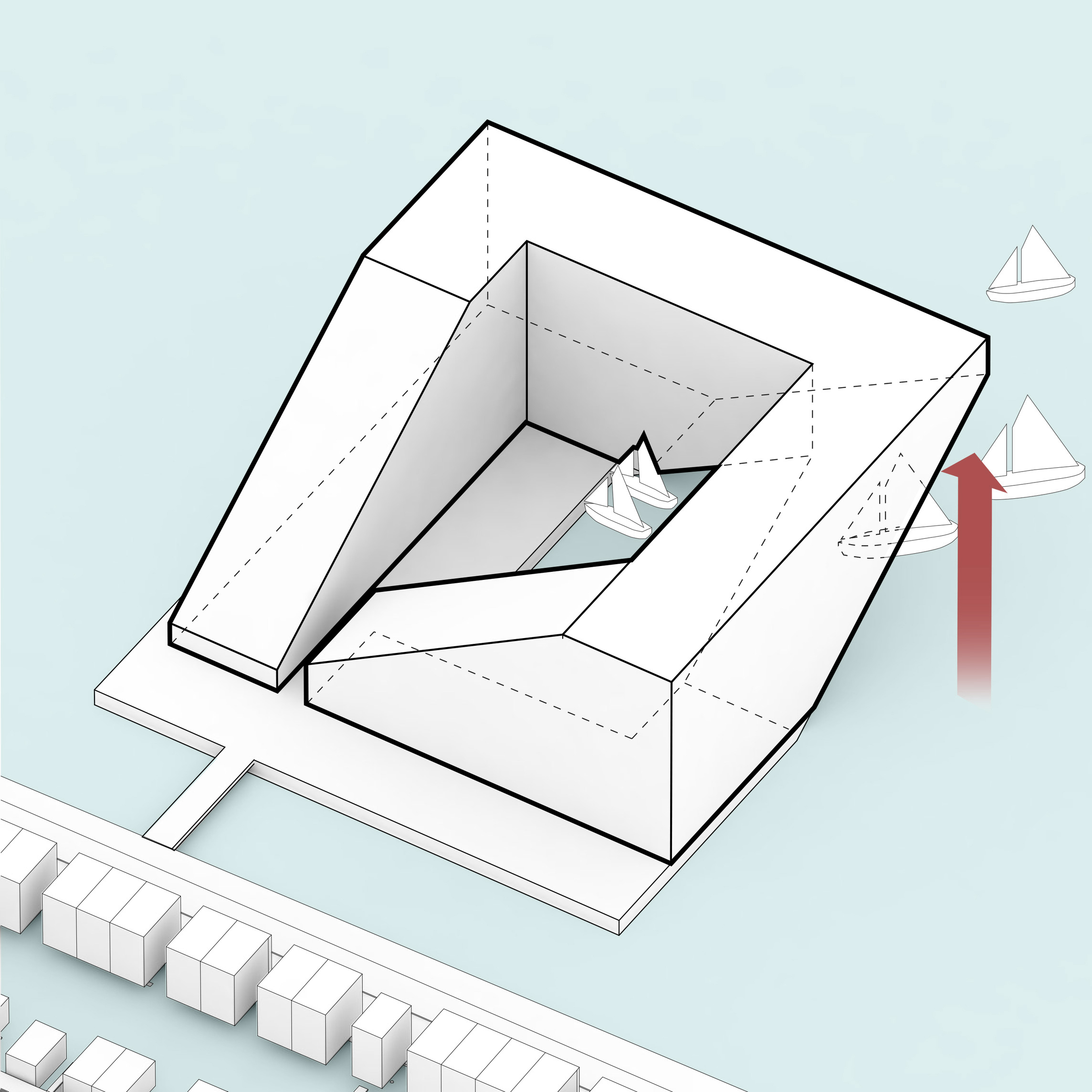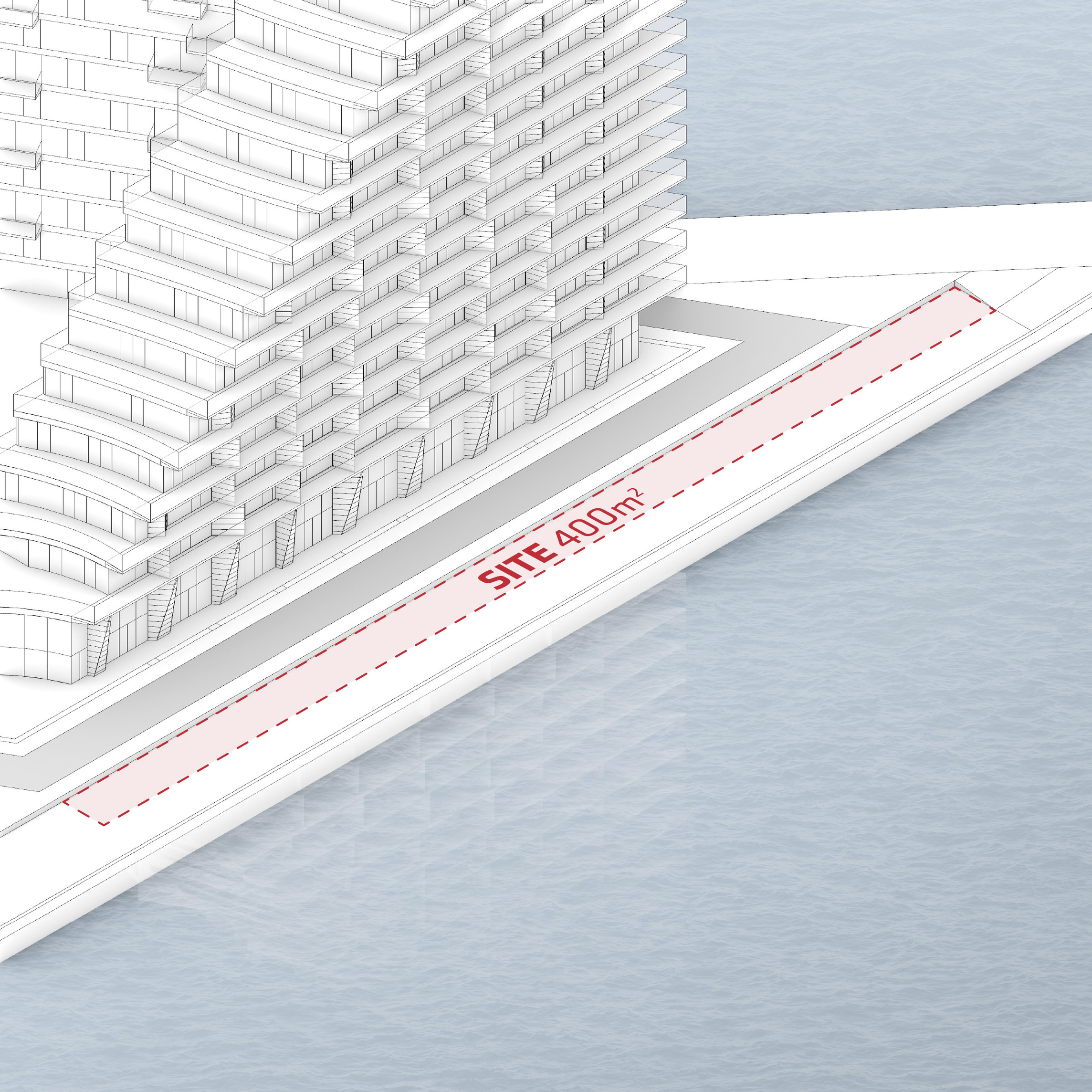 “The ‘shock wave’ of the public space spreads like rings in the water, invading the footprint of the building to create a generous urban canopy at the entrance. The resultant double-curved façade echoes the complex yet rational geometries of maritime architecture. Inside, the elevator lobby forms an actual periscope, allowing people to admire the mothballed ships at the adjacent docks.”
