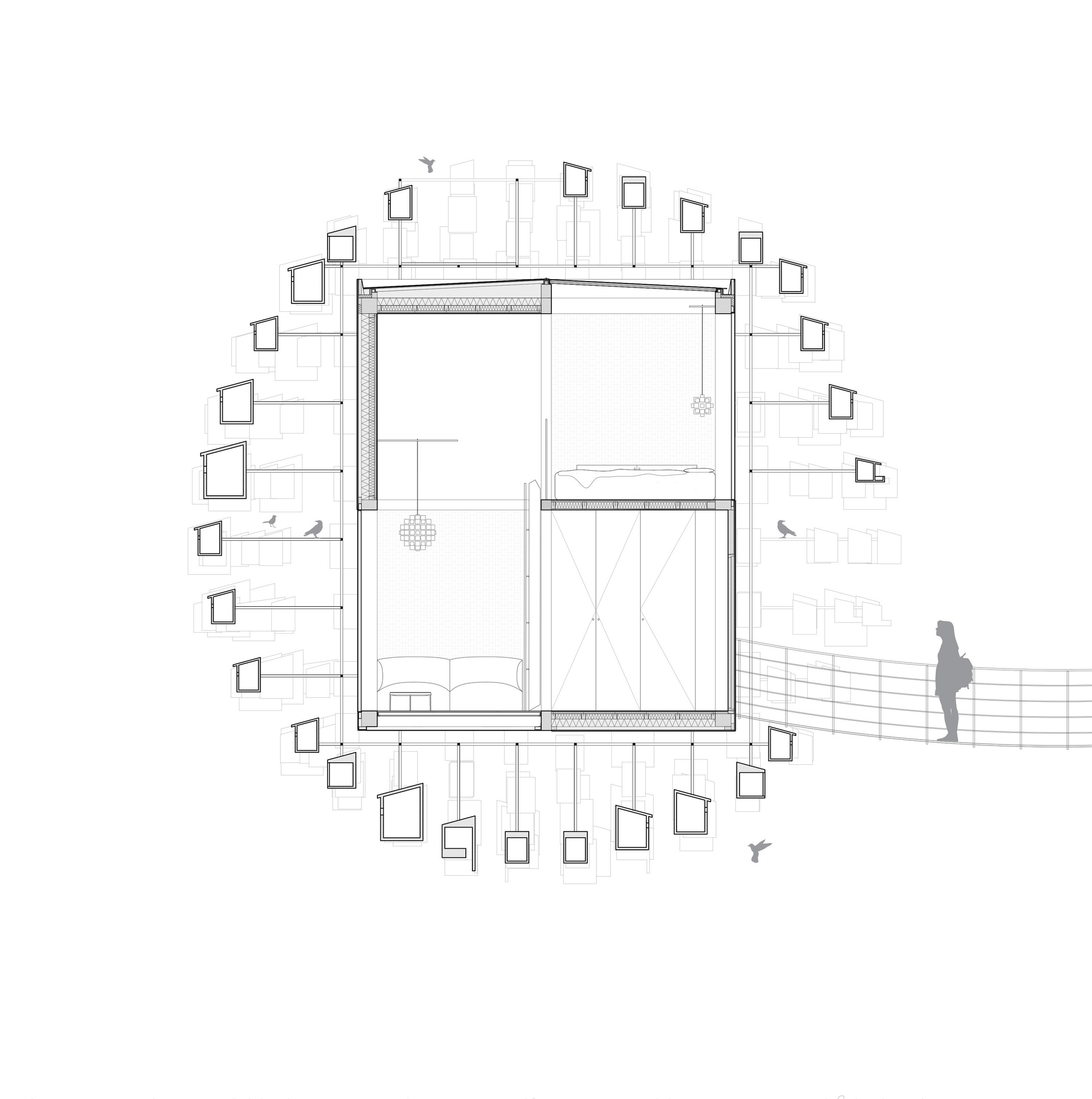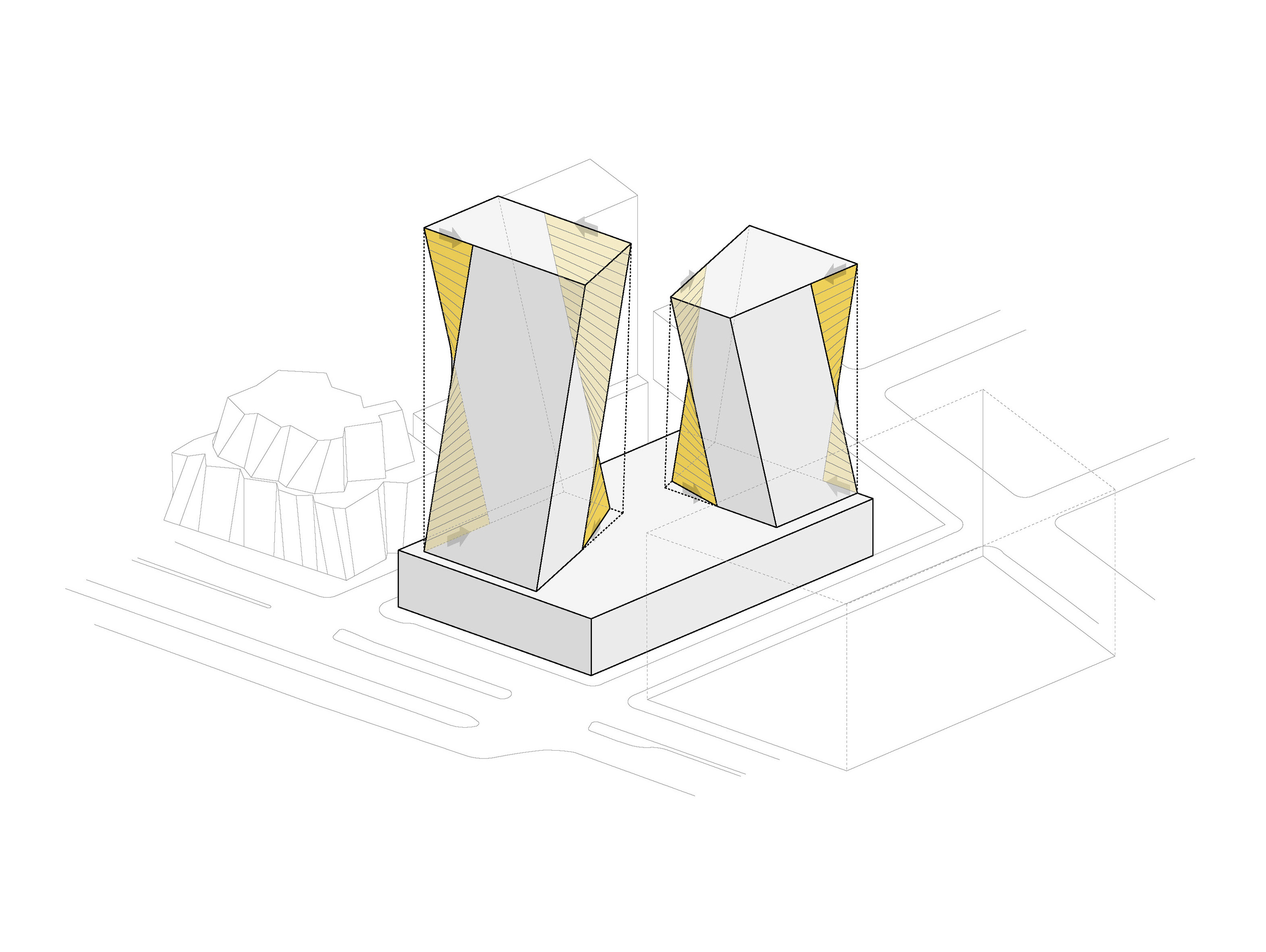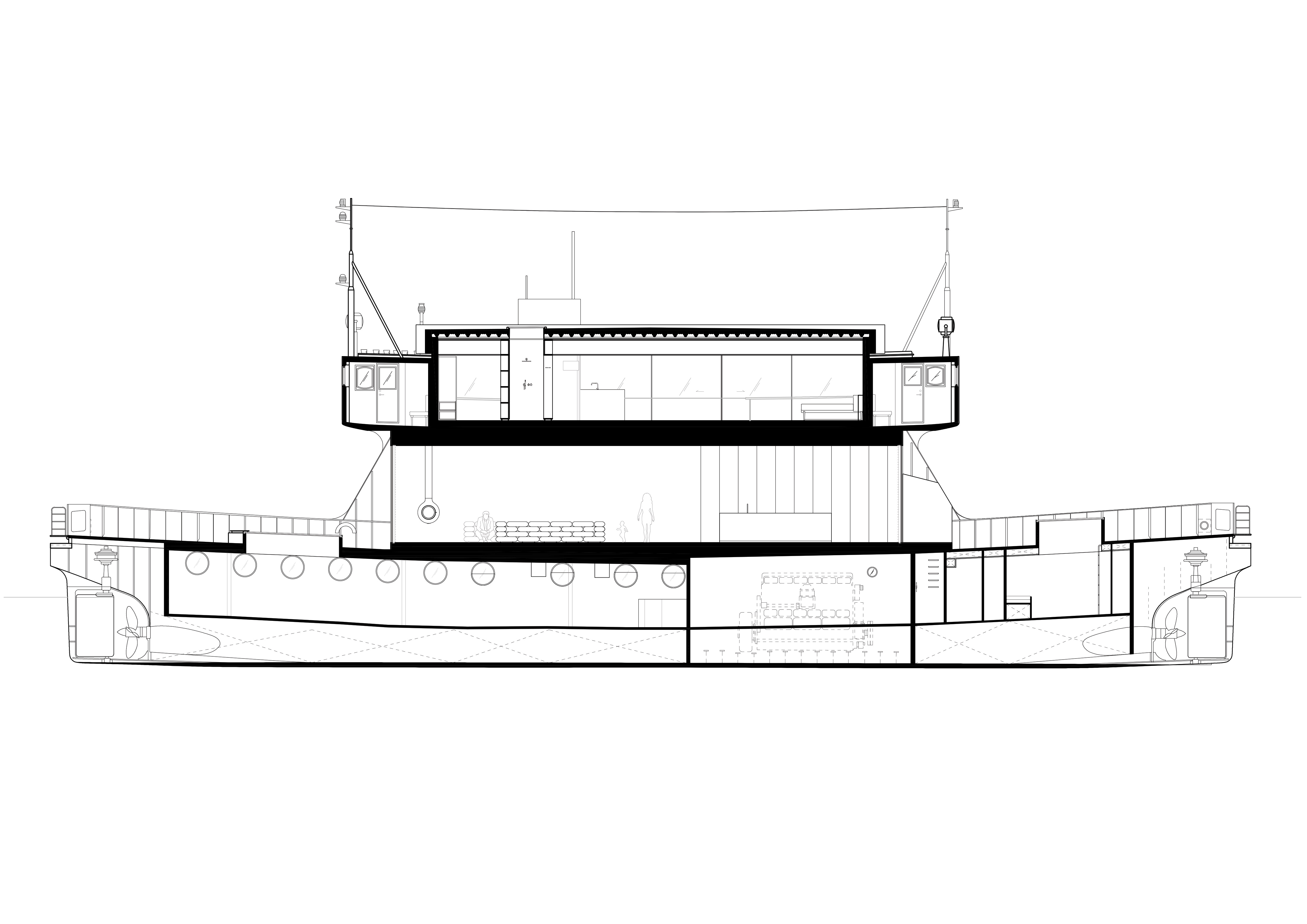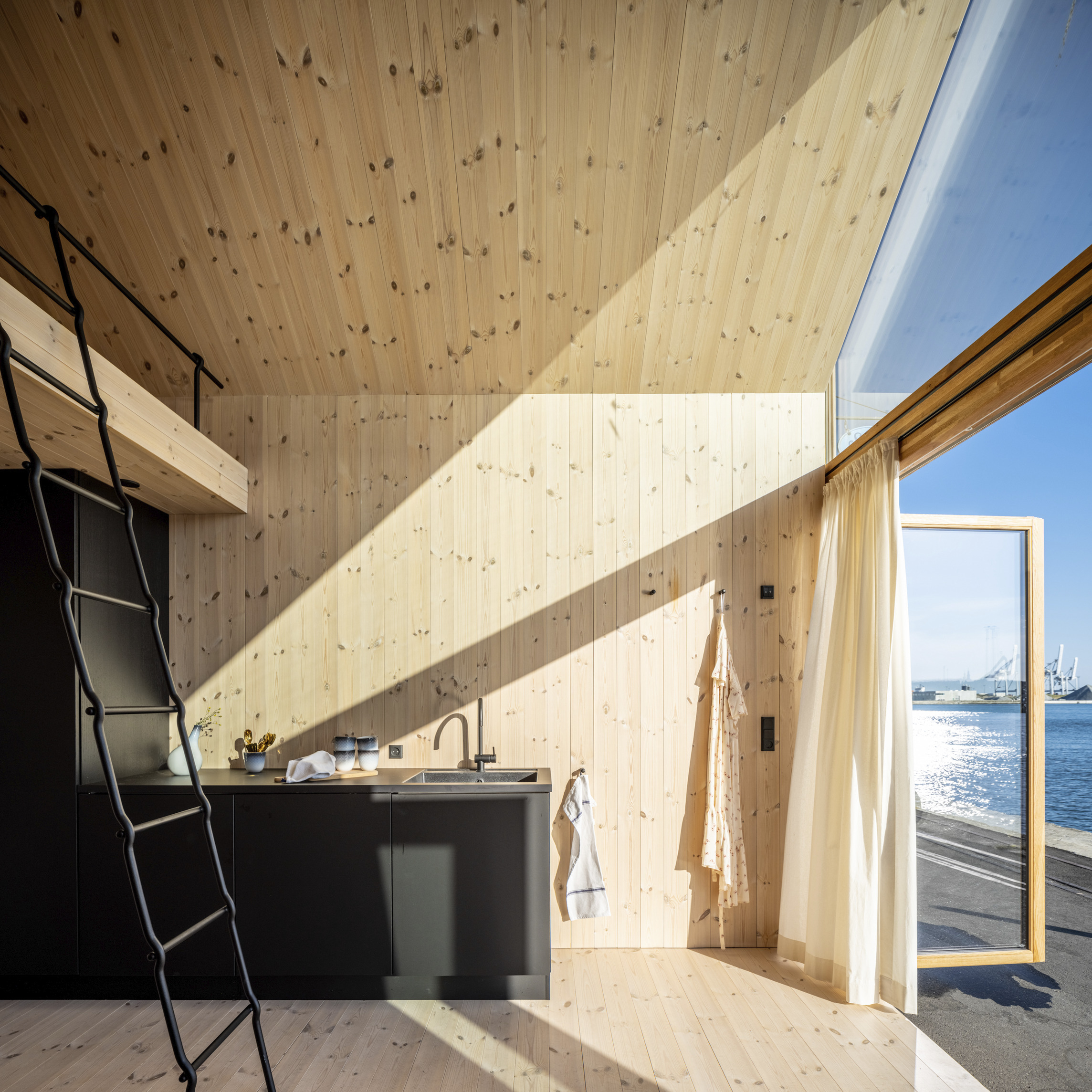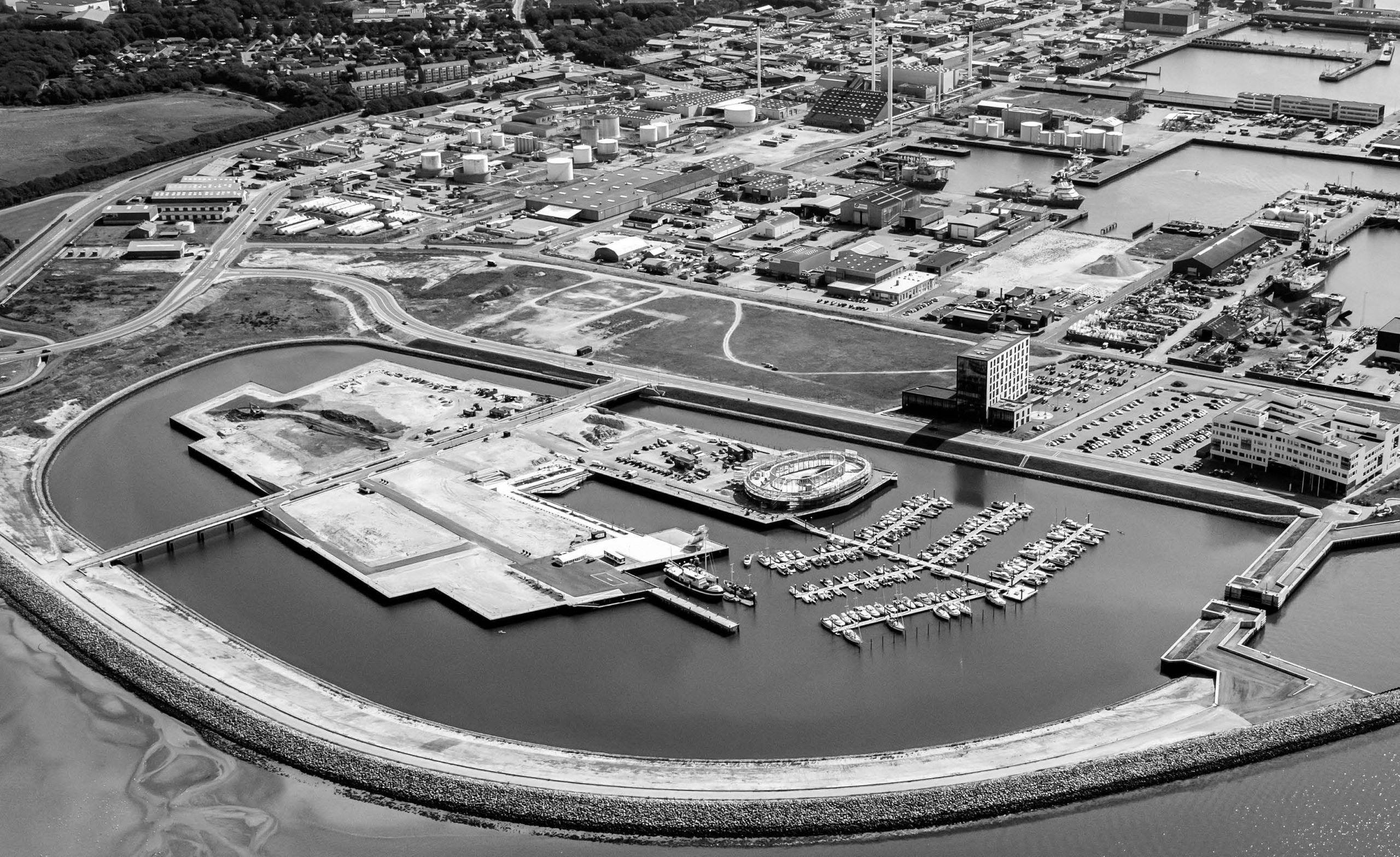 “The ‘shock wave’ of the public space spreads like rings in the water, invading the footprint of the building to create a generous urban canopy at the entrance. The resultant double-curved façade echoes the complex yet rational geometries of maritime architecture. Inside, the elevator lobby forms an actual periscope, allowing people to admire the mothballed ships at the adjacent docks.”