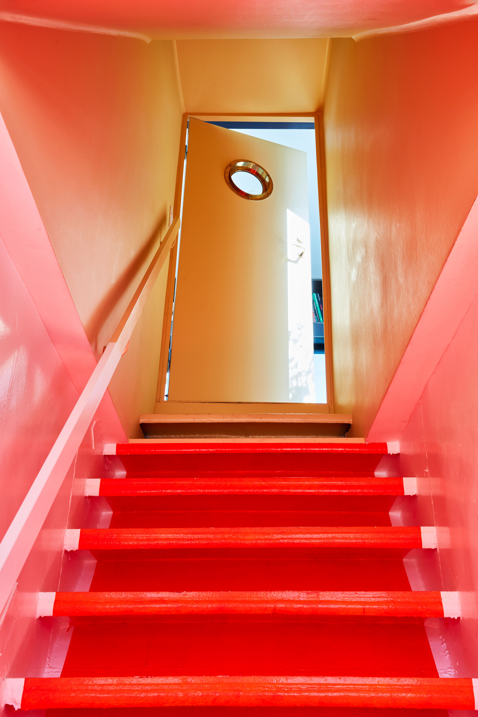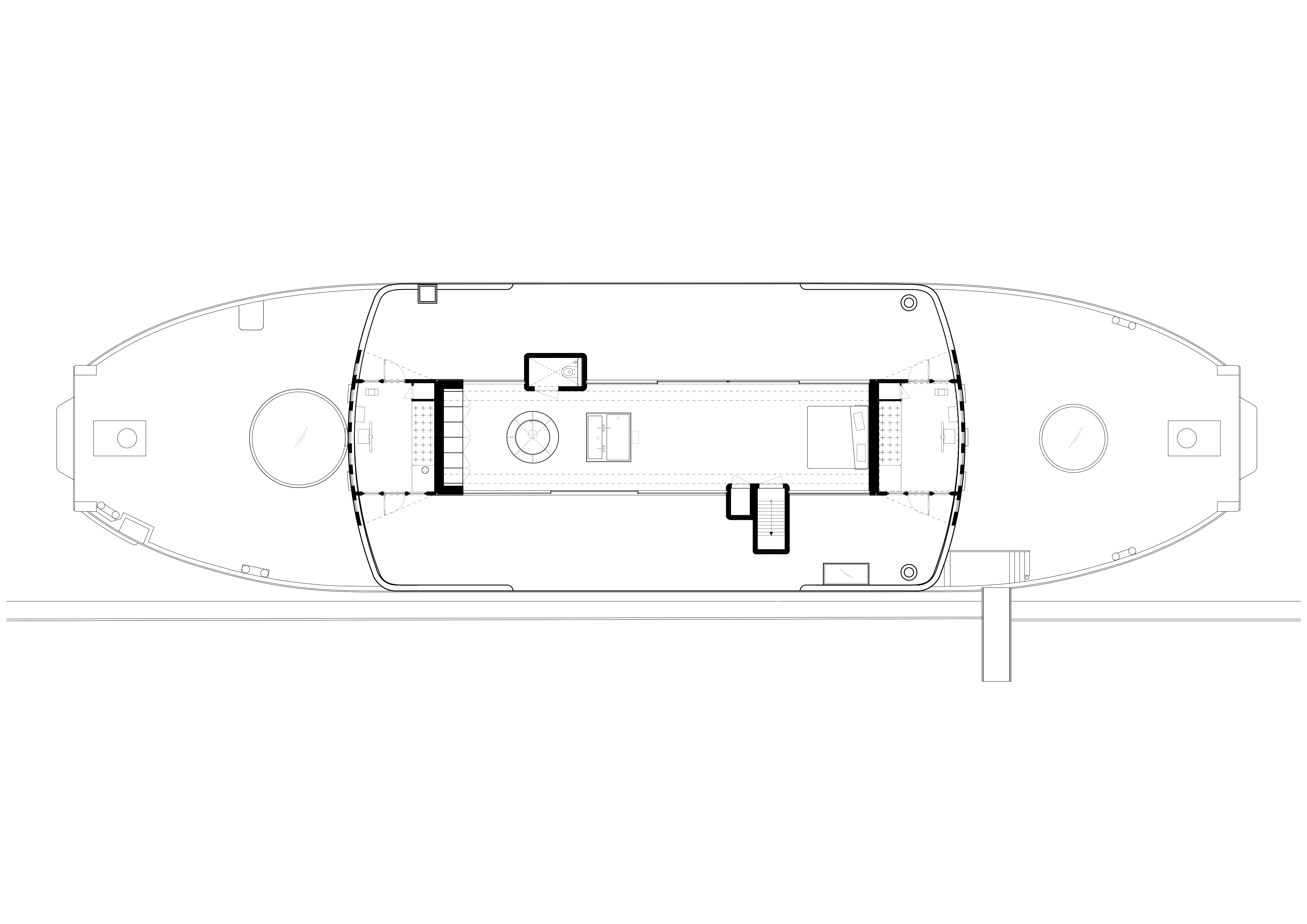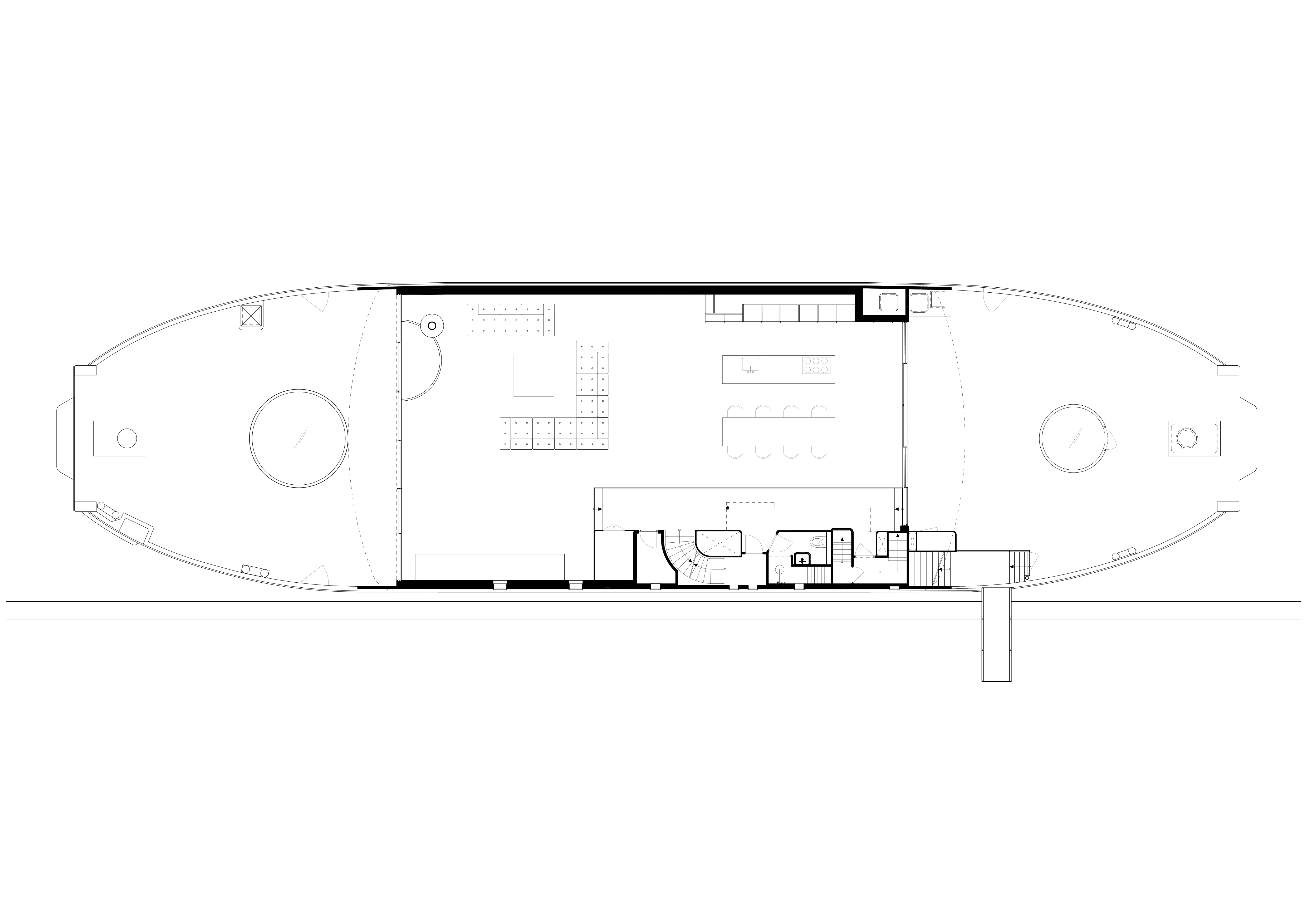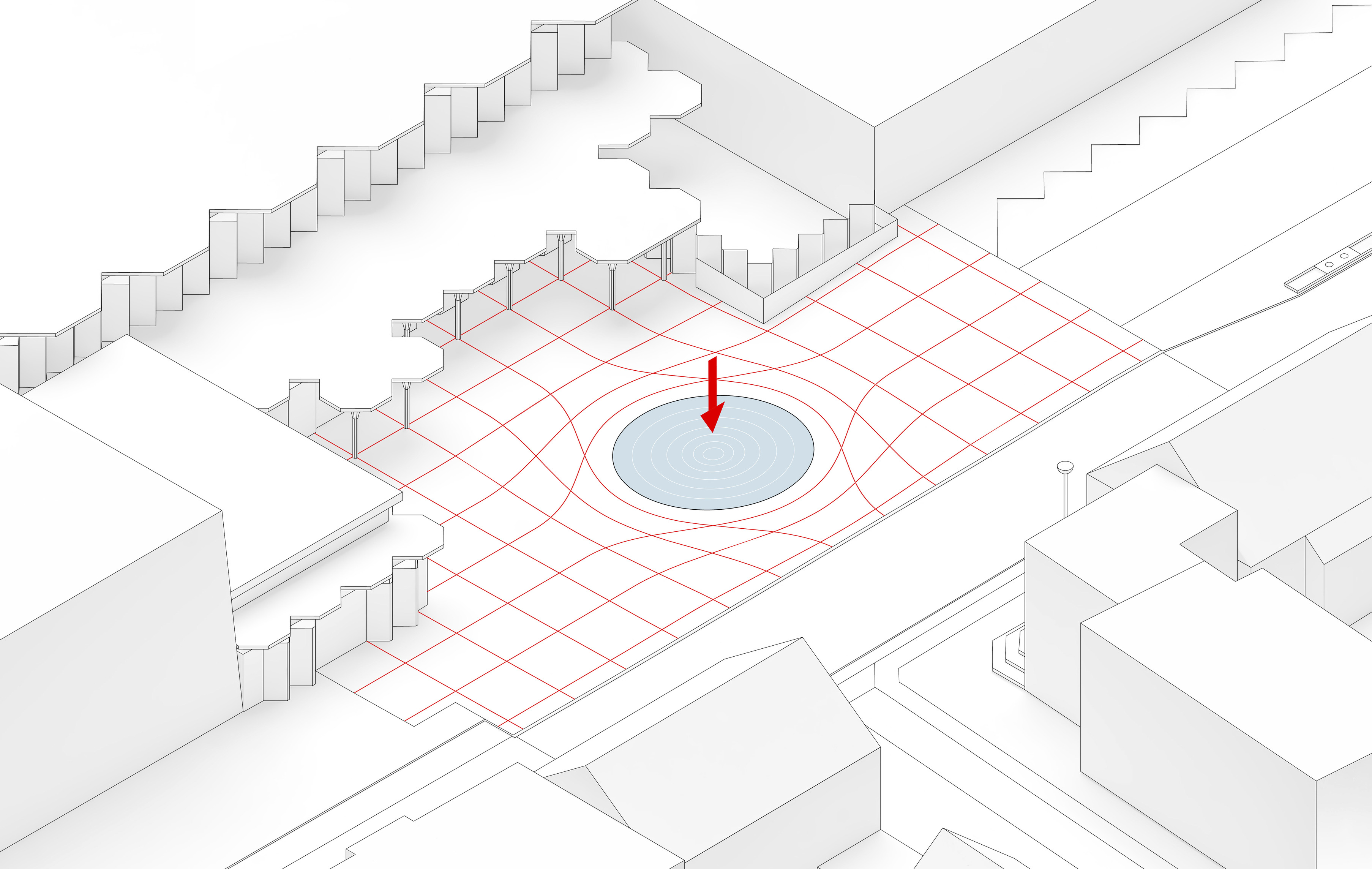 “The ‘shock wave’ of the public space spreads like rings in the water, invading the footprint of the building to create a generous urban canopy at the entrance. The resultant double-curved façade echoes the complex yet rational geometries of maritime architecture. Inside, the elevator lobby forms an actual periscope, allowing people to admire the mothballed ships at the adjacent docks.”