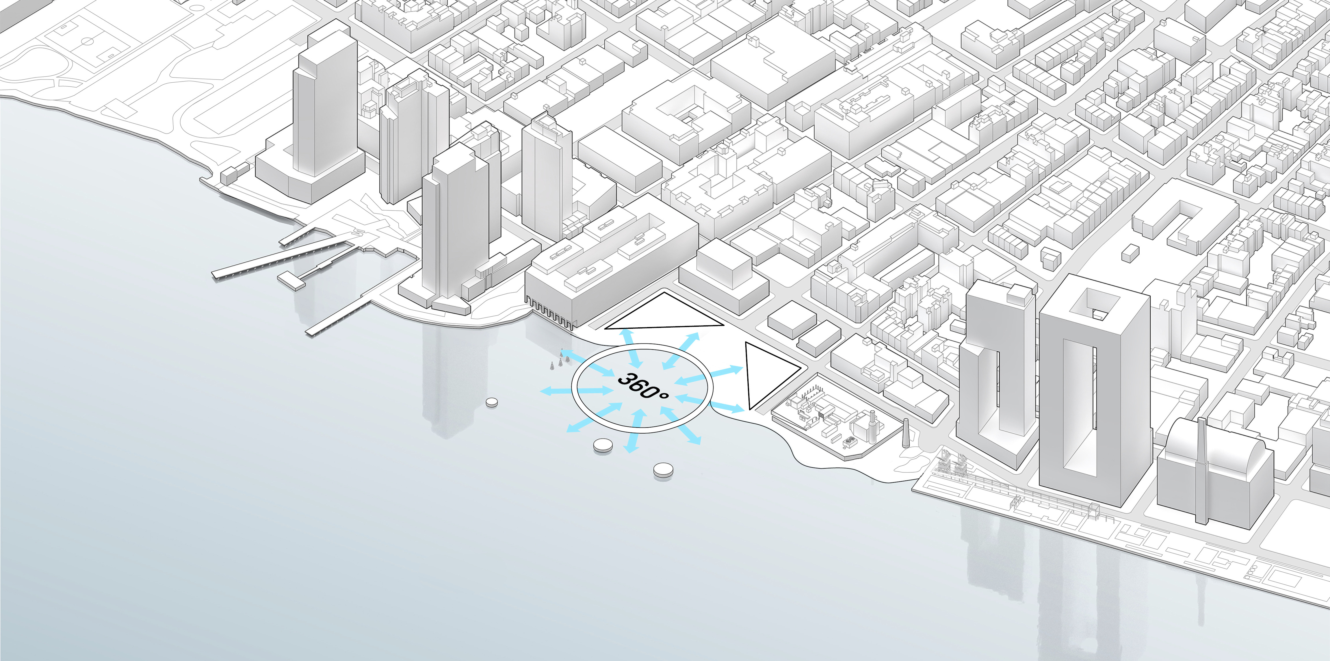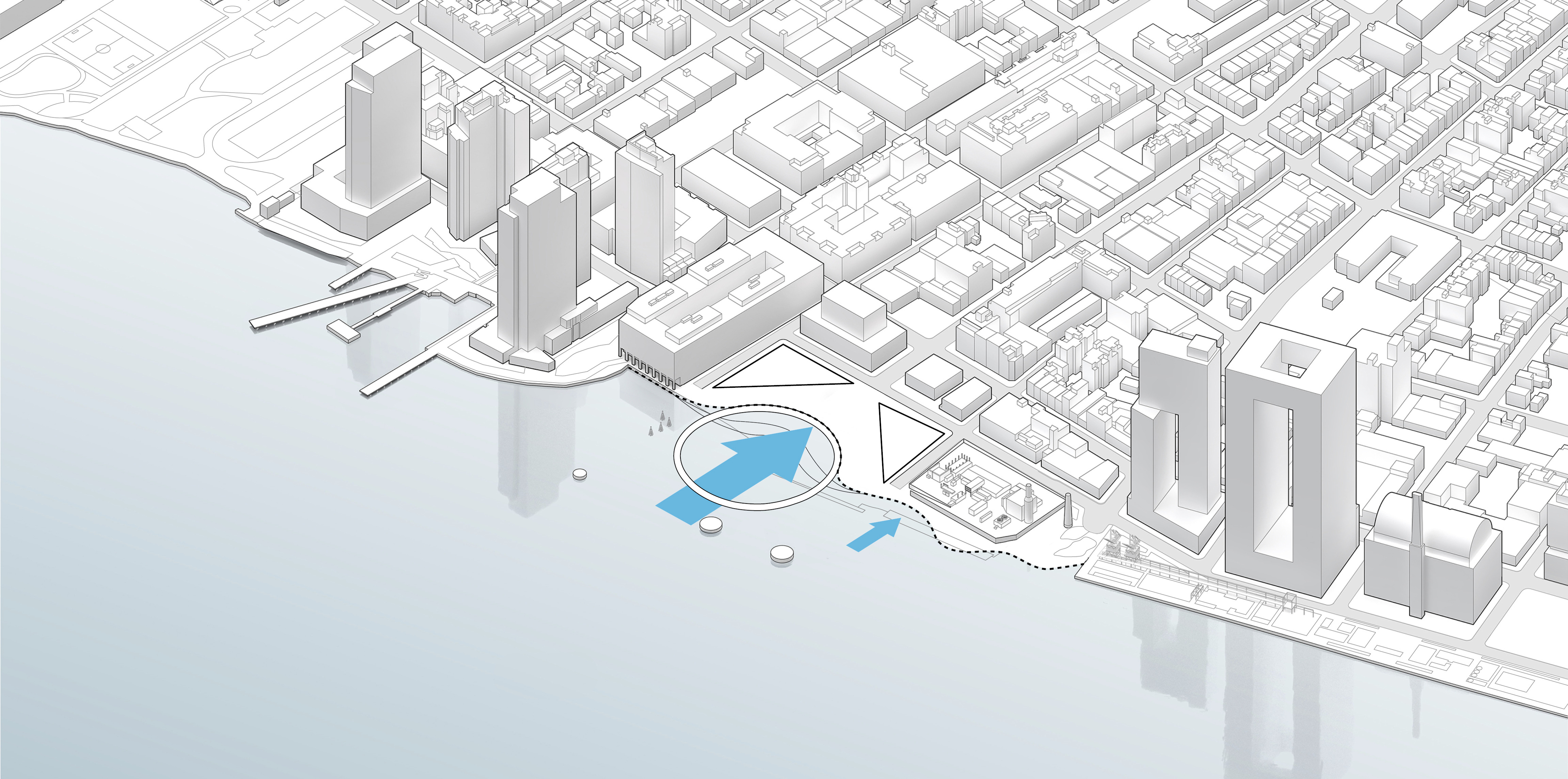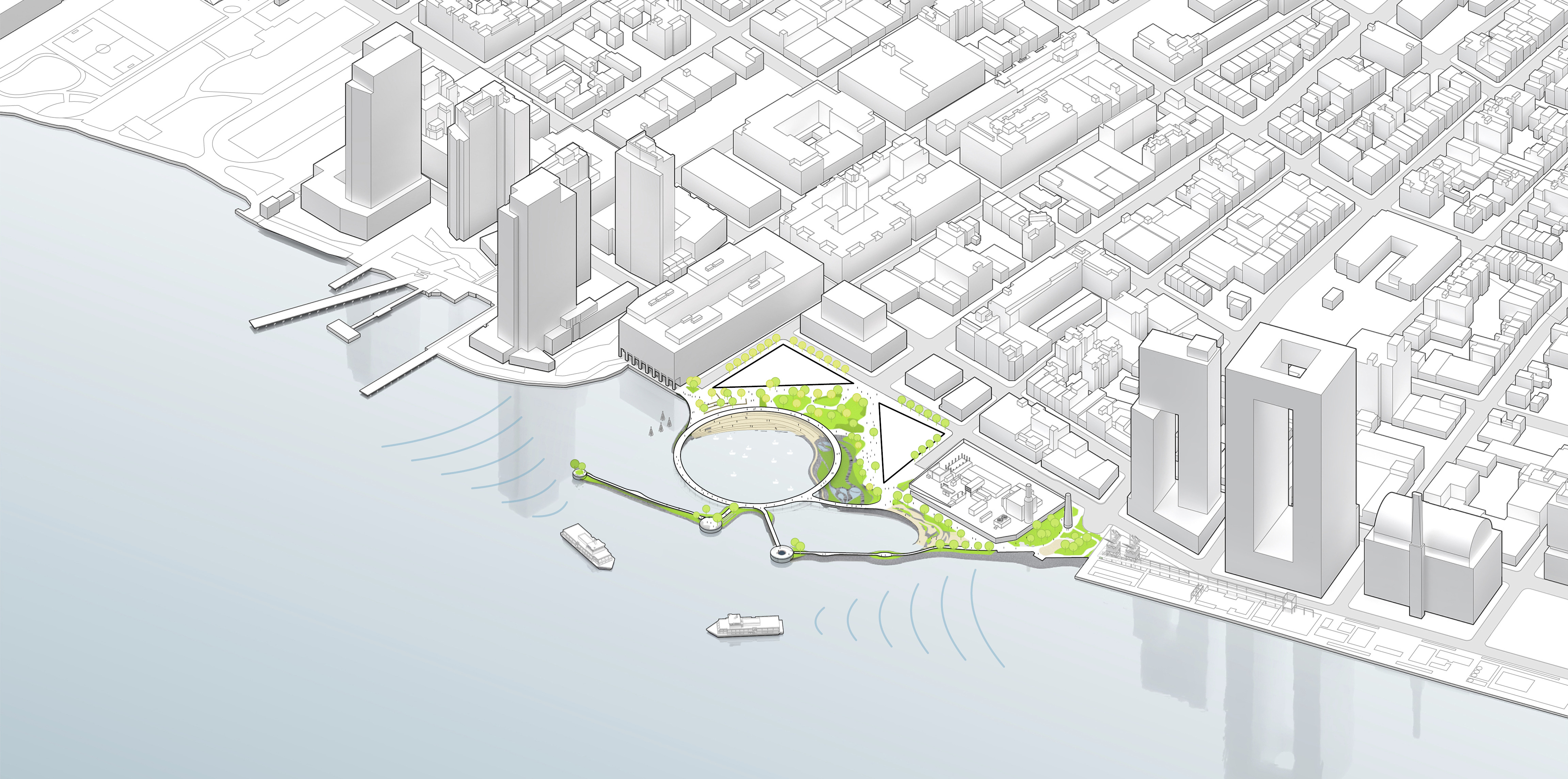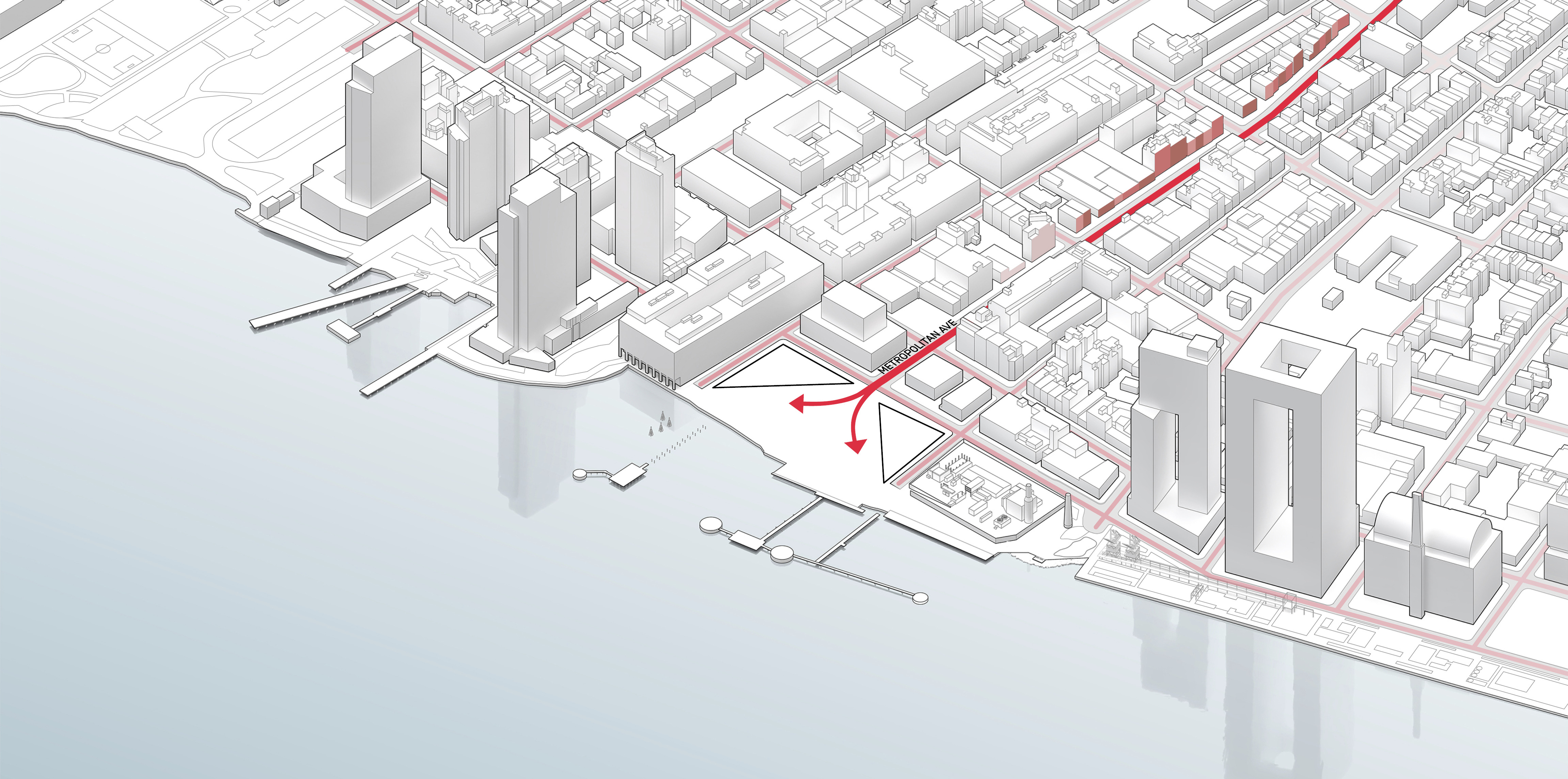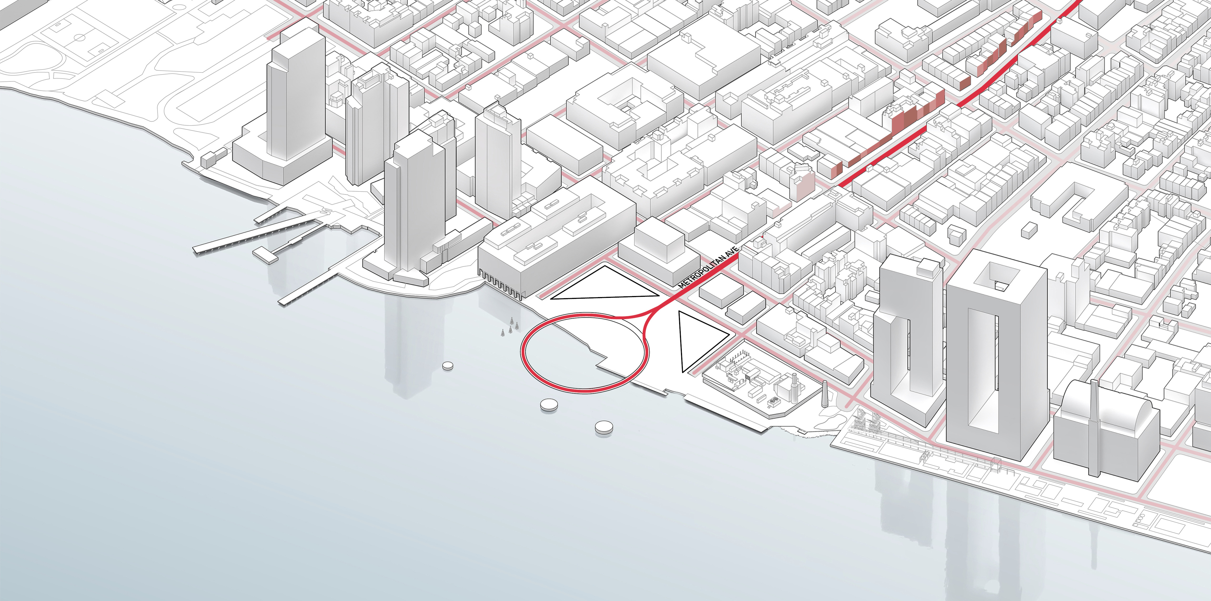 “We investigated the opportunity to stretch the Williamsburg waterfront landward with a circular pier and protected cove for water-based activities, inviting New Yorkers to take back and enjoy the river as a social and ecological public amenity. Surrounded by a necklace of recreation, educational and commercial programs, we envision the historic piers to be renewed and teeming with life. The masterplan proposes splitting Metropolitan Avenue into two diagonal pathways that connect to the waterfront promenade, resulting in triangular building footprints with views to the East River. Two towers inspired by Williamsburg warehouses are injected with neighborhood-oriented retail at its base, while the traditional podium is replaced by cascading terraces that frame and soften the relationship to the park.”