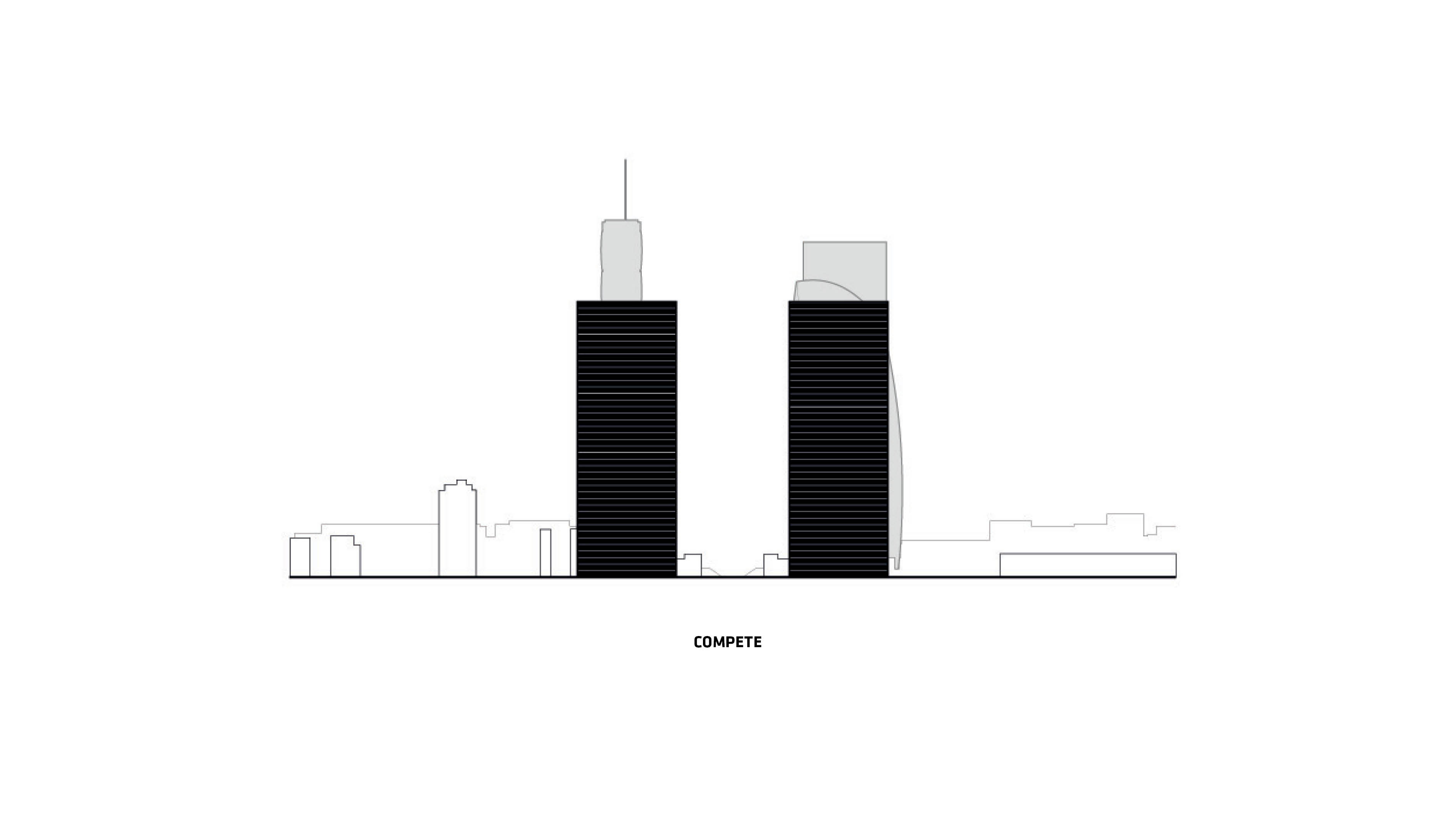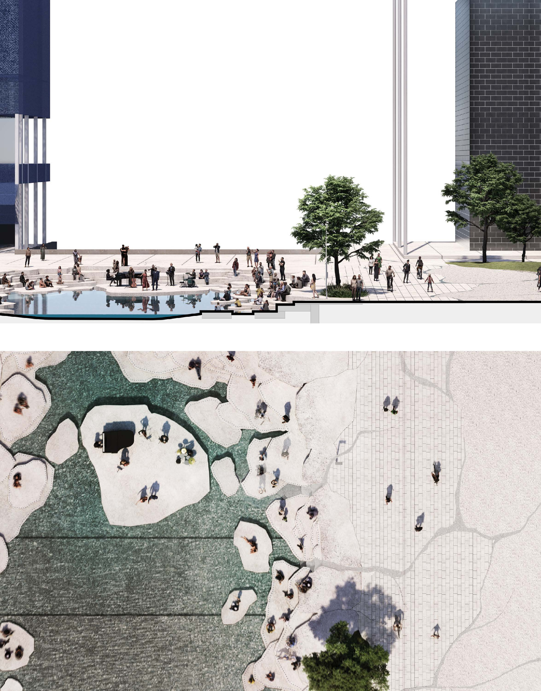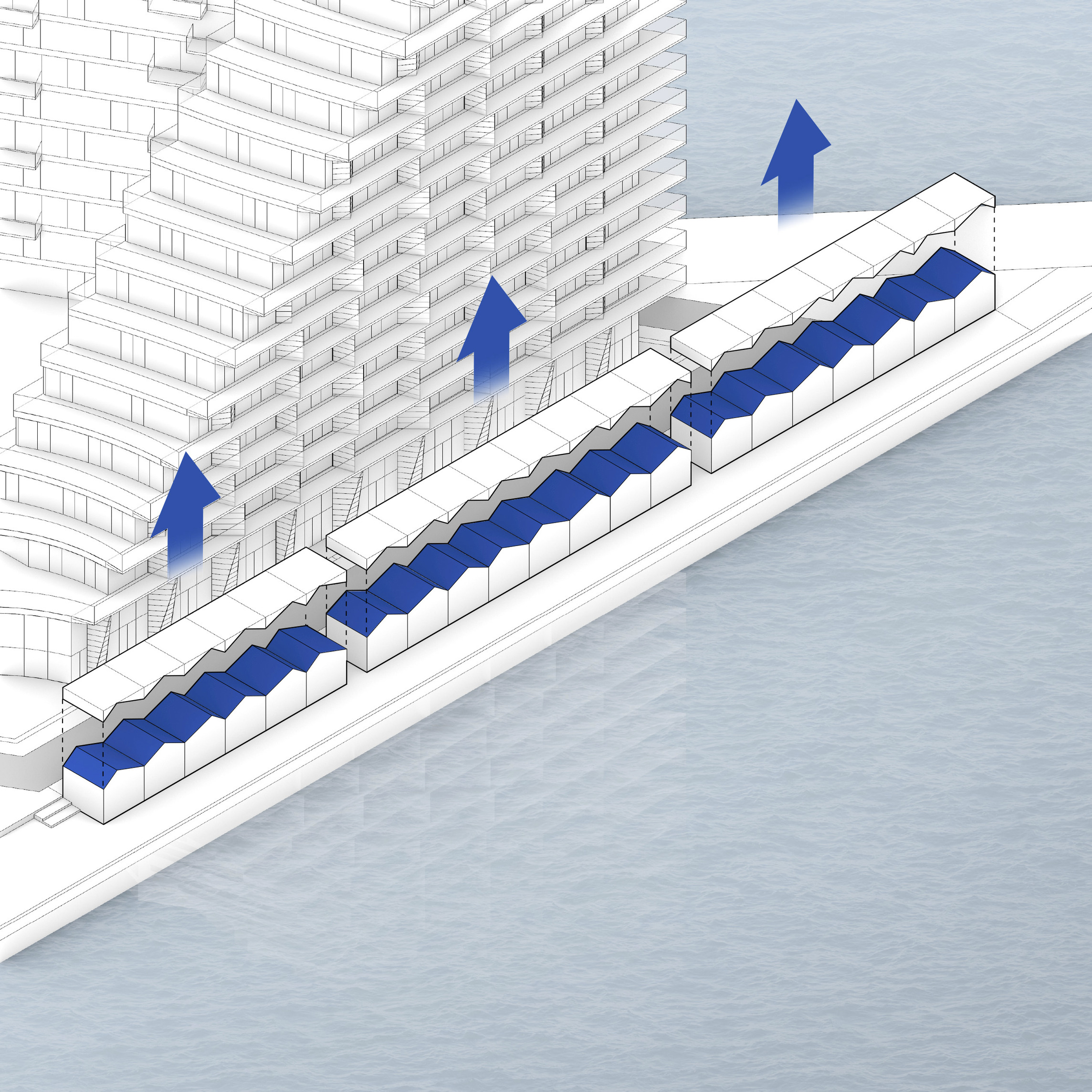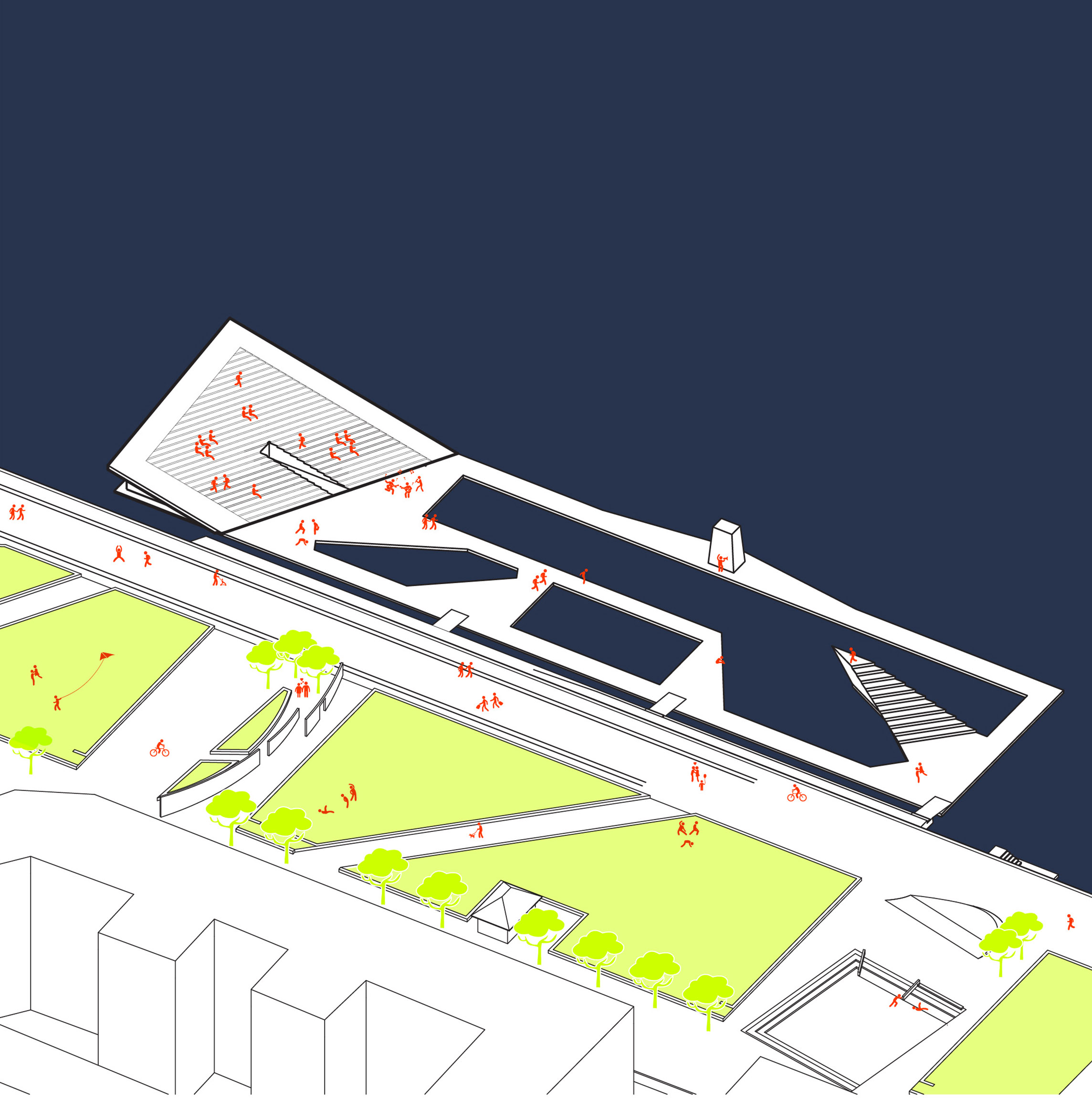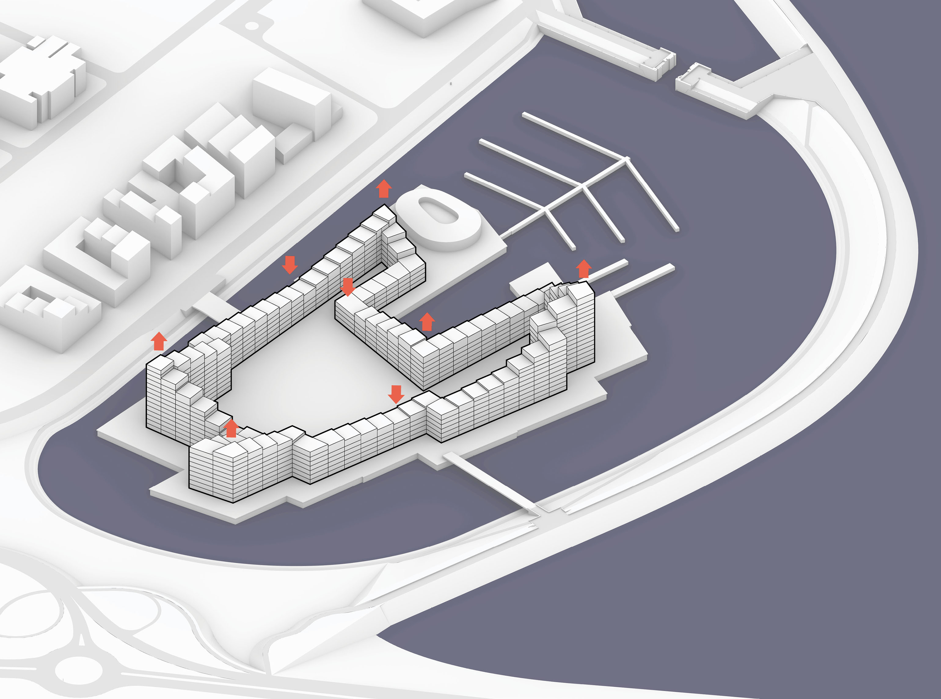 “We investigated the opportunity to stretch the Williamsburg waterfront landward with a circular pier and protected cove for water-based activities, inviting New Yorkers to take back and enjoy the river as a social and ecological public amenity. Surrounded by a necklace of recreation, educational and commercial programs, we envision the historic piers to be renewed and teeming with life. The masterplan proposes splitting Metropolitan Avenue into two diagonal pathways that connect to the waterfront promenade, resulting in triangular building footprints with views to the East River. Two towers inspired by Williamsburg warehouses are injected with neighborhood-oriented retail at its base, while the traditional podium is replaced by cascading terraces that frame and soften the relationship to the park.”