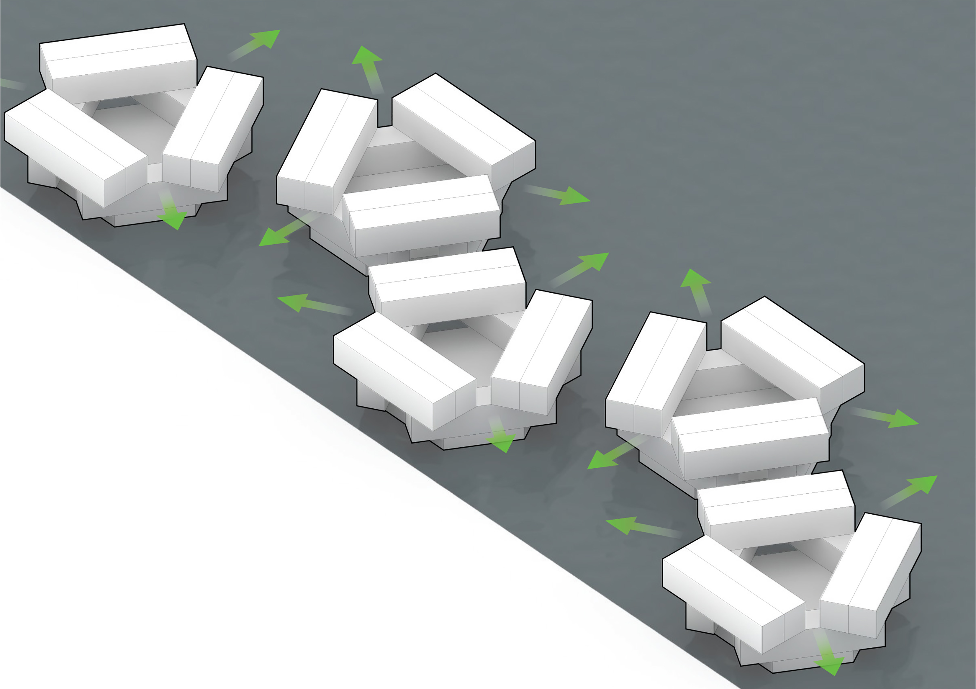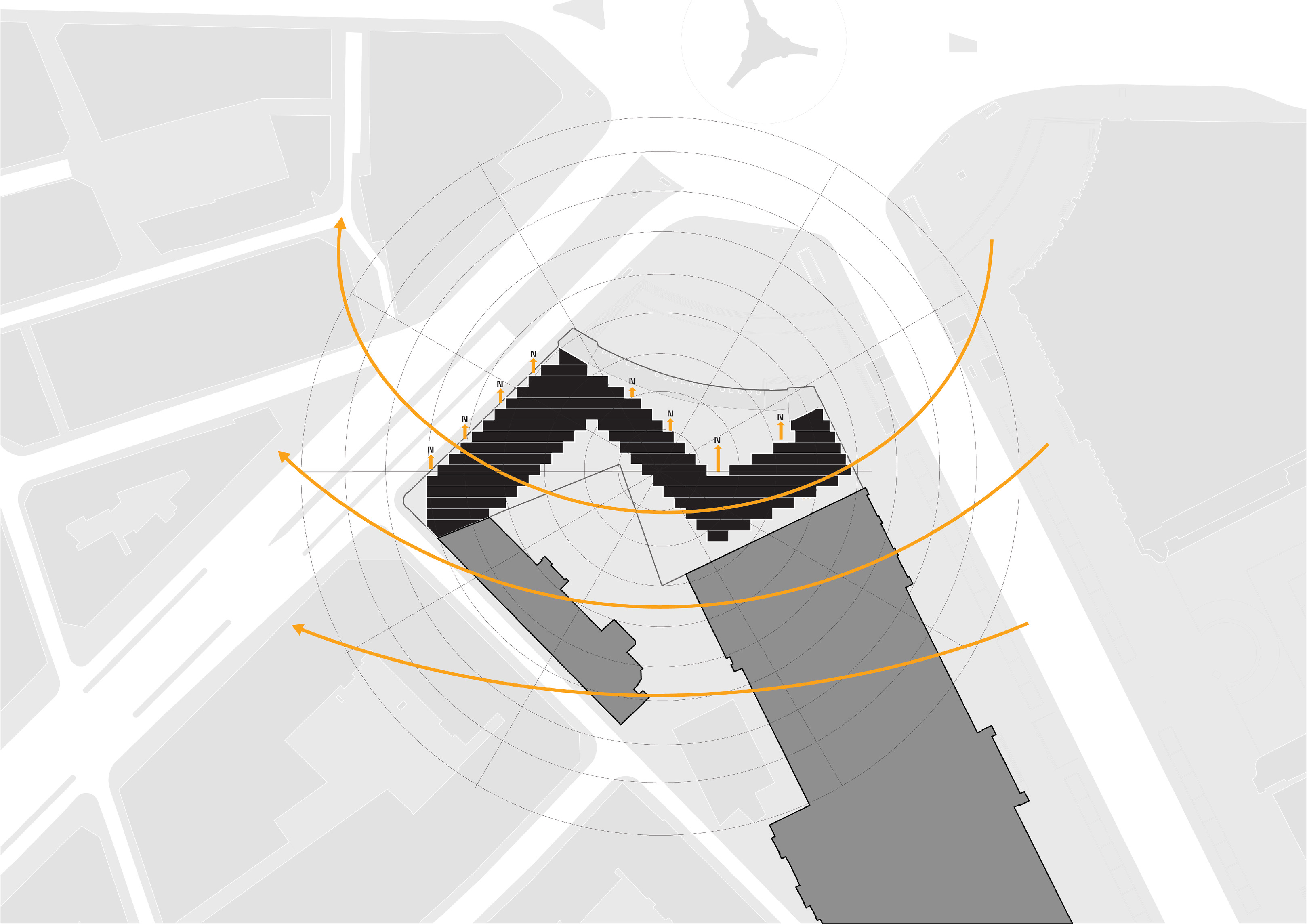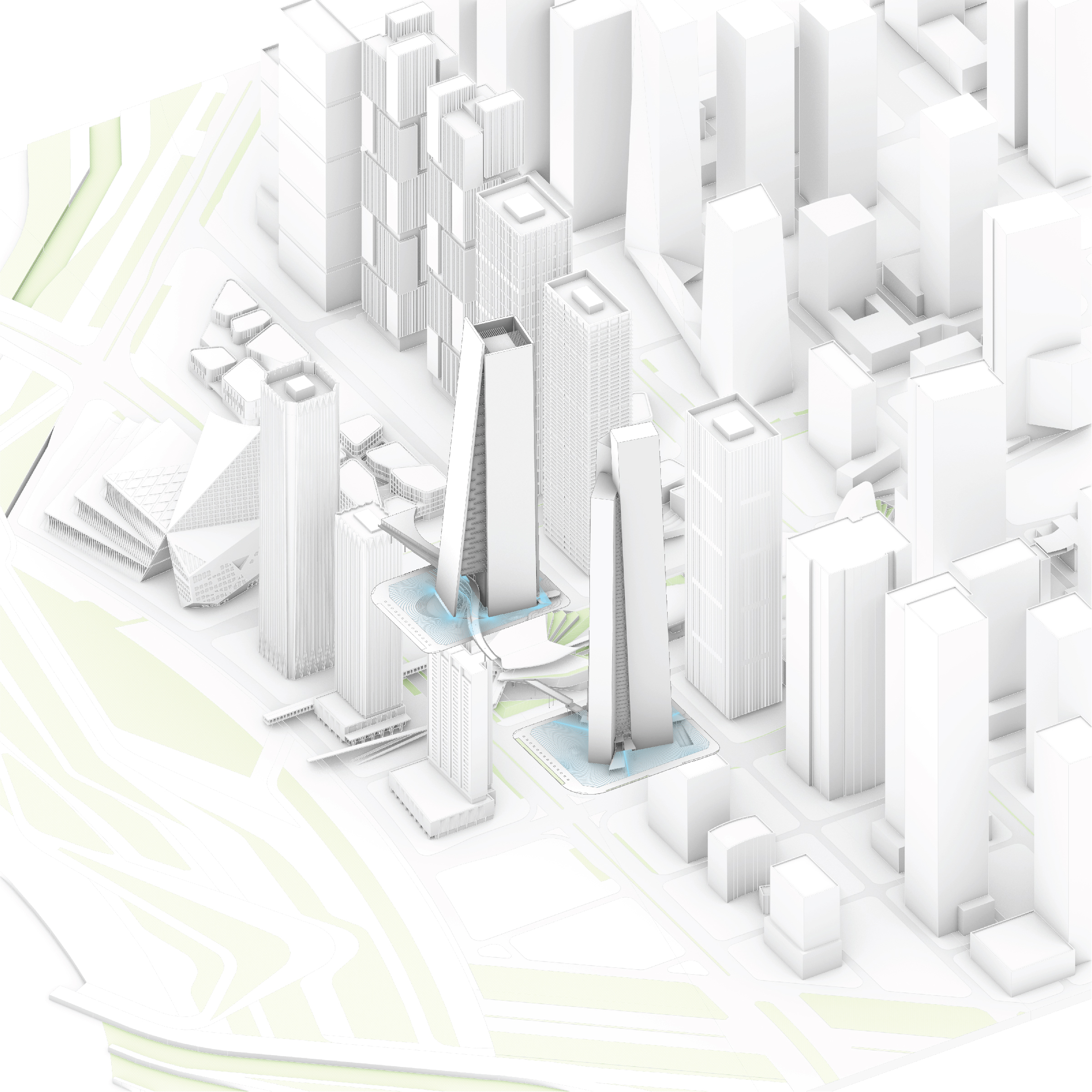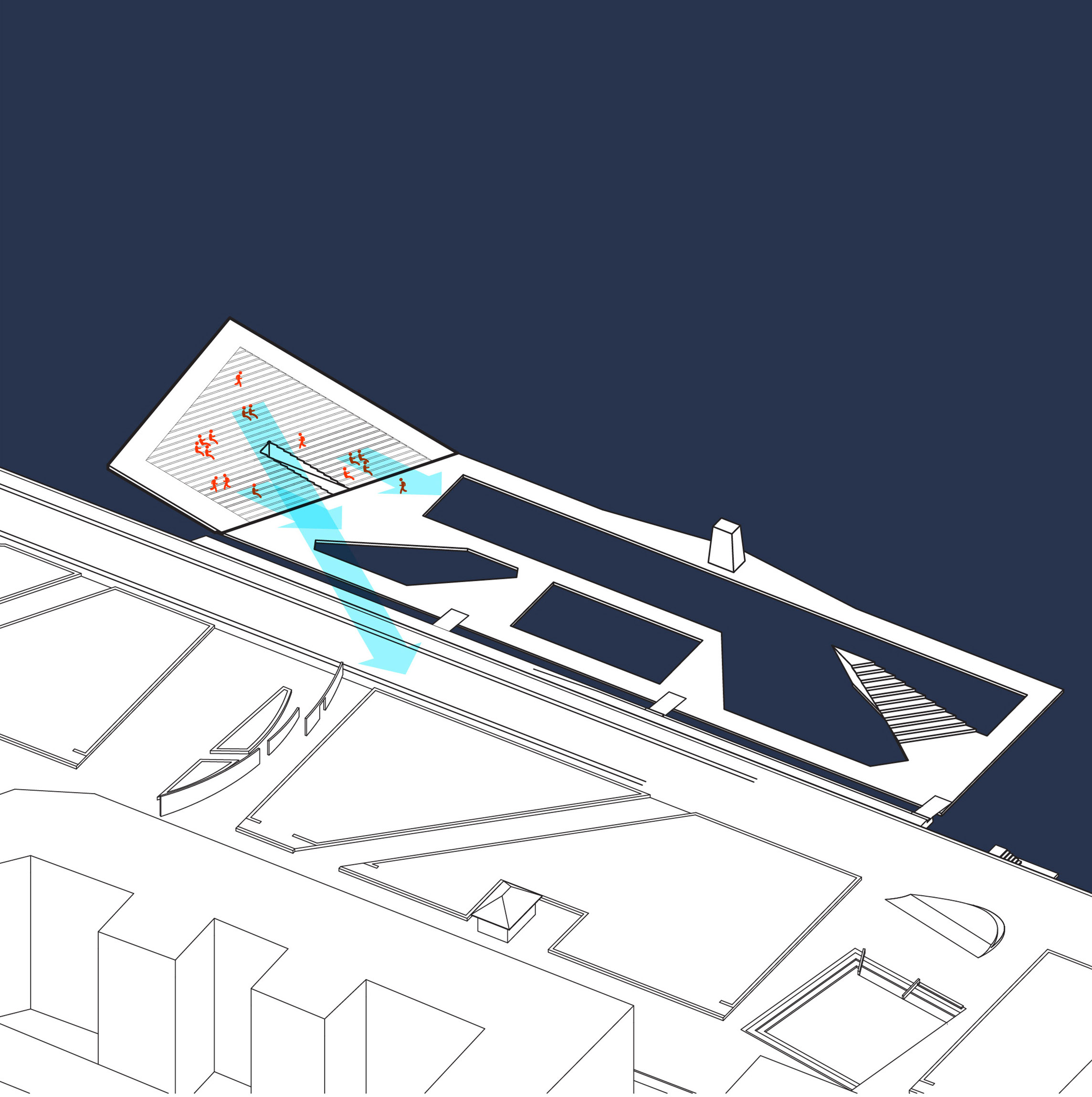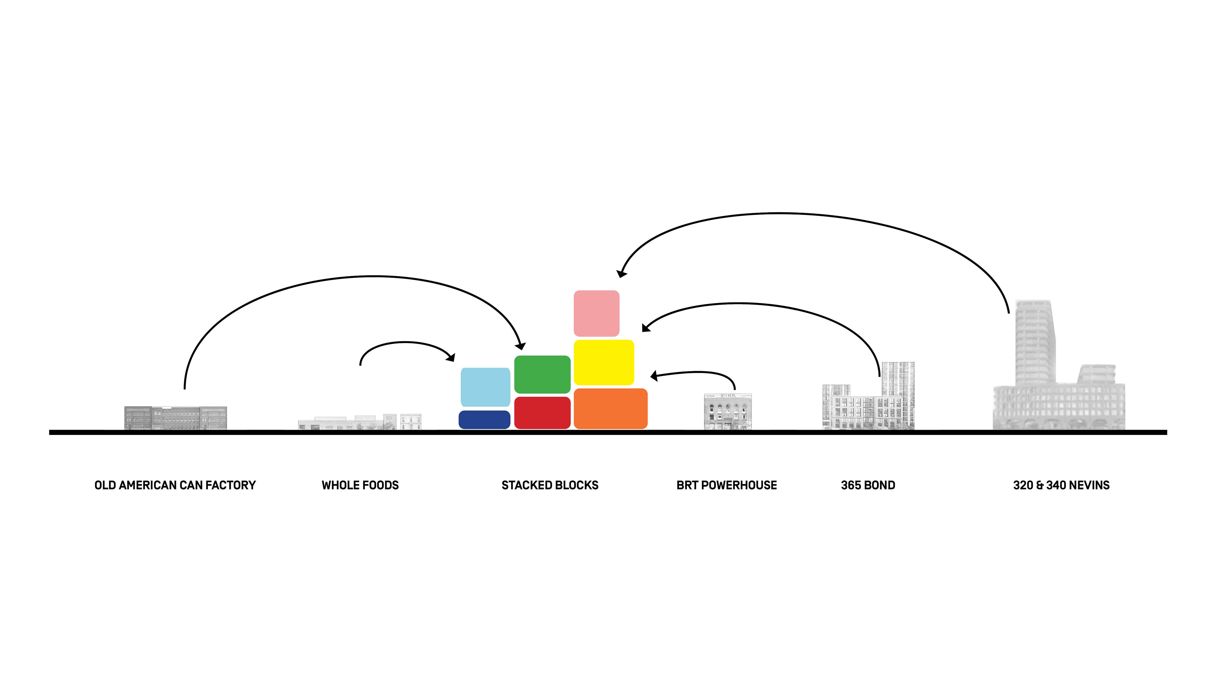 “We investigated the opportunity to stretch the Williamsburg waterfront landward with a circular pier and protected cove for water-based activities, inviting New Yorkers to take back and enjoy the river as a social and ecological public amenity. Surrounded by a necklace of recreation, educational and commercial programs, we envision the historic piers to be renewed and teeming with life. The masterplan proposes splitting Metropolitan Avenue into two diagonal pathways that connect to the waterfront promenade, resulting in triangular building footprints with views to the East River. Two towers inspired by Williamsburg warehouses are injected with neighborhood-oriented retail at its base, while the traditional podium is replaced by cascading terraces that frame and soften the relationship to the park.”