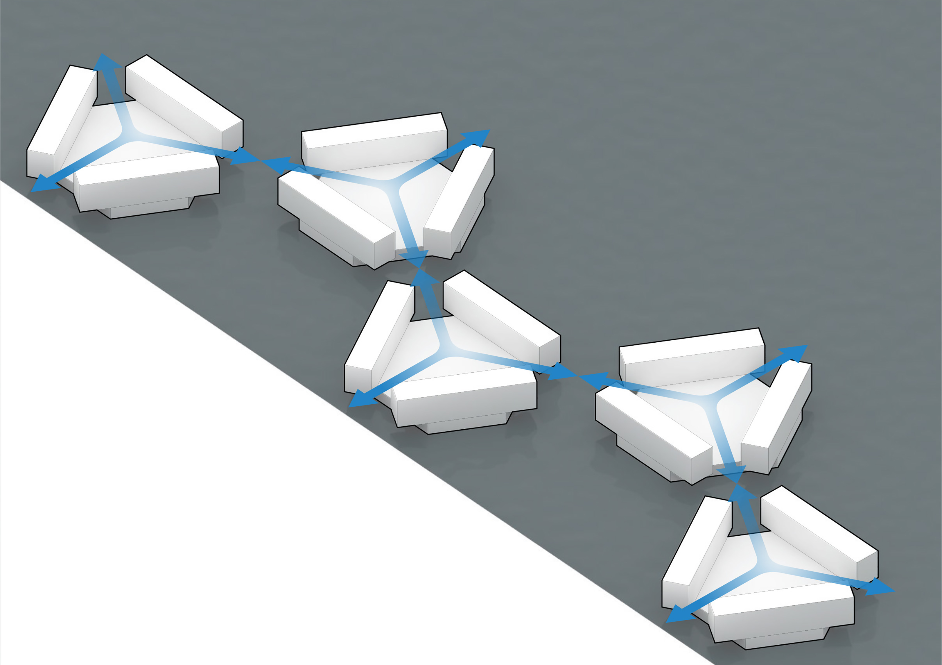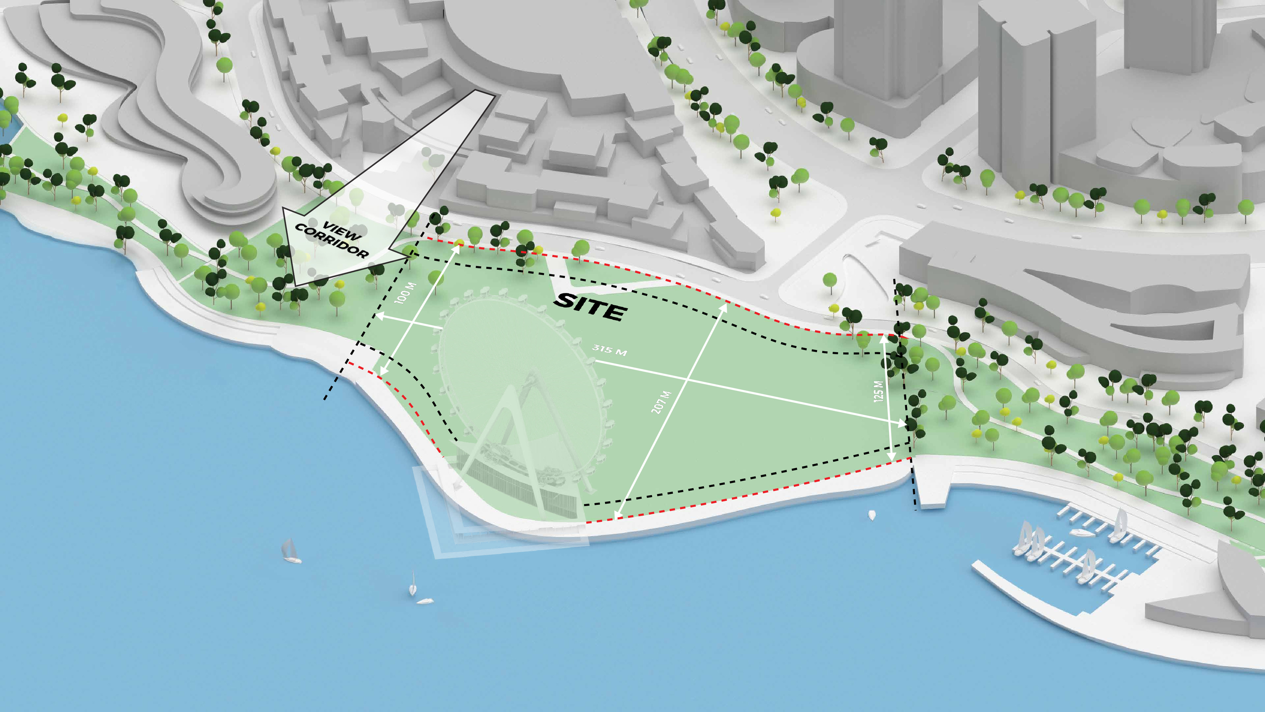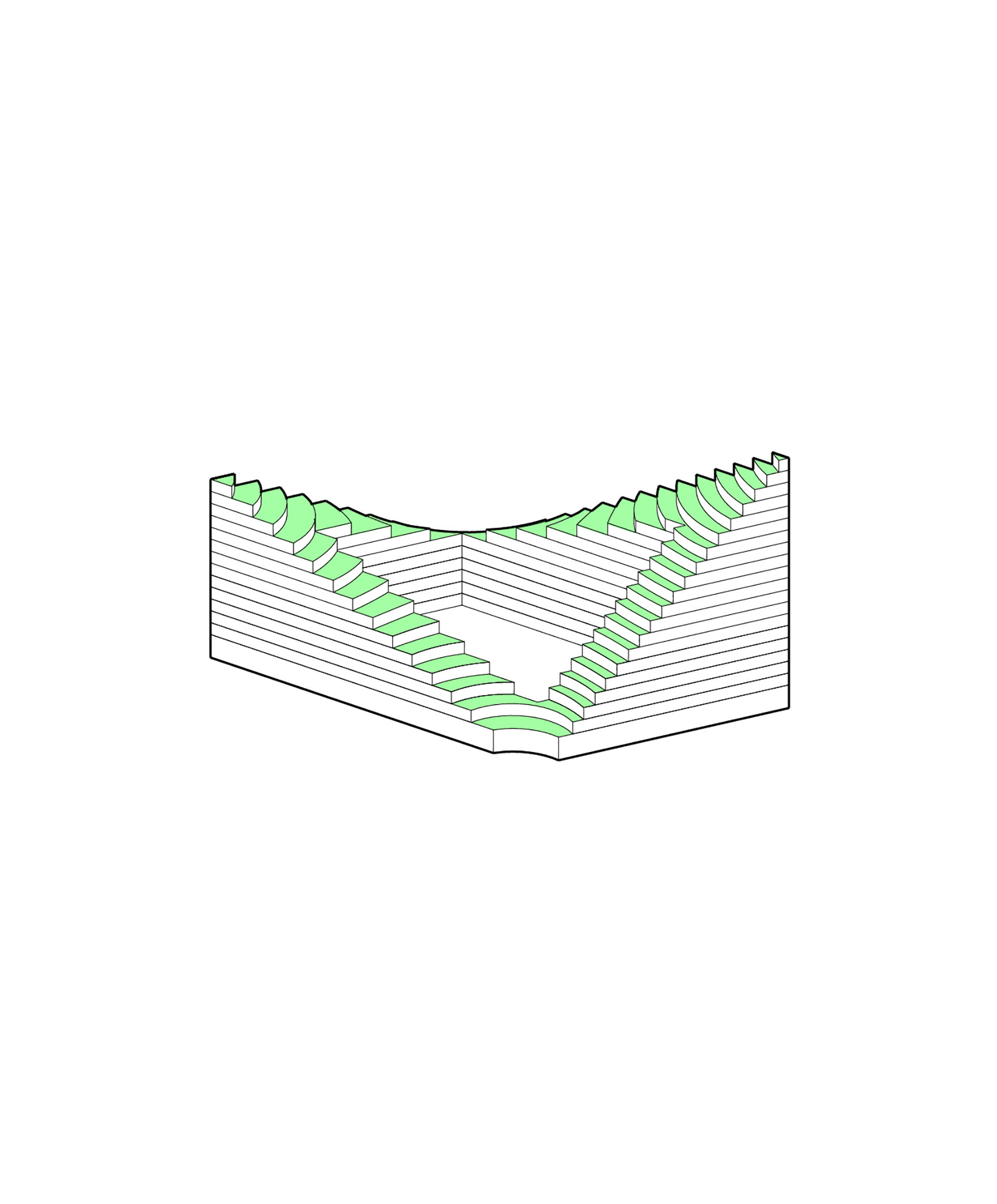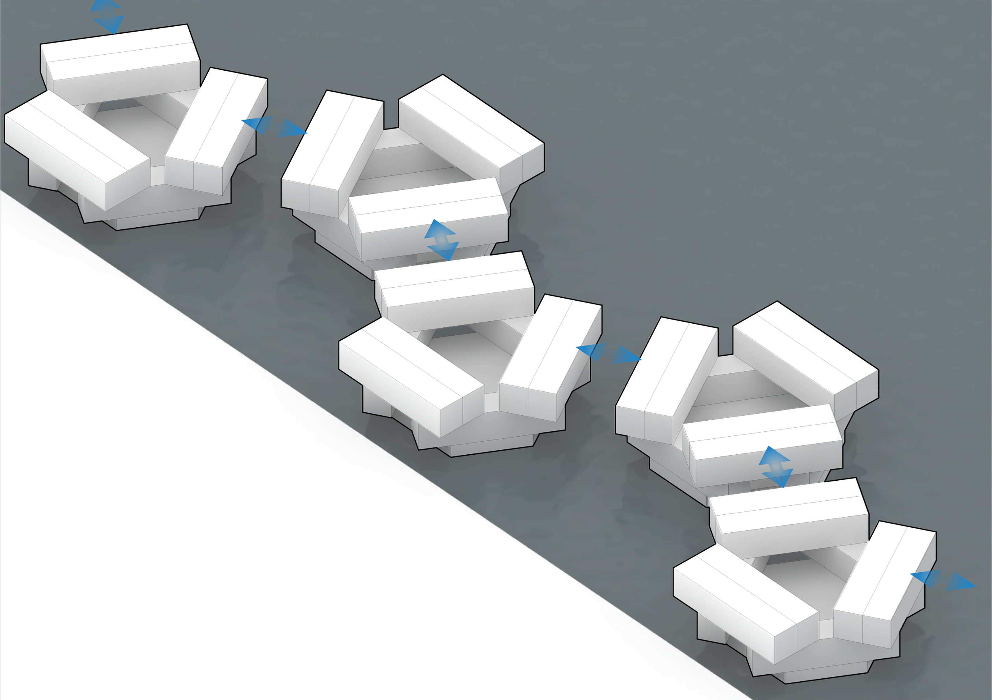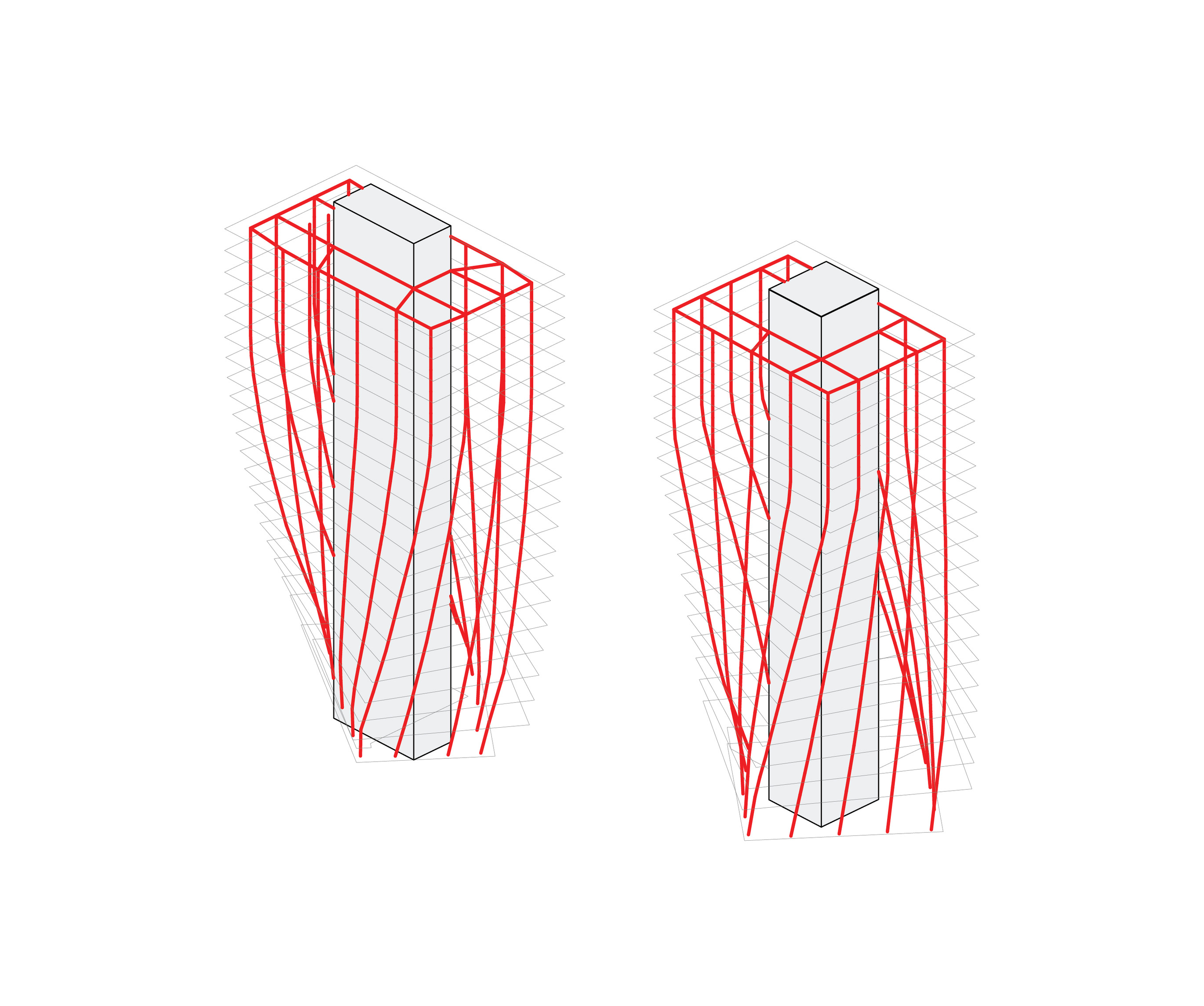 “We investigated the opportunity to stretch the Williamsburg waterfront landward with a circular pier and protected cove for water-based activities, inviting New Yorkers to take back and enjoy the river as a social and ecological public amenity. Surrounded by a necklace of recreation, educational and commercial programs, we envision the historic piers to be renewed and teeming with life. The masterplan proposes splitting Metropolitan Avenue into two diagonal pathways that connect to the waterfront promenade, resulting in triangular building footprints with views to the East River. Two towers inspired by Williamsburg warehouses are injected with neighborhood-oriented retail at its base, while the traditional podium is replaced by cascading terraces that frame and soften the relationship to the park.”