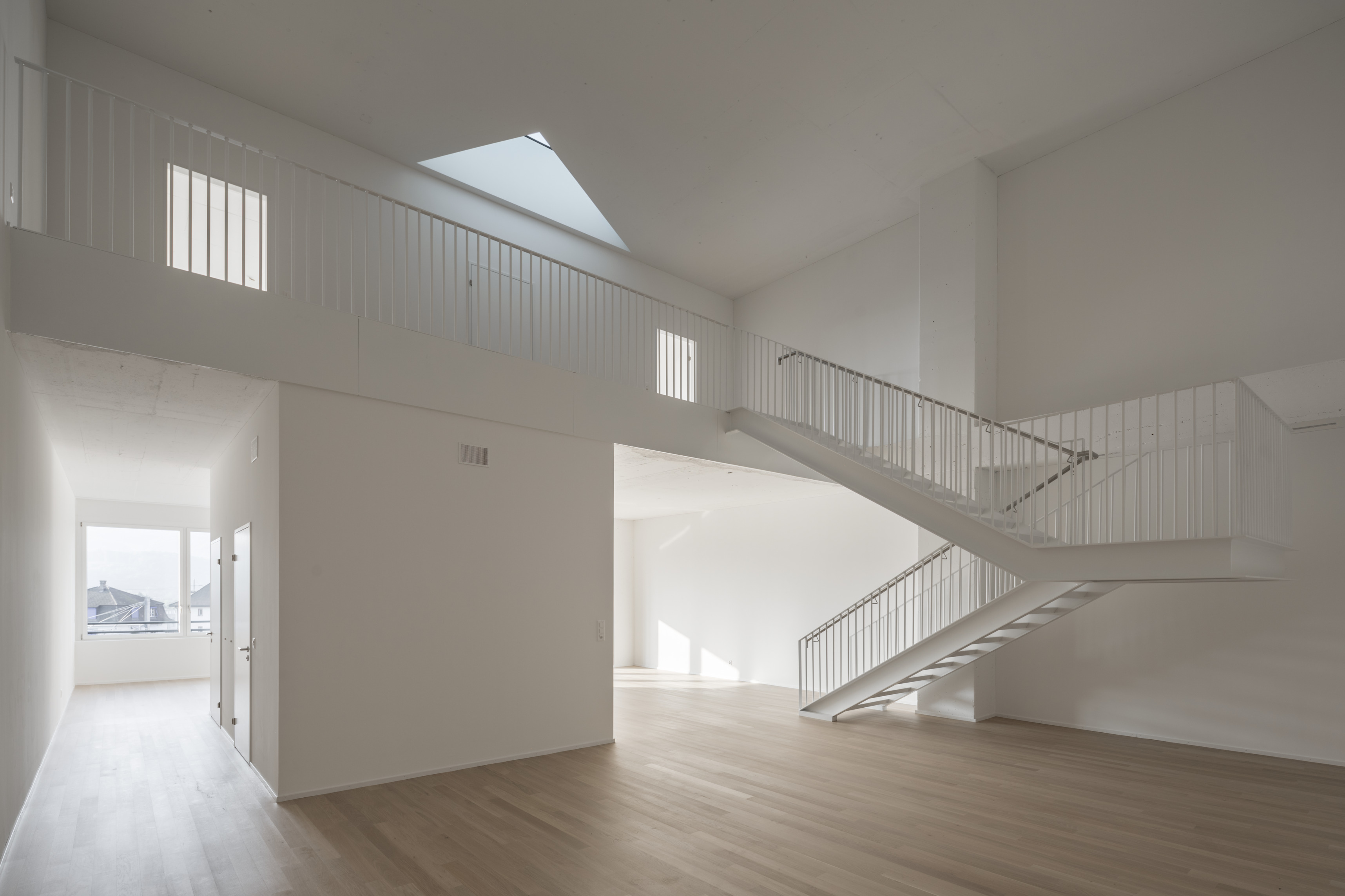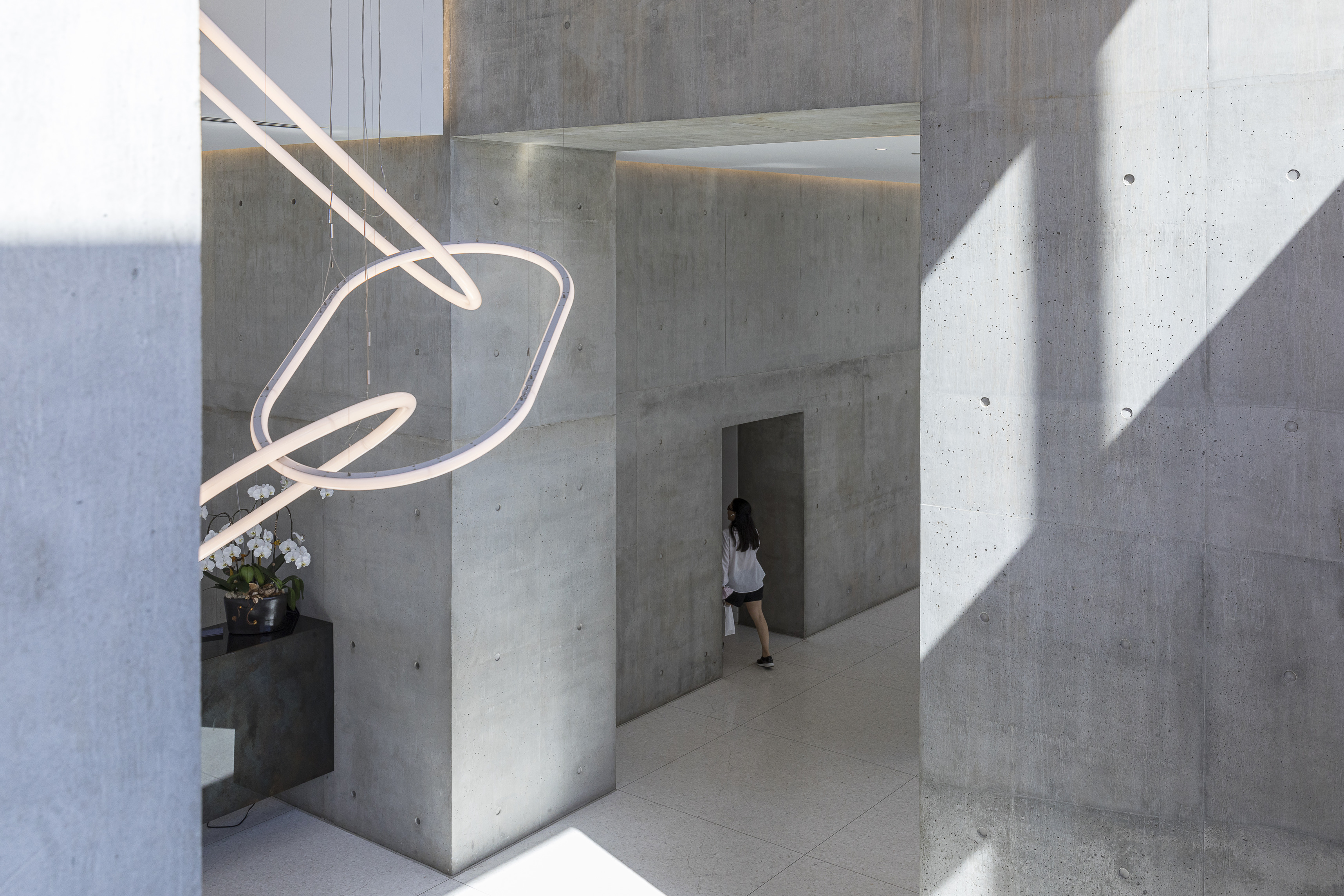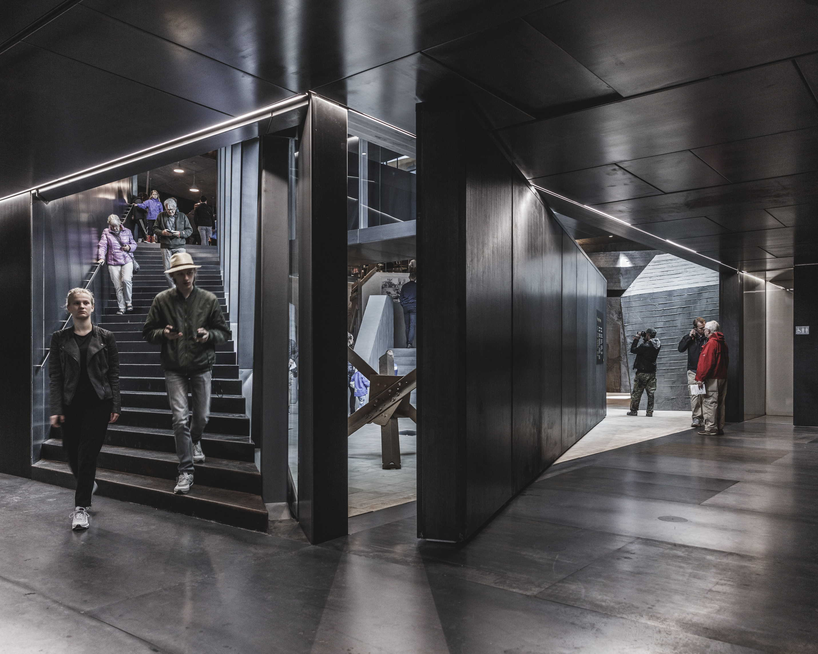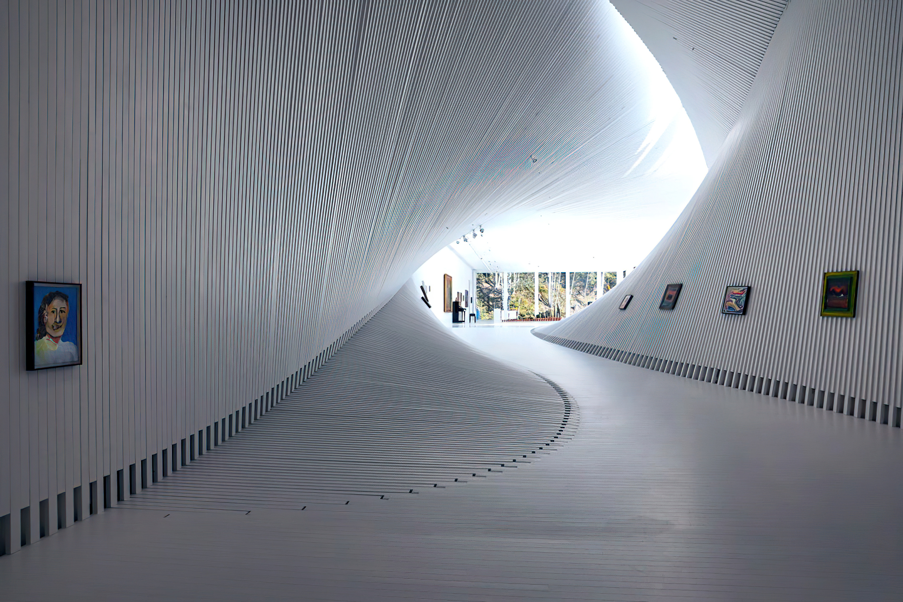 Inside, natural light enters through clerestories and skylights, animating the galleries with a play of shadow and reflection.