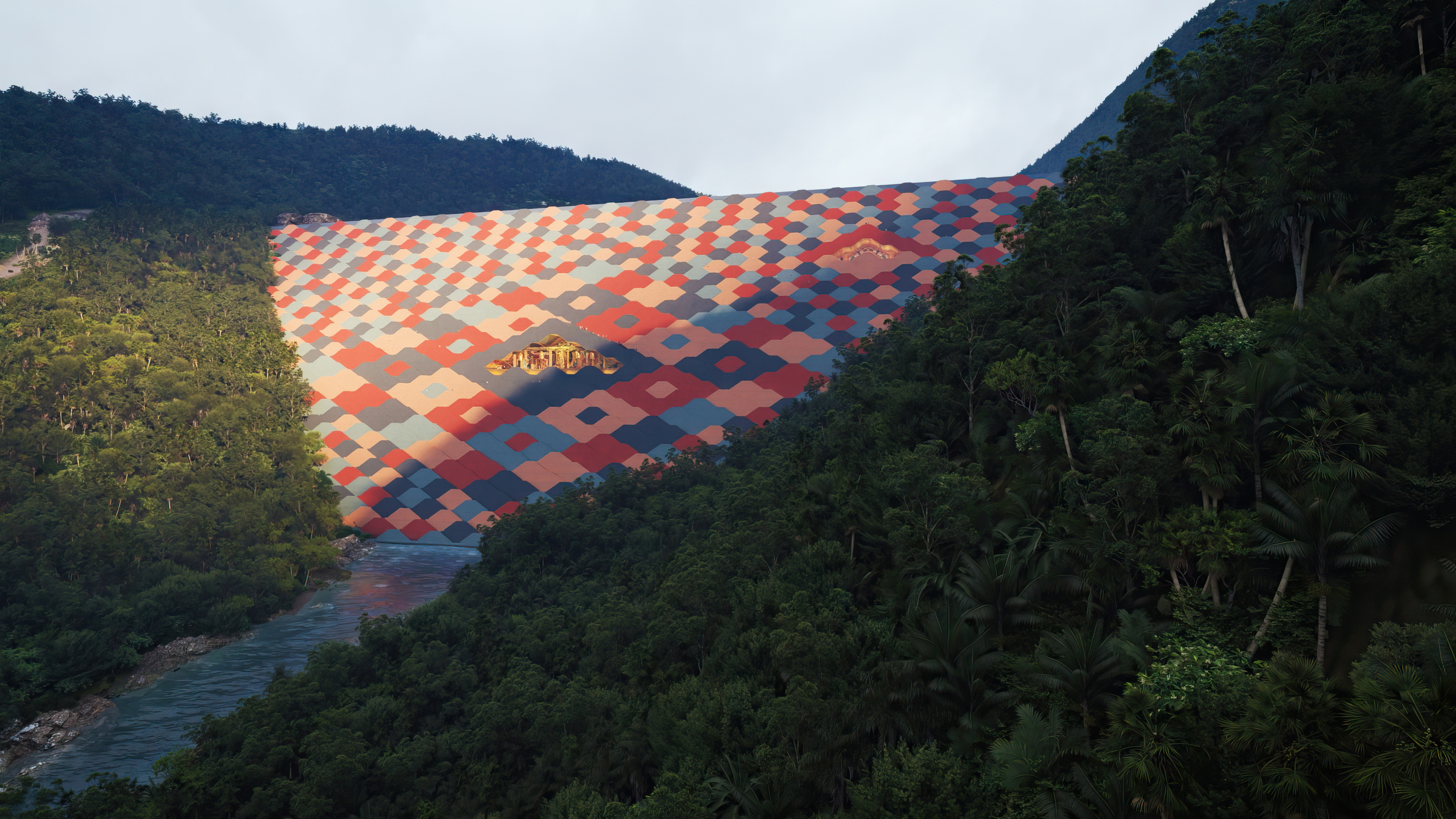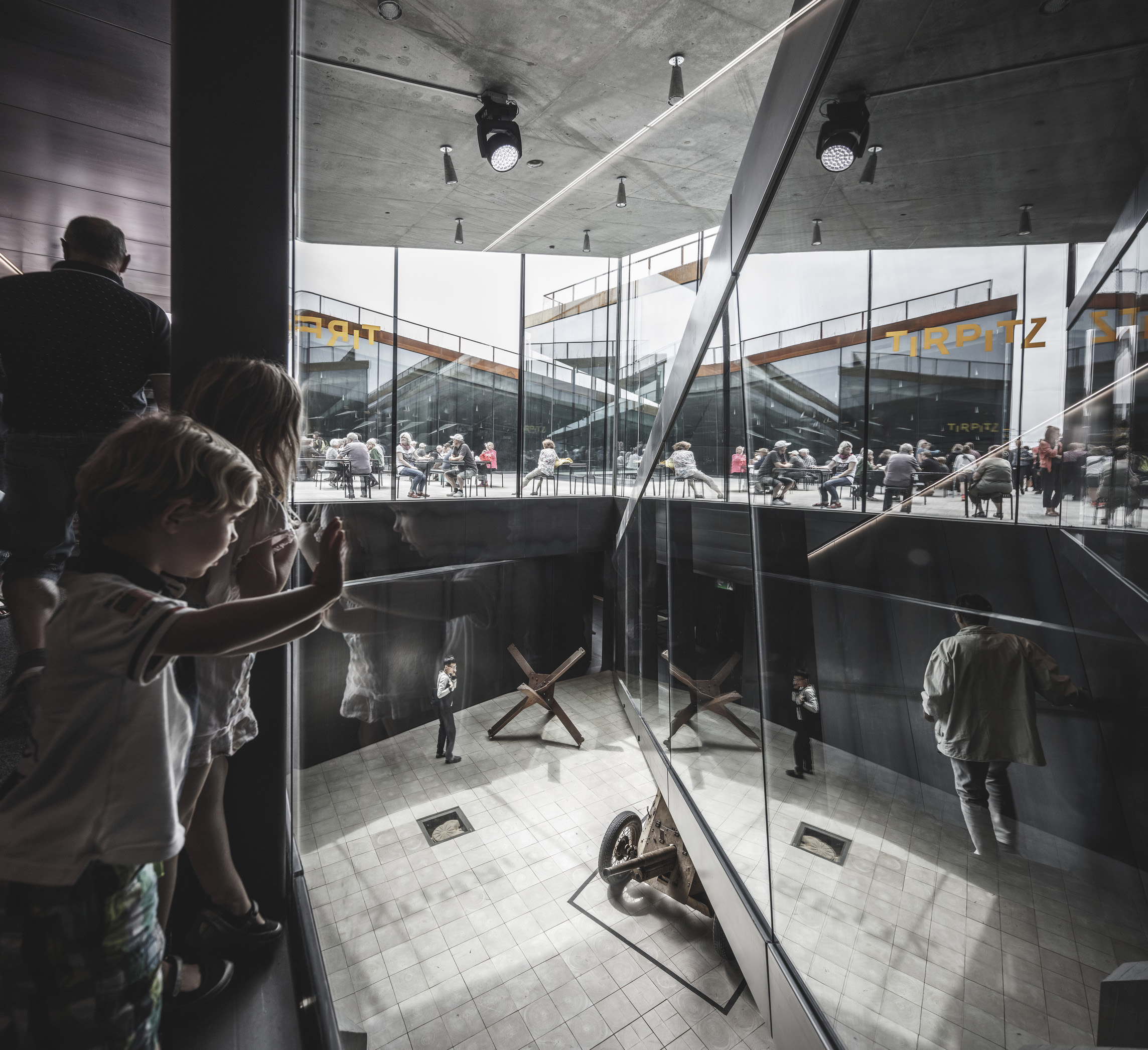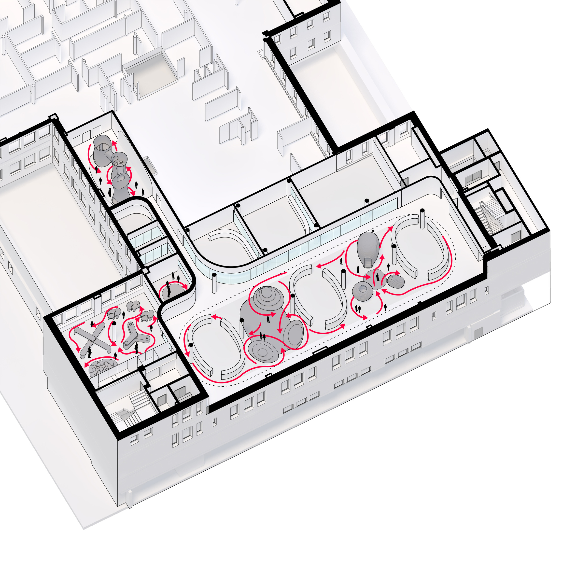 Inside, natural light enters through clerestories and skylights, animating the galleries with a play of shadow and reflection.