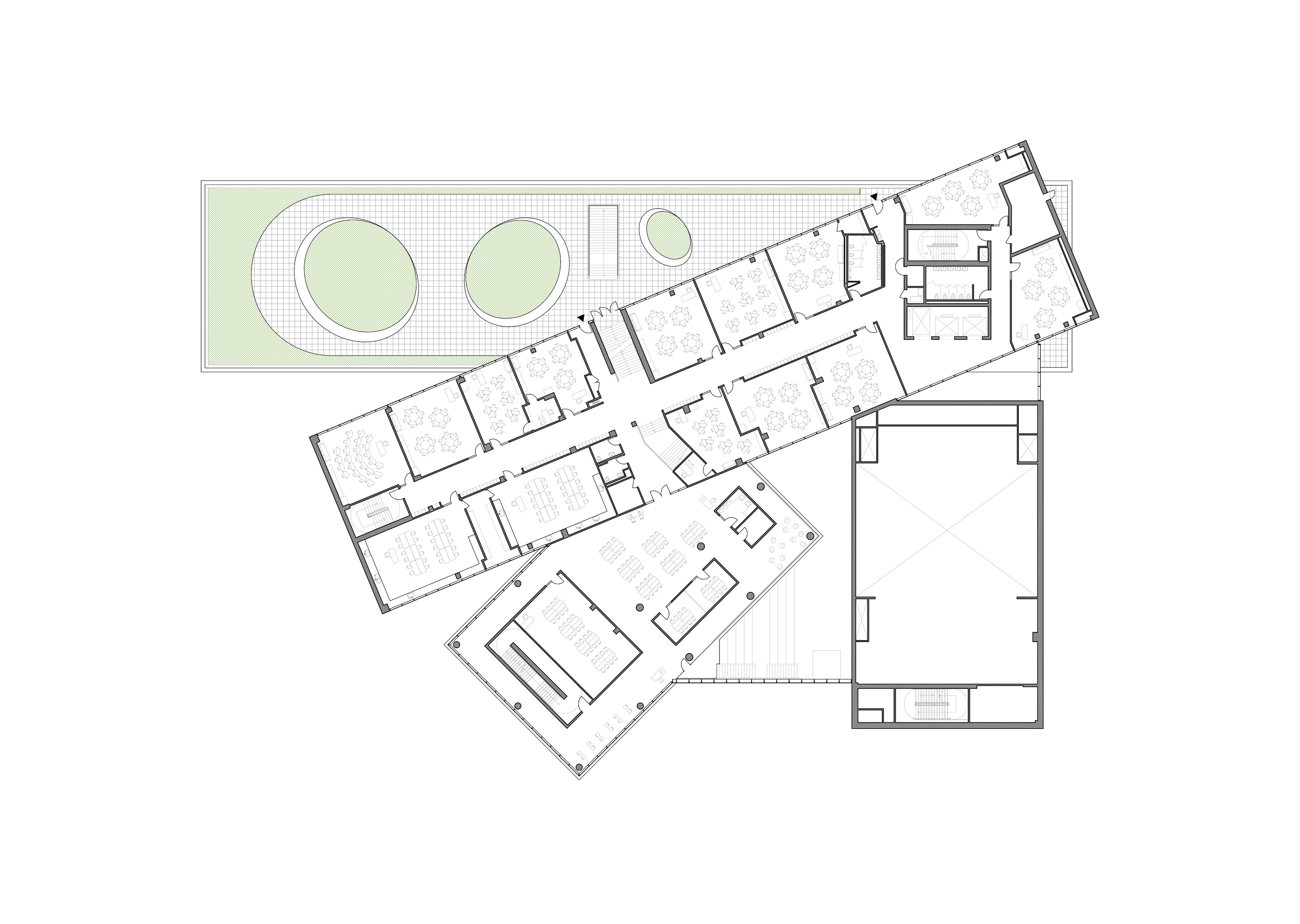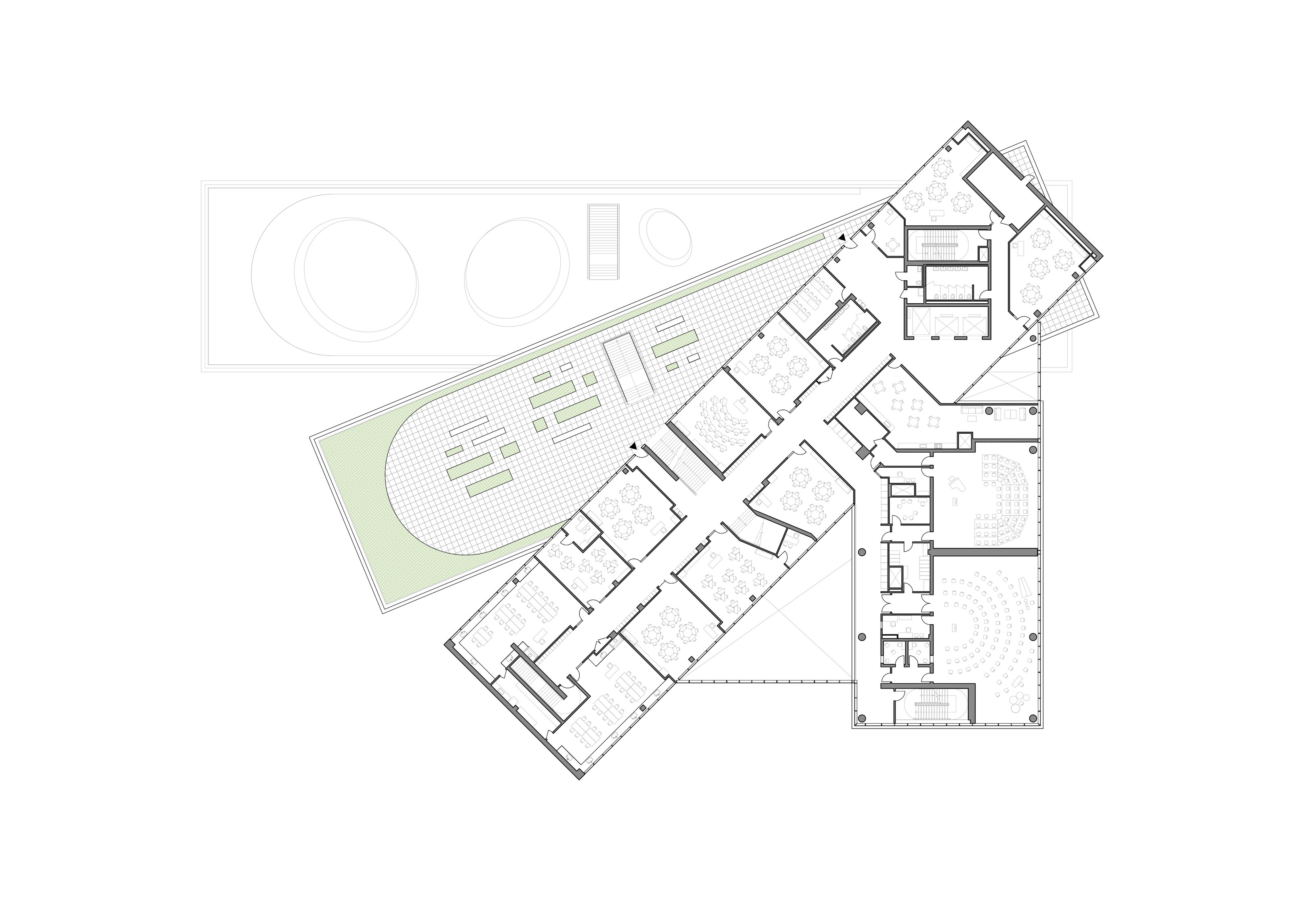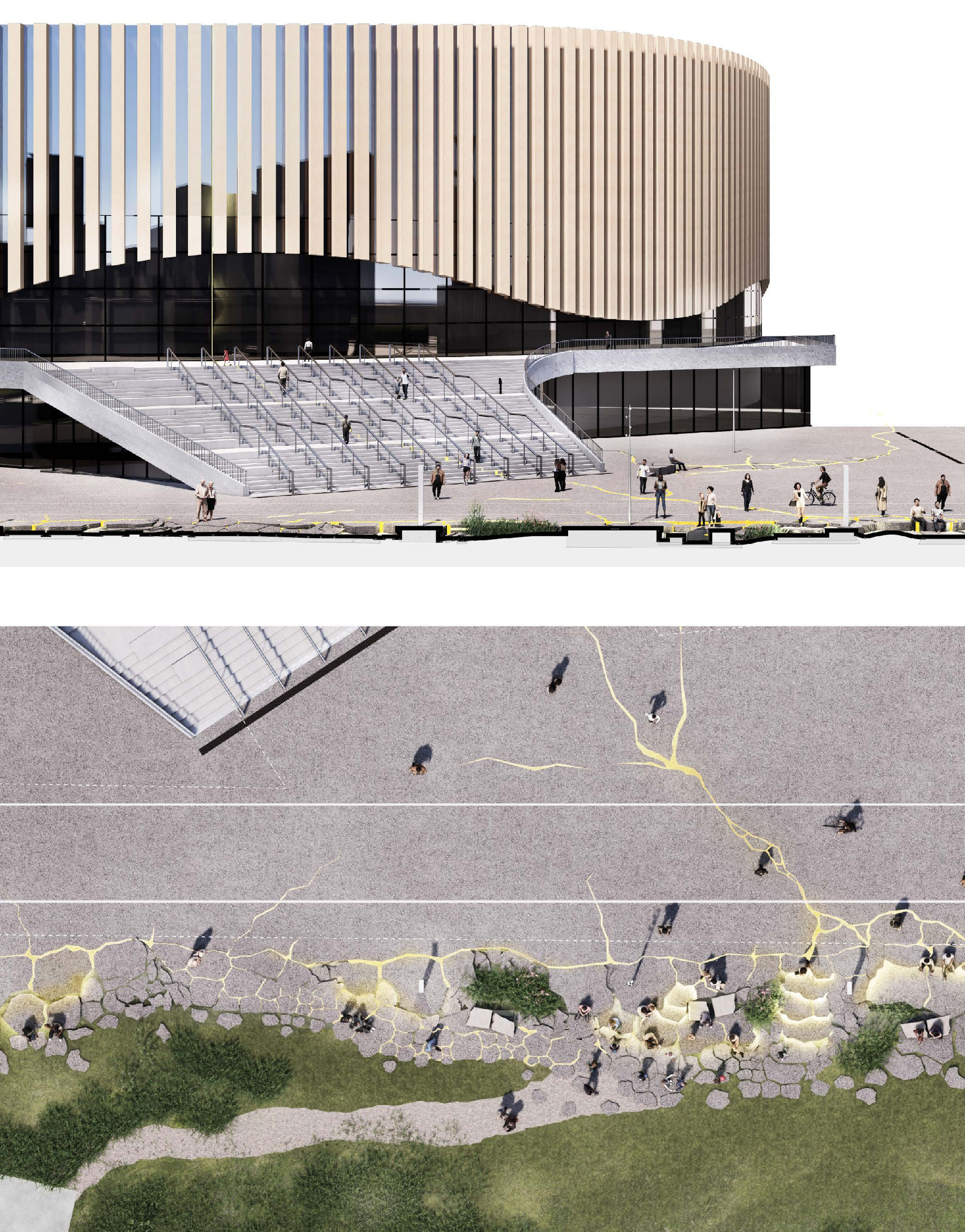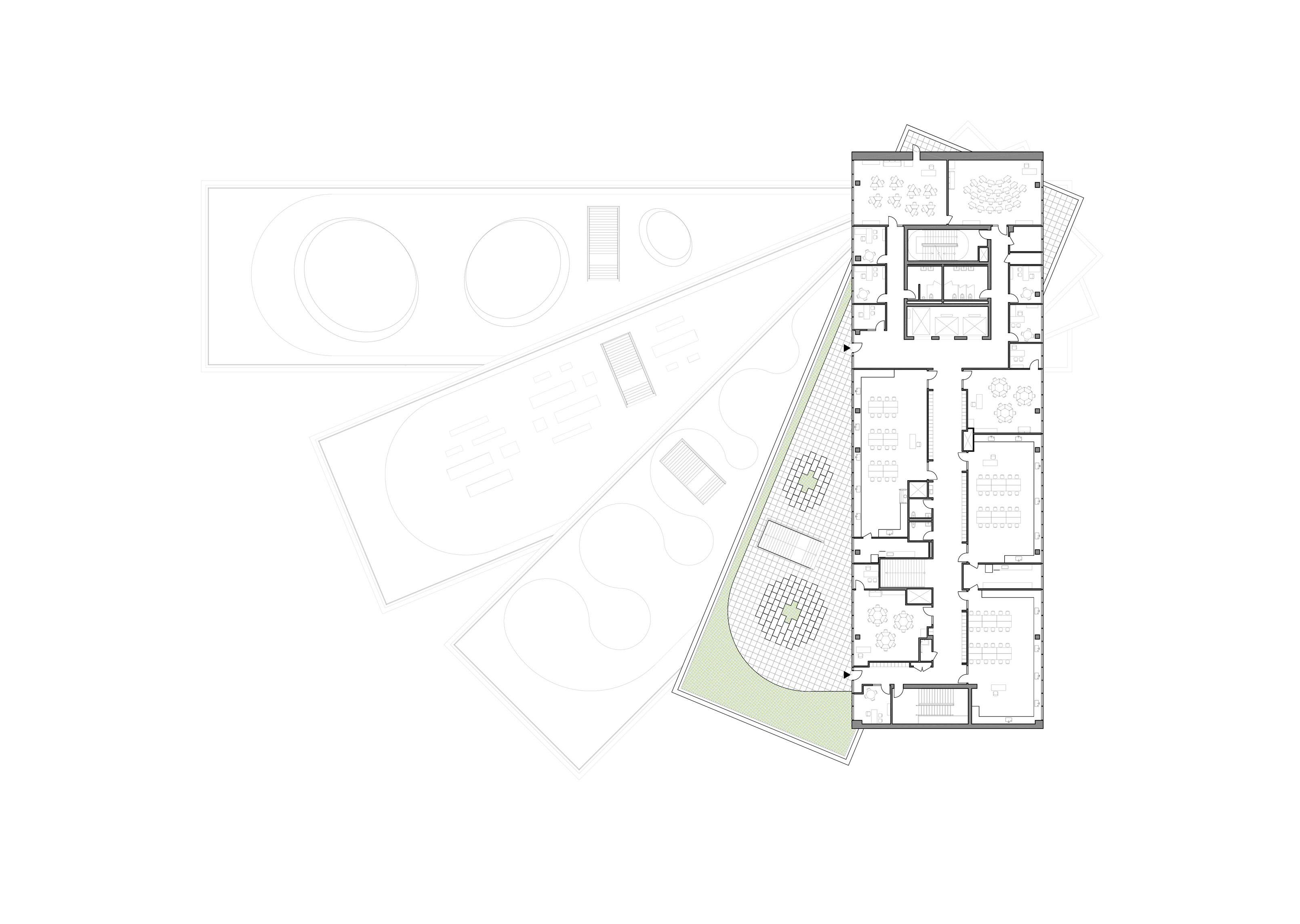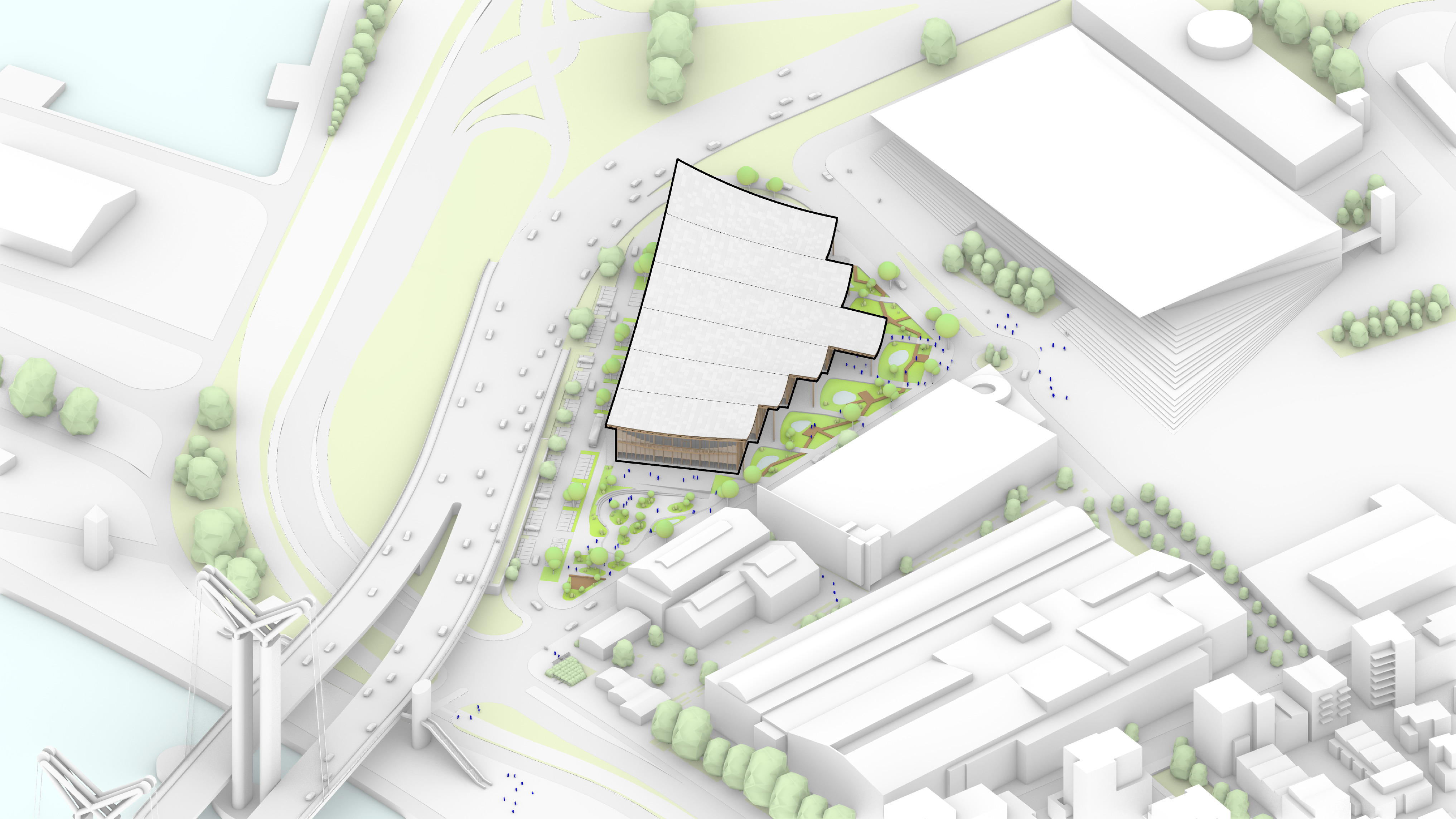 The timber structure and facades draw on Rouen’s tradition of half-timbered houses, while the roofline recalls the sails of its maritime history. From the city side, the PV-covered roof hovers above a new public forecourt that extends the urban fabric to the river. The forecourt combines open plazas paved in local stone with pockets of planting and trees, creating shaded gathering areas and green buffers around the building. Rainwater collected from the roof irrigates the planting, while paths connect the site with its surroundings and guide visitors to the entrances.