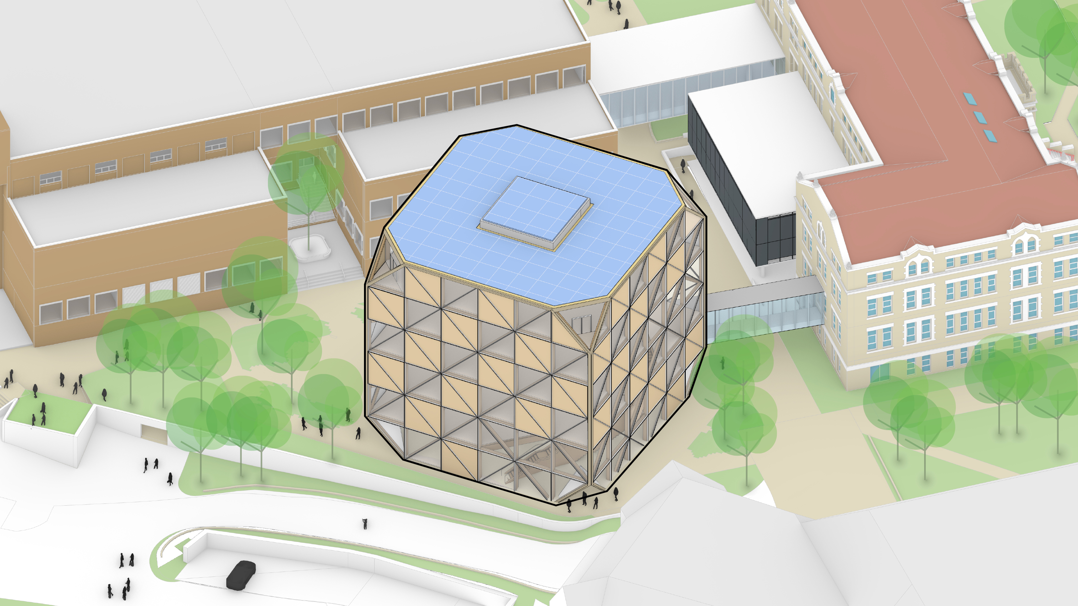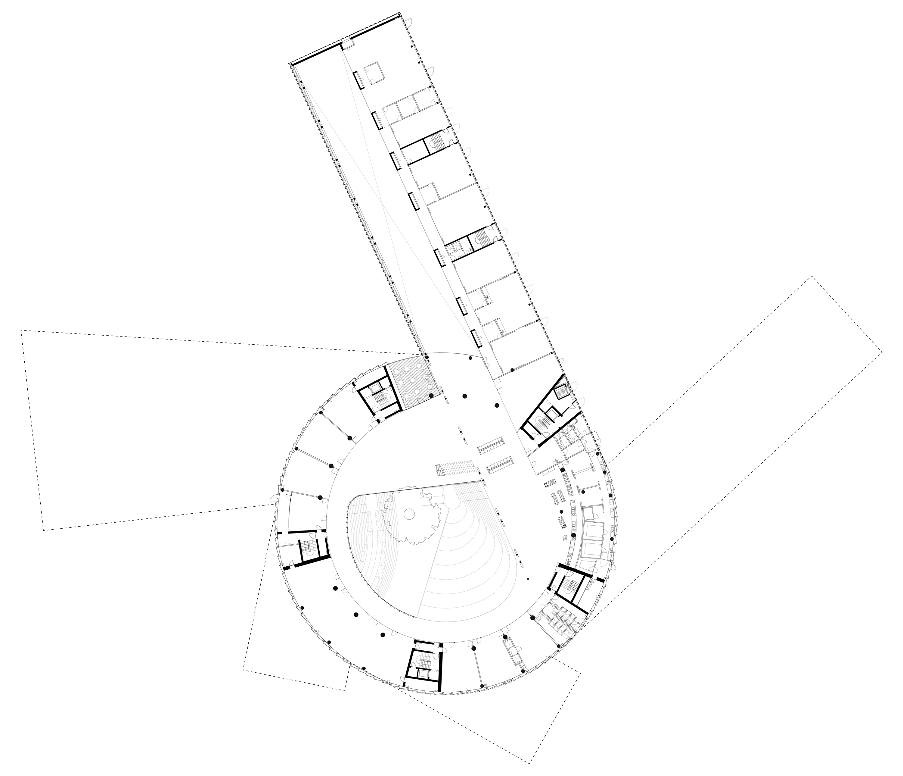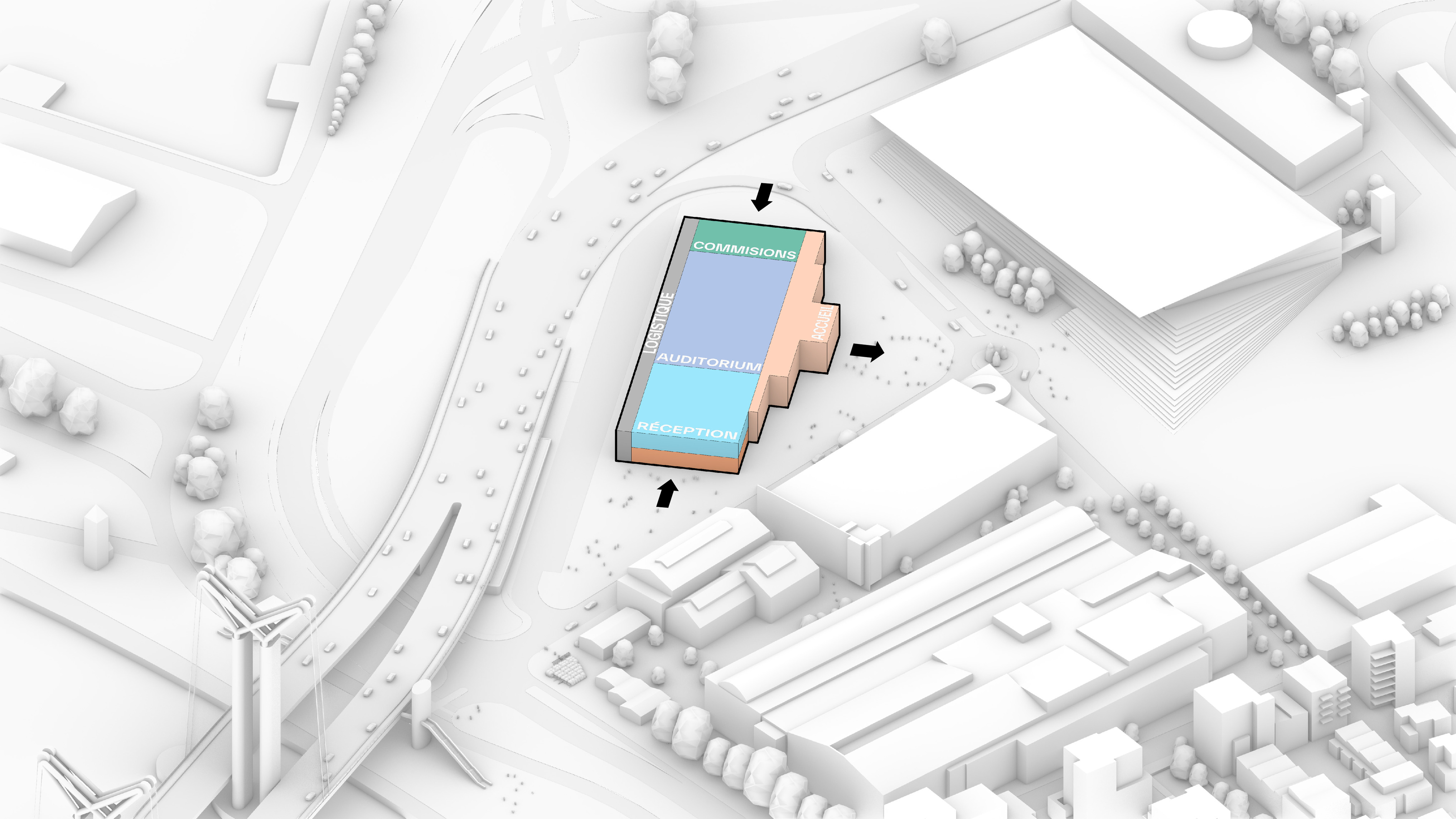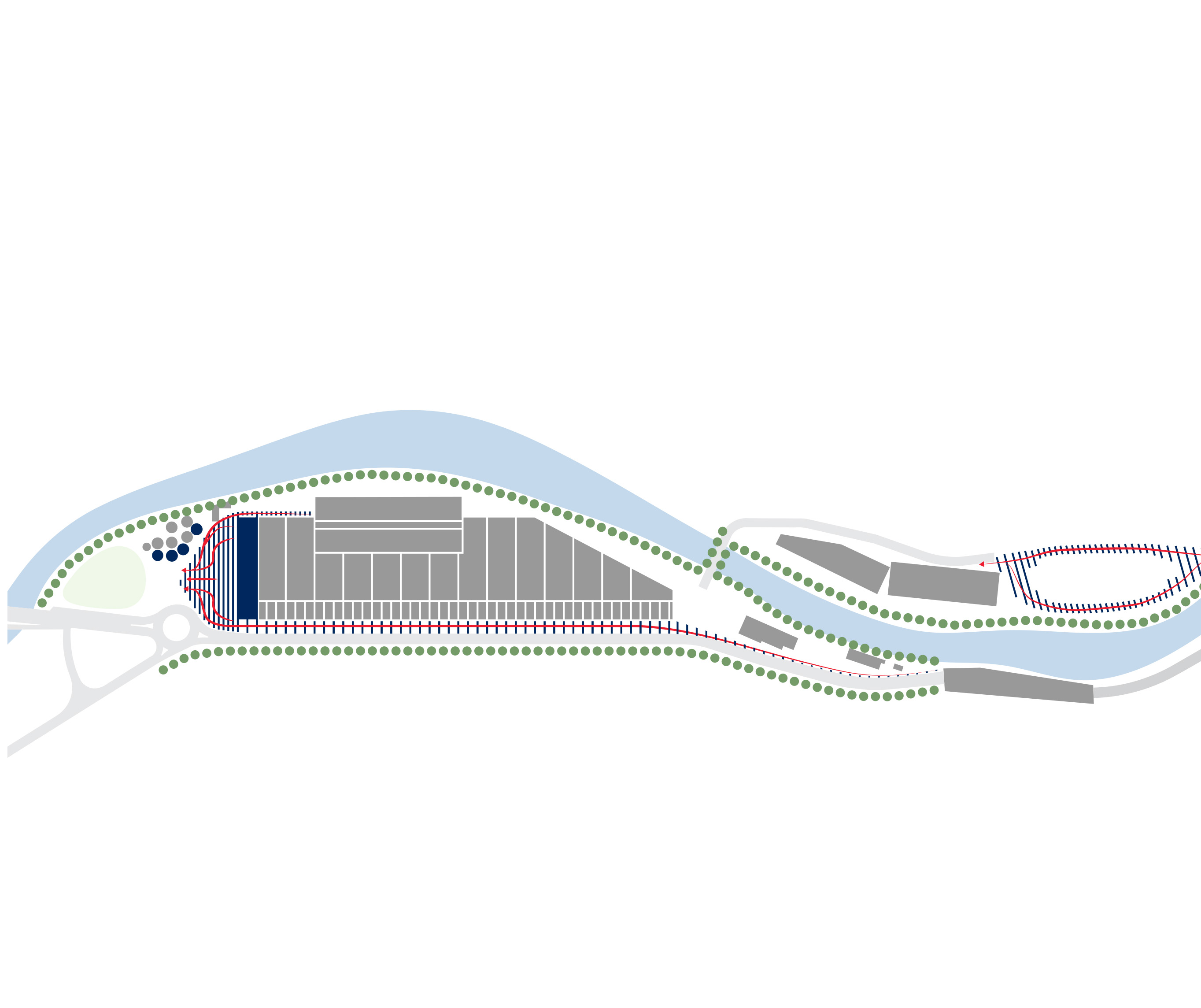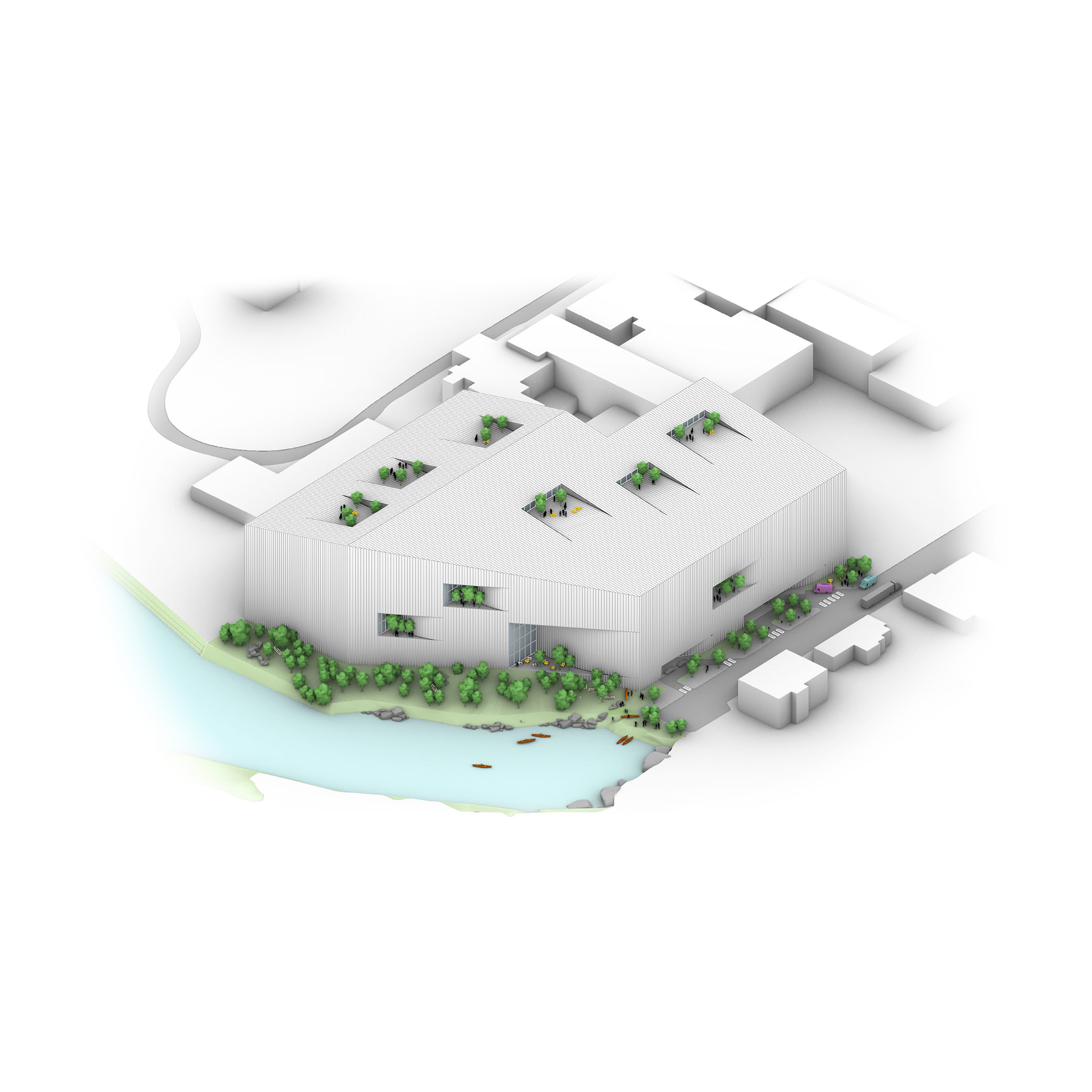 The timber structure and facades draw on Rouen’s tradition of half-timbered houses, while the roofline recalls the sails of its maritime history. From the city side, the PV-covered roof hovers above a new public forecourt that extends the urban fabric to the river. The forecourt combines open plazas paved in local stone with pockets of planting and trees, creating shaded gathering areas and green buffers around the building. Rainwater collected from the roof irrigates the planting, while paths connect the site with its surroundings and guide visitors to the entrances.