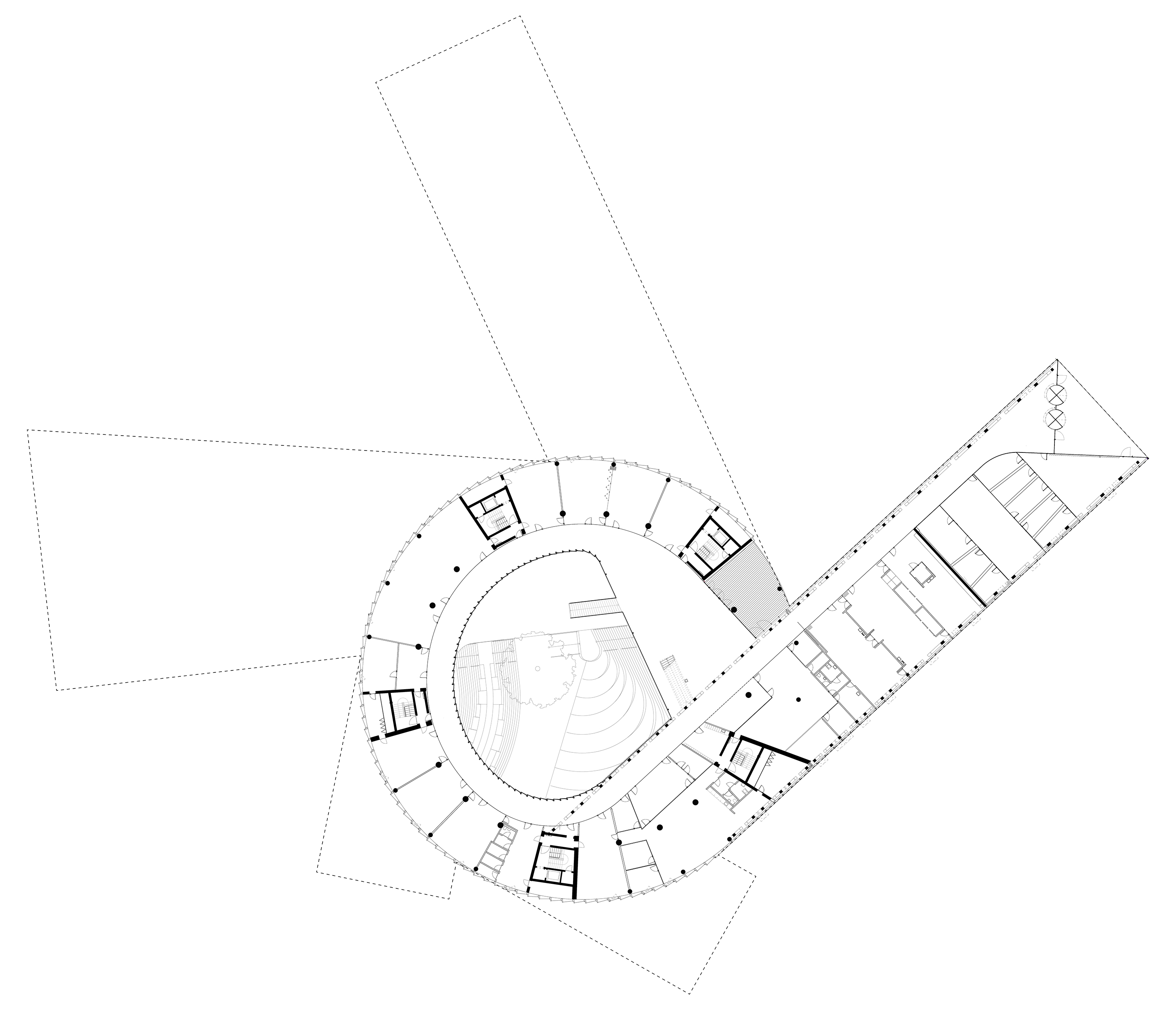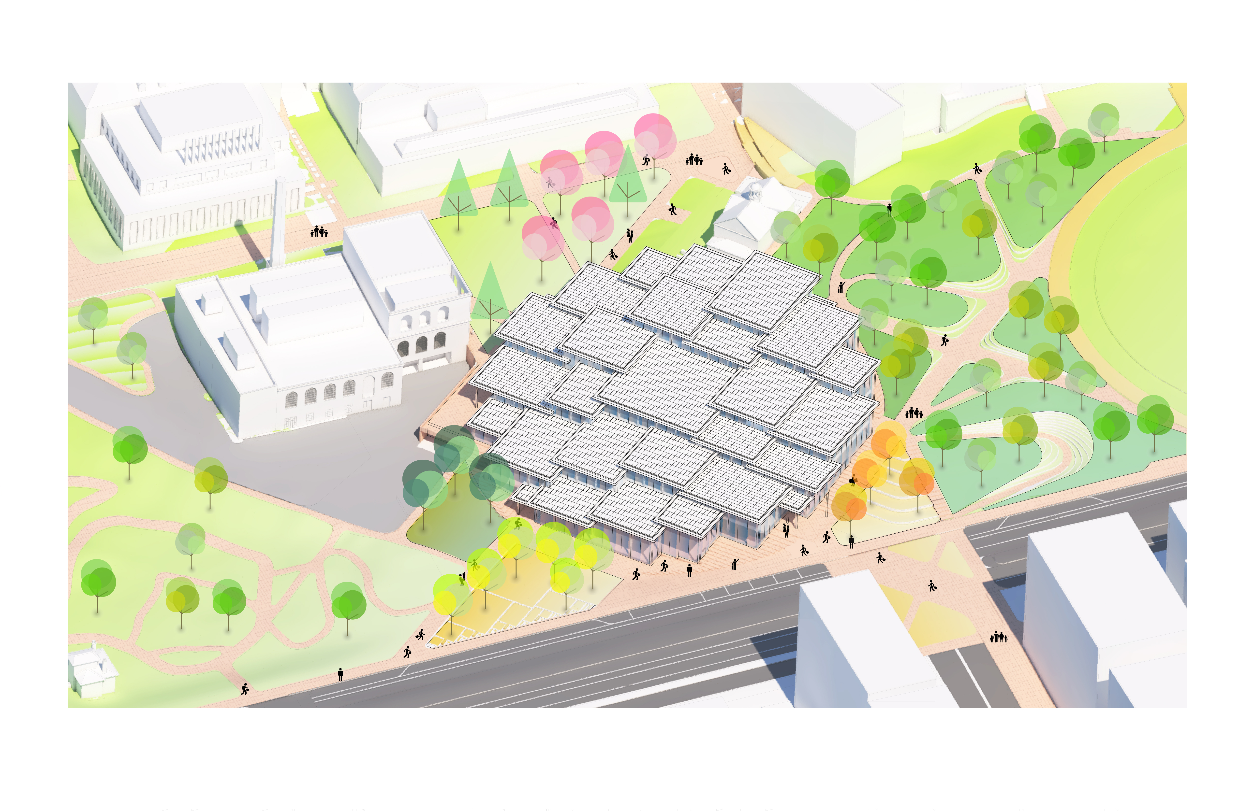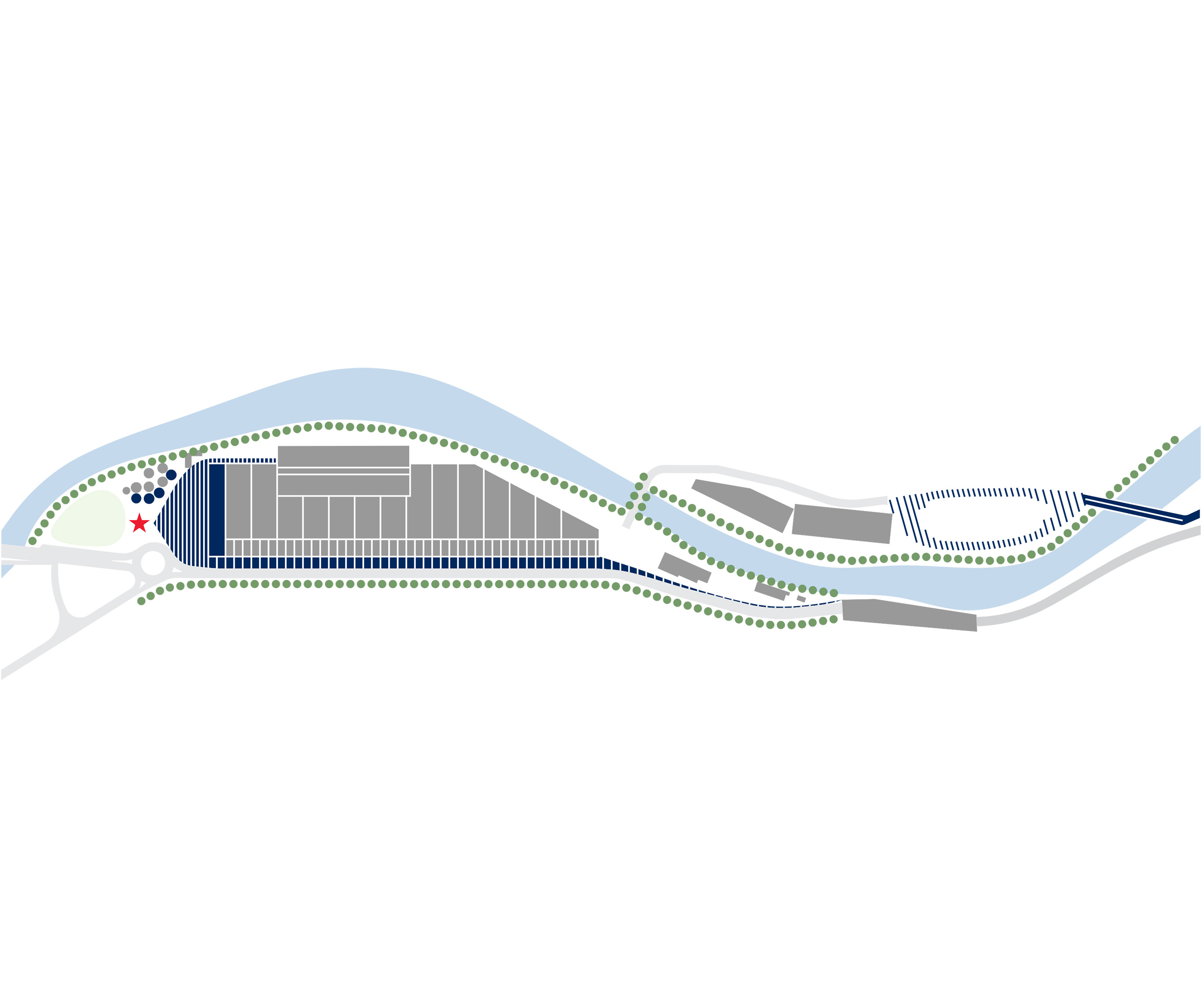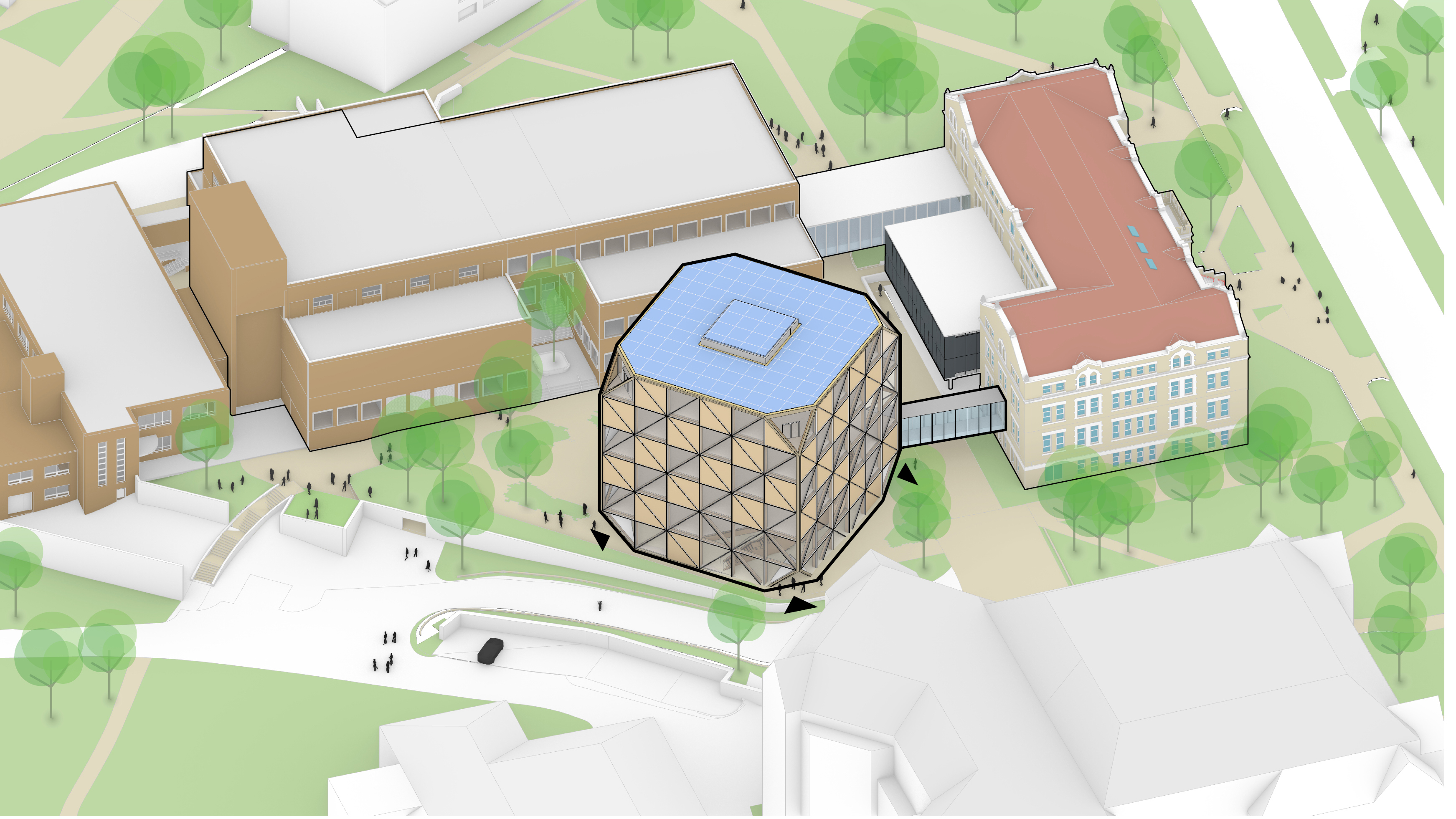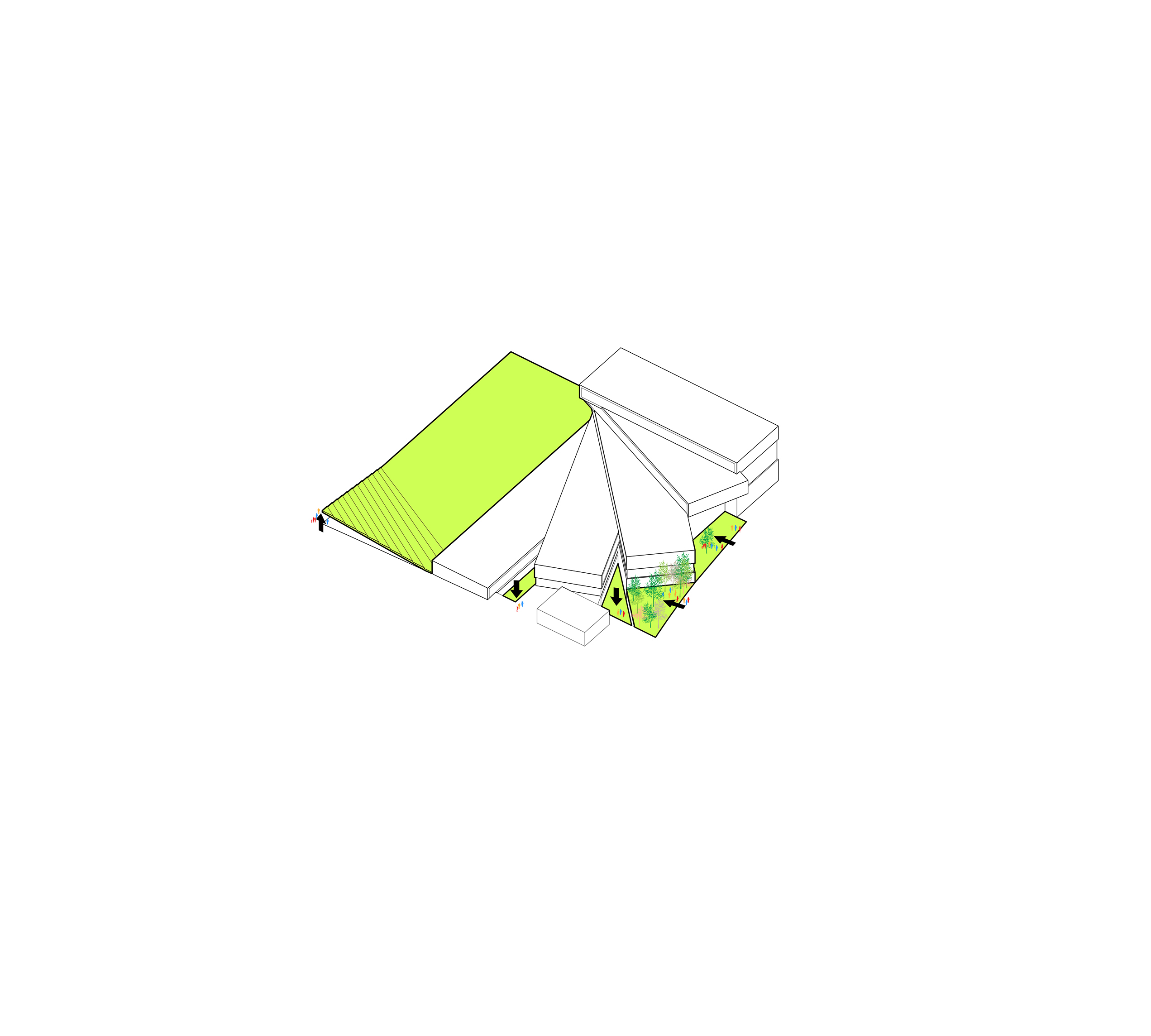 The timber structure and facades draw on Rouen’s tradition of half-timbered houses, while the roofline recalls the sails of its maritime history. From the city side, the PV-covered roof hovers above a new public forecourt that extends the urban fabric to the river. The forecourt combines open plazas paved in local stone with pockets of planting and trees, creating shaded gathering areas and green buffers around the building. Rainwater collected from the roof irrigates the planting, while paths connect the site with its surroundings and guide visitors to the entrances.