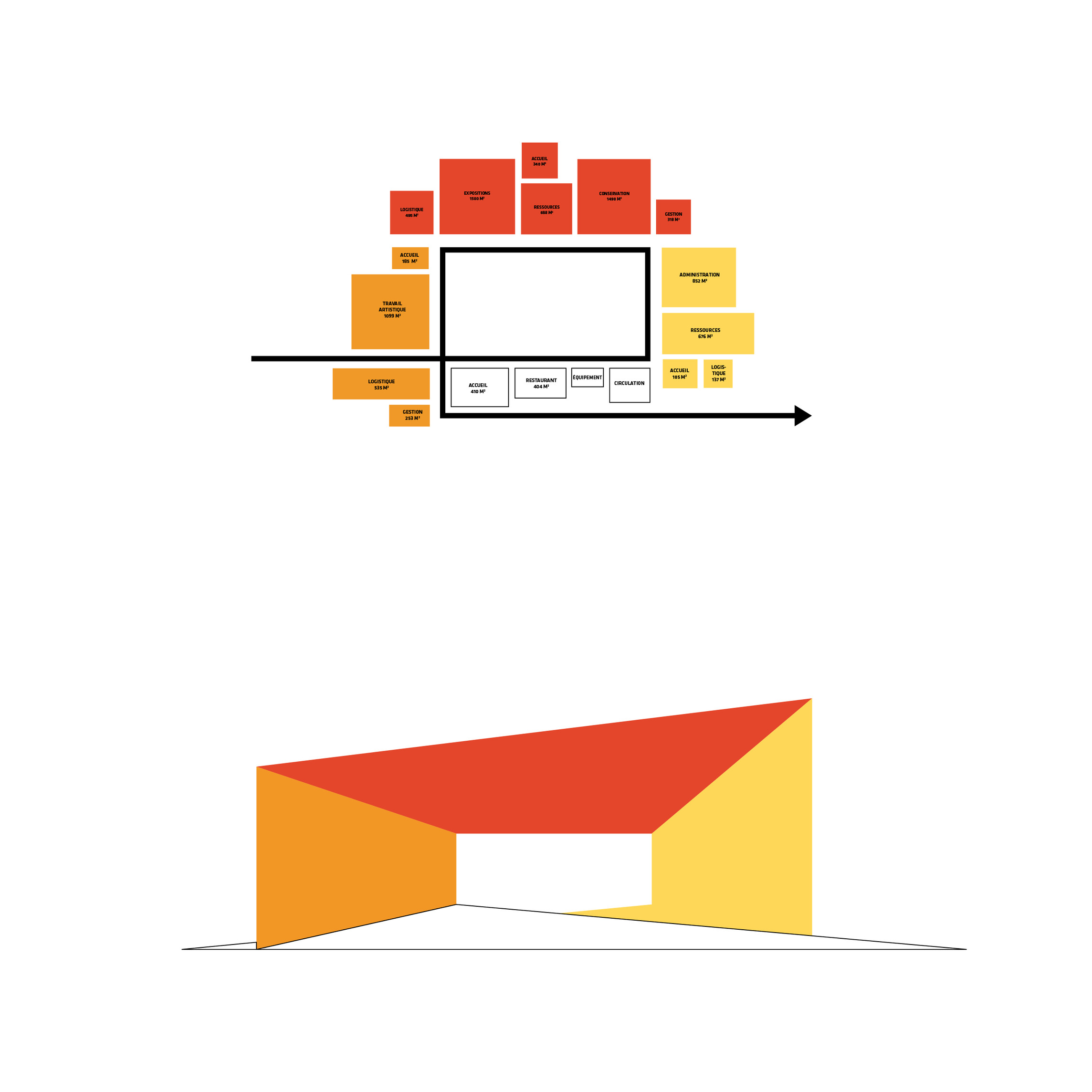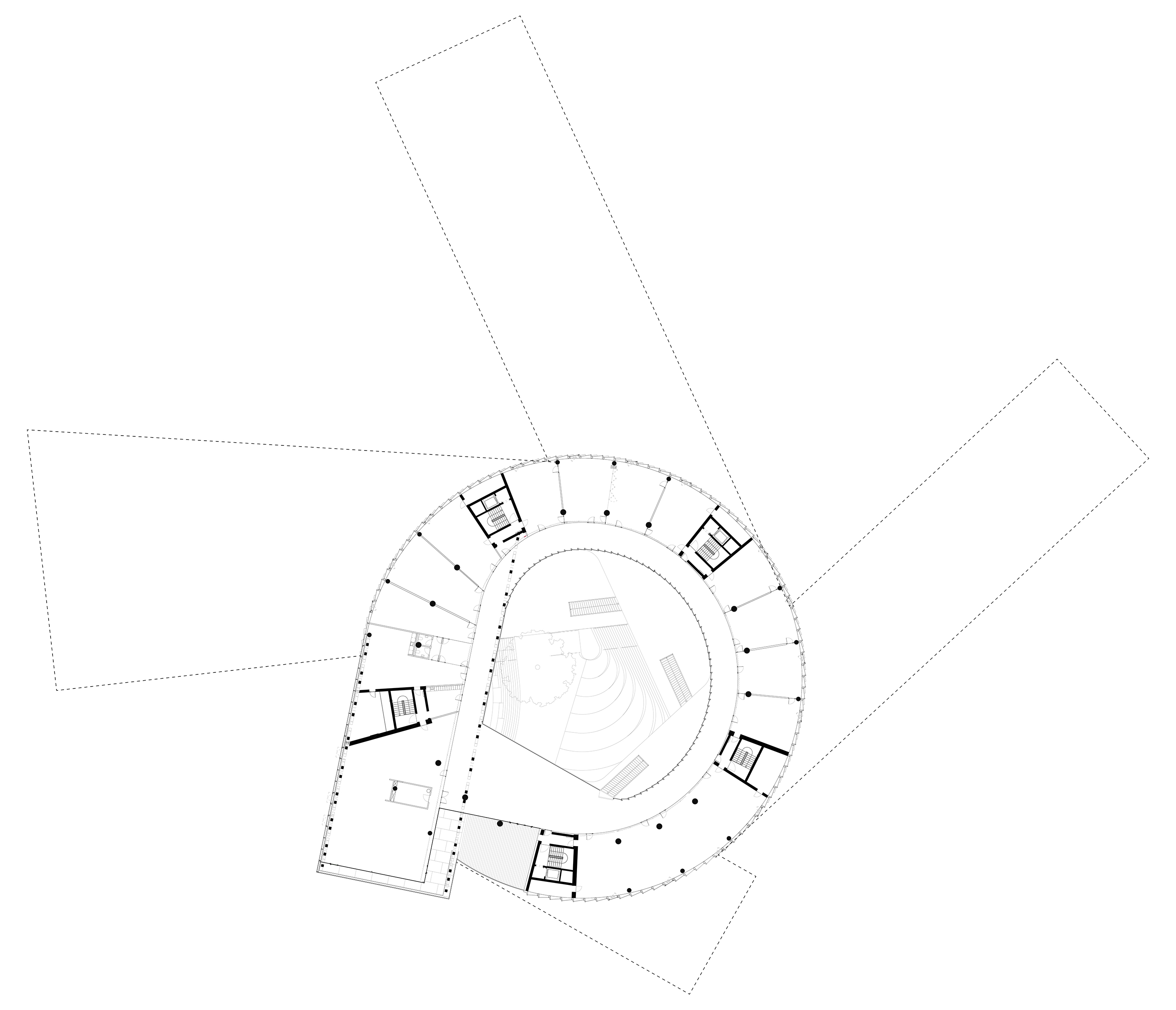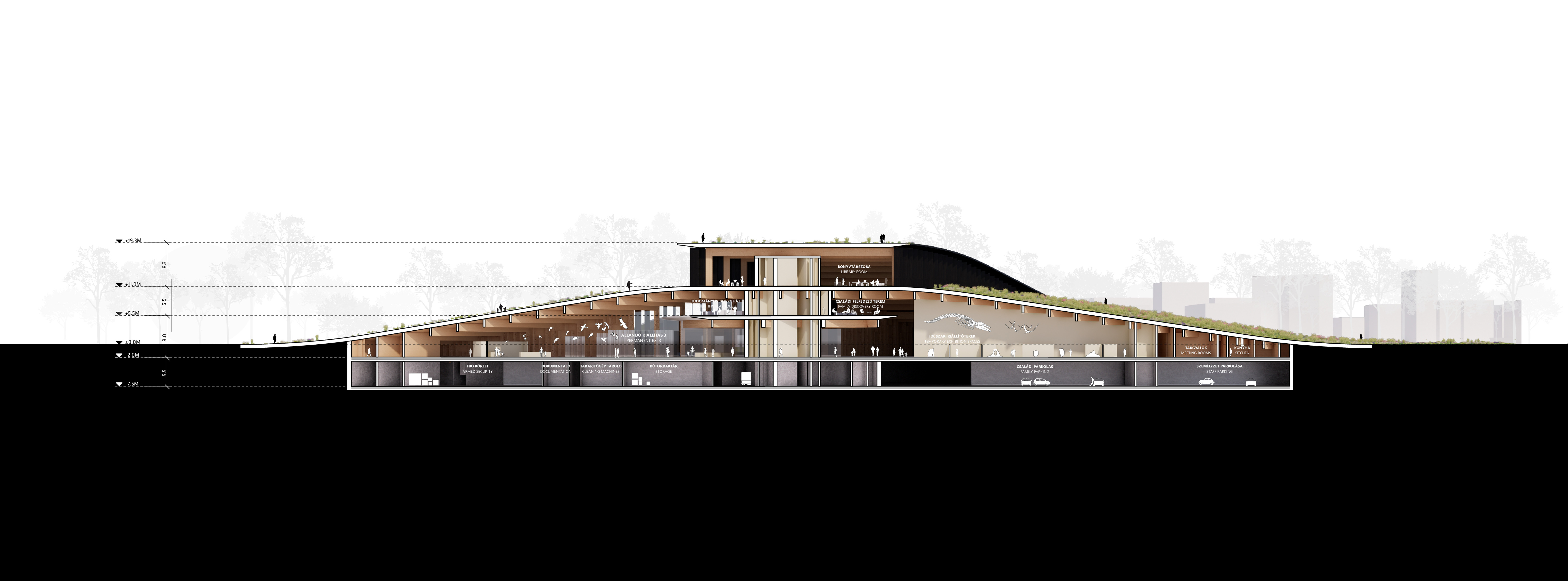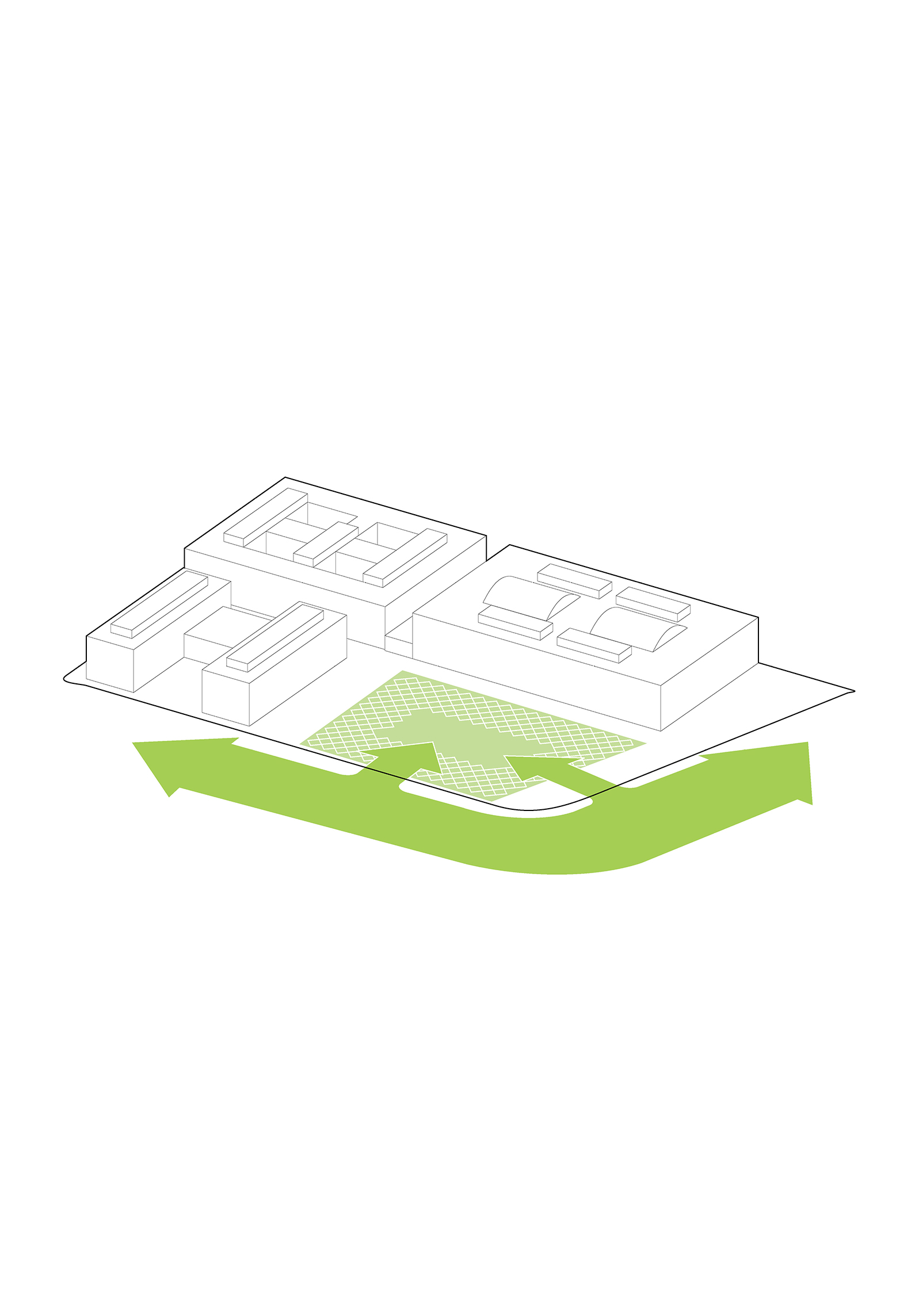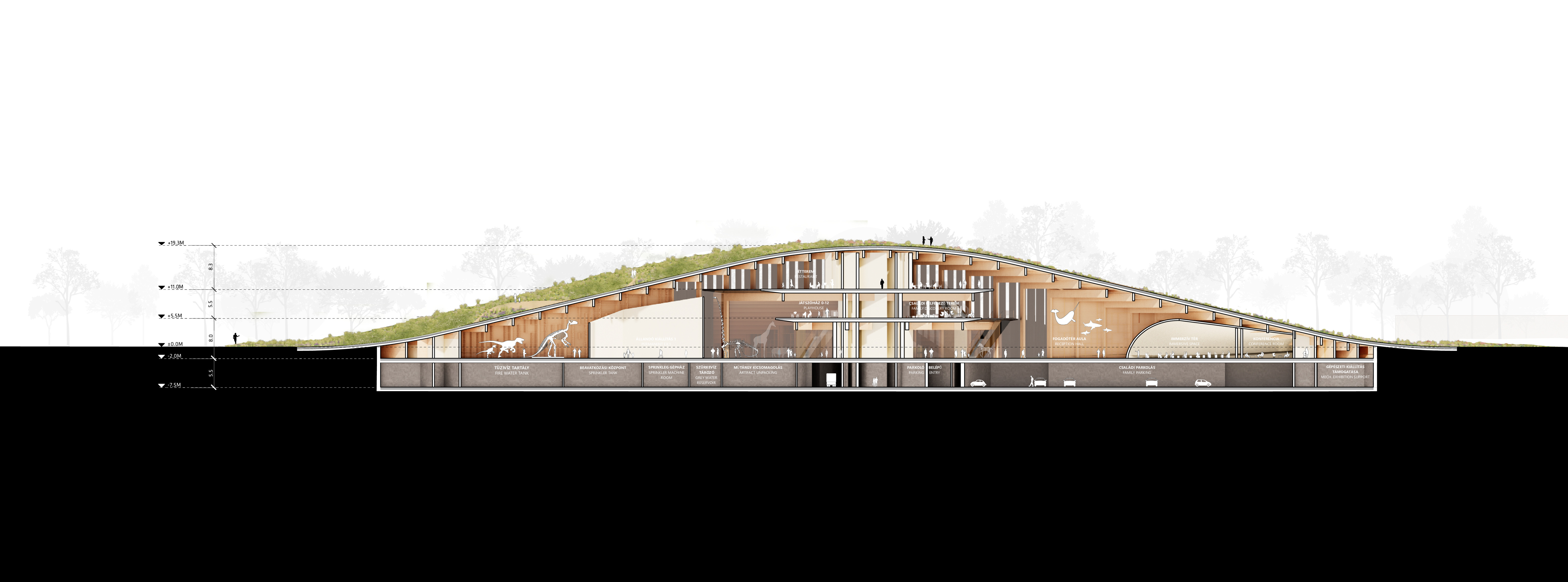 The timber structure and facades draw on Rouen’s tradition of half-timbered houses, while the roofline recalls the sails of its maritime history. From the city side, the PV-covered roof hovers above a new public forecourt that extends the urban fabric to the river. The forecourt combines open plazas paved in local stone with pockets of planting and trees, creating shaded gathering areas and green buffers around the building. Rainwater collected from the roof irrigates the planting, while paths connect the site with its surroundings and guide visitors to the entrances.