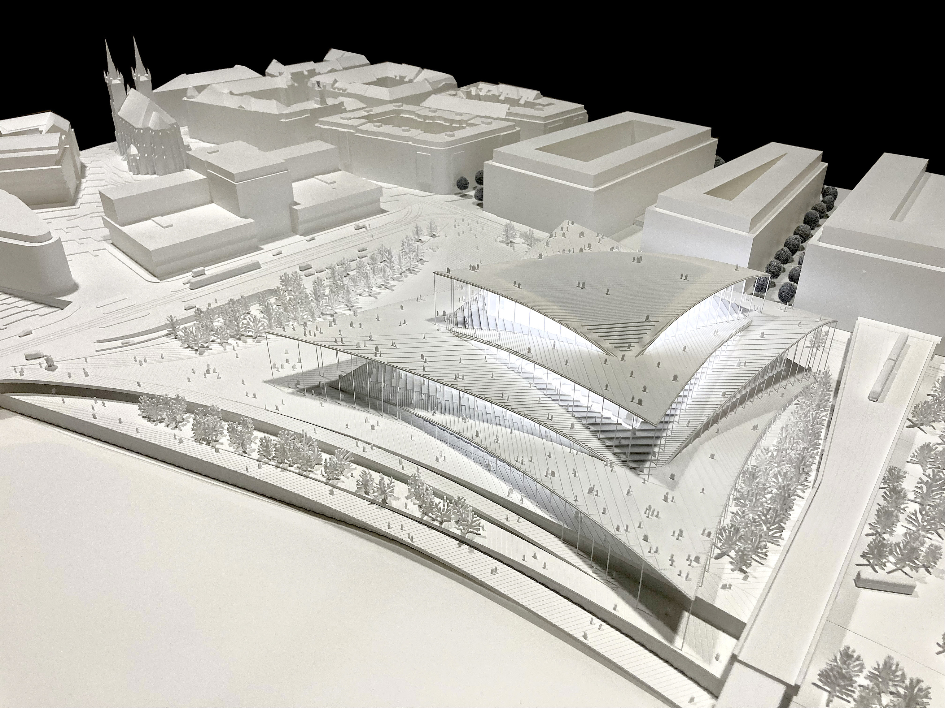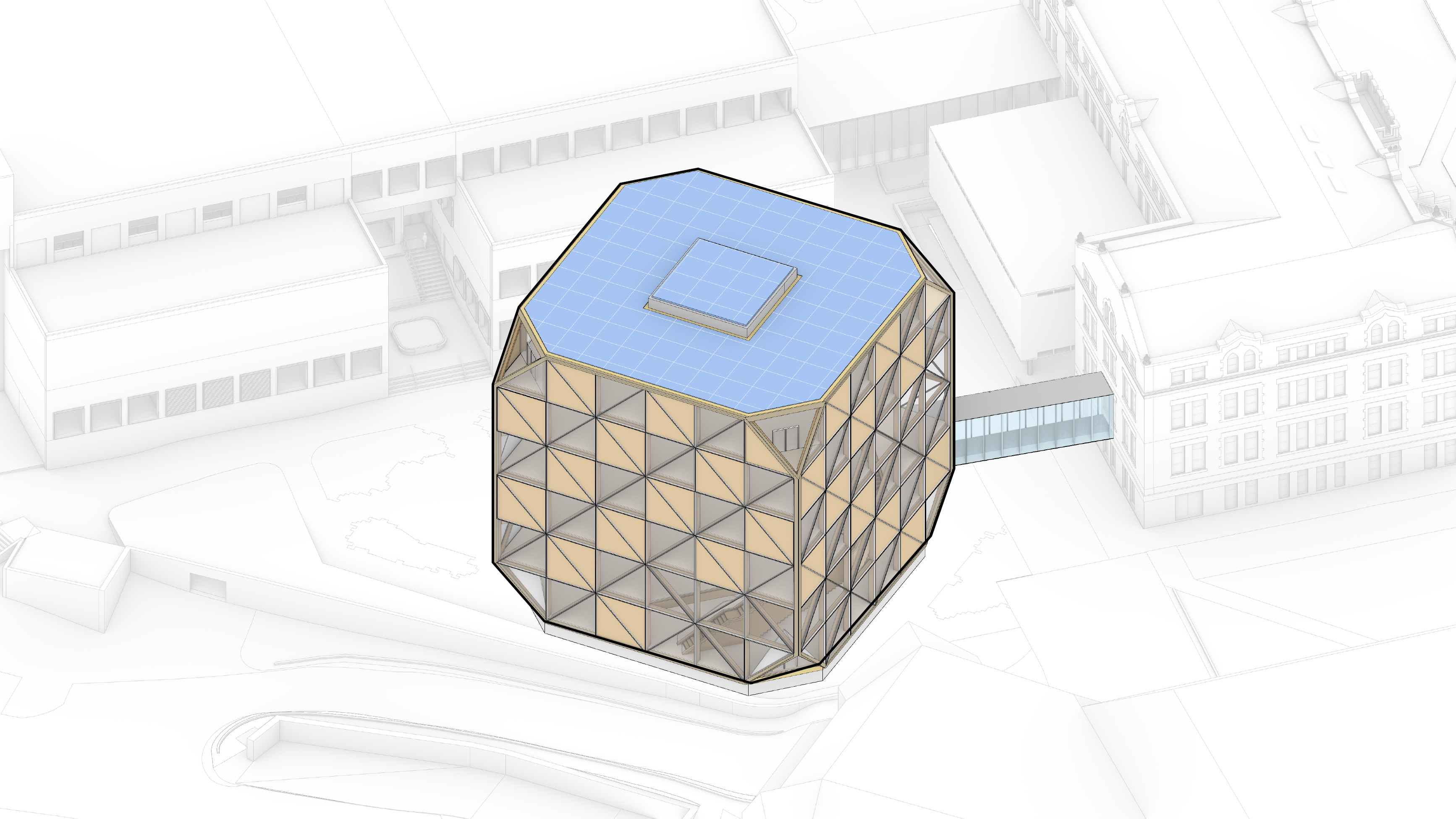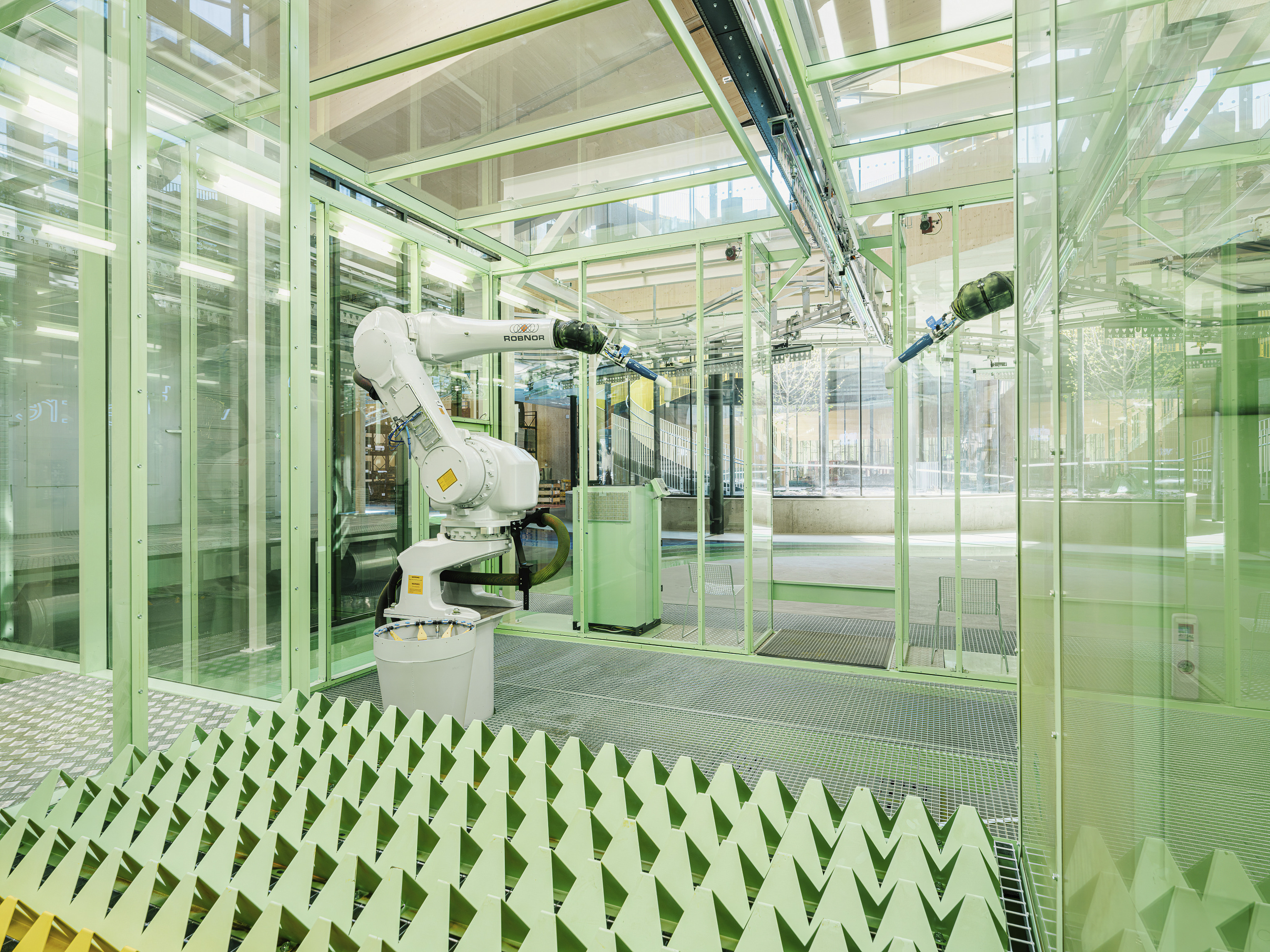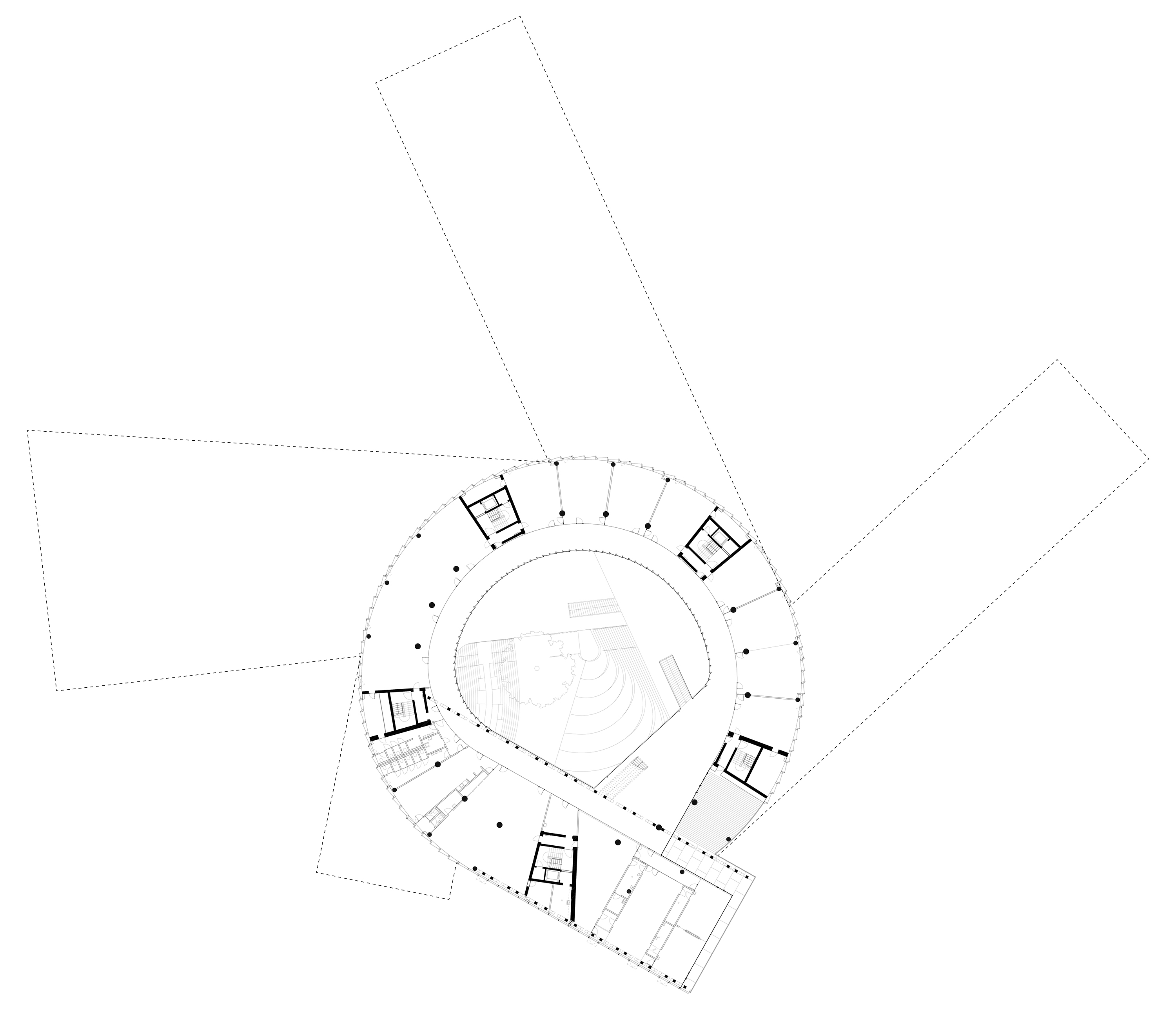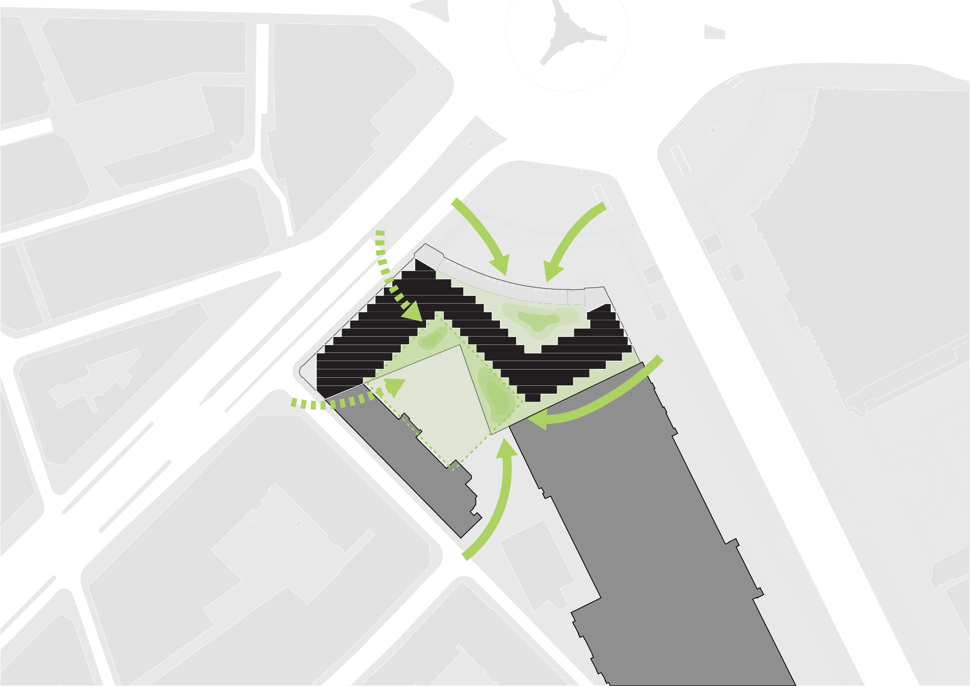 The timber structure and facades draw on Rouen’s tradition of half-timbered houses, while the roofline recalls the sails of its maritime history. From the city side, the PV-covered roof hovers above a new public forecourt that extends the urban fabric to the river. The forecourt combines open plazas paved in local stone with pockets of planting and trees, creating shaded gathering areas and green buffers around the building. Rainwater collected from the roof irrigates the planting, while paths connect the site with its surroundings and guide visitors to the entrances.