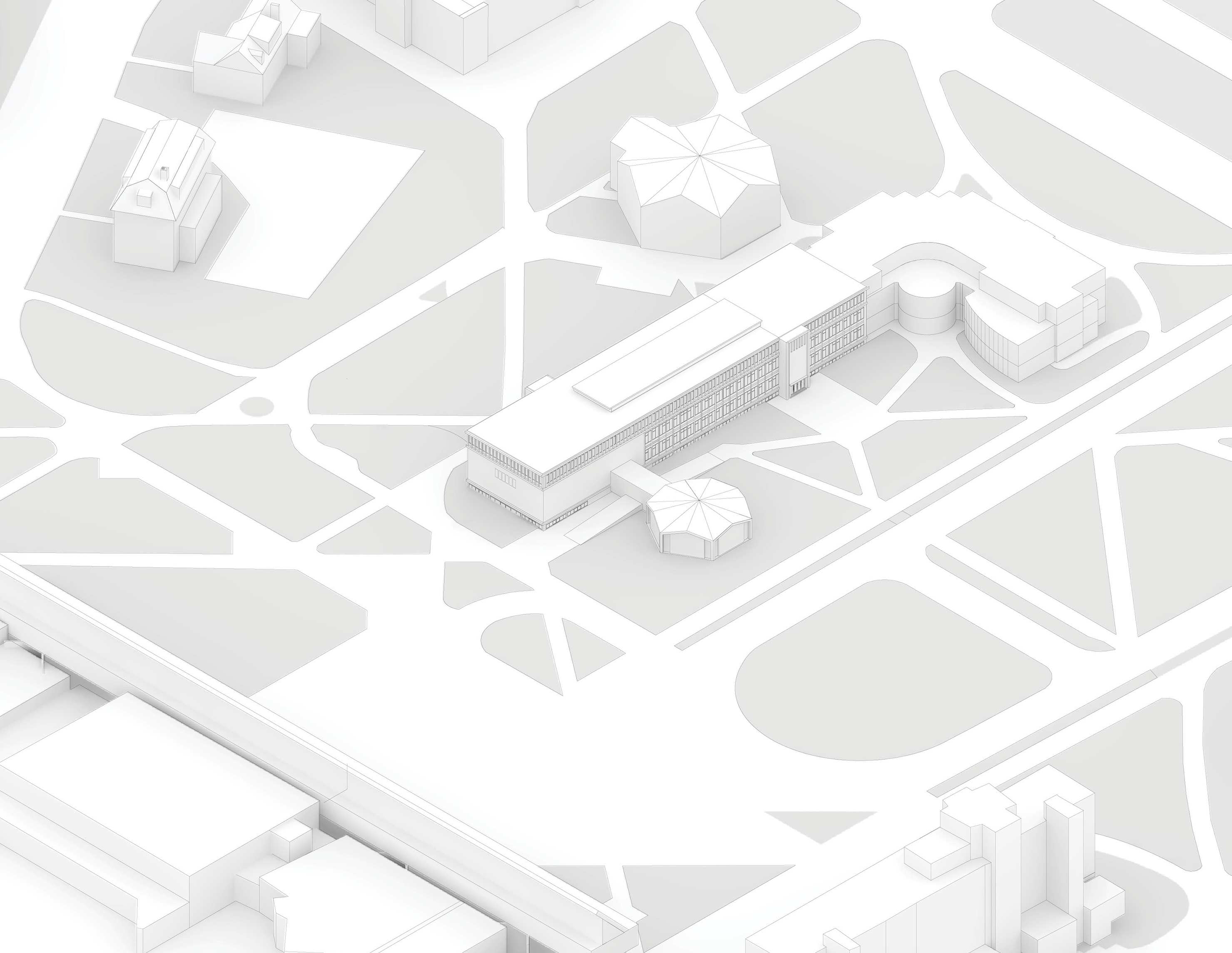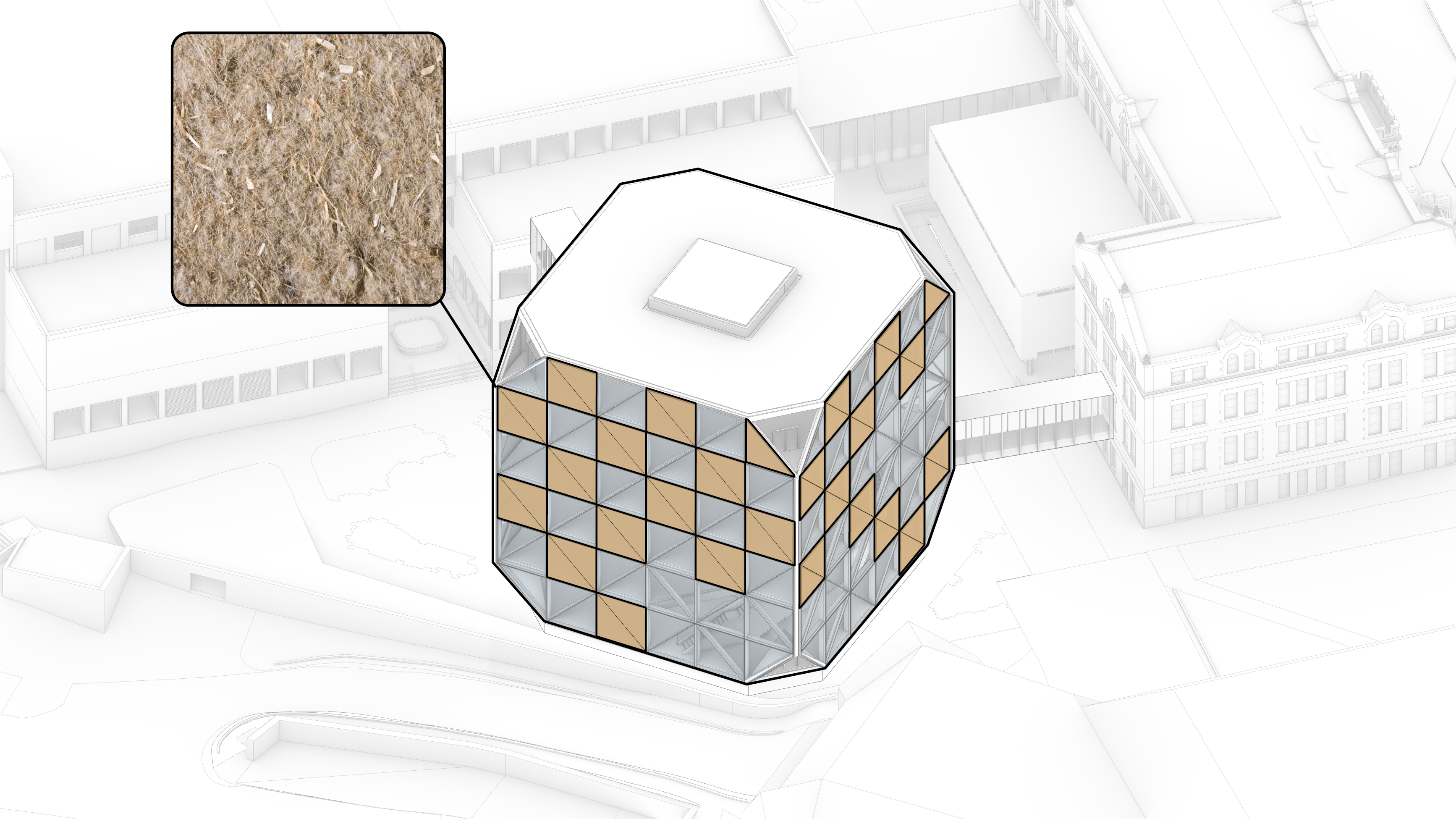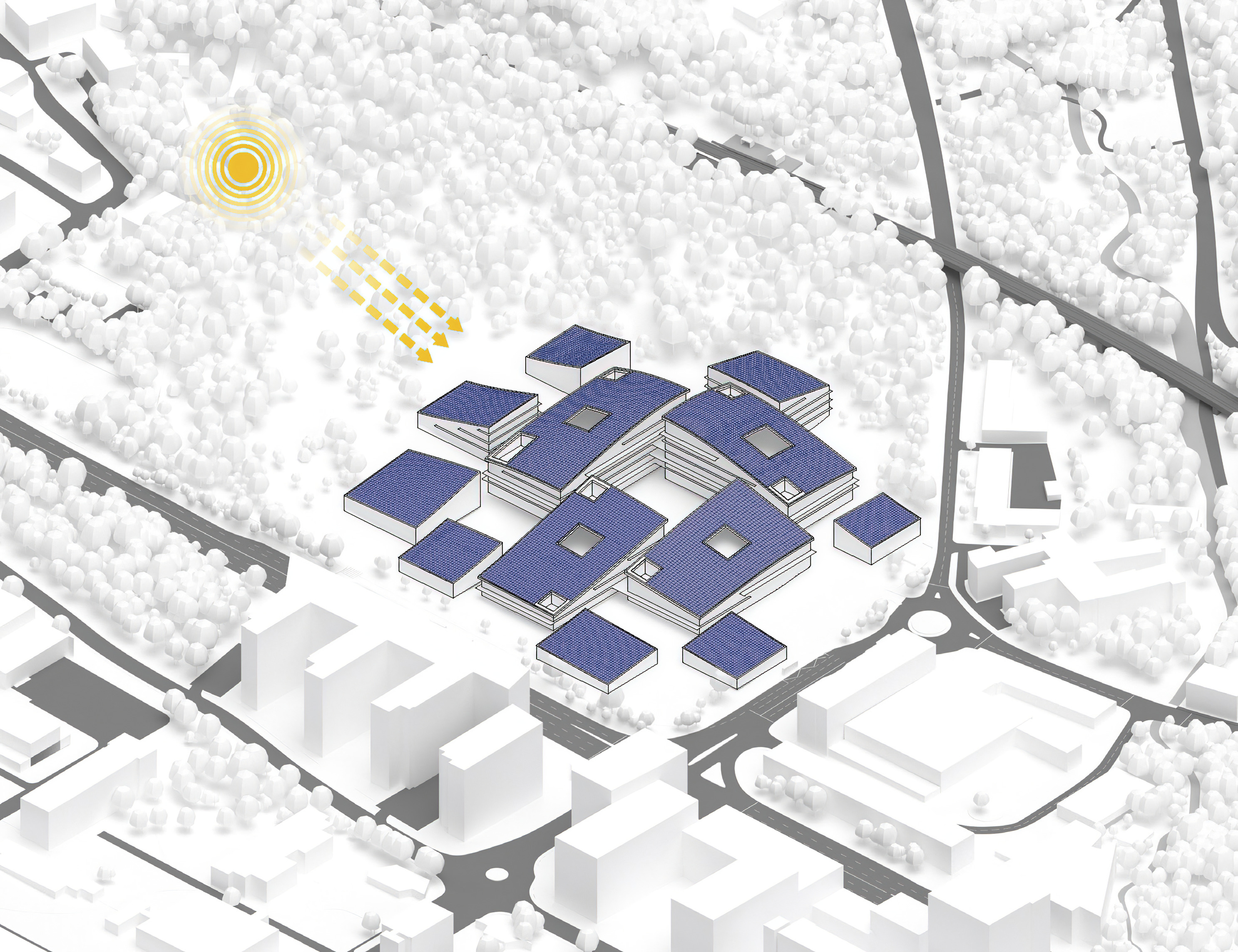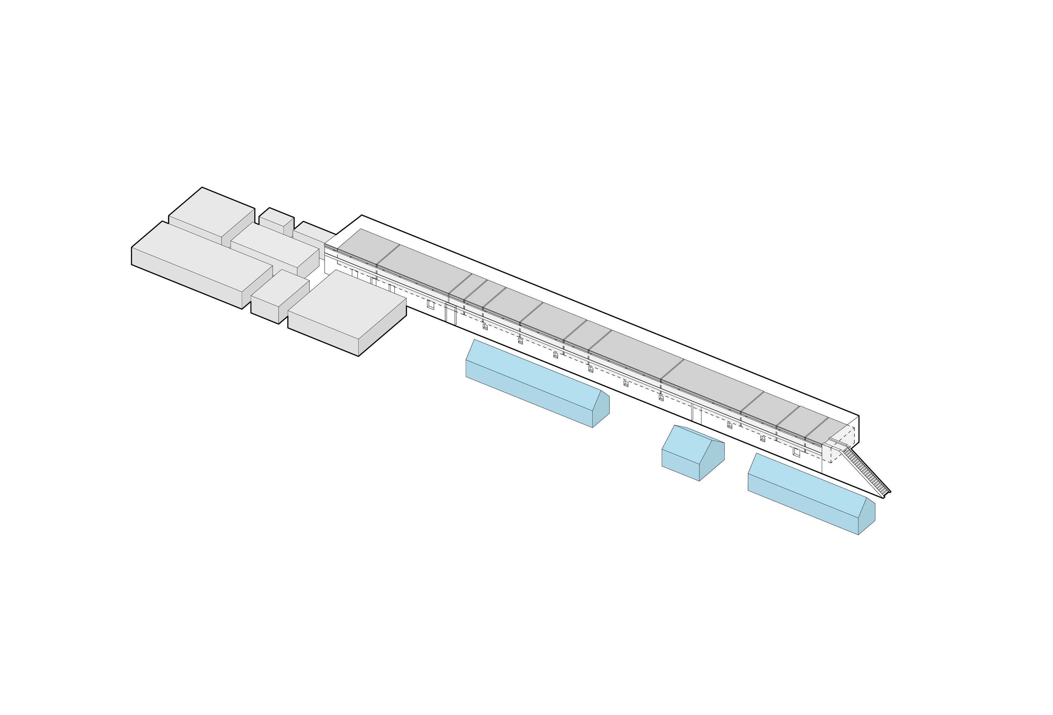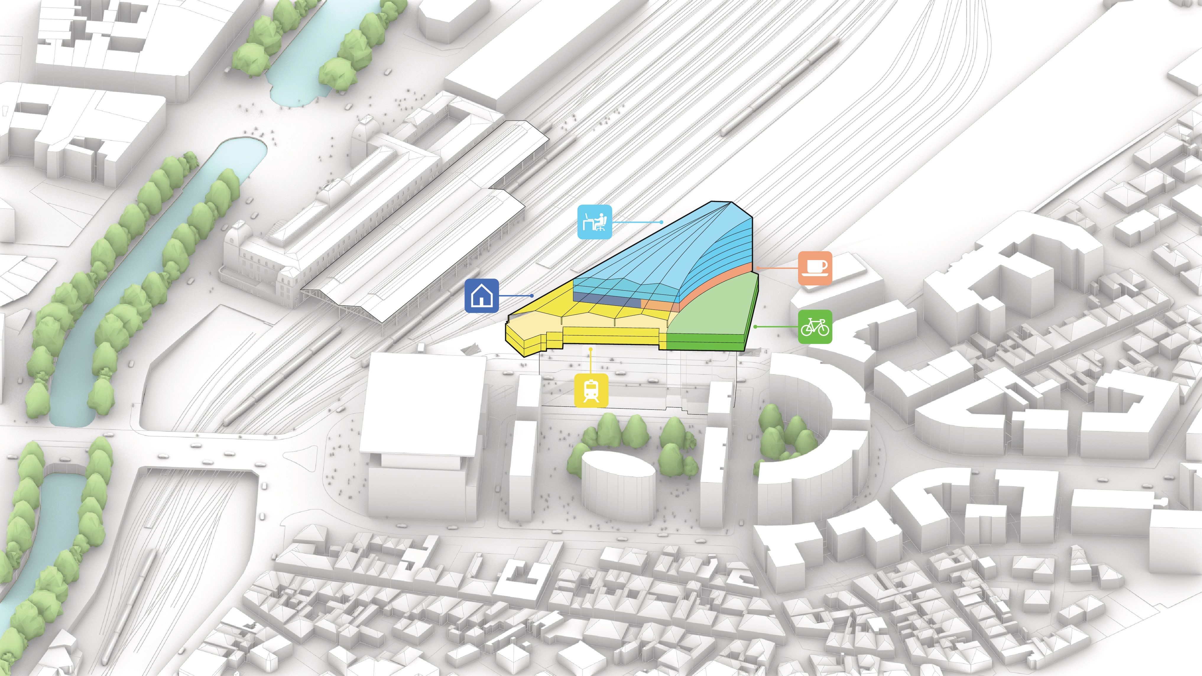 The timber structure and facades draw on Rouen’s tradition of half-timbered houses, while the roofline recalls the sails of its maritime history. From the city side, the PV-covered roof hovers above a new public forecourt that extends the urban fabric to the river. The forecourt combines open plazas paved in local stone with pockets of planting and trees, creating shaded gathering areas and green buffers around the building. Rainwater collected from the roof irrigates the planting, while paths connect the site with its surroundings and guide visitors to the entrances.