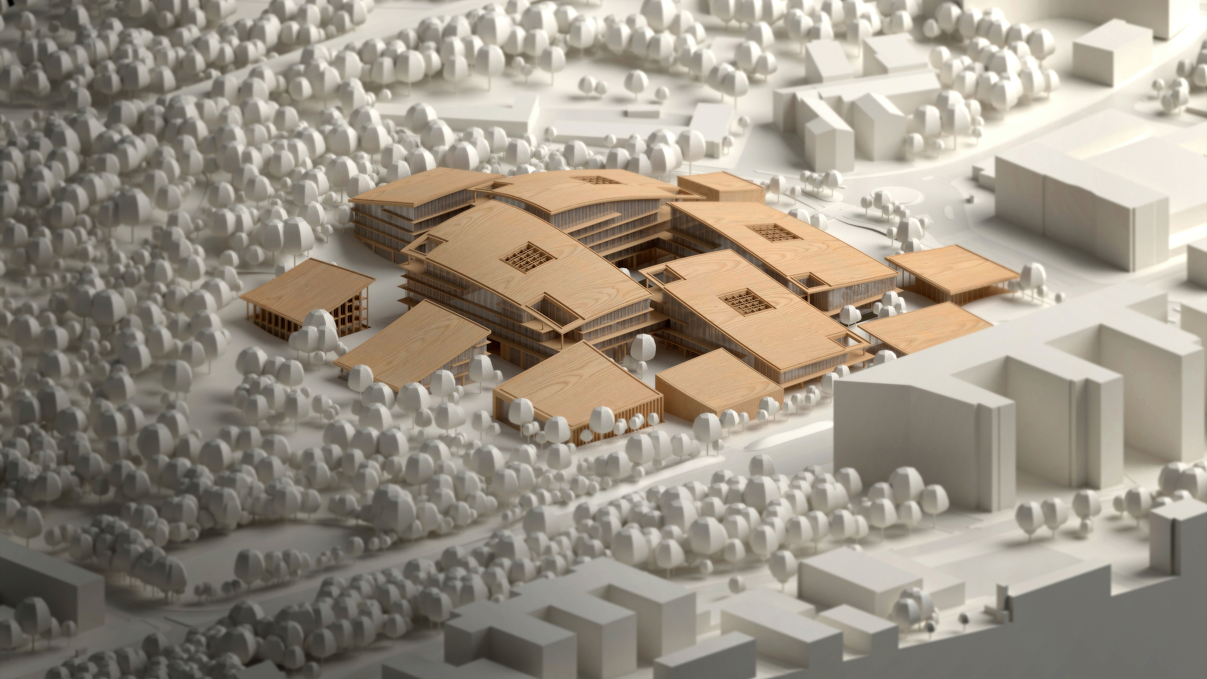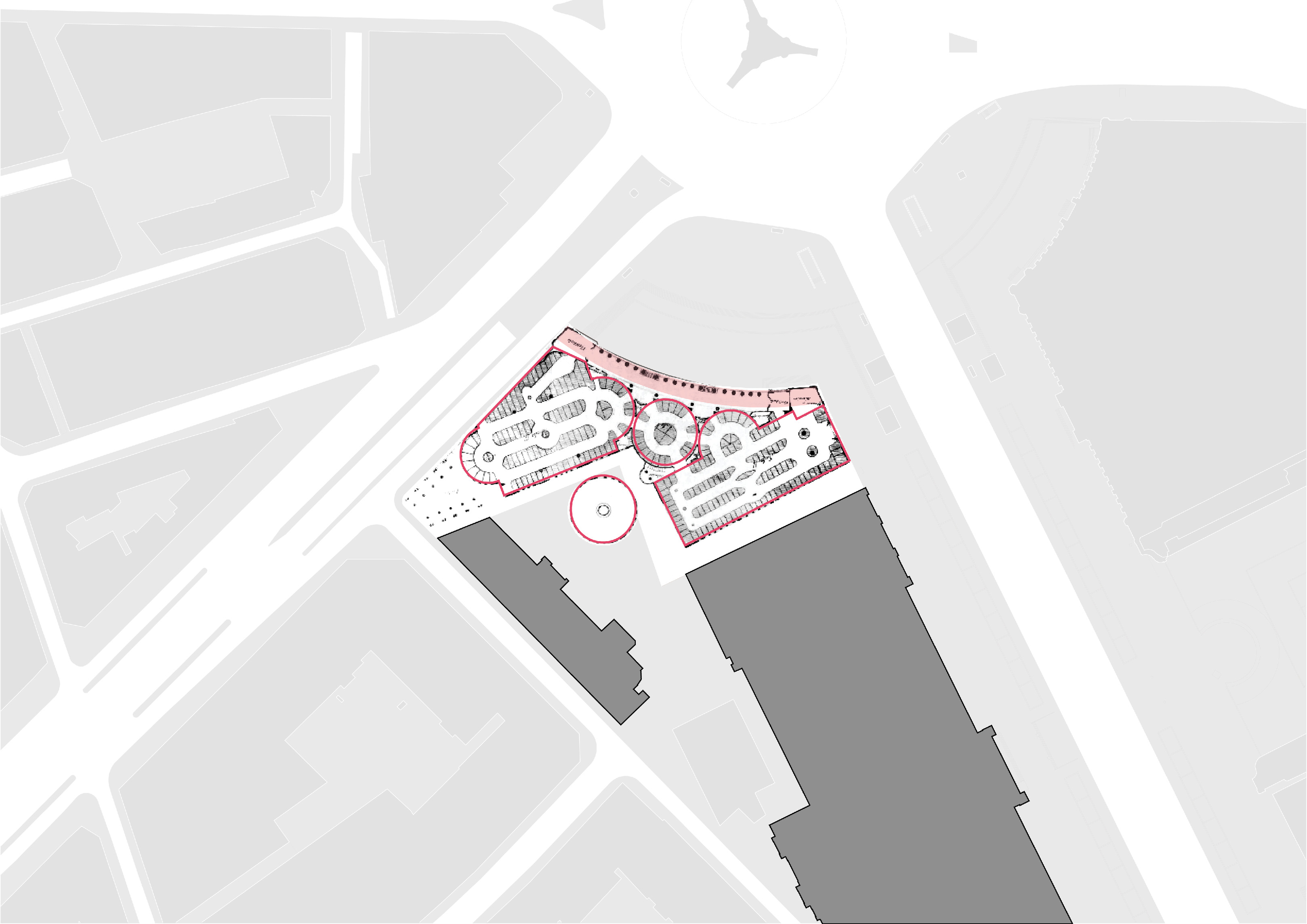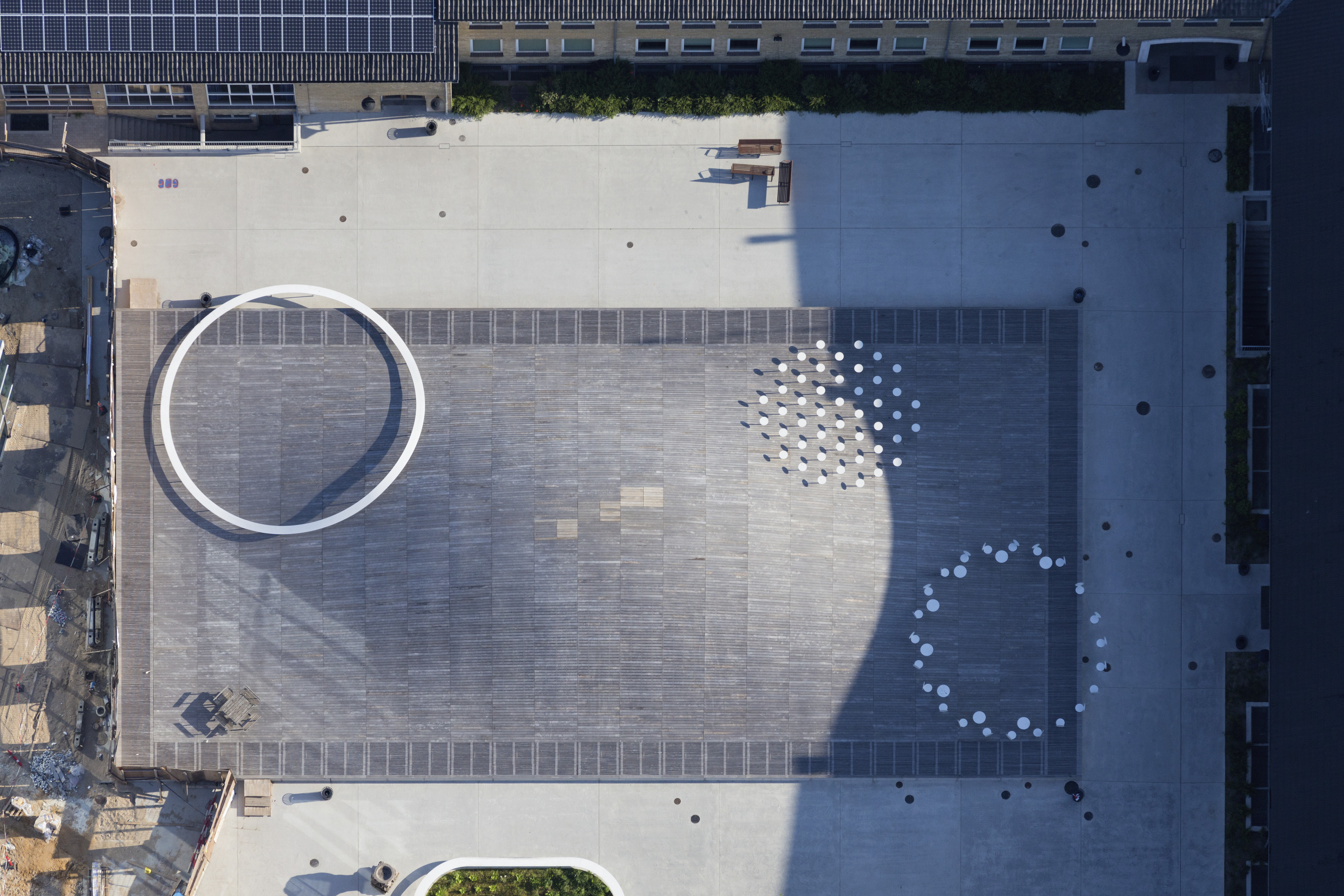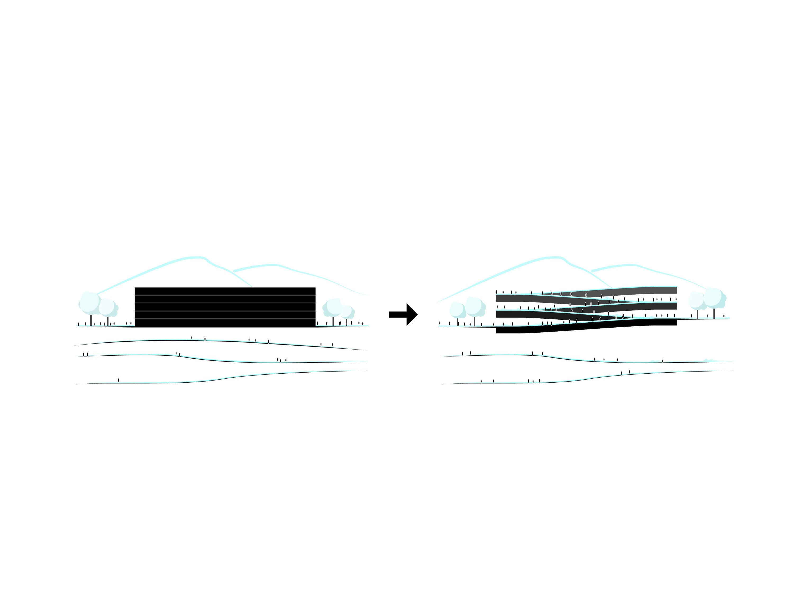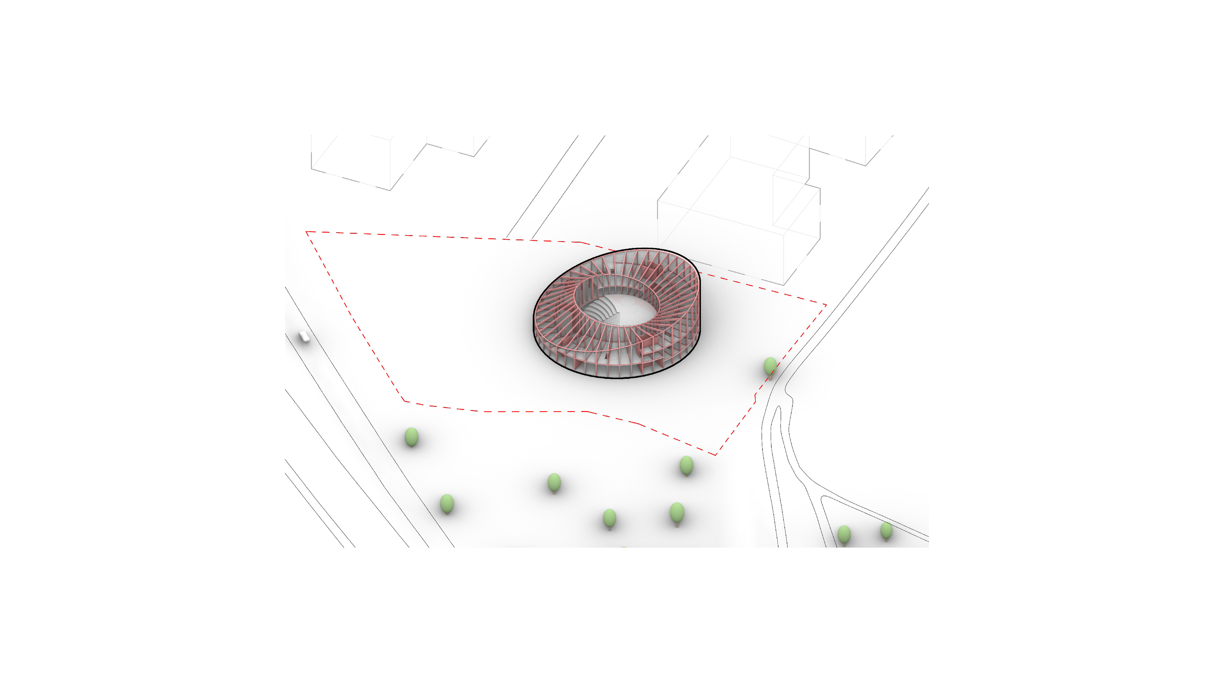 The timber structure and facades draw on Rouen’s tradition of half-timbered houses, while the roofline recalls the sails of its maritime history. From the city side, the PV-covered roof hovers above a new public forecourt that extends the urban fabric to the river. The forecourt combines open plazas paved in local stone with pockets of planting and trees, creating shaded gathering areas and green buffers around the building. Rainwater collected from the roof irrigates the planting, while paths connect the site with its surroundings and guide visitors to the entrances.