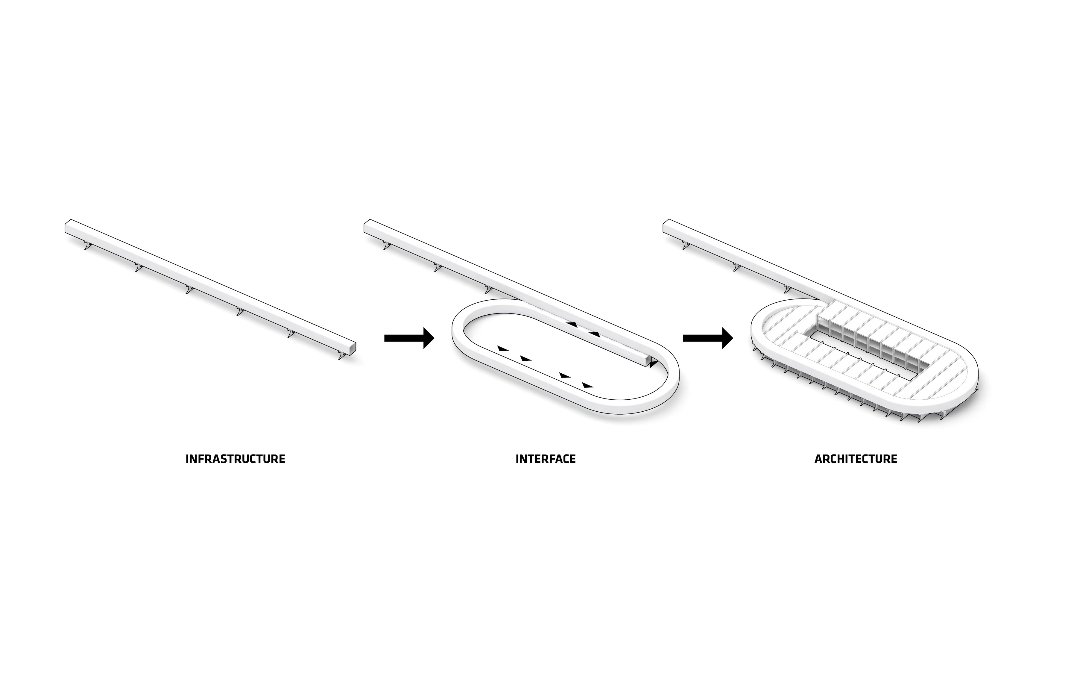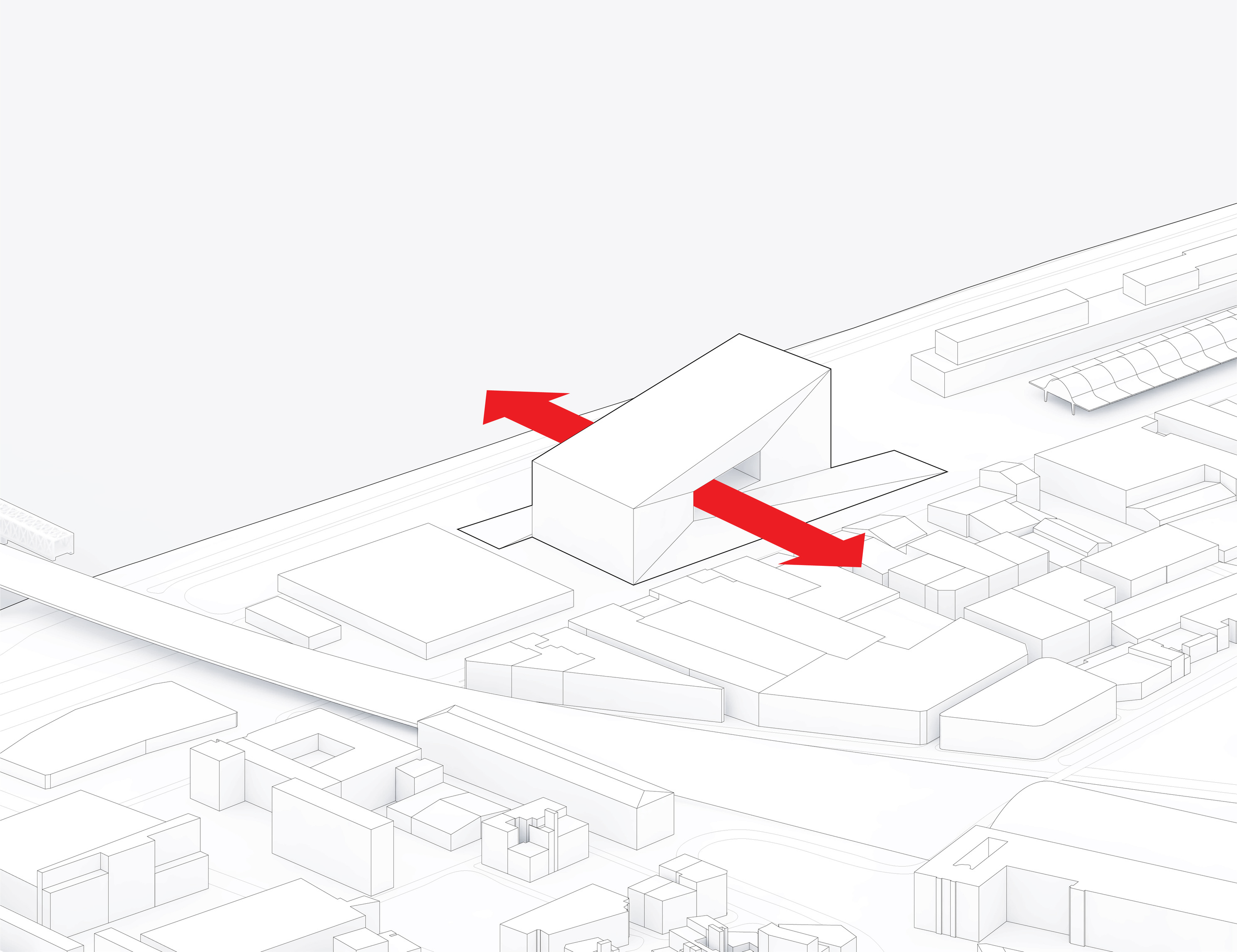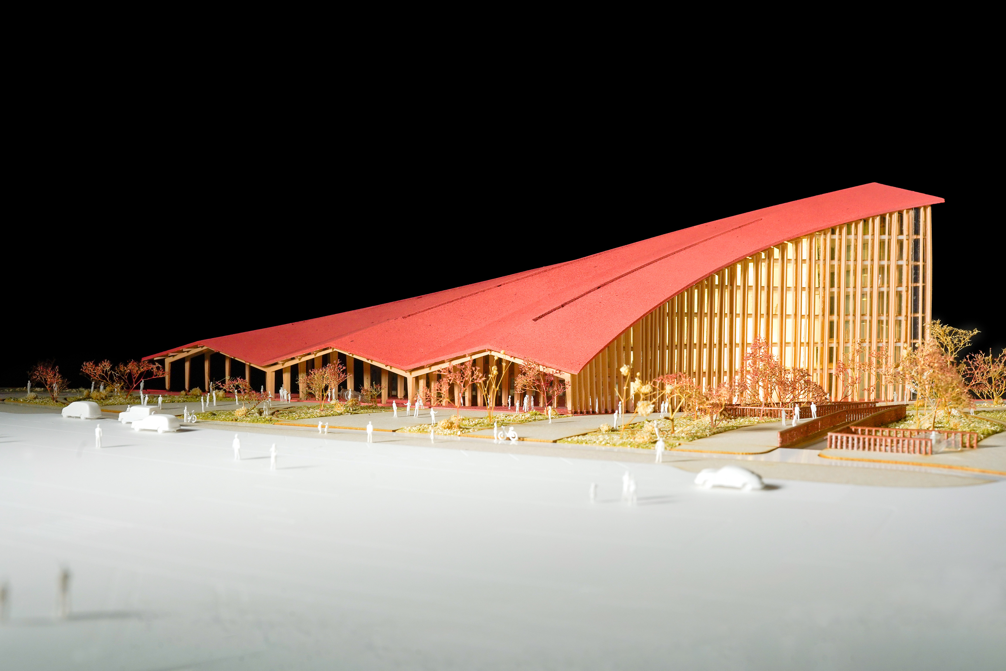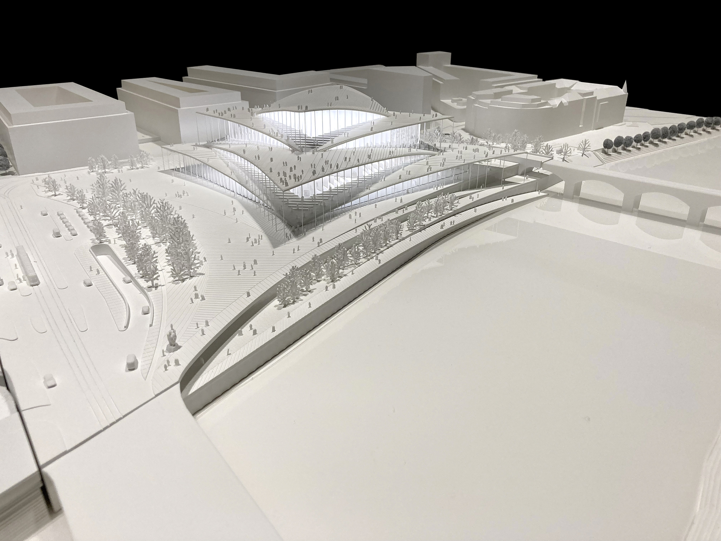 “Rising along the Seine, The Sail introduces a new silhouette to Rouen with its sweeping roofline paying tribute to the city’s naval heritage and historic skyline of spires. The building greets visitors from the highway with a vertical façade, while on the city side, the roof creates sheltered canopies extending the foyer into a human-scaled public landscape. Built with mass timber construction, daylight-optimized interiors and an energy-producing roof, it is both a low-impact infrastructure and a cultural hub - offering an inclusive space for Rouen and its visitors.”