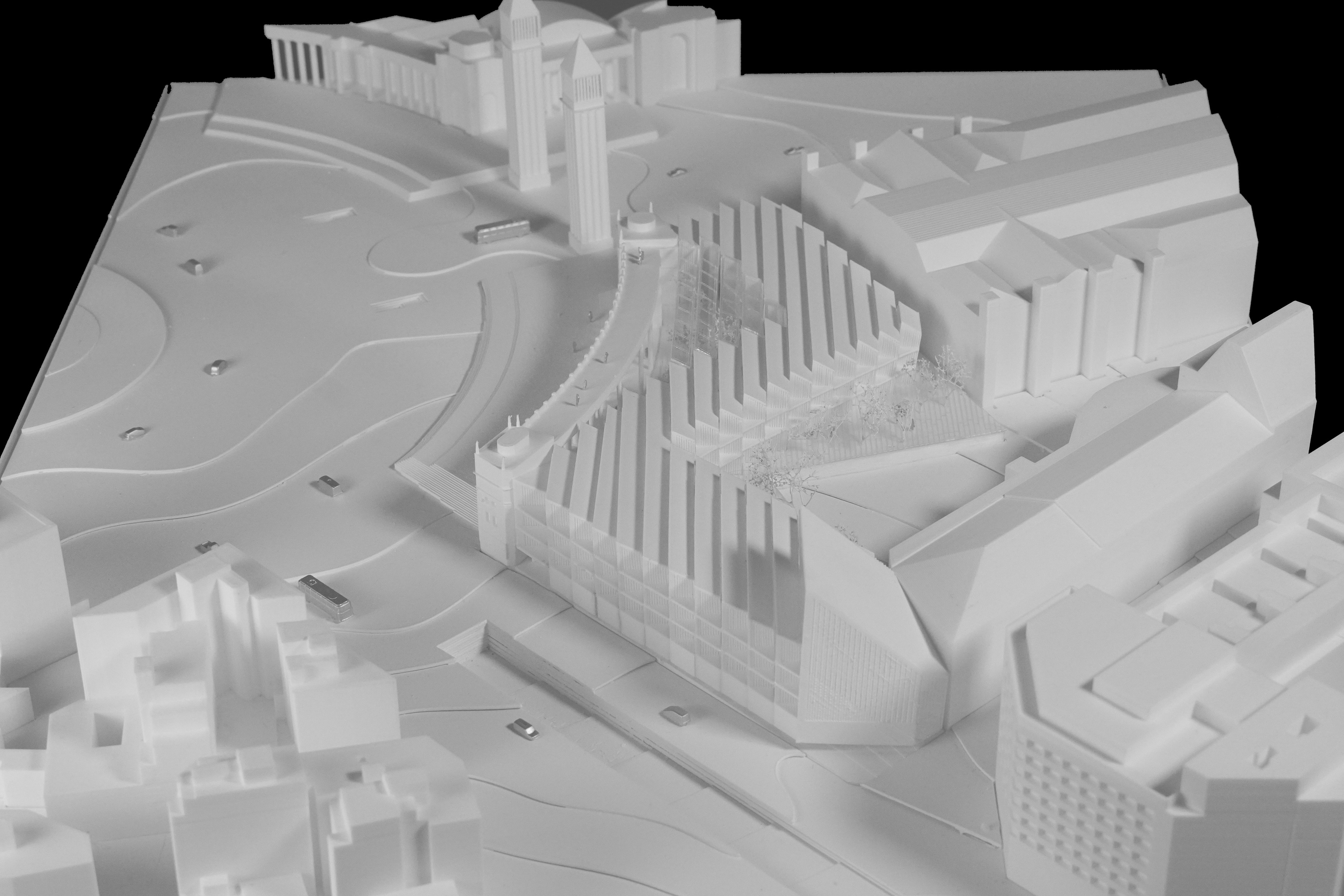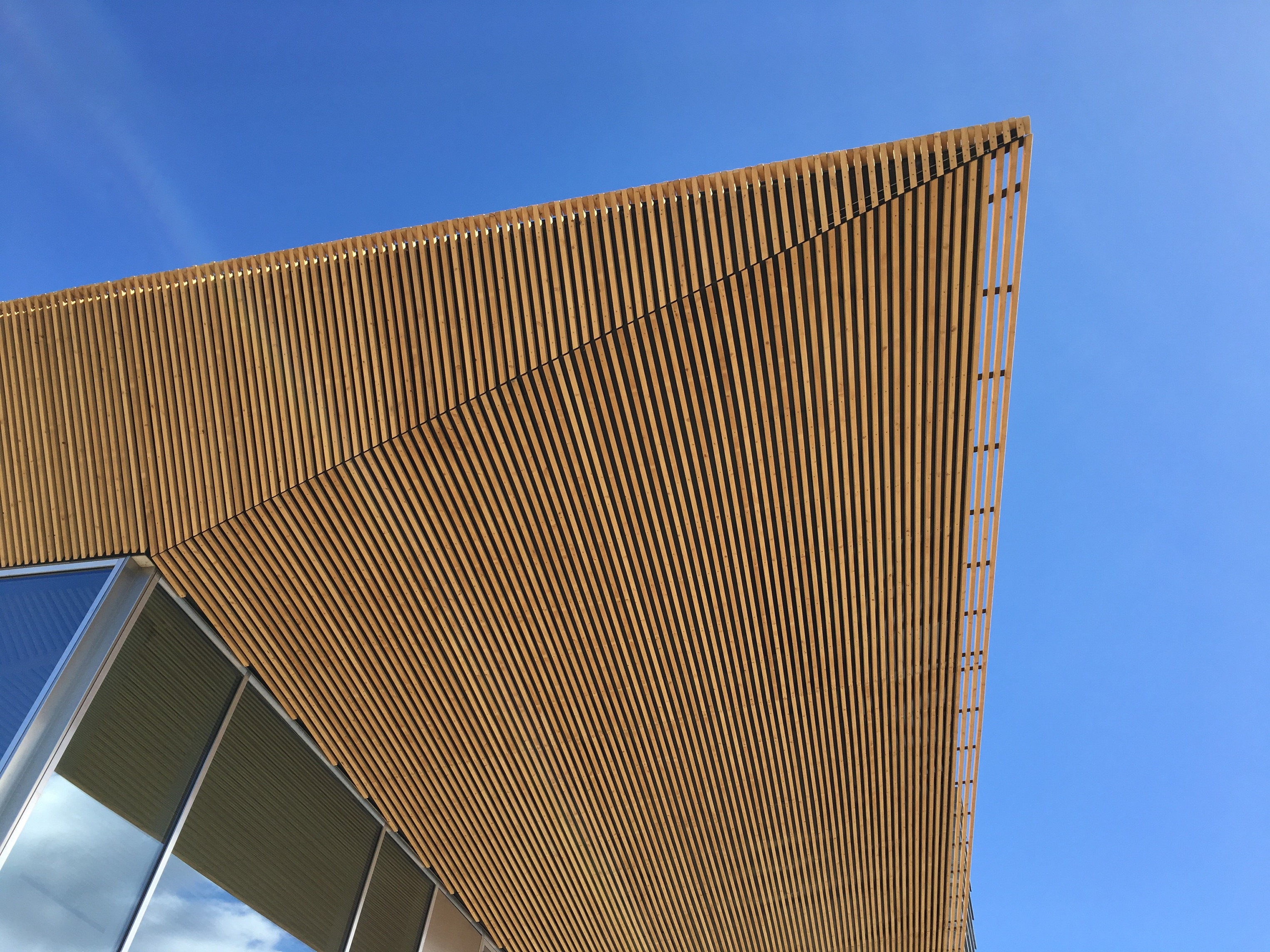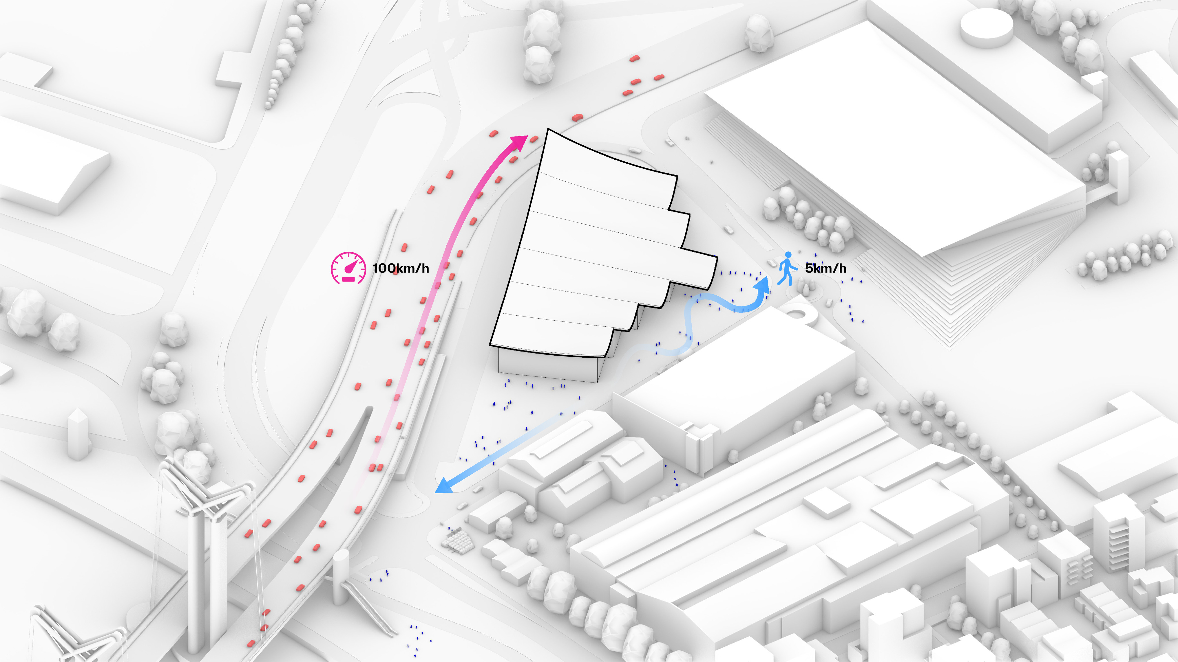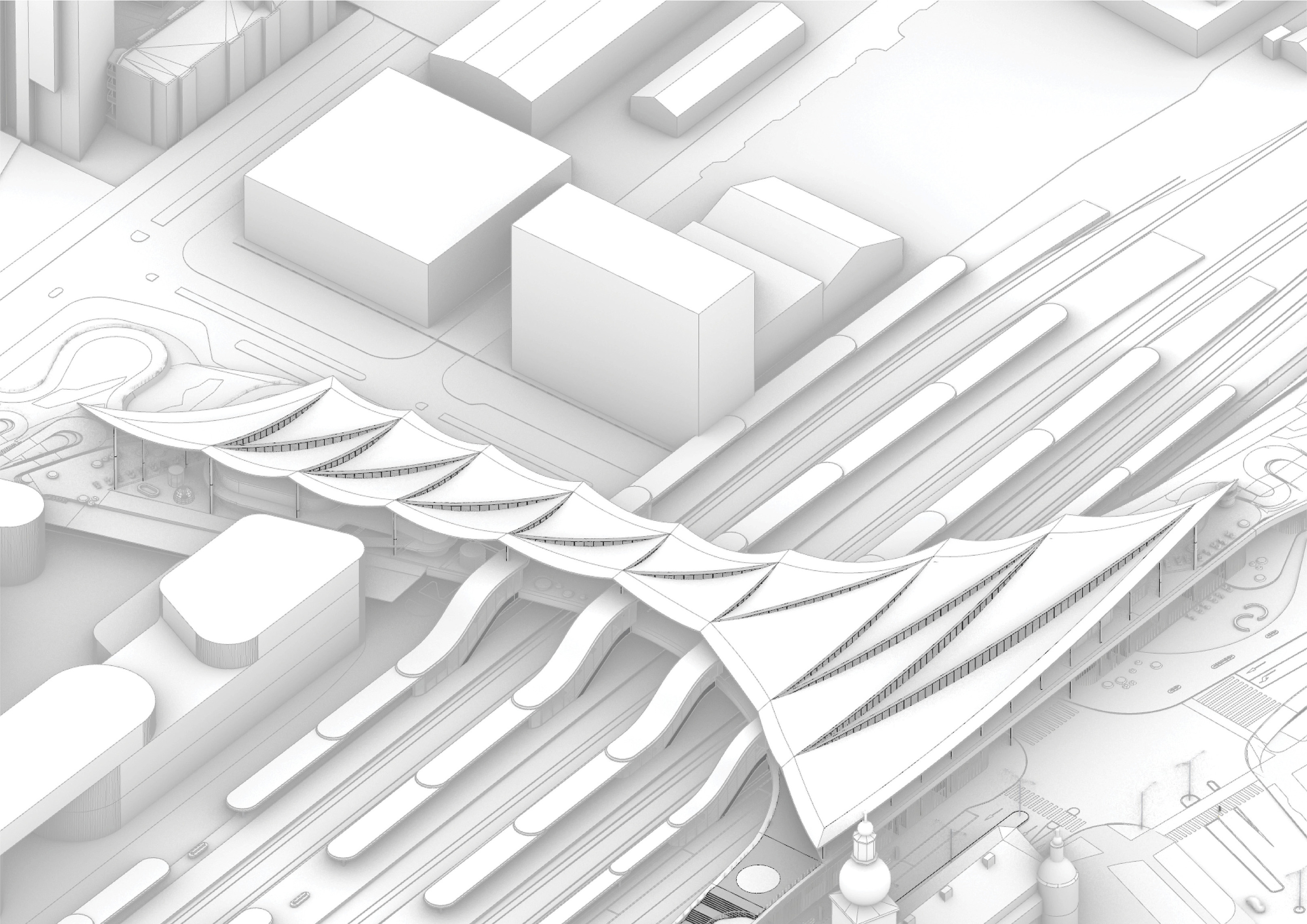 “Rising along the Seine, The Sail introduces a new silhouette to Rouen with its sweeping roofline paying tribute to the city’s naval heritage and historic skyline of spires. The building greets visitors from the highway with a vertical façade, while on the city side, the roof creates sheltered canopies extending the foyer into a human-scaled public landscape. Built with mass timber construction, daylight-optimized interiors and an energy-producing roof, it is both a low-impact infrastructure and a cultural hub - offering an inclusive space for Rouen and its visitors.”