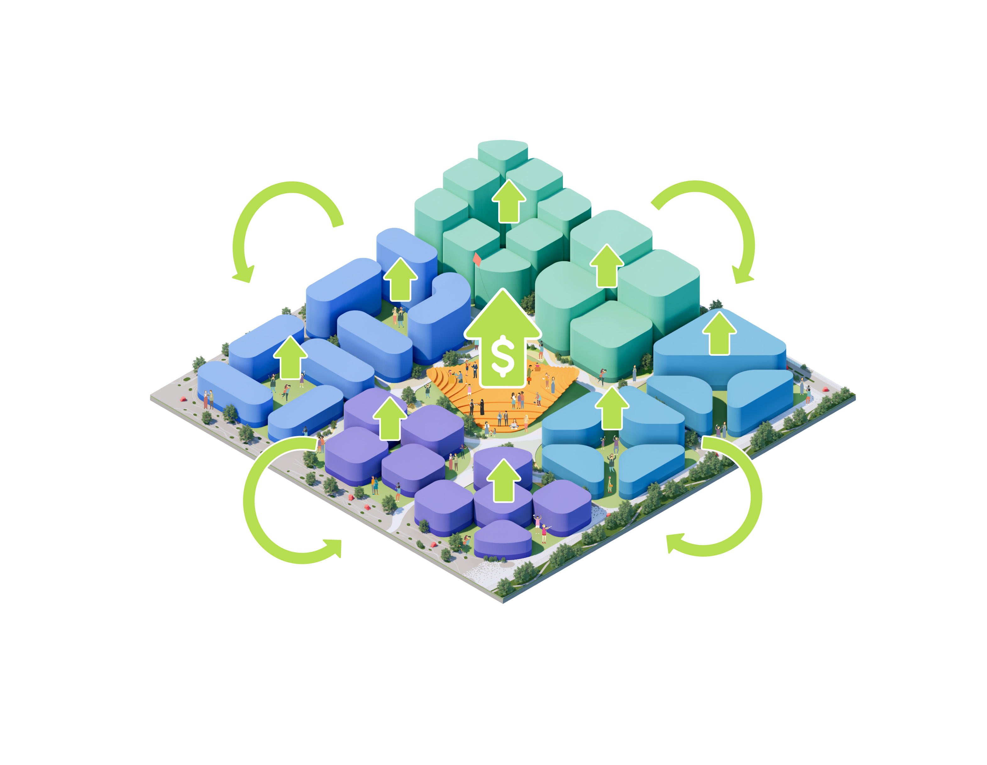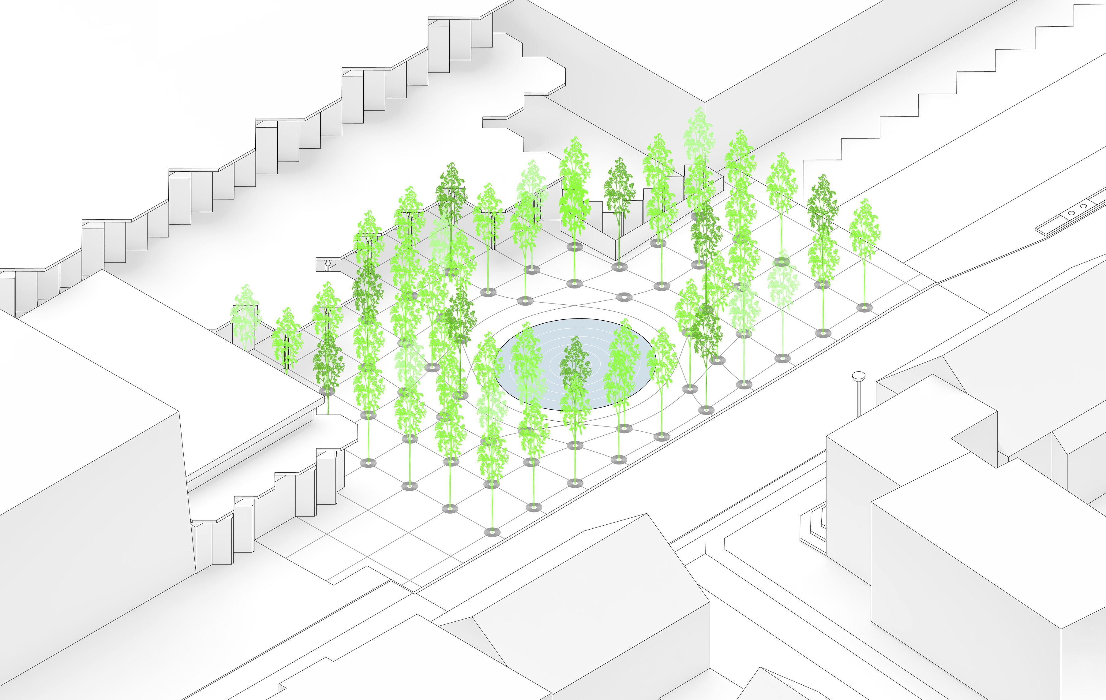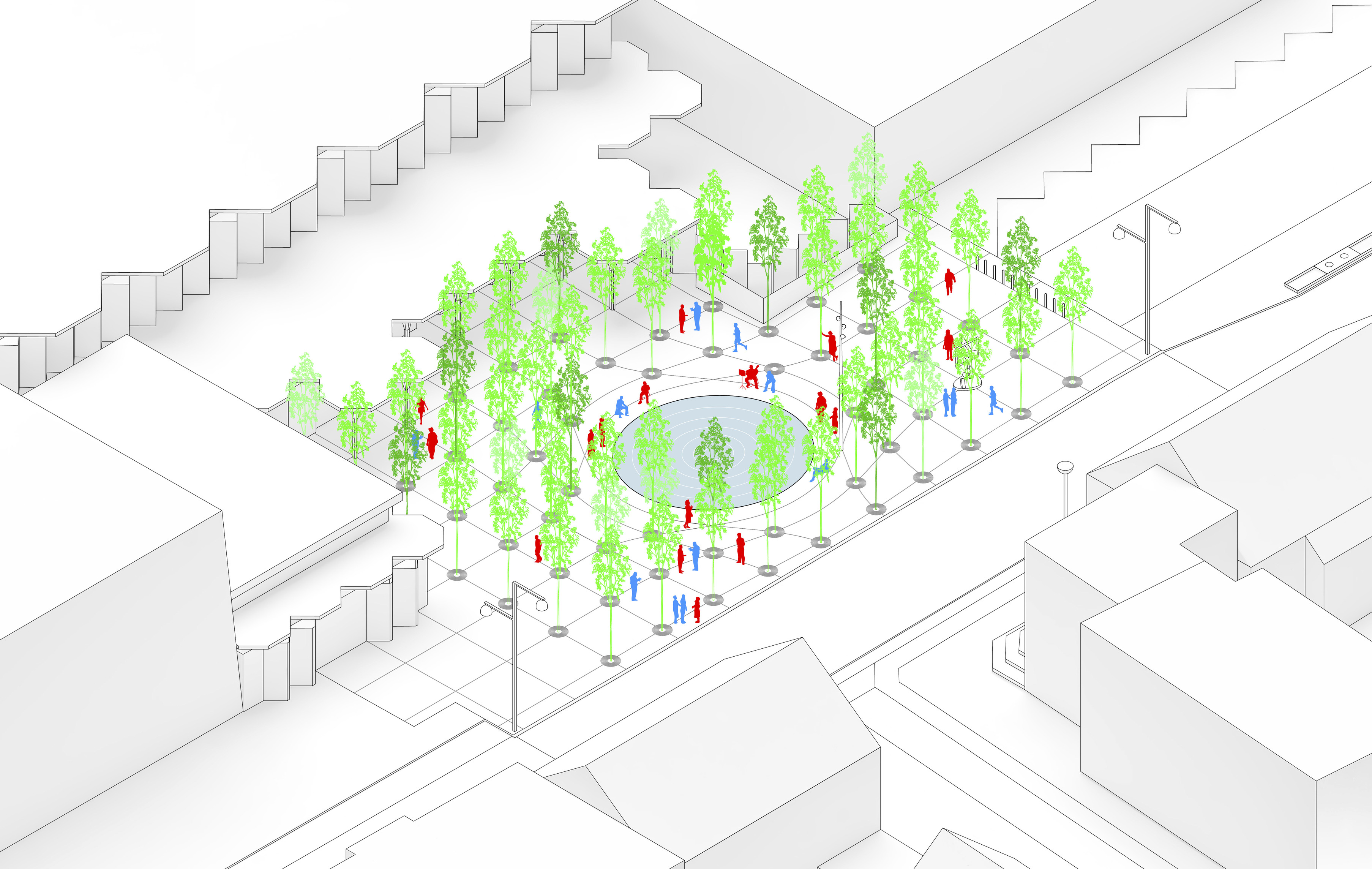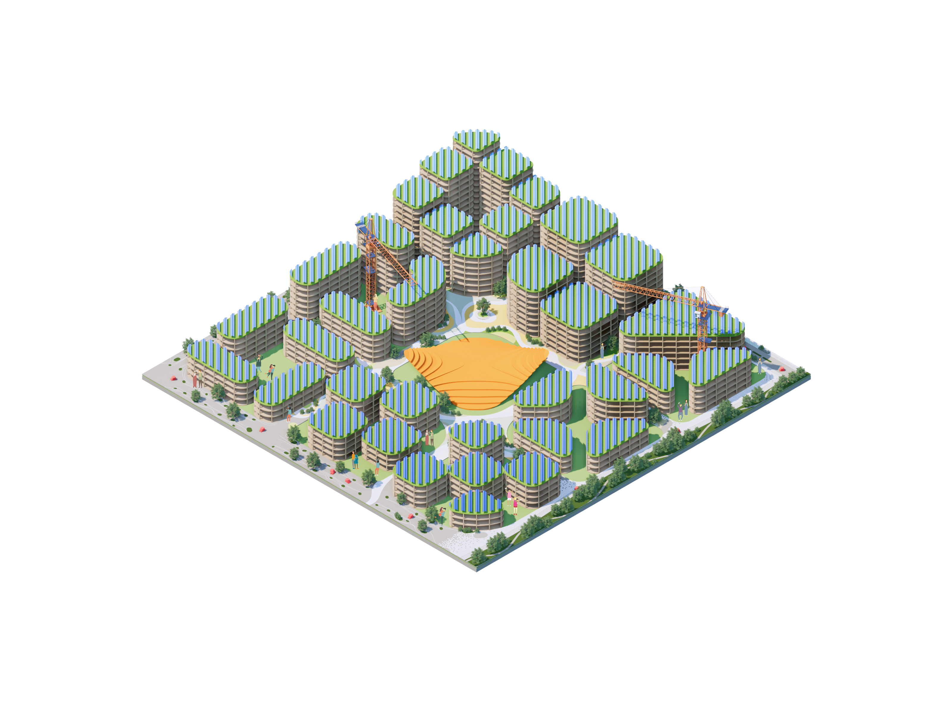 Surrounding Equitism Tower, the city of Telosa focuses on people-centric design. Telosa’s public realm is vibrant and active, with open space woven throughout the dense city fabric forming its central spine. Lush in native planting, parks host carefully managed reservoirs, which store water for the city and provide all residents with open space within minutes of where they live.