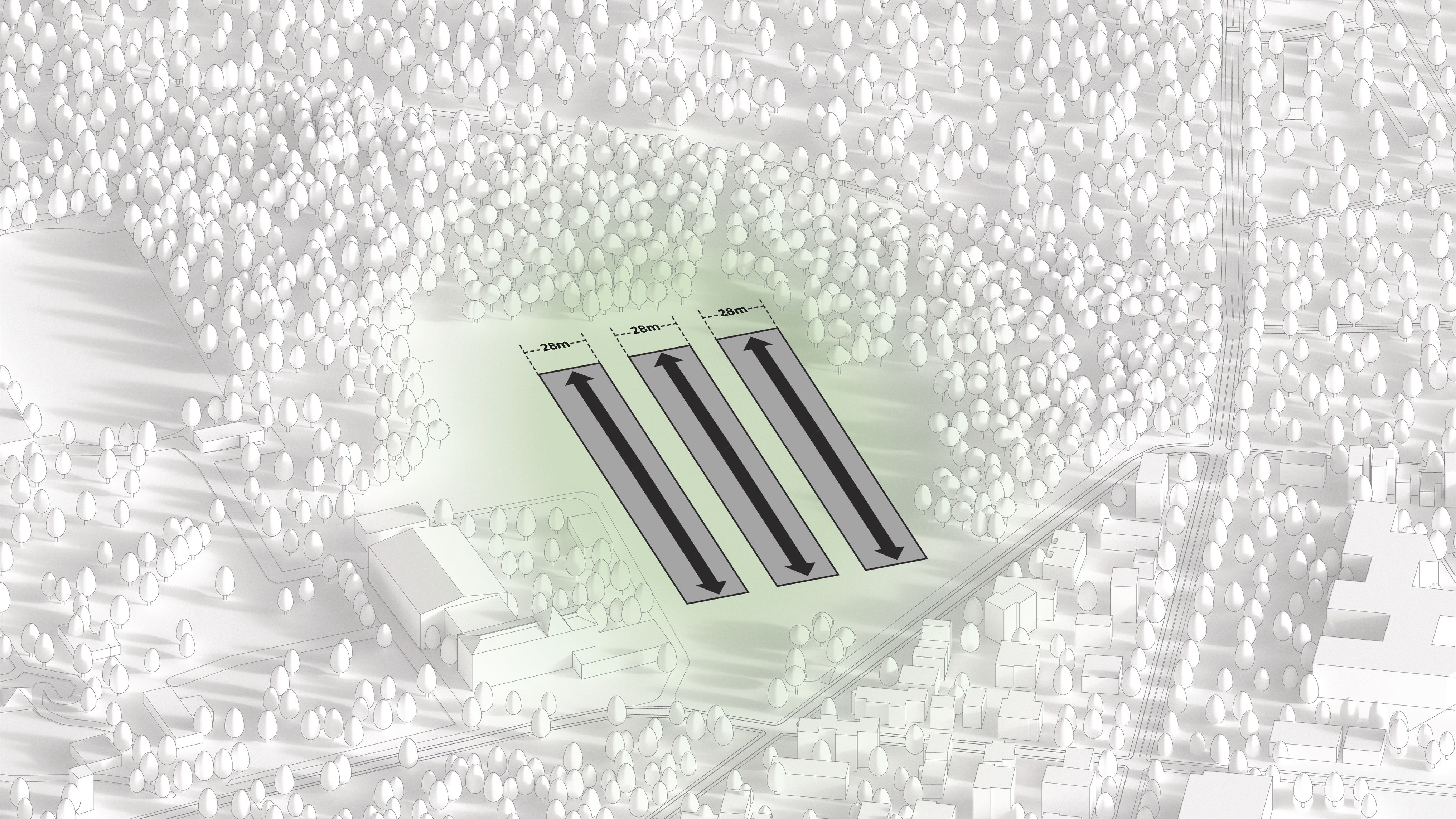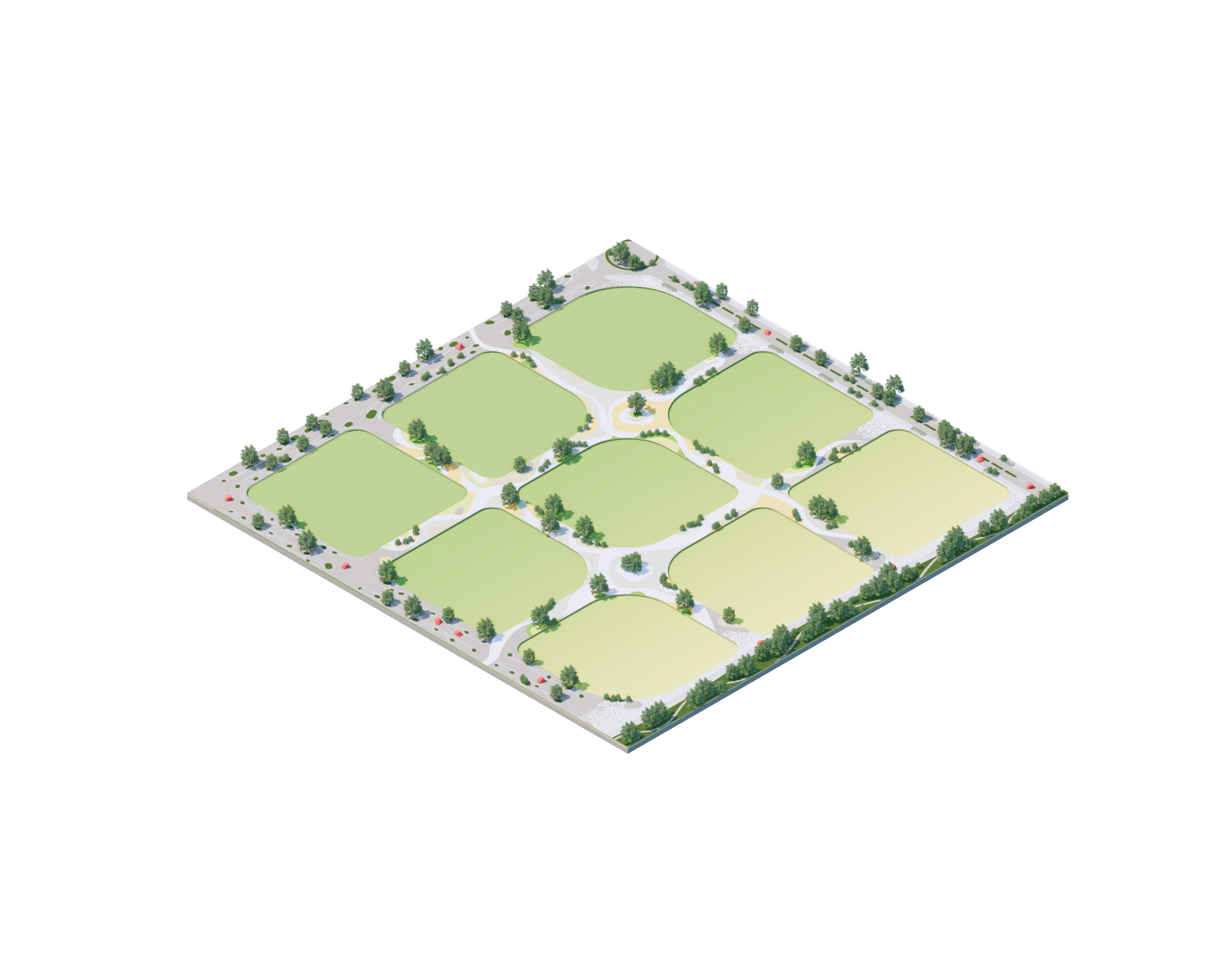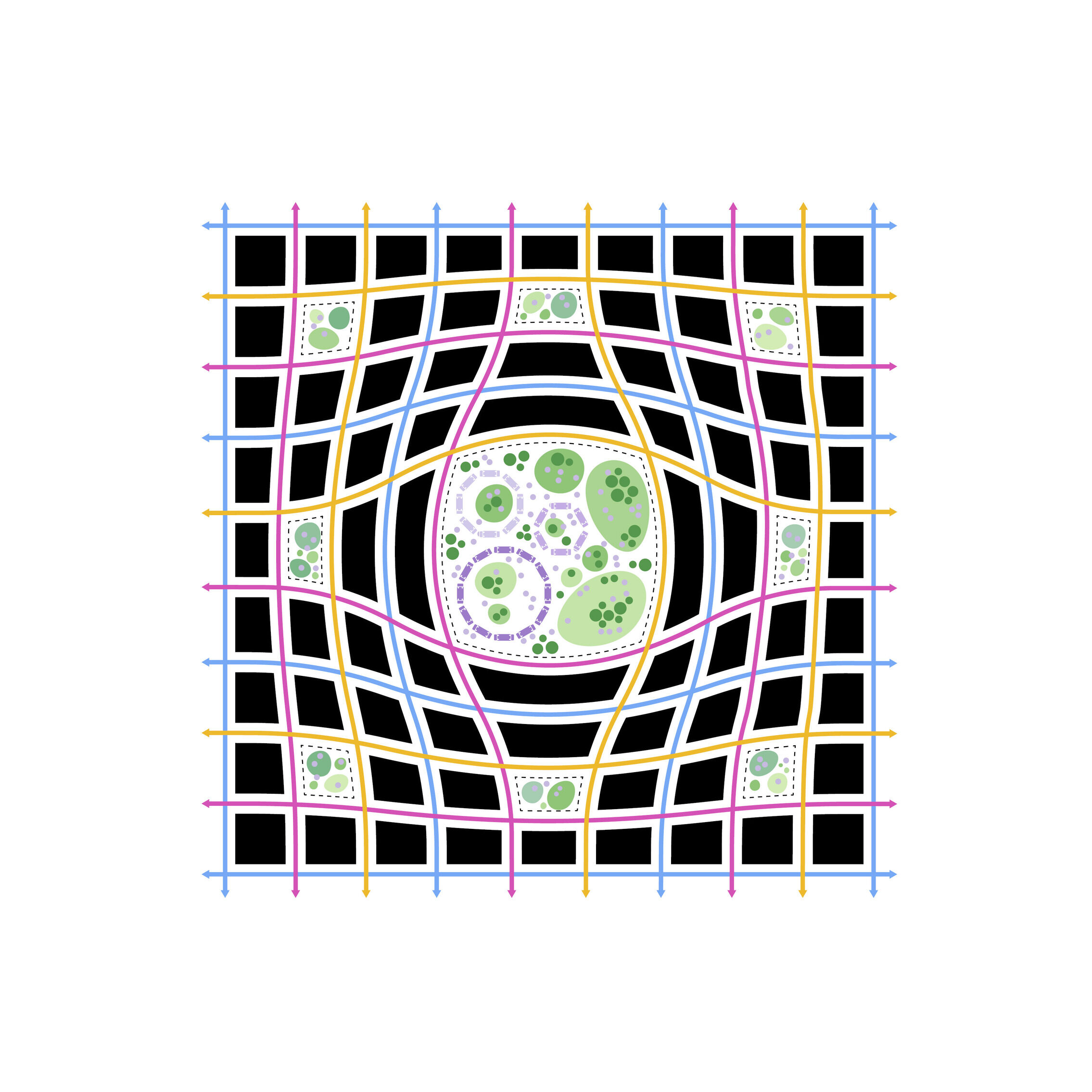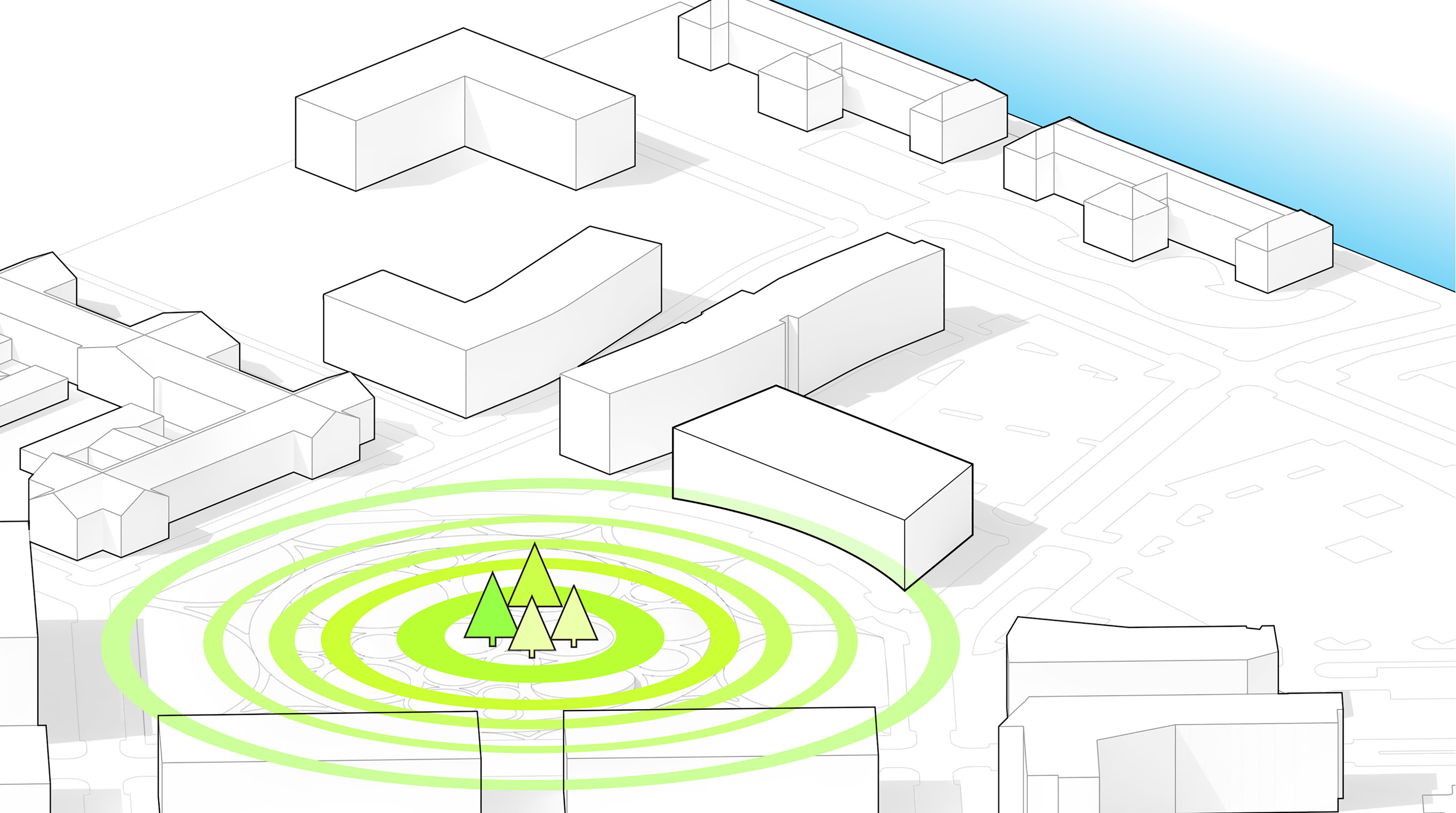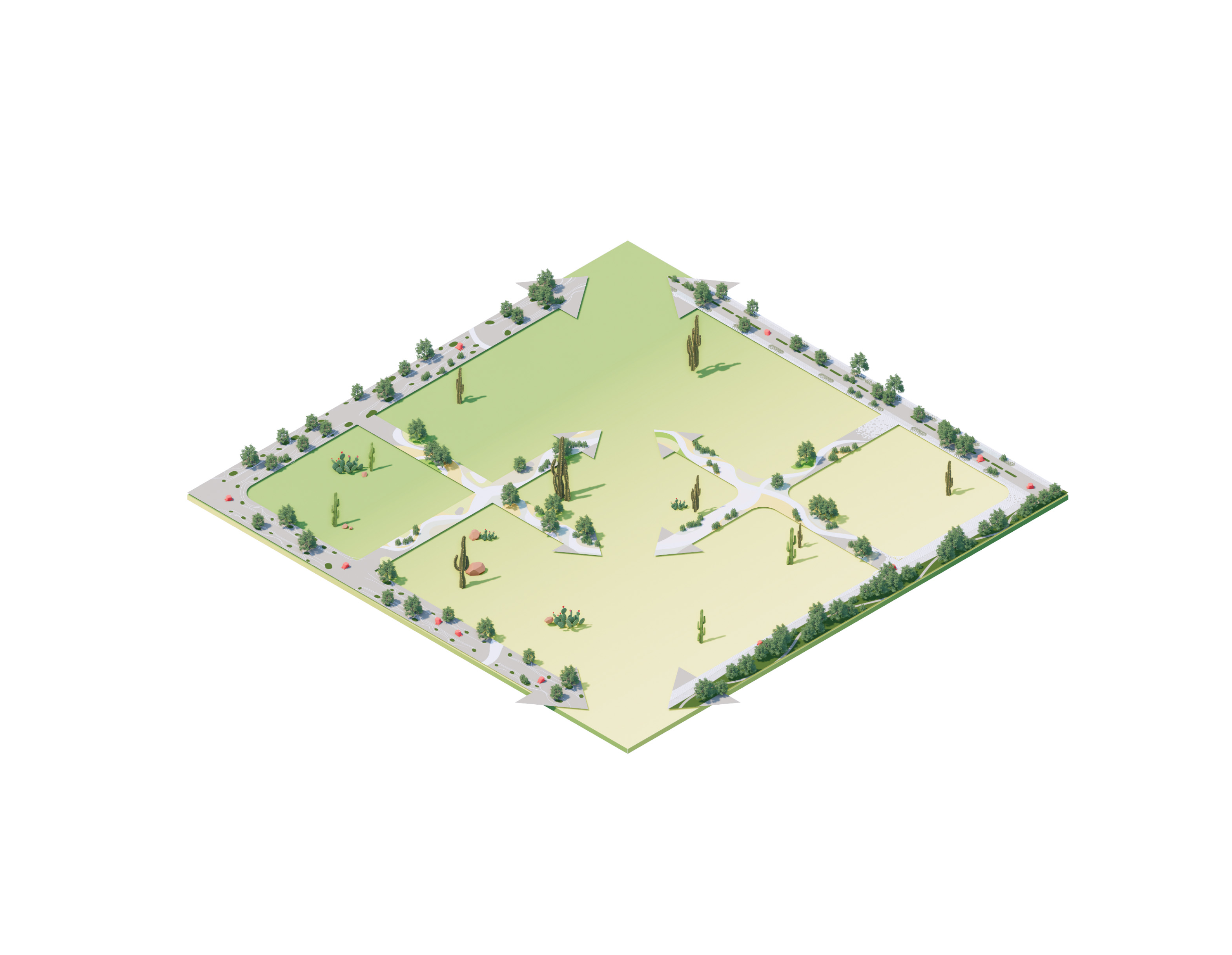 Surrounding Equitism Tower, the city of Telosa focuses on people-centric design. Telosa’s public realm is vibrant and active, with open space woven throughout the dense city fabric forming its central spine. Lush in native planting, parks host carefully managed reservoirs, which store water for the city and provide all residents with open space within minutes of where they live.