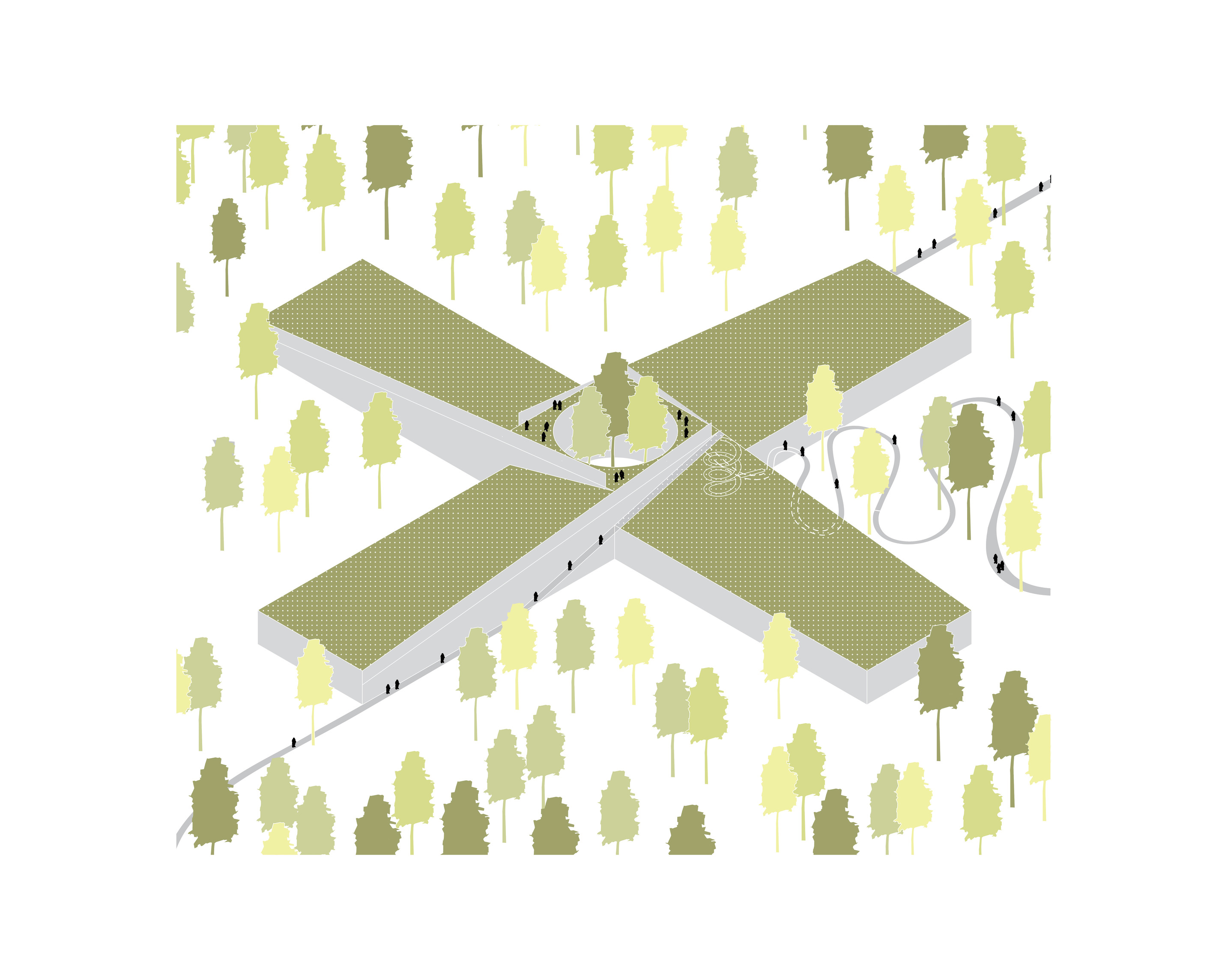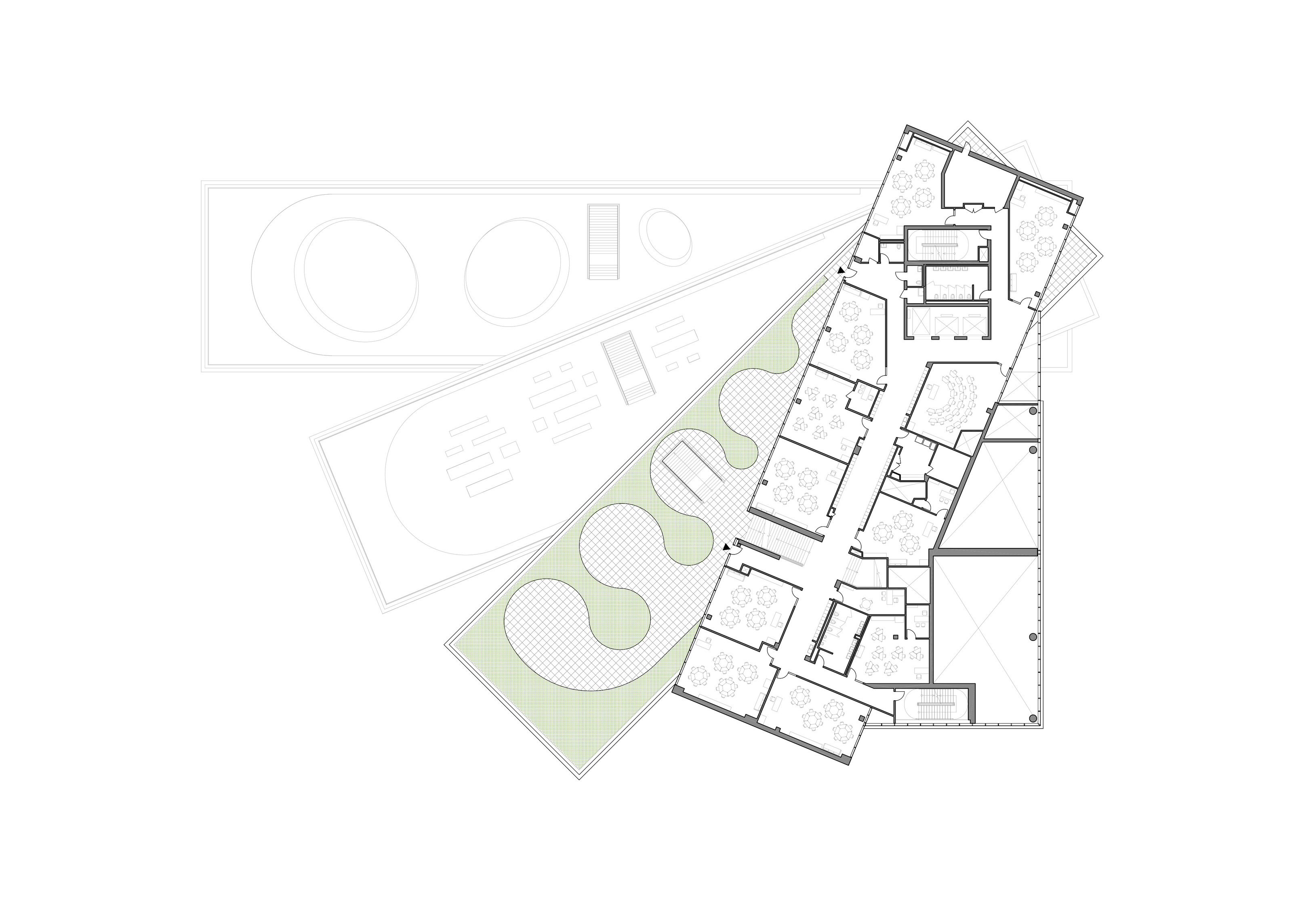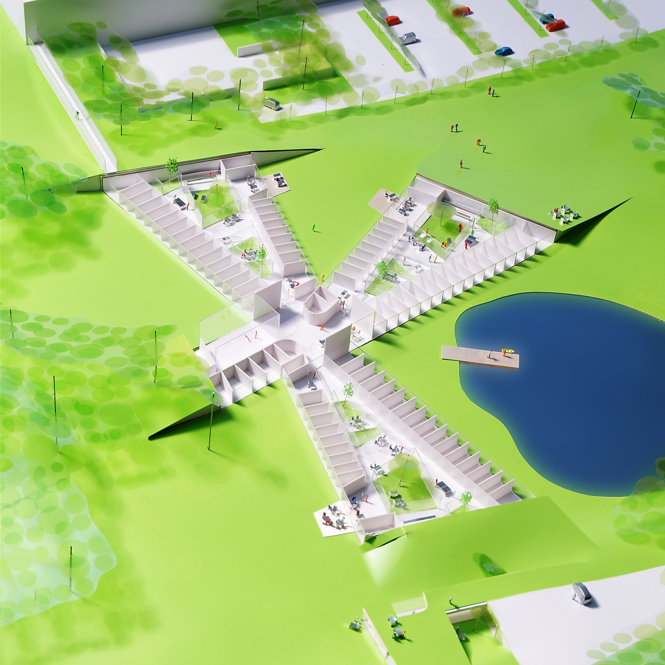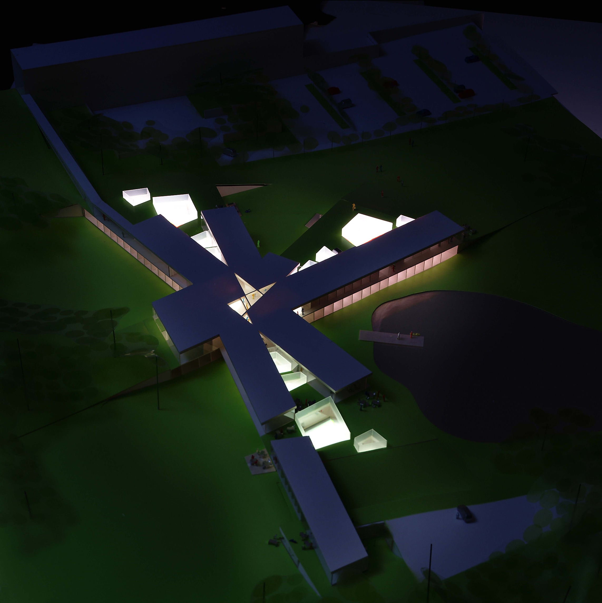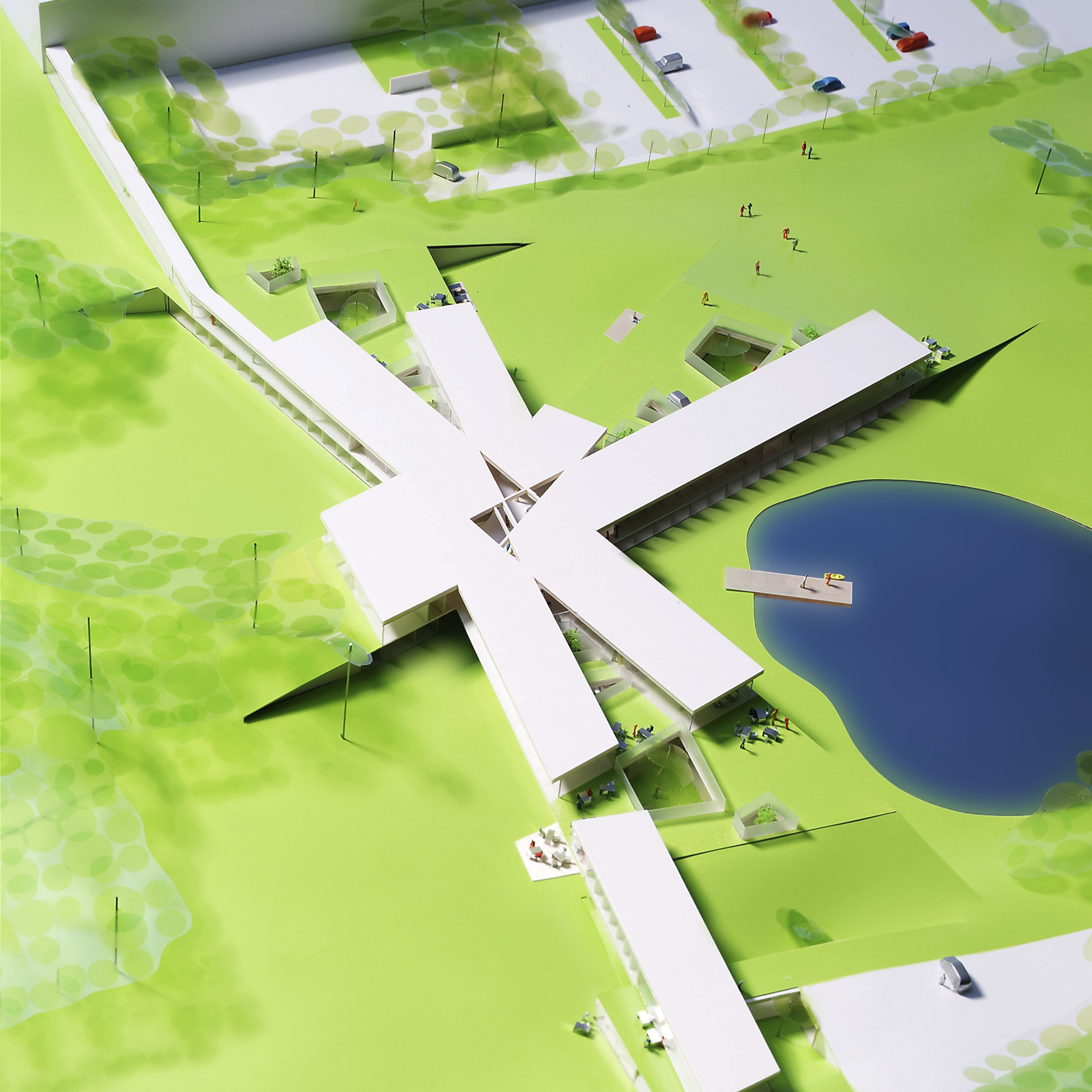 By using a clover structure in organizing the residential program each patient’s room is oriented toward its own part of the landscape – two sets of rooms facing the lake, and one set of rooms facing the surrounding hills. That way the intimate living program has been folded into the landscape being on a level with the lake. Between the functions emerges a new collective space that is embraced by offices and bed units and populated by small patios.