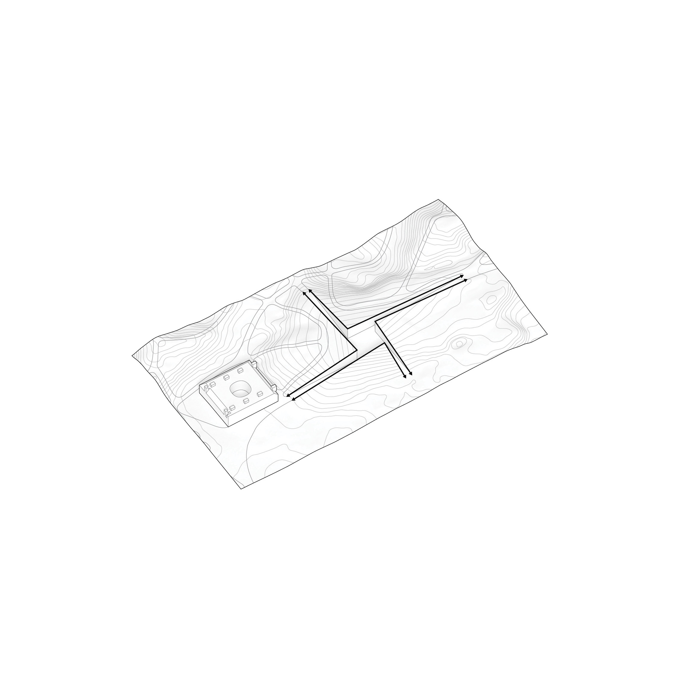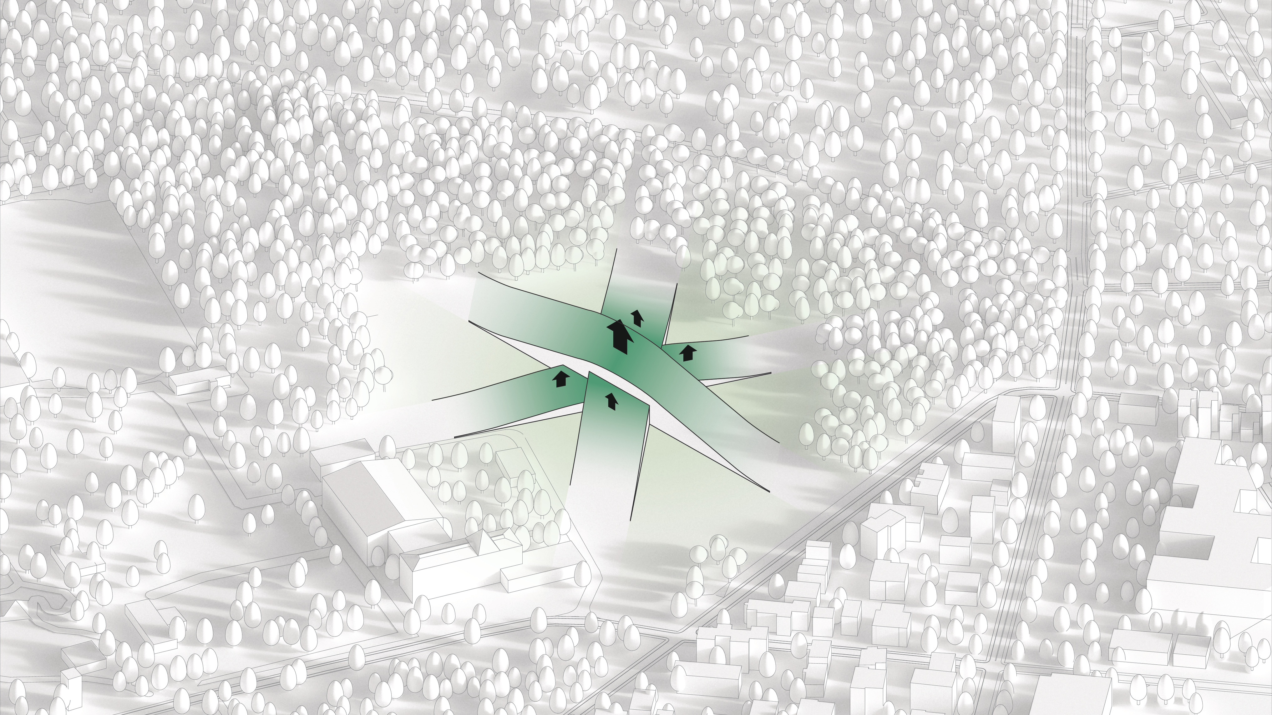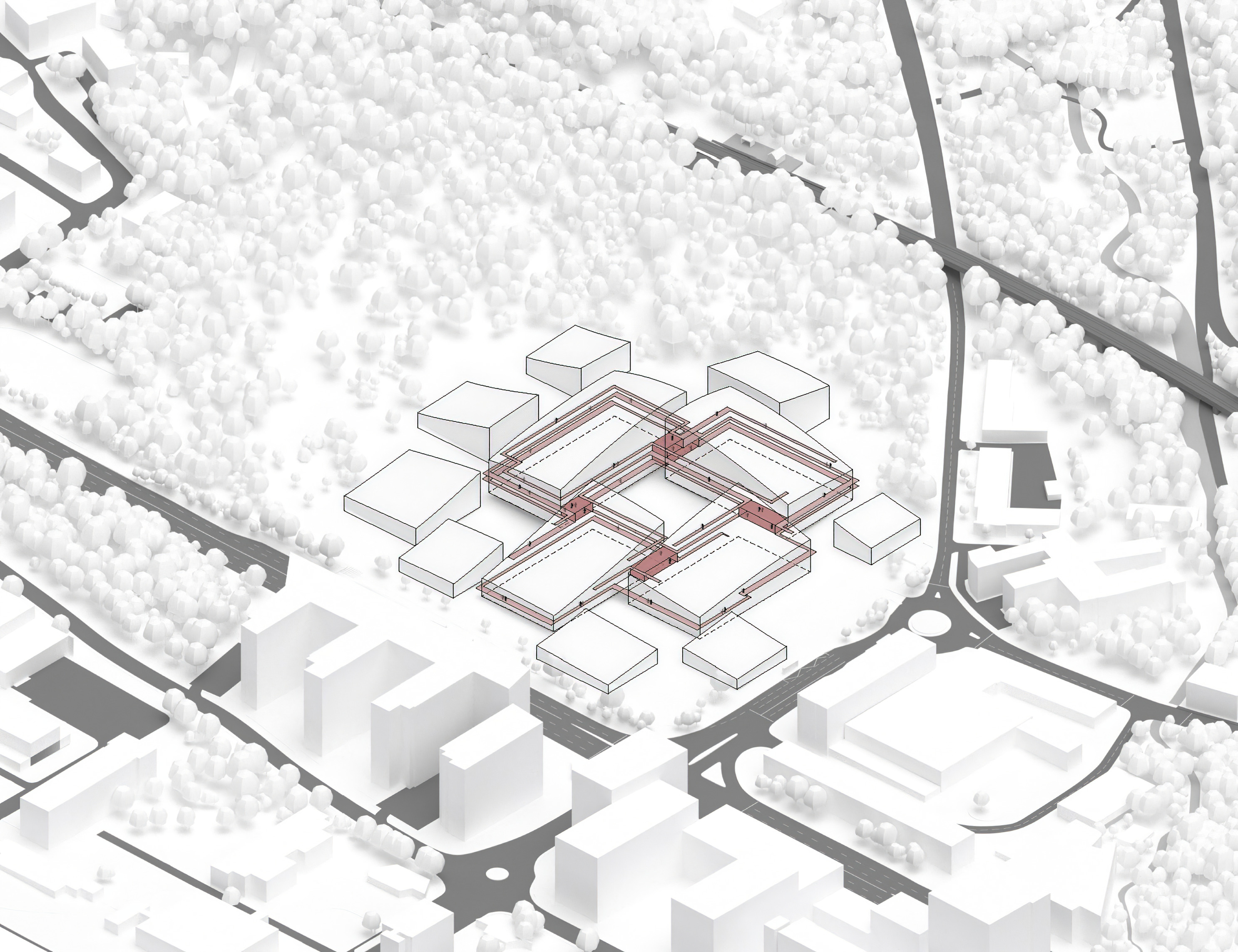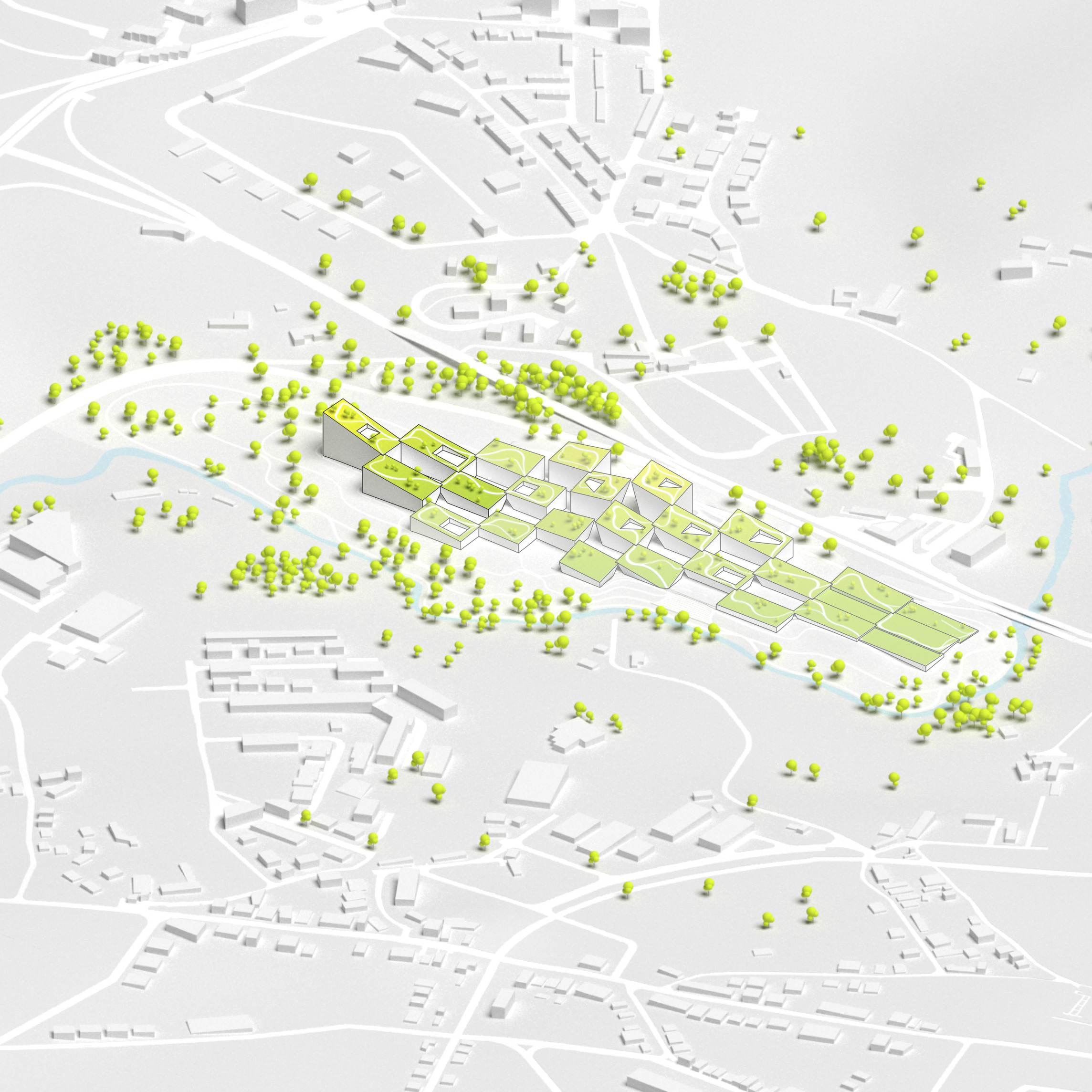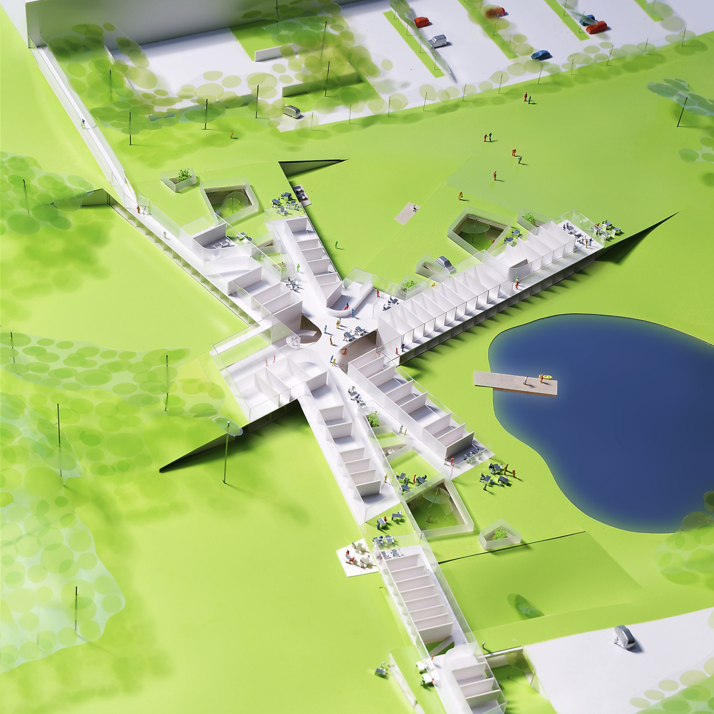 By using a clover structure in organizing the residential program each patient’s room is oriented toward its own part of the landscape – two sets of rooms facing the lake, and one set of rooms facing the surrounding hills. That way the intimate living program has been folded into the landscape being on a level with the lake. Between the functions emerges a new collective space that is embraced by offices and bed units and populated by small patios.