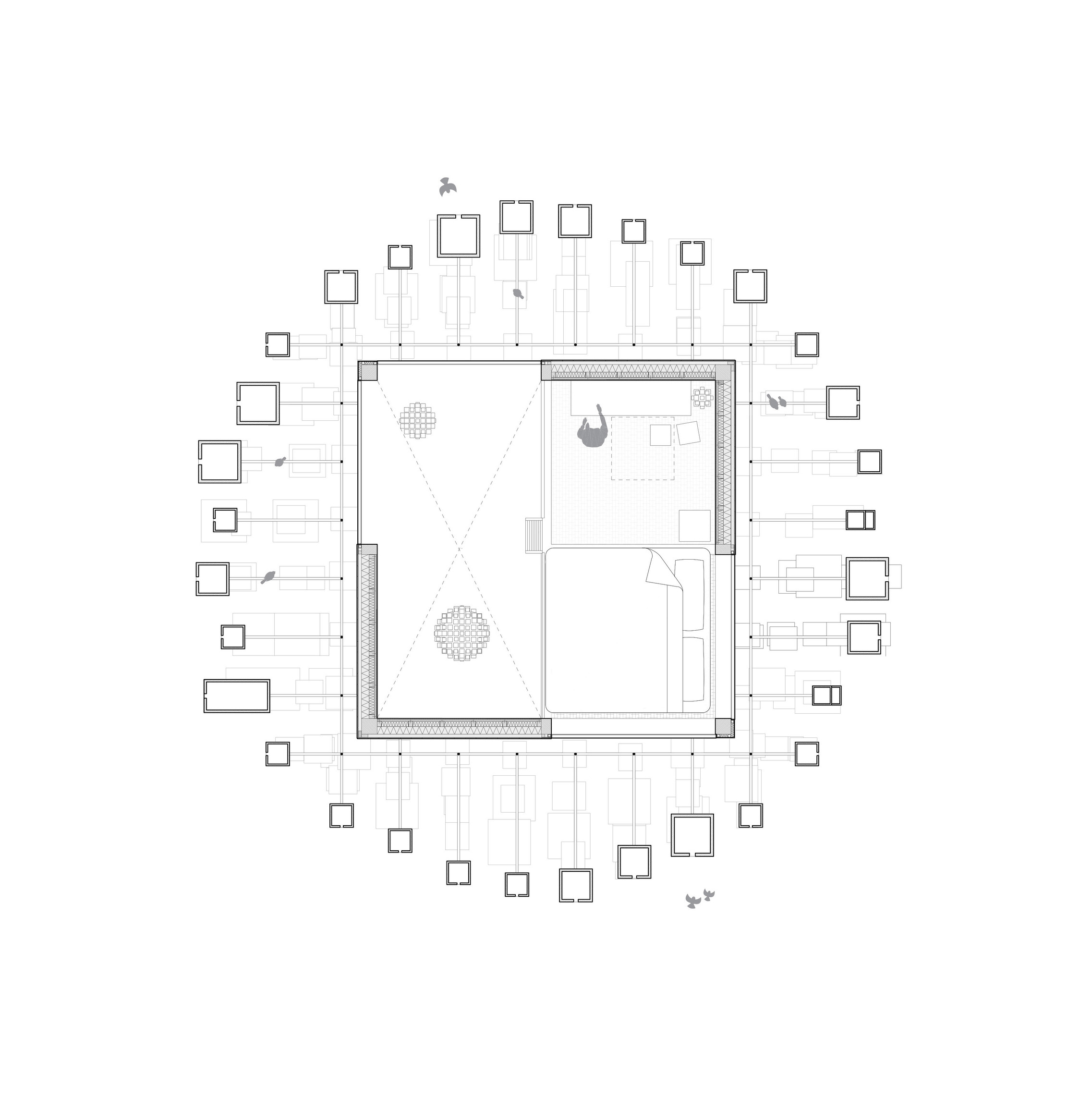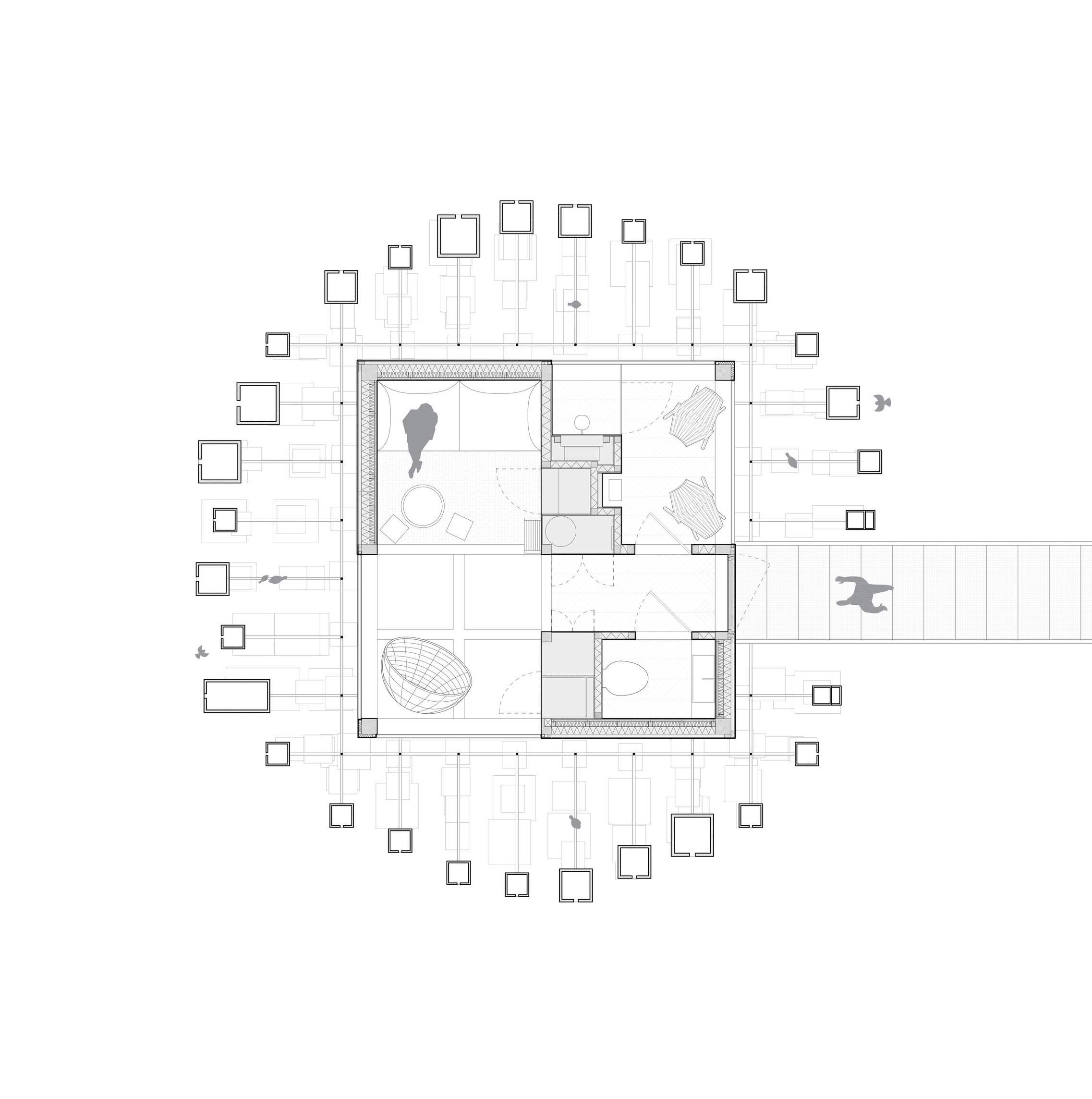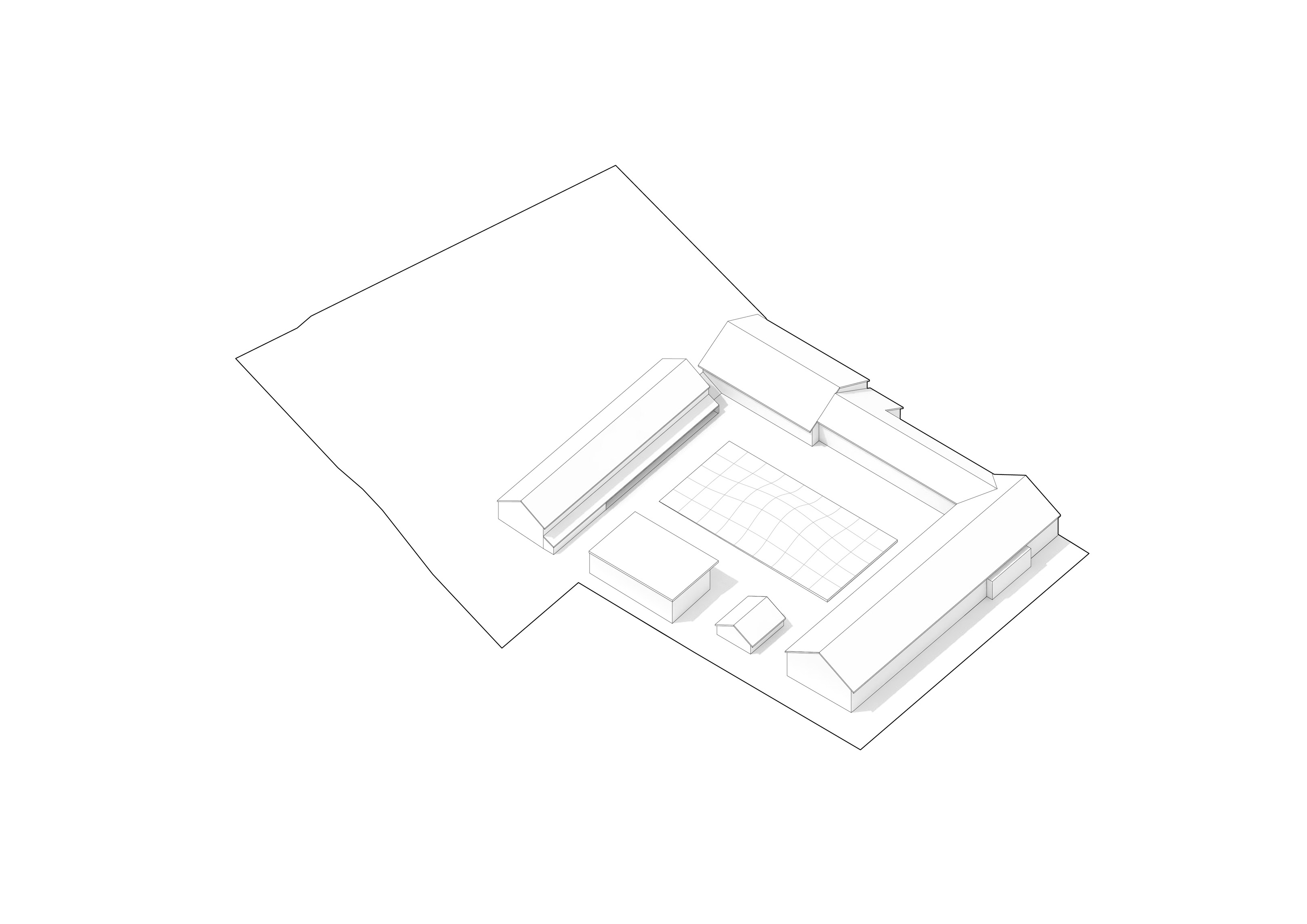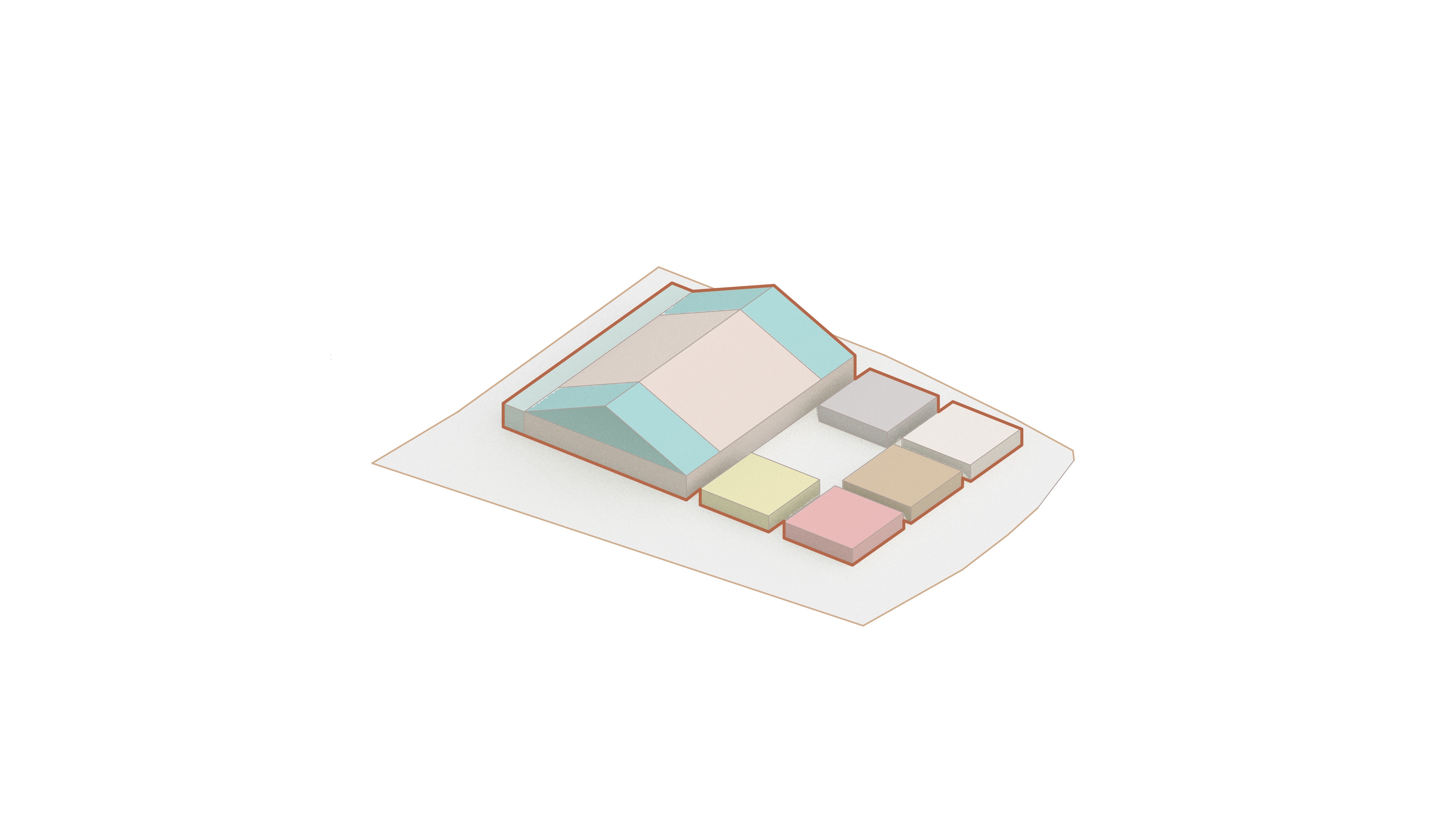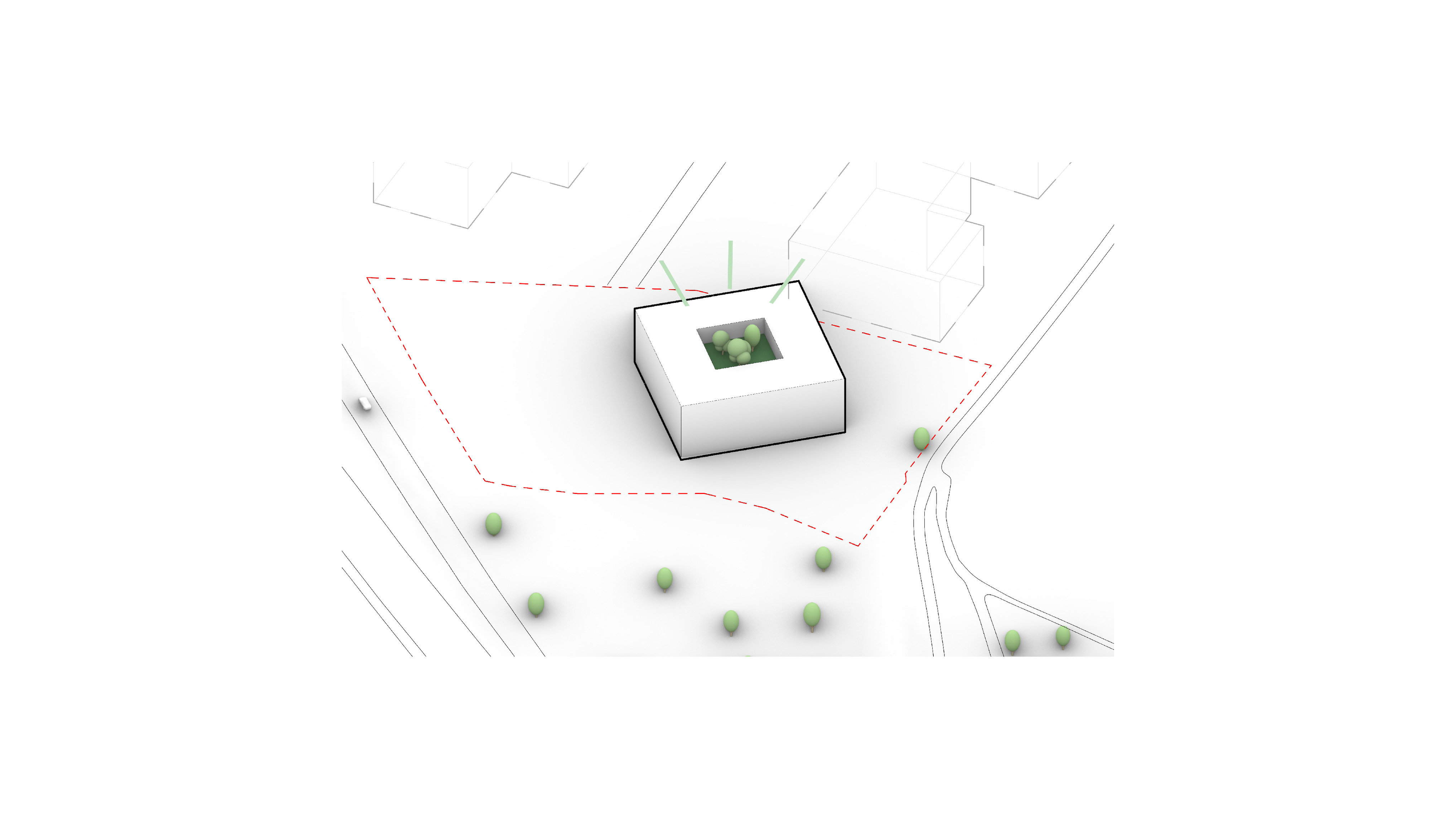 By using a clover structure in organizing the residential program each patient’s room is oriented toward its own part of the landscape – two sets of rooms facing the lake, and one set of rooms facing the surrounding hills. That way the intimate living program has been folded into the landscape being on a level with the lake. Between the functions emerges a new collective space that is embraced by offices and bed units and populated by small patios.