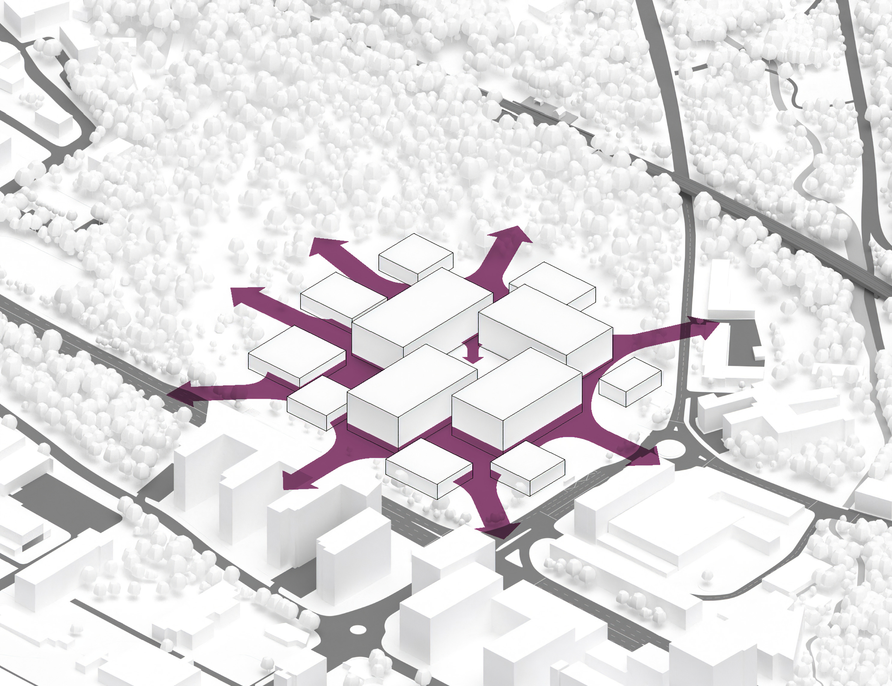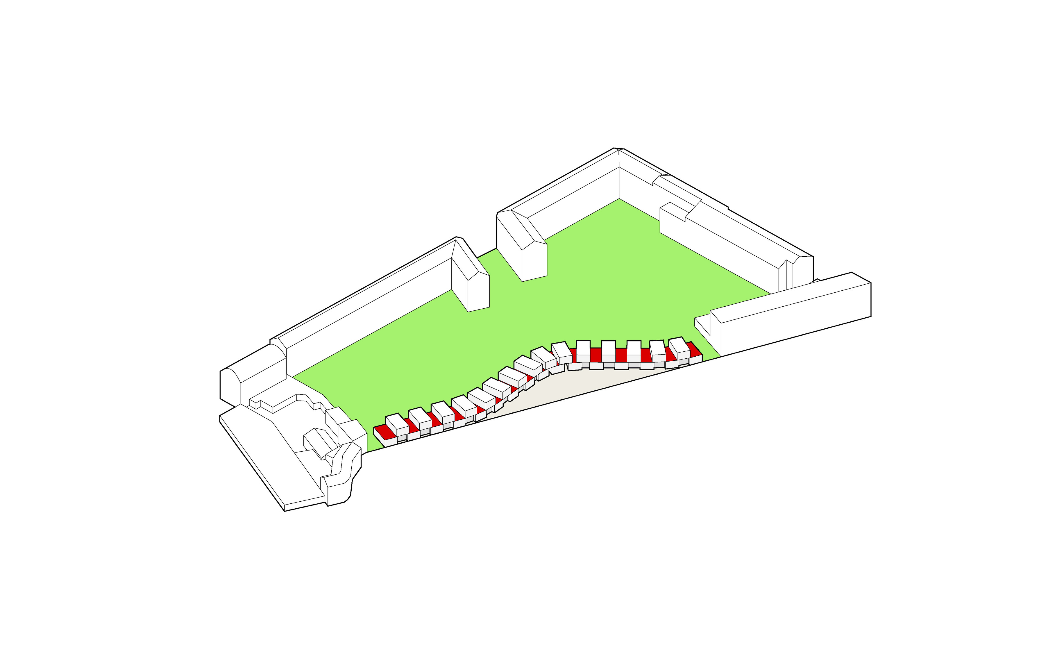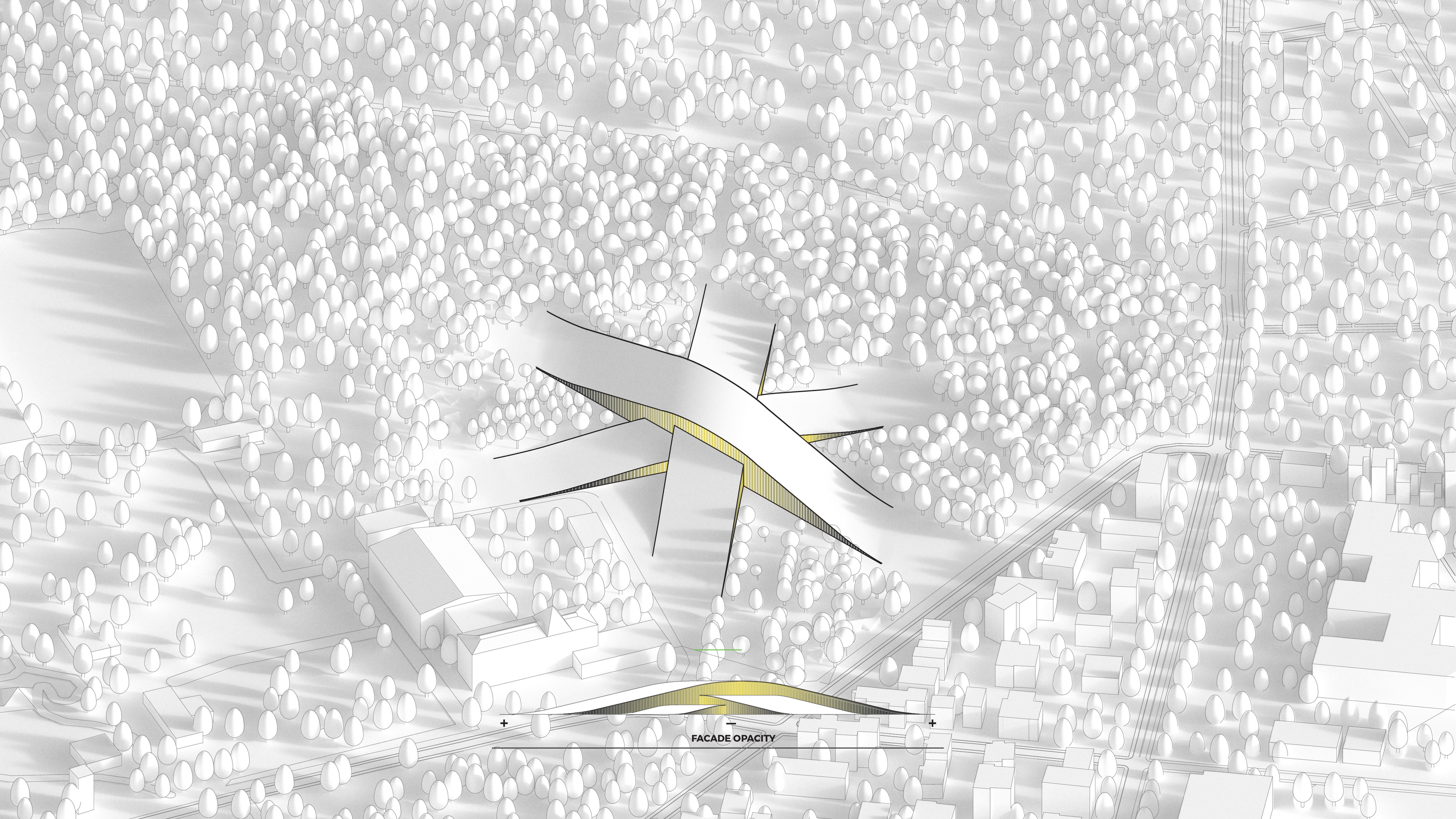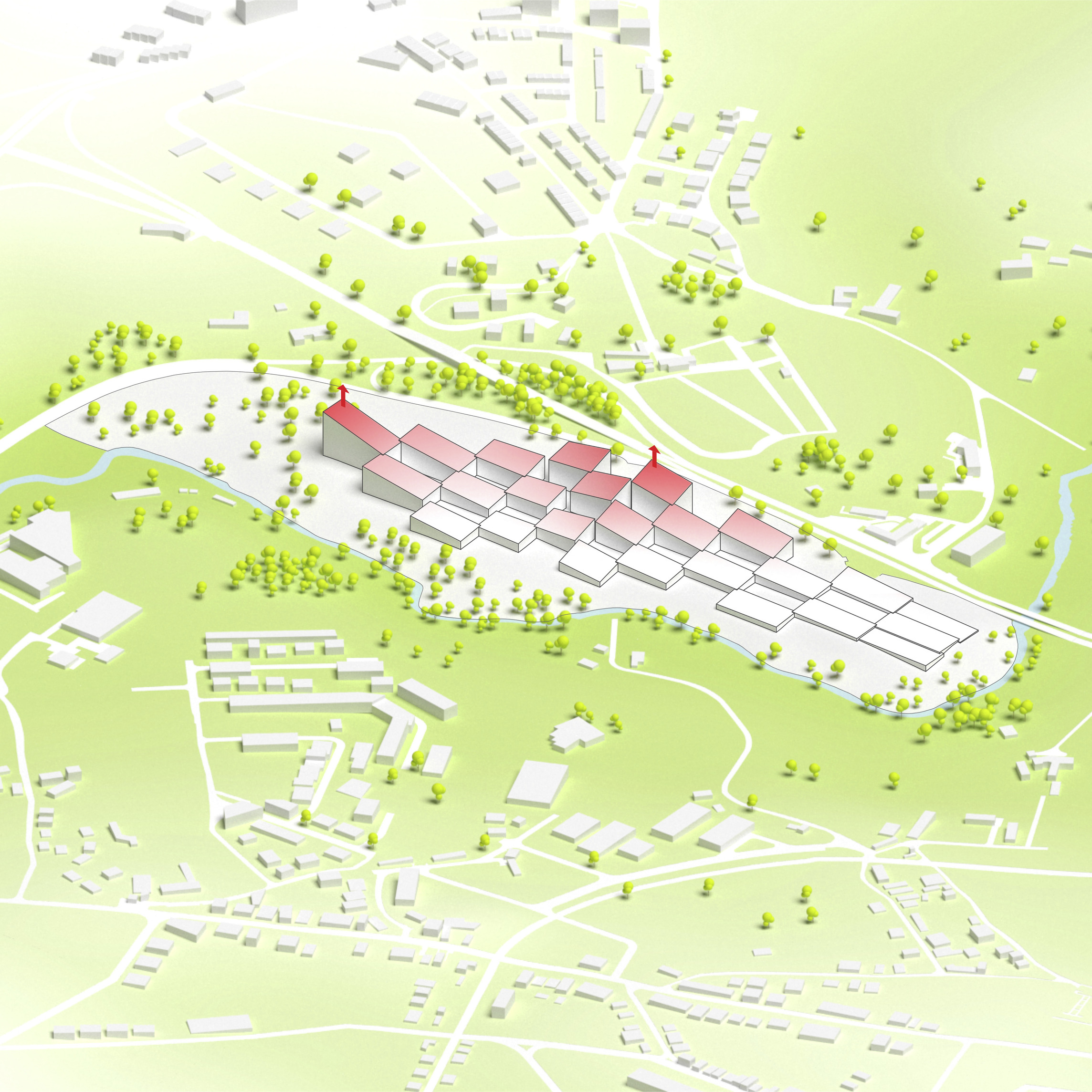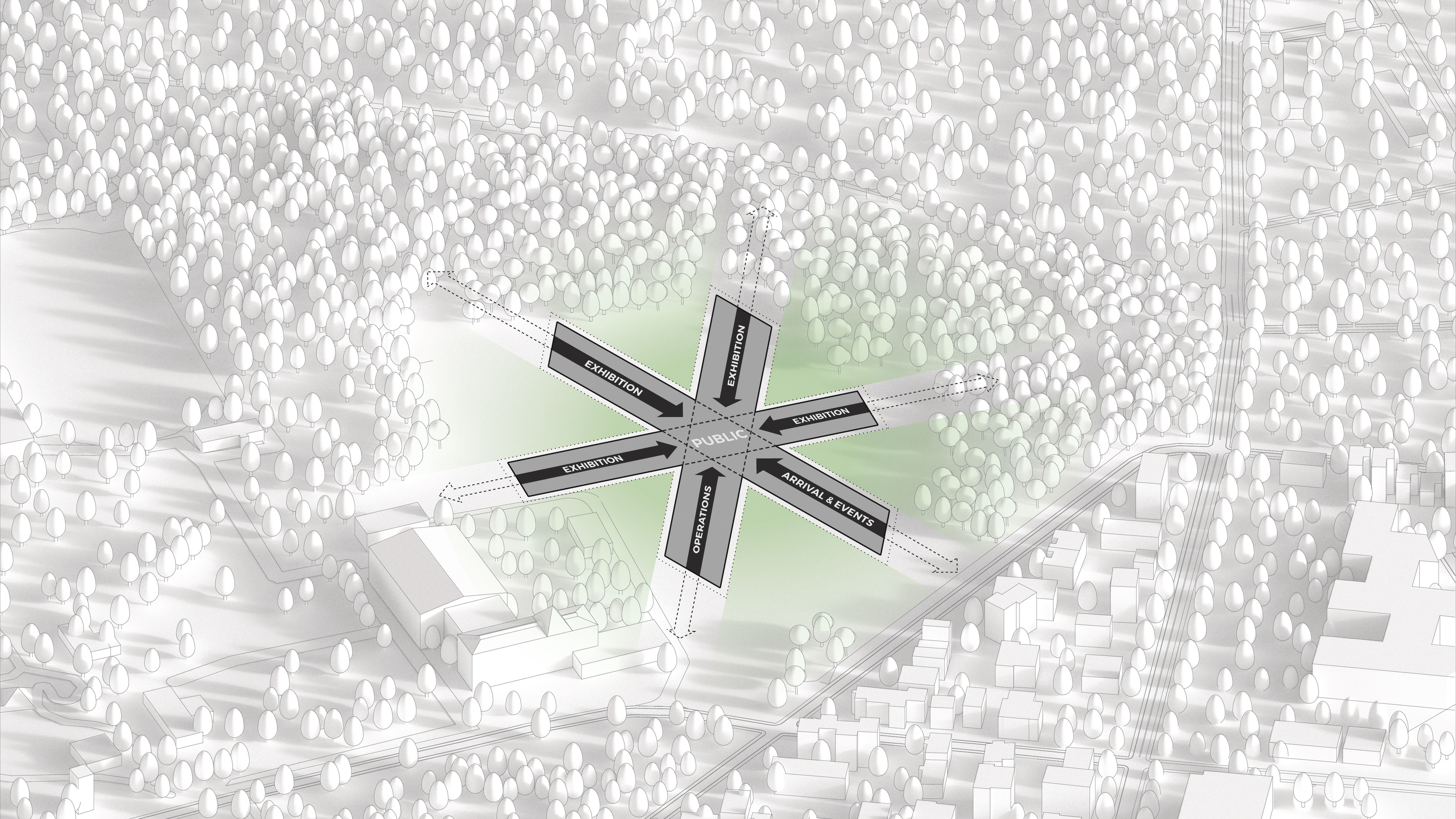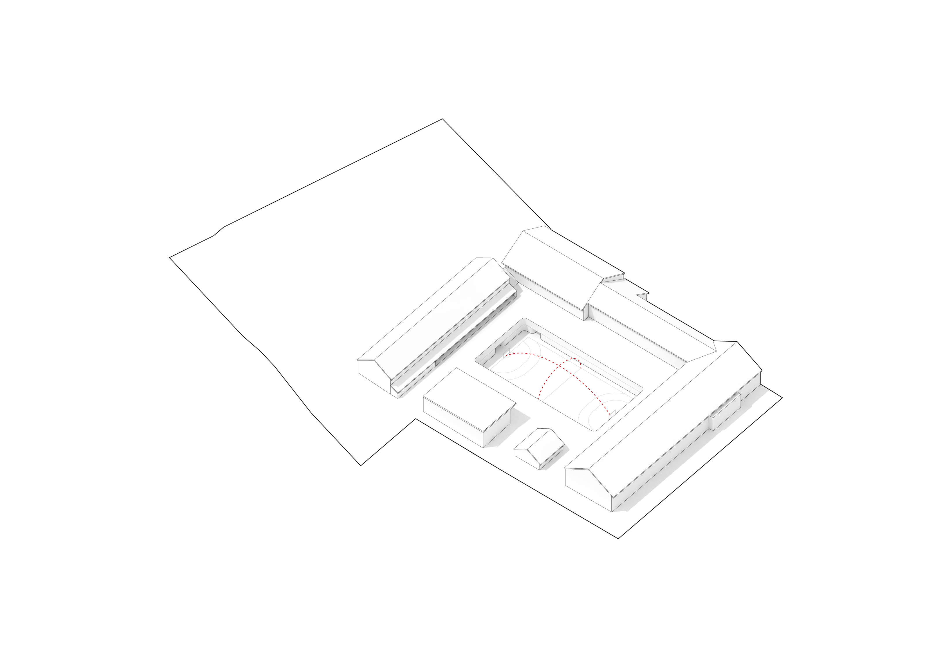 By using a clover structure in organizing the residential program each patient’s room is oriented toward its own part of the landscape – two sets of rooms facing the lake, and one set of rooms facing the surrounding hills. That way the intimate living program has been folded into the landscape being on a level with the lake. Between the functions emerges a new collective space that is embraced by offices and bed units and populated by small patios.
