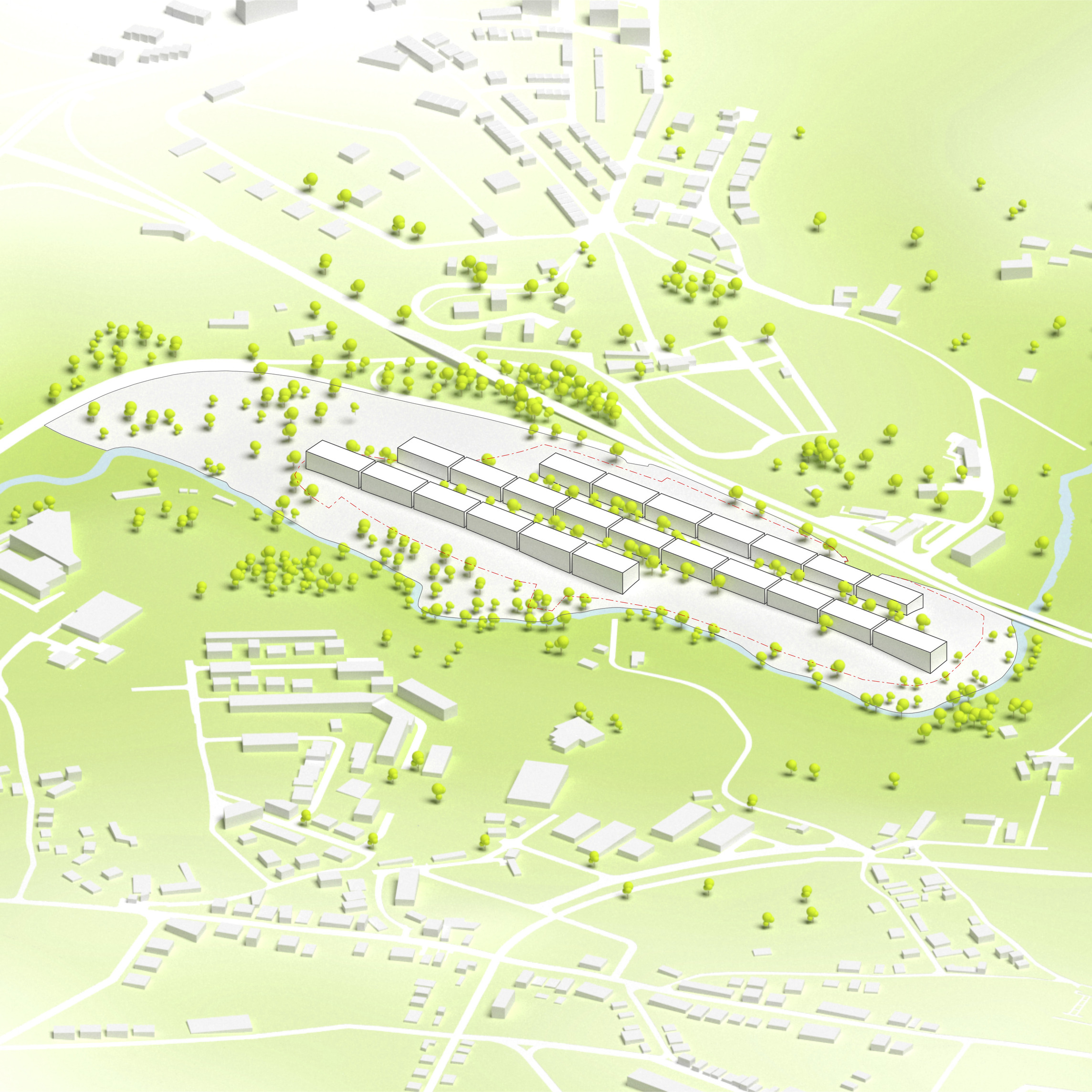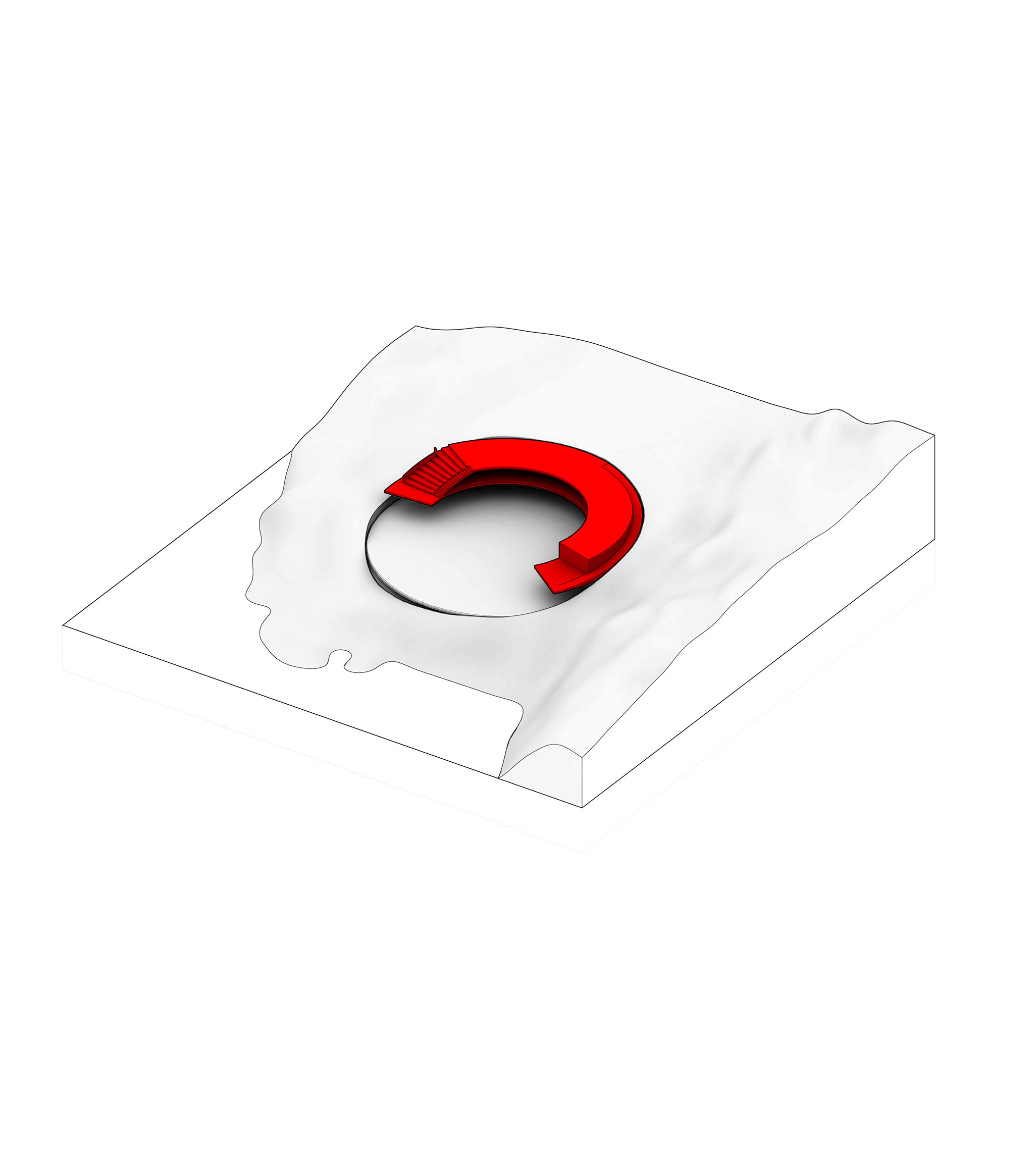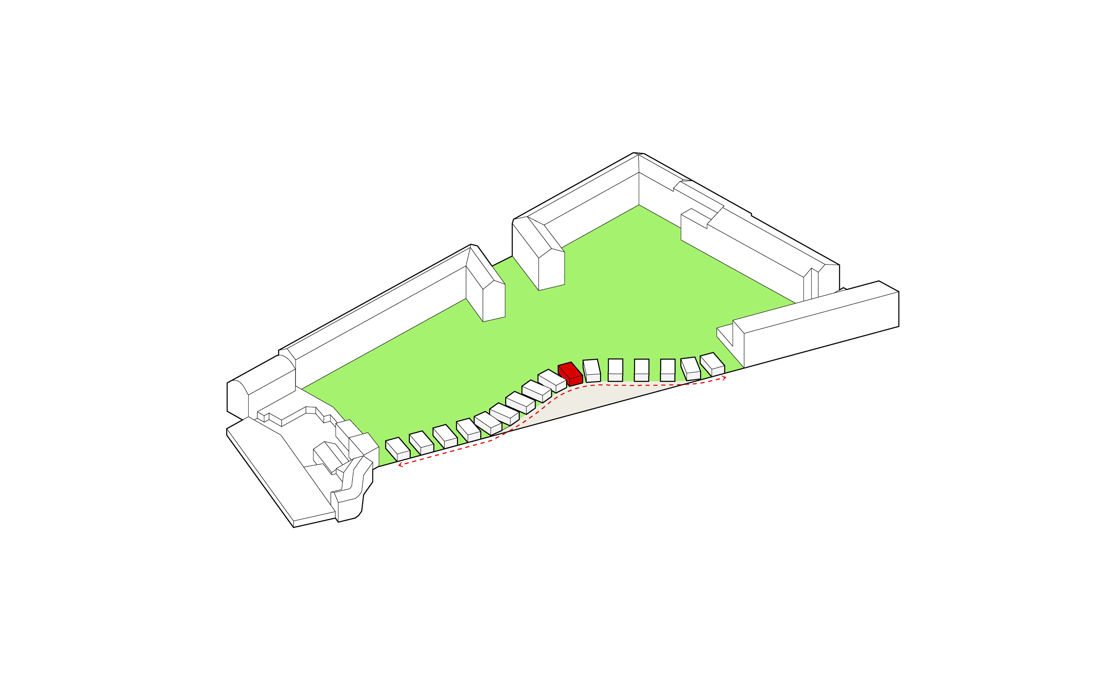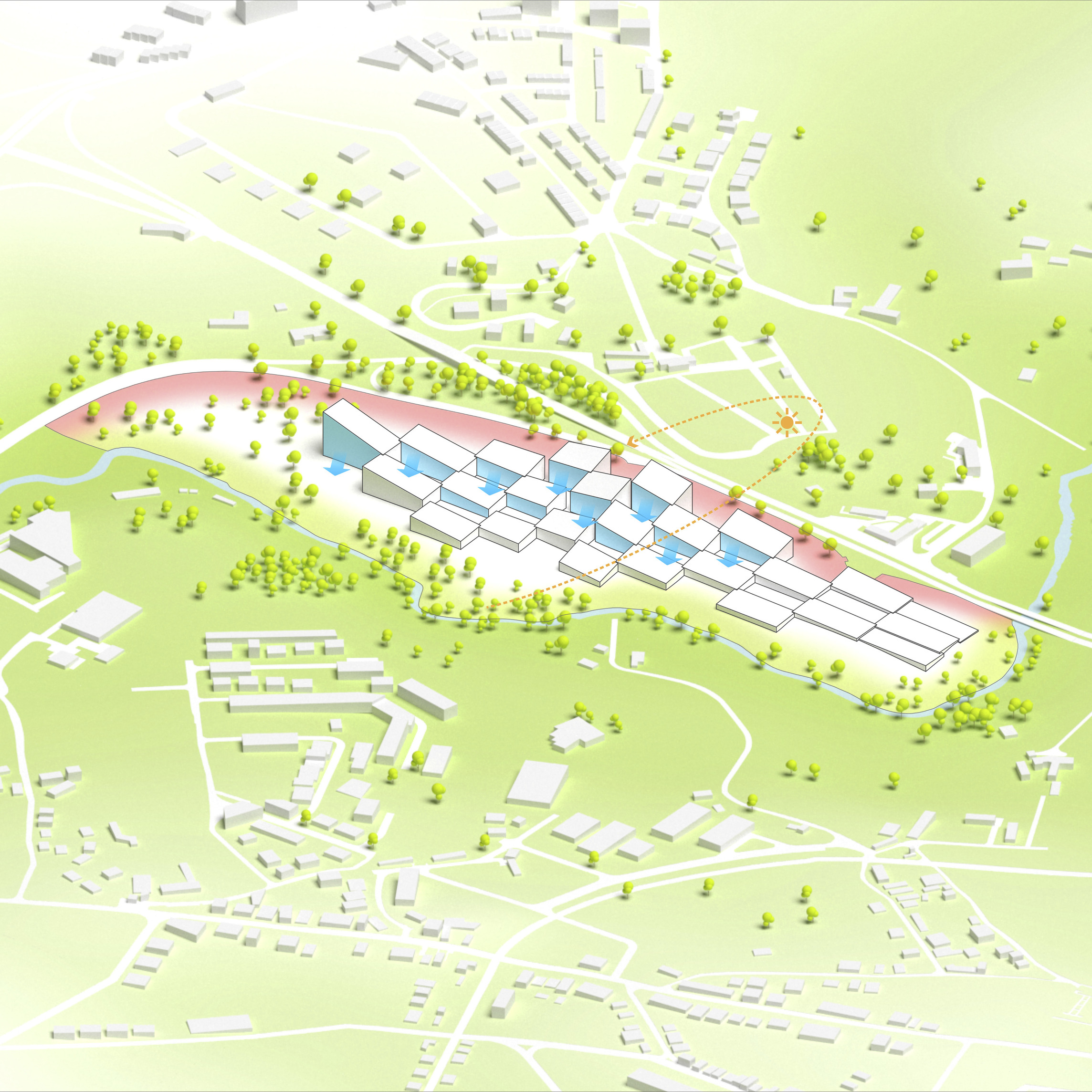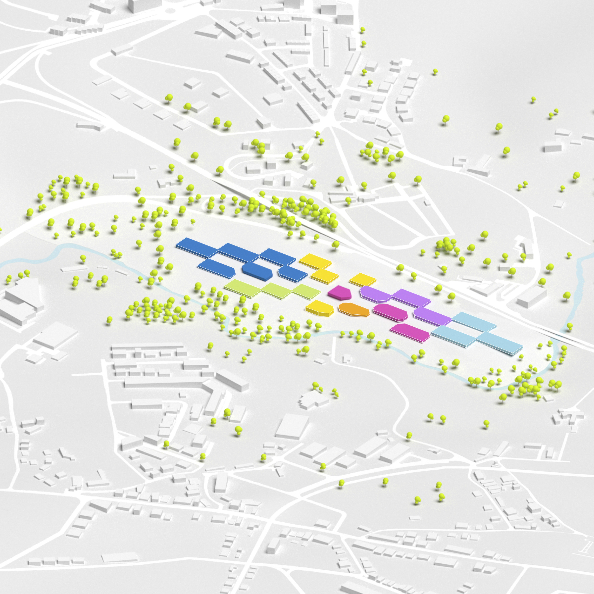 By using a clover structure in organizing the residential program each patient’s room is oriented toward its own part of the landscape – two sets of rooms facing the lake, and one set of rooms facing the surrounding hills. That way the intimate living program has been folded into the landscape being on a level with the lake. Between the functions emerges a new collective space that is embraced by offices and bed units and populated by small patios.