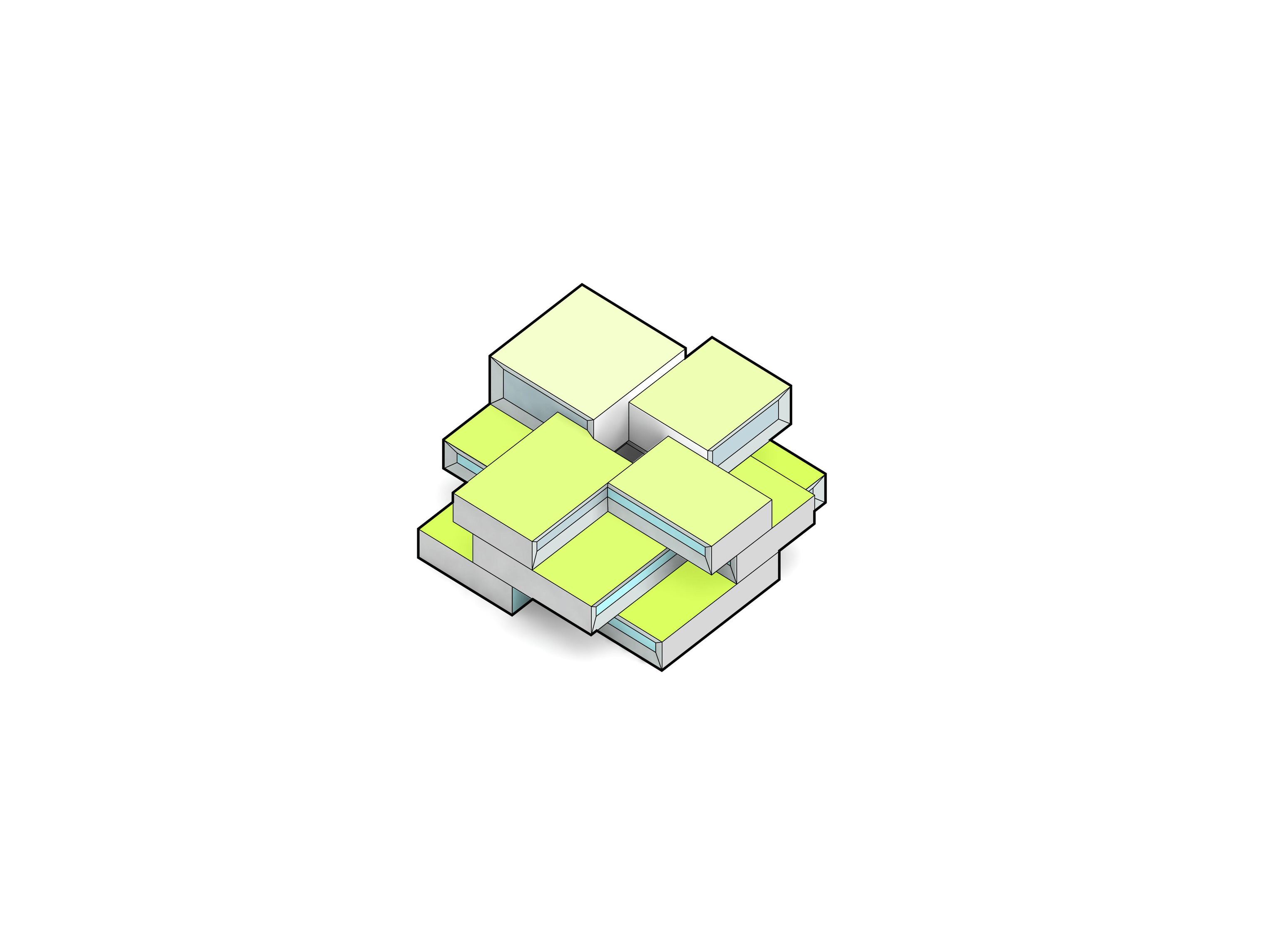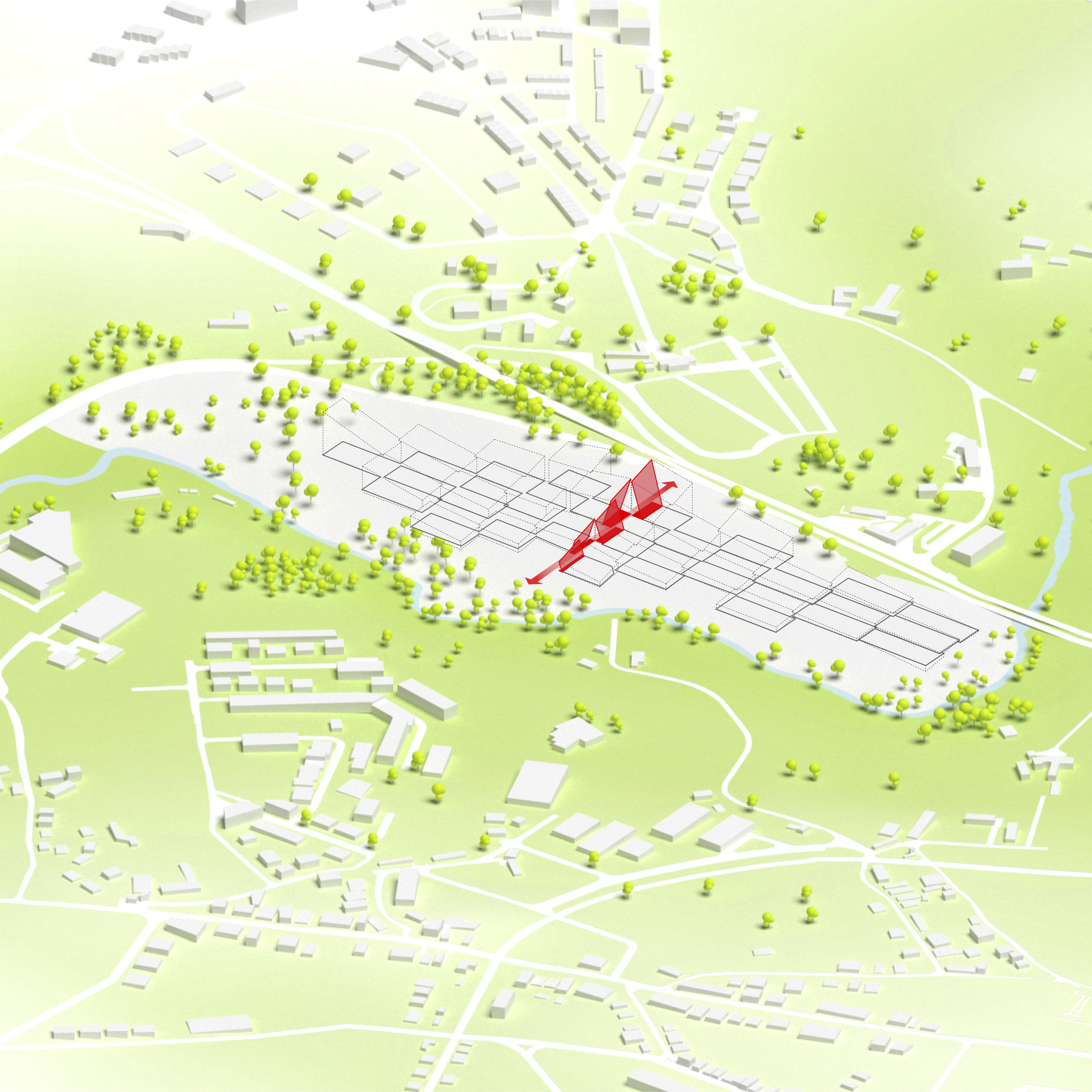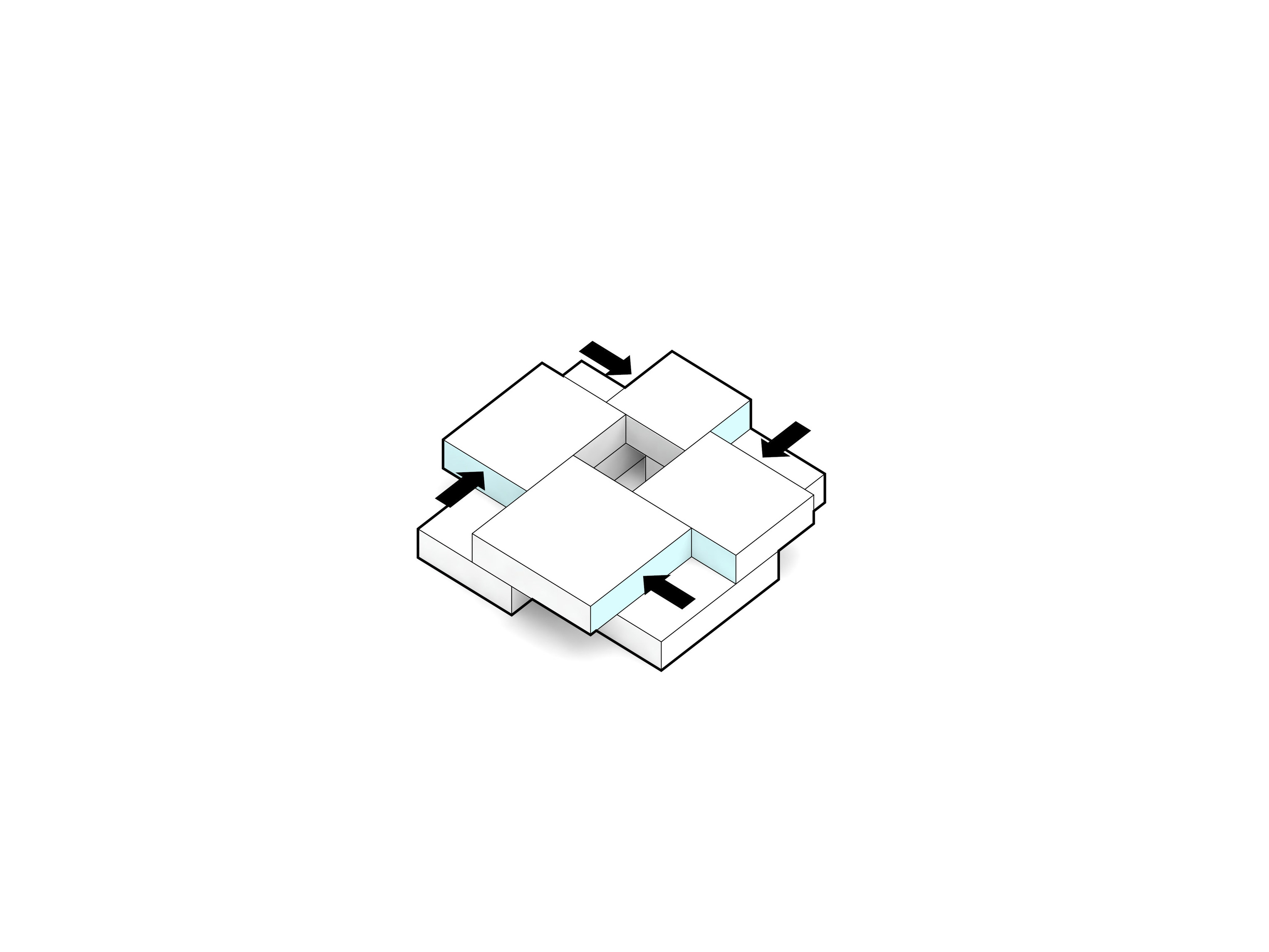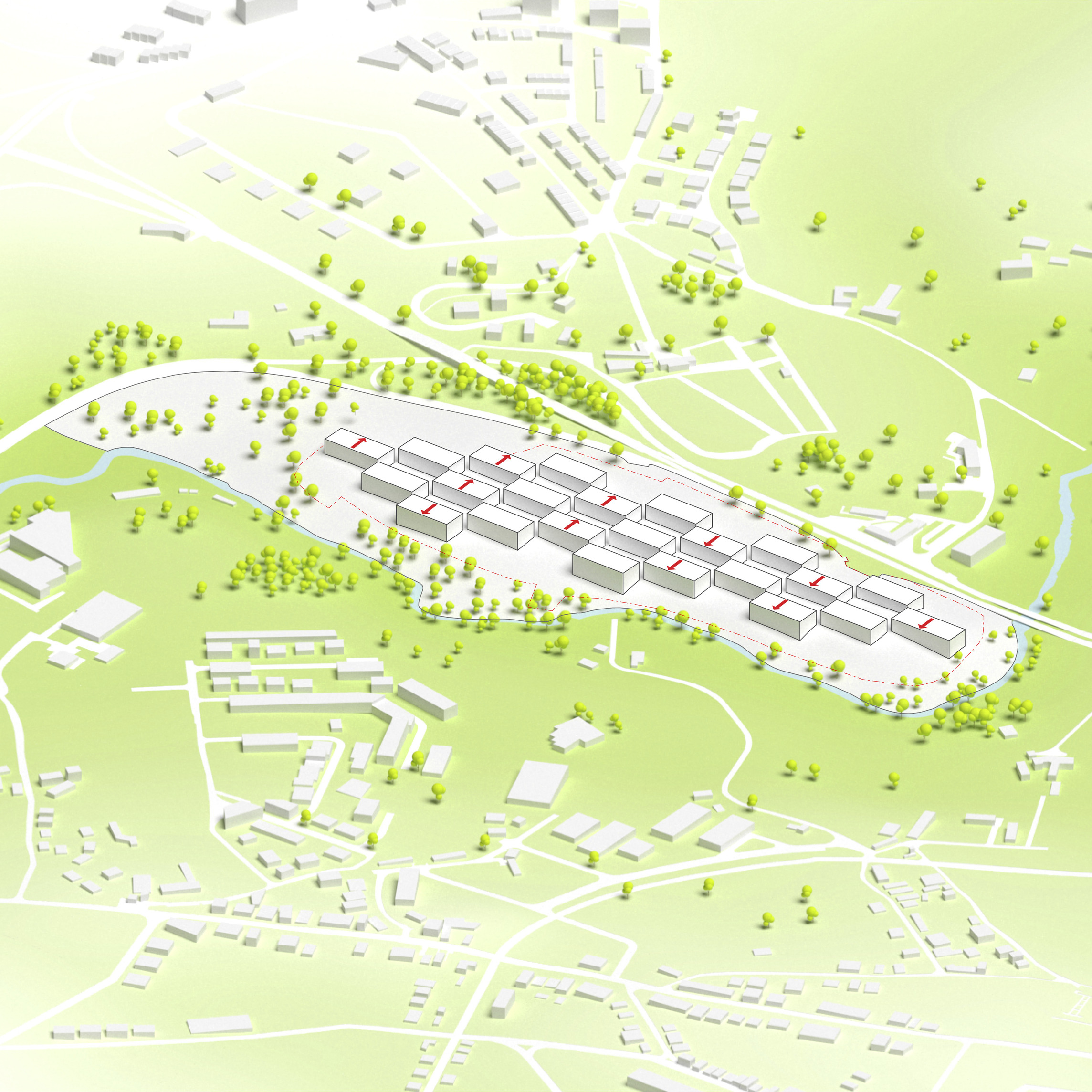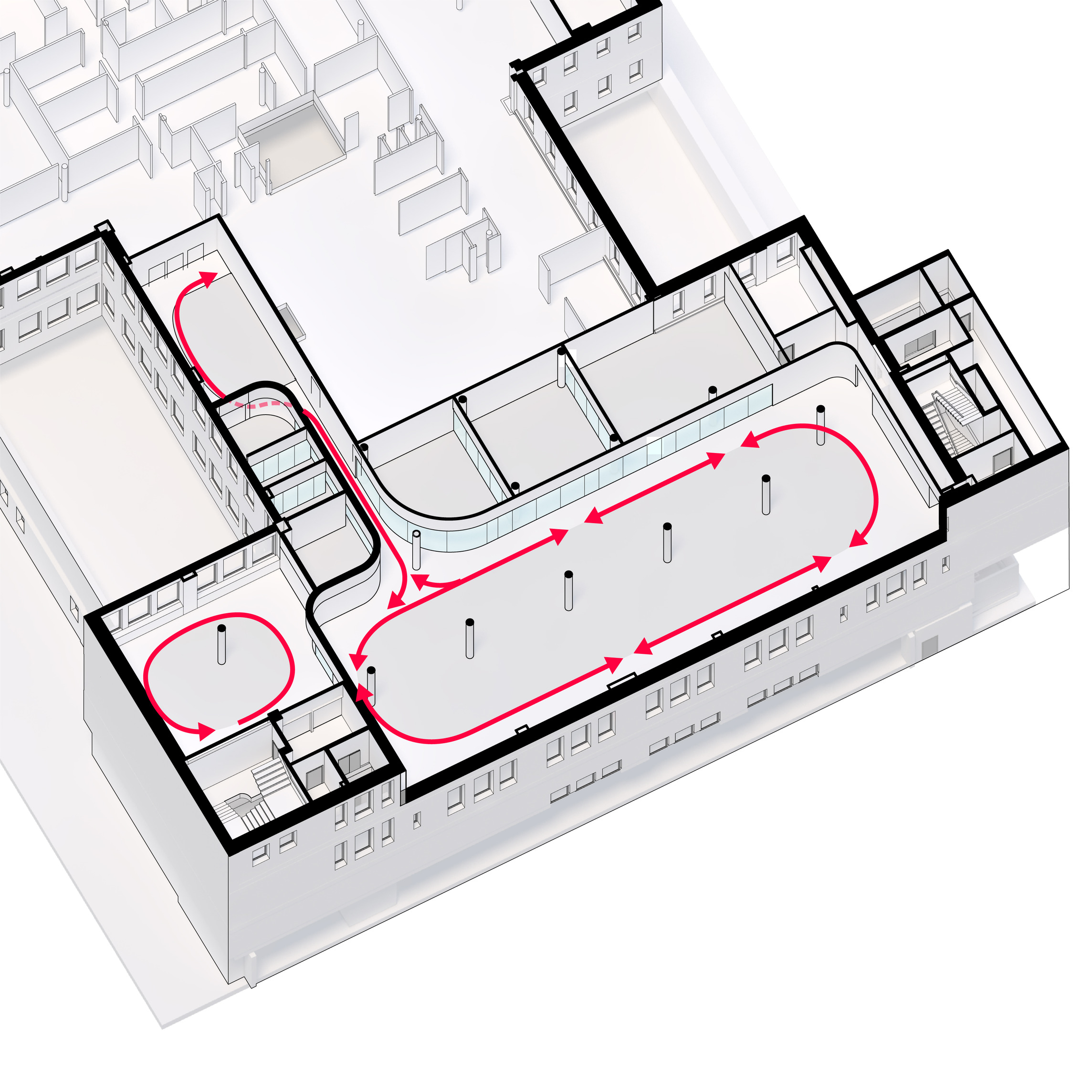 By using a clover structure in organizing the residential program each patient’s room is oriented toward its own part of the landscape – two sets of rooms facing the lake, and one set of rooms facing the surrounding hills. That way the intimate living program has been folded into the landscape being on a level with the lake. Between the functions emerges a new collective space that is embraced by offices and bed units and populated by small patios.