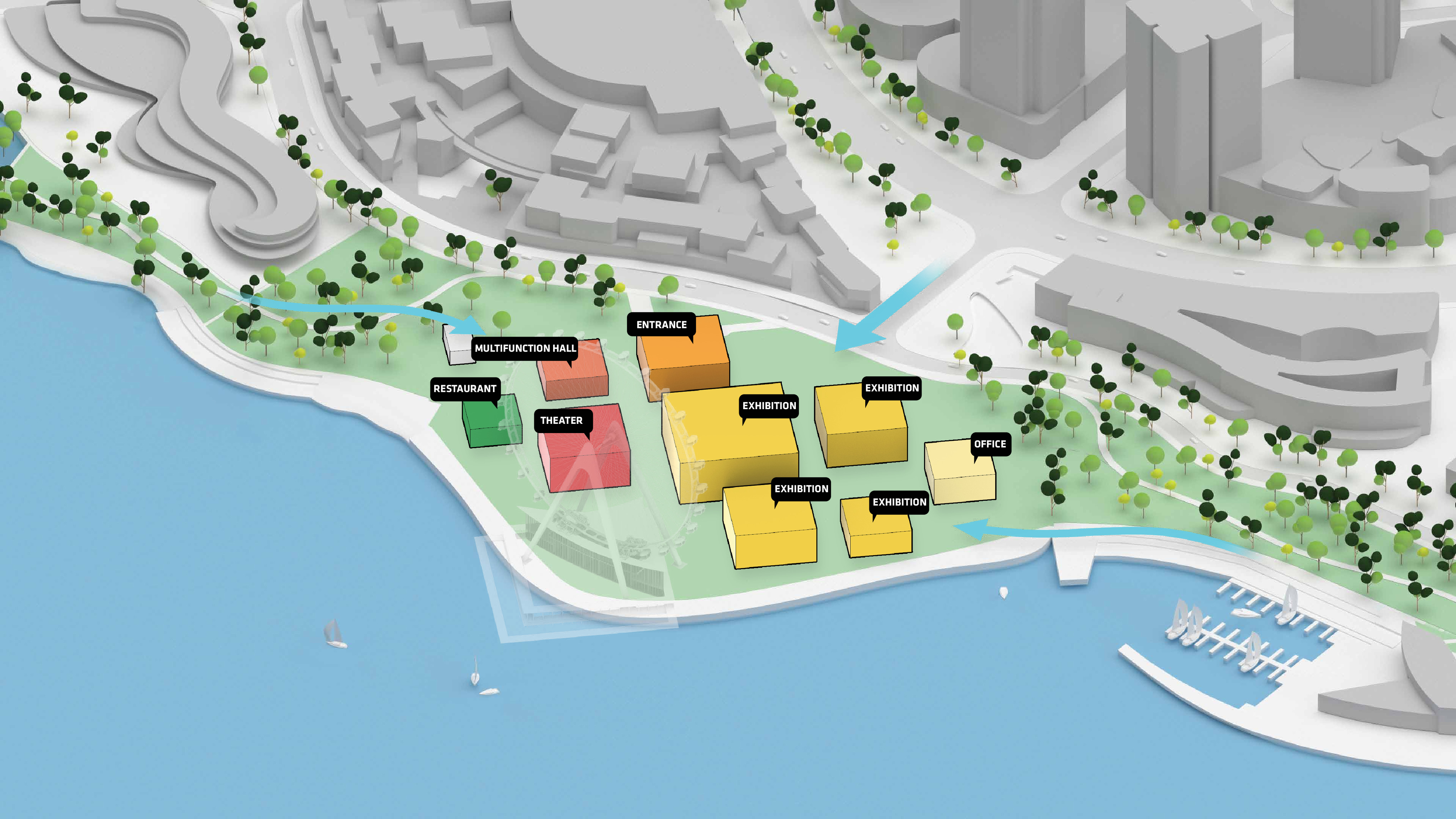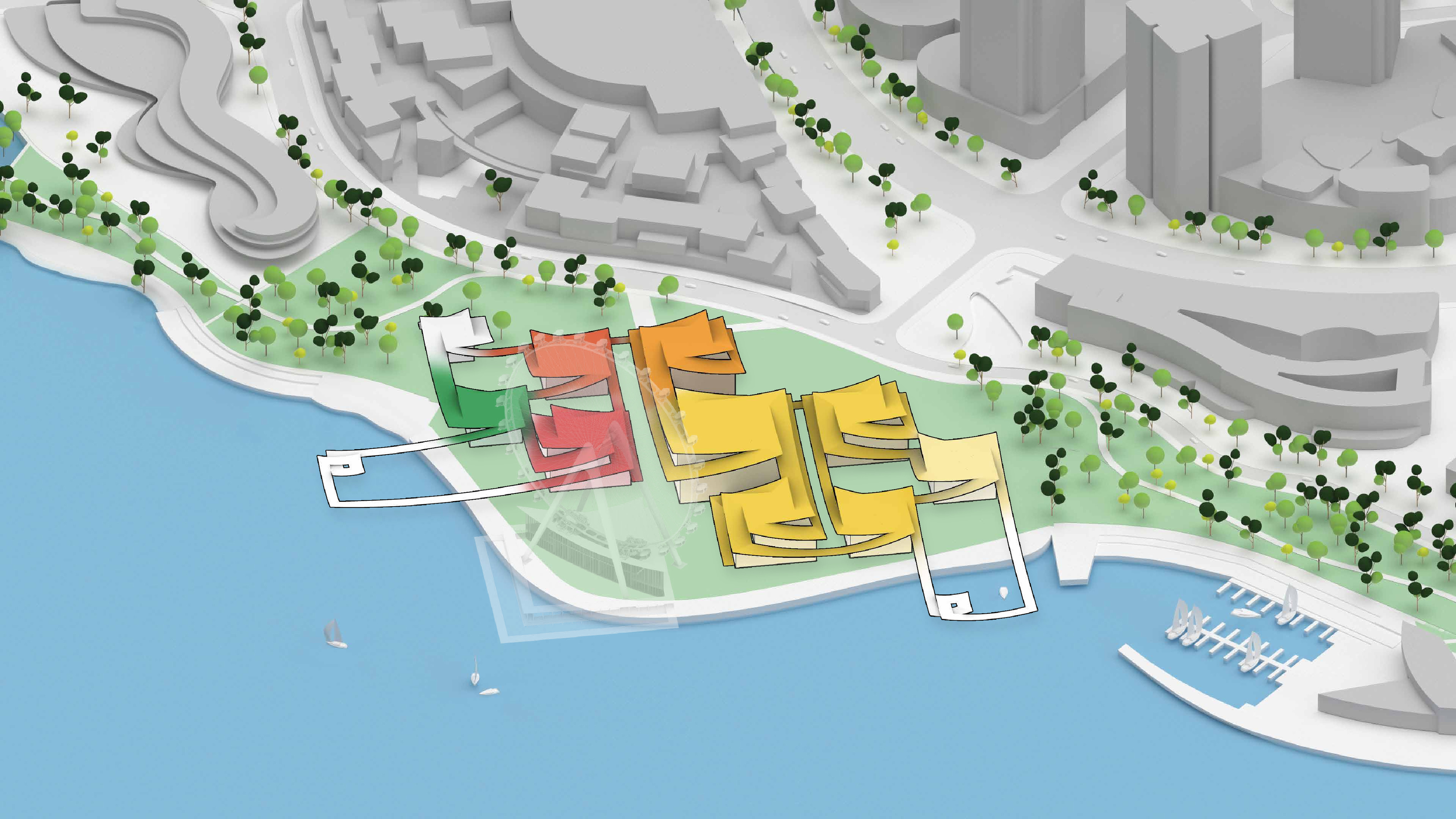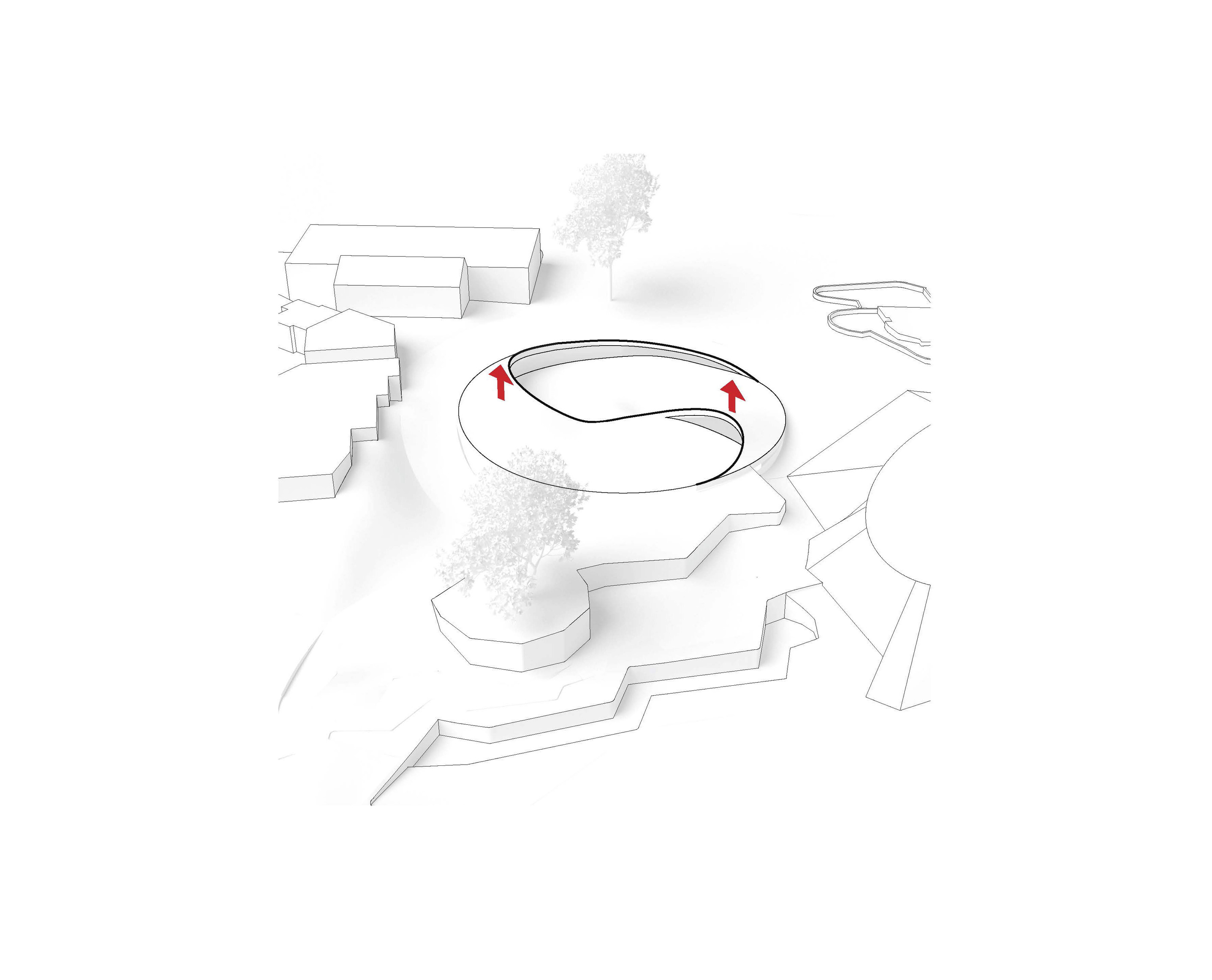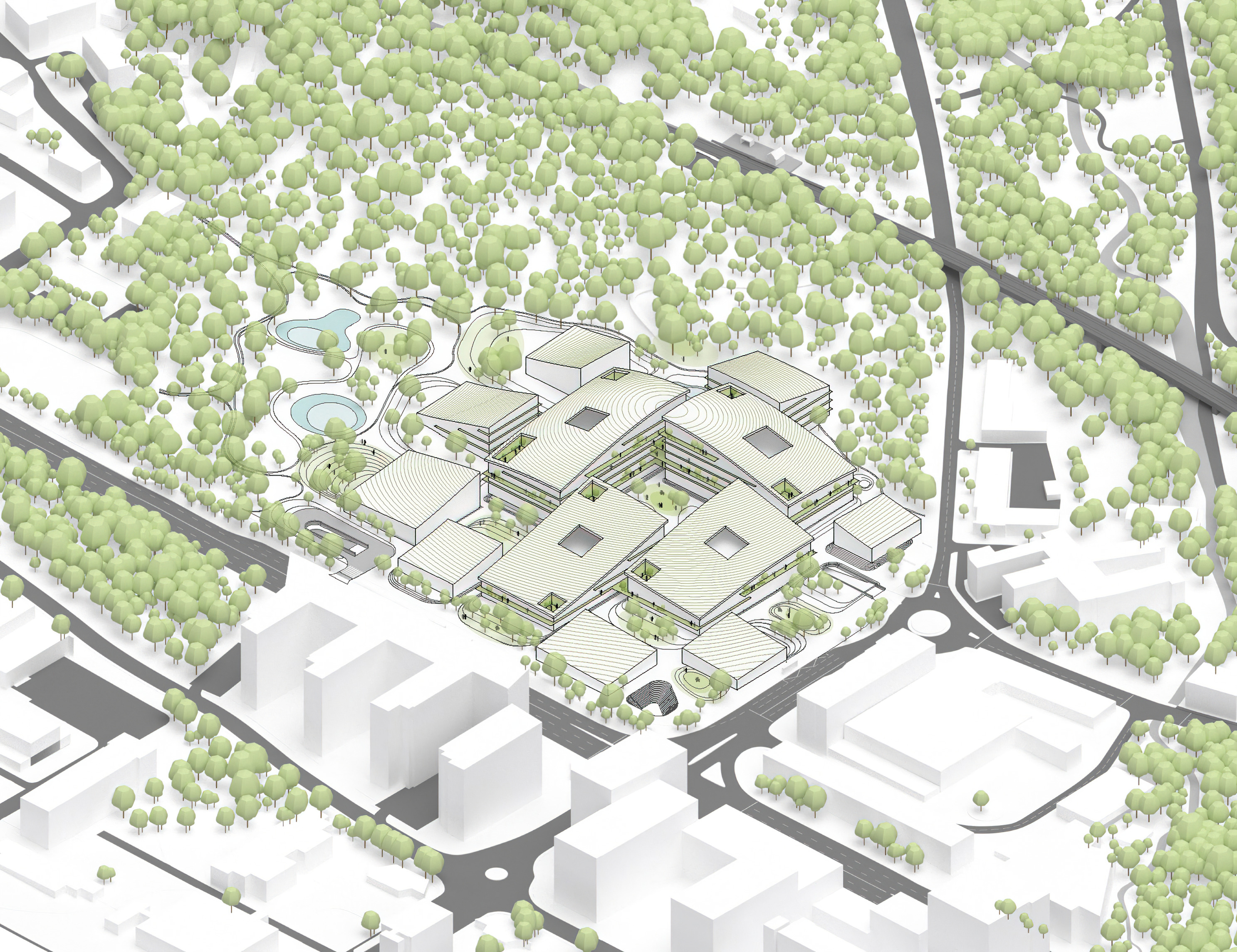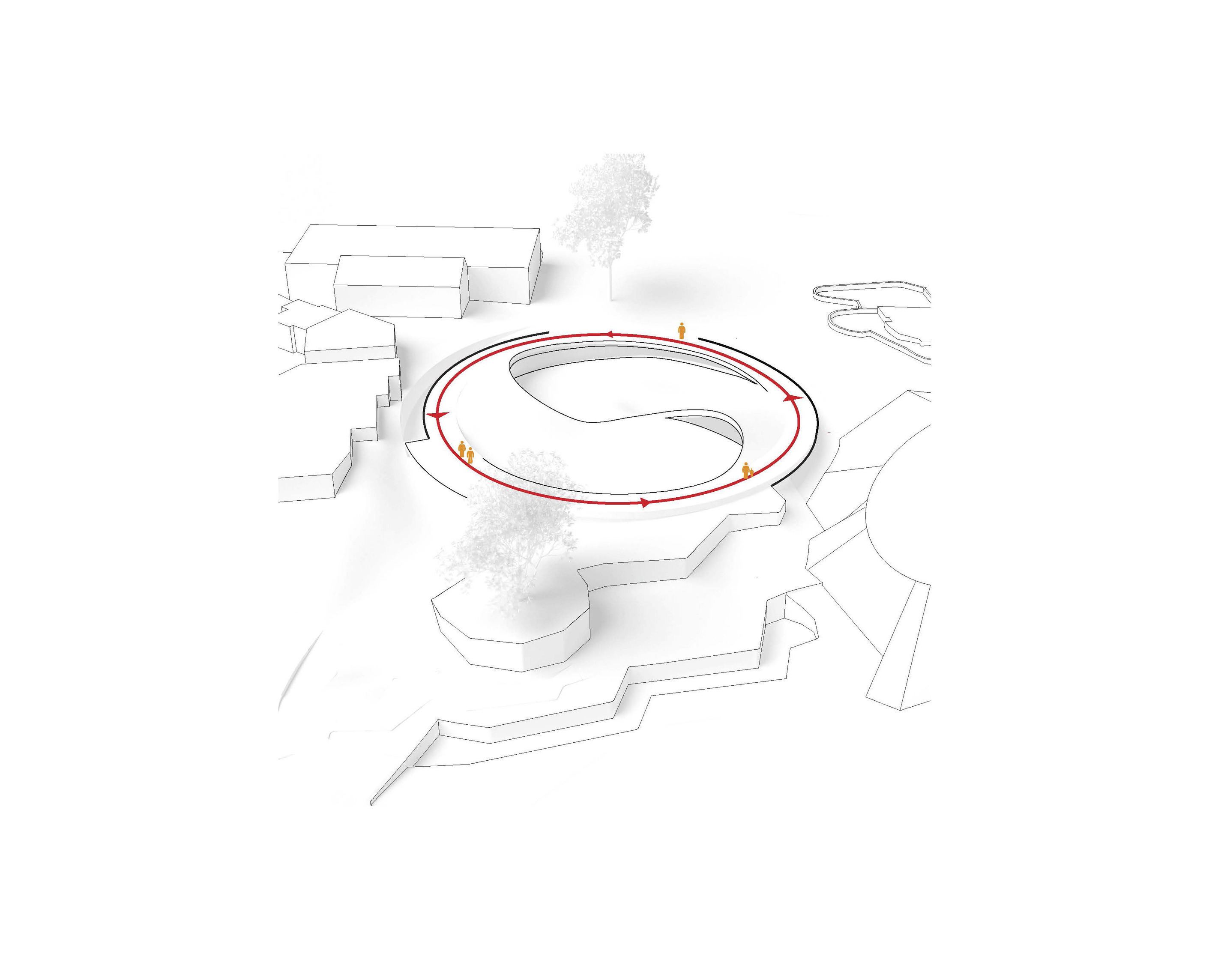 "Suzhou is the cradle of the Chinese garden. Our design for the Suzhou Museum of Contemporary Art is conceived as a garden of pavilions and courtyards. Individual pavilions are woven together by glazed galleries and porticoes, creating a Chinese knot of interconnected sculpture courtyards and exhibition spaces. Weaving between the legs of the Ferris wheel, the museum branches out like a rhizome, connecting the city to the lake. The result is a manmade maze of plants and artworks to get lost within. Its nodular logic only becomes distinctly discernible when seen from the gondolas above. Against the open space of the lake, the gentle conical curvature of the roofs forms a graceful silhouette on the waterfront. From above, the stainless roof tiles form a true fifth facade."