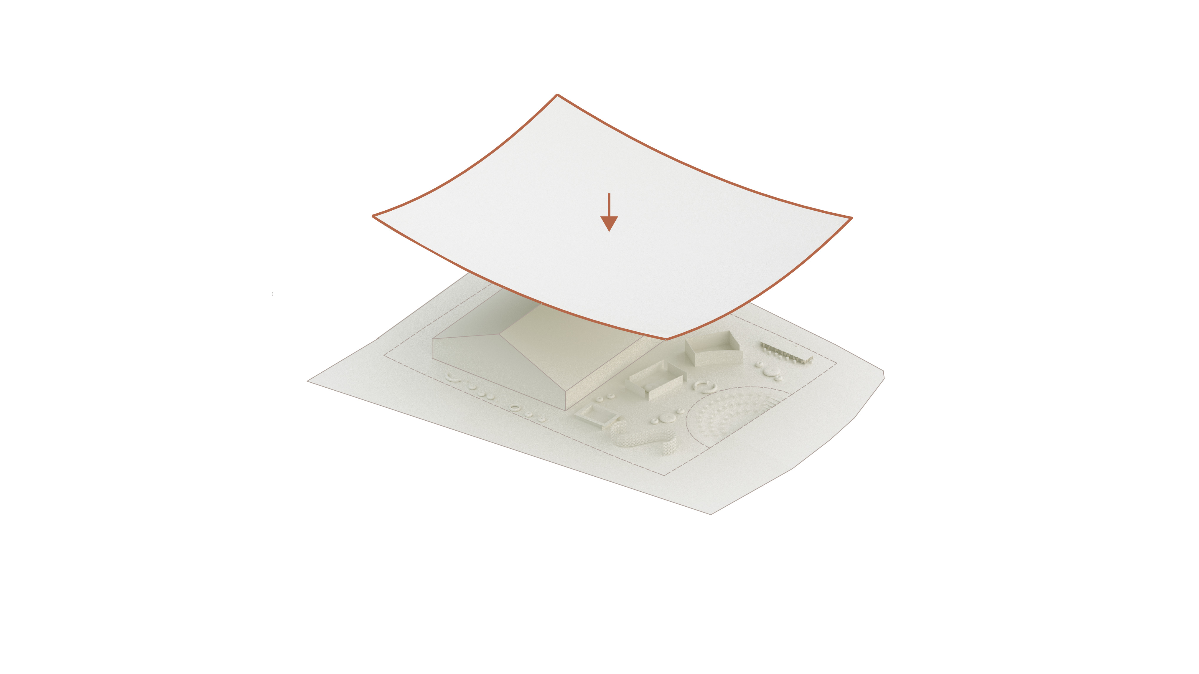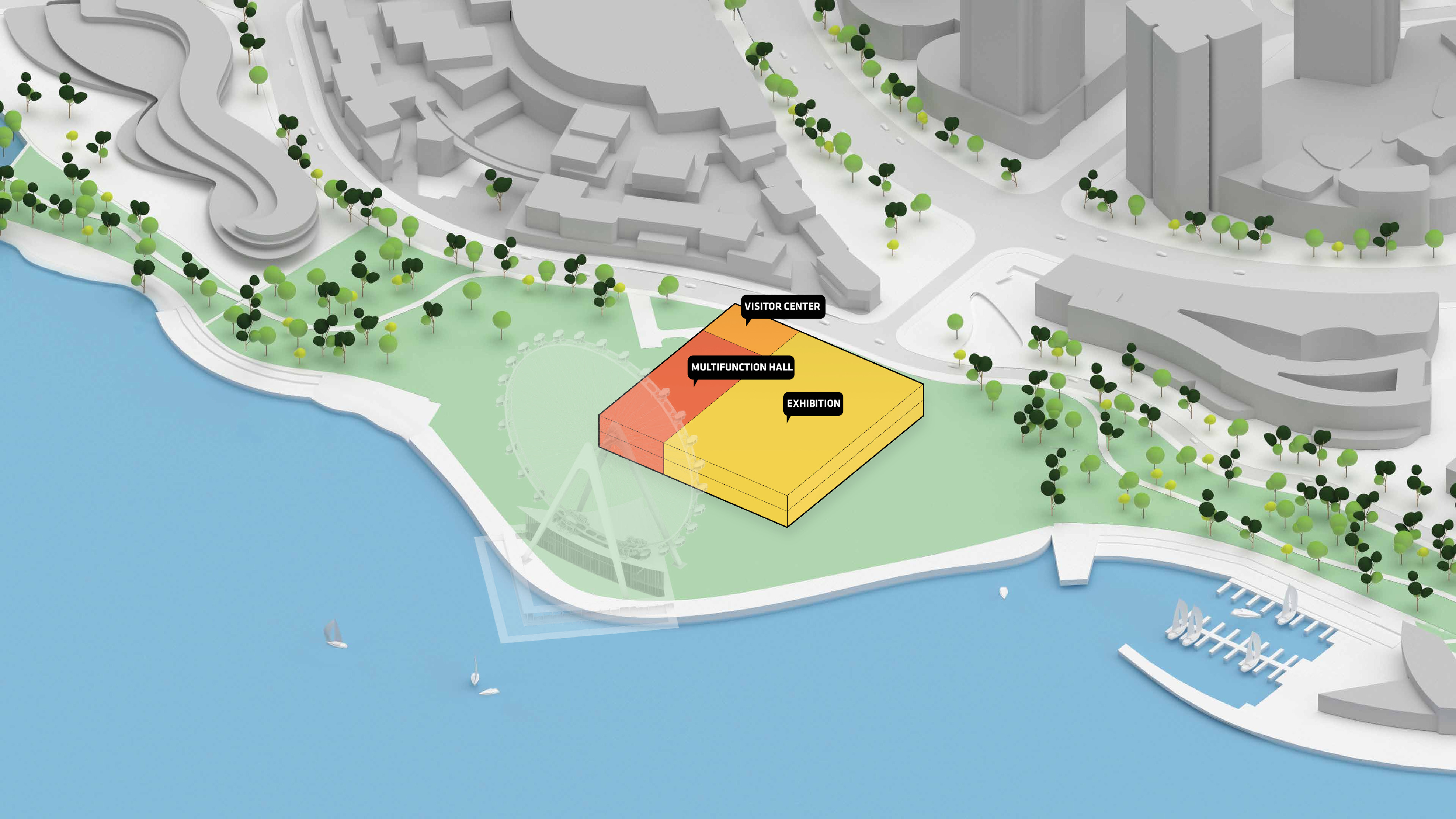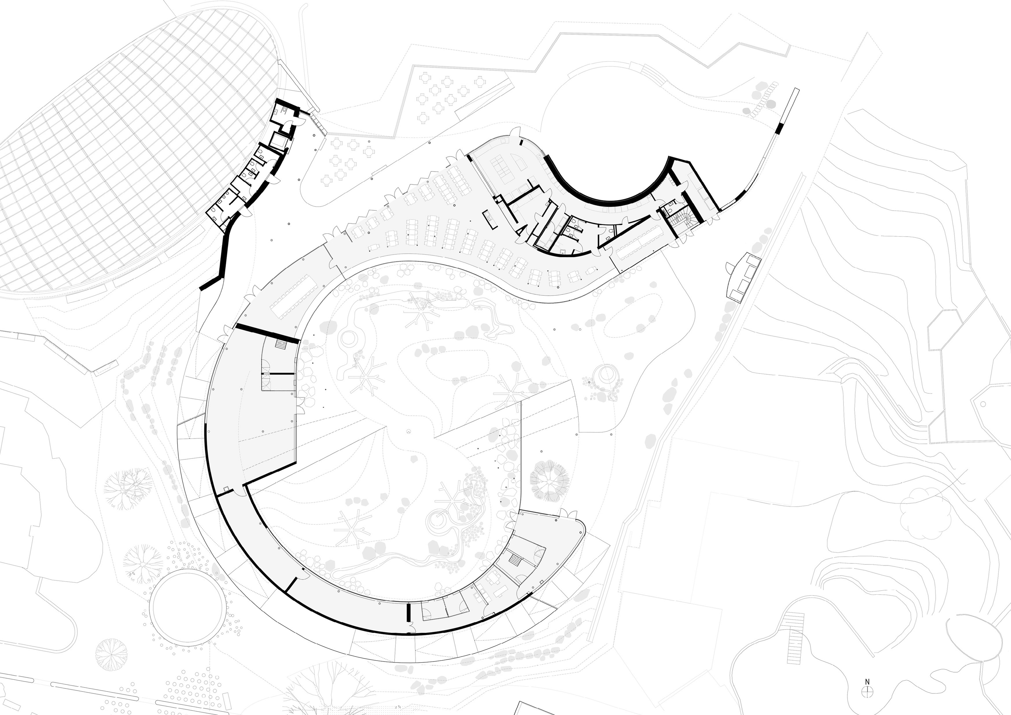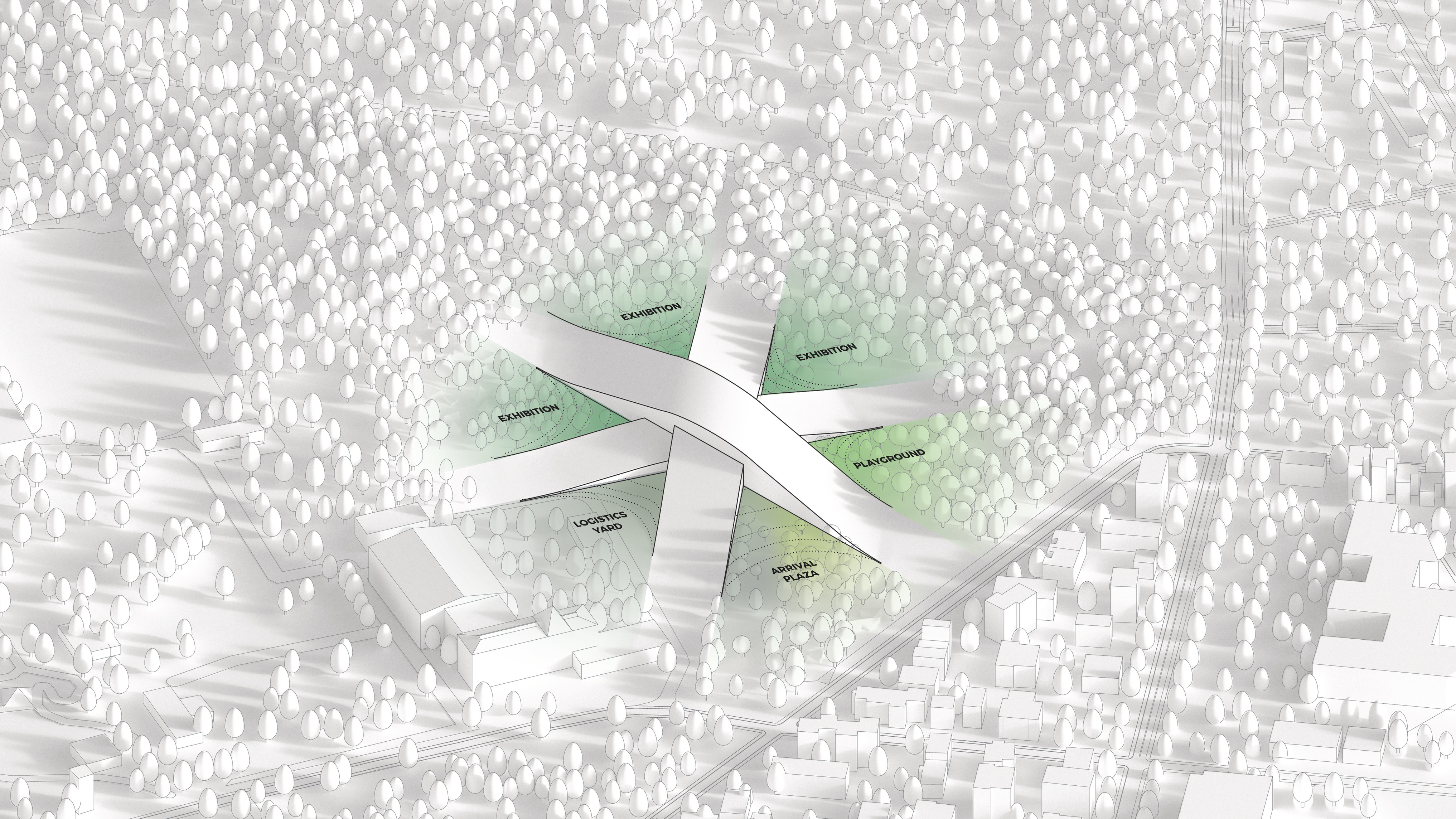 "Suzhou is the cradle of the Chinese garden. Our design for the Suzhou Museum of Contemporary Art is conceived as a garden of pavilions and courtyards. Individual pavilions are woven together by glazed galleries and porticoes, creating a Chinese knot of interconnected sculpture courtyards and exhibition spaces. Weaving between the legs of the Ferris wheel, the museum branches out like a rhizome, connecting the city to the lake. The result is a manmade maze of plants and artworks to get lost within. Its nodular logic only becomes distinctly discernible when seen from the gondolas above. Against the open space of the lake, the gentle conical curvature of the roofs forms a graceful silhouette on the waterfront. From above, the stainless roof tiles form a true fifth facade."
