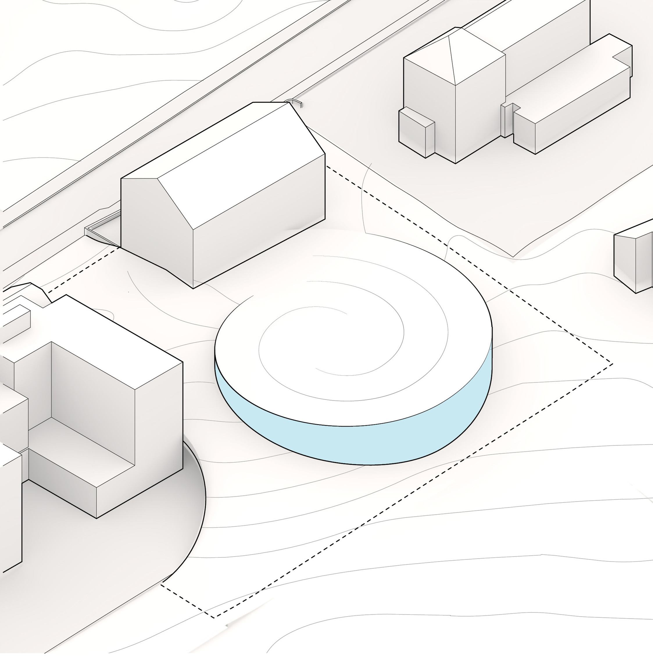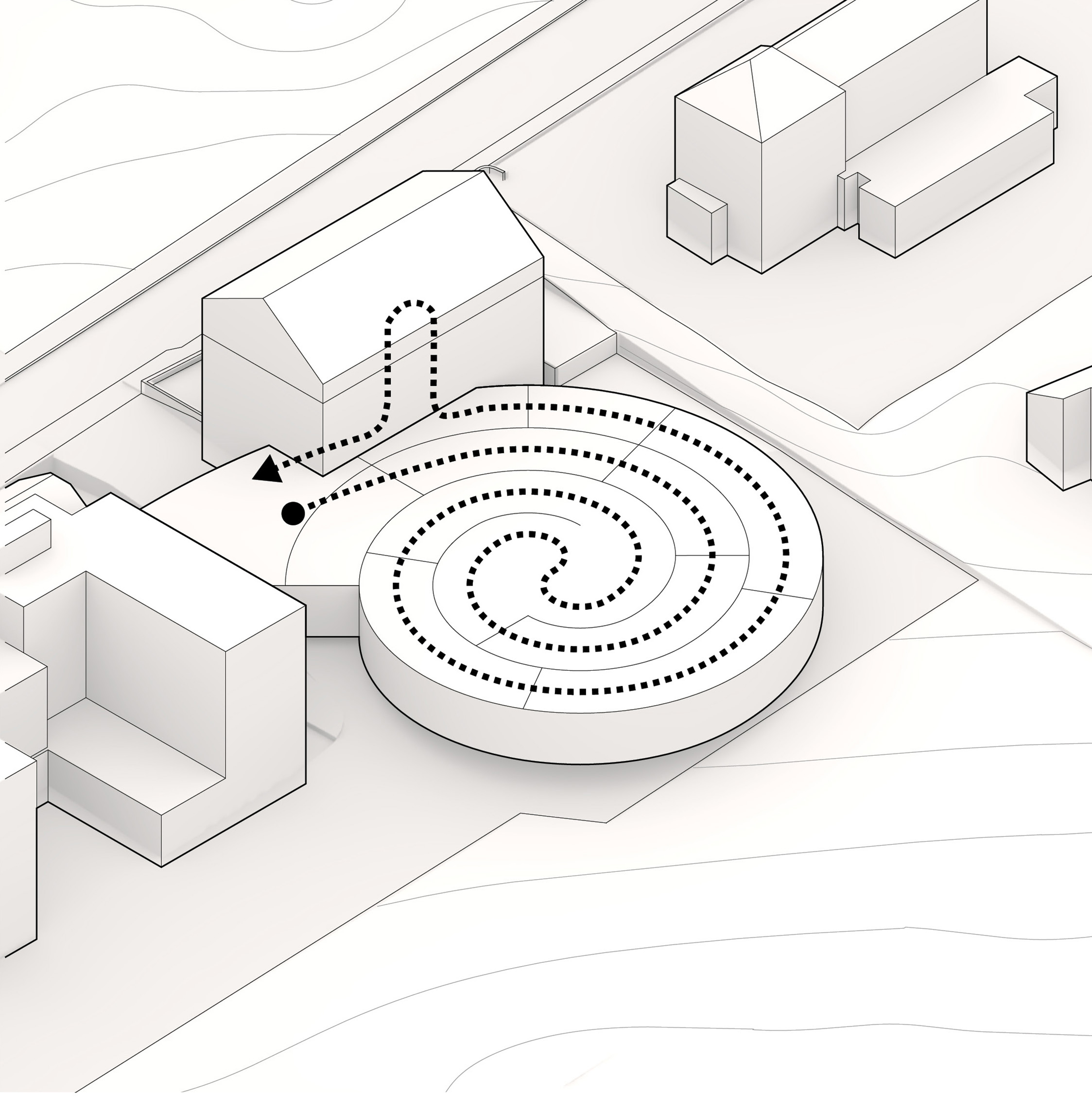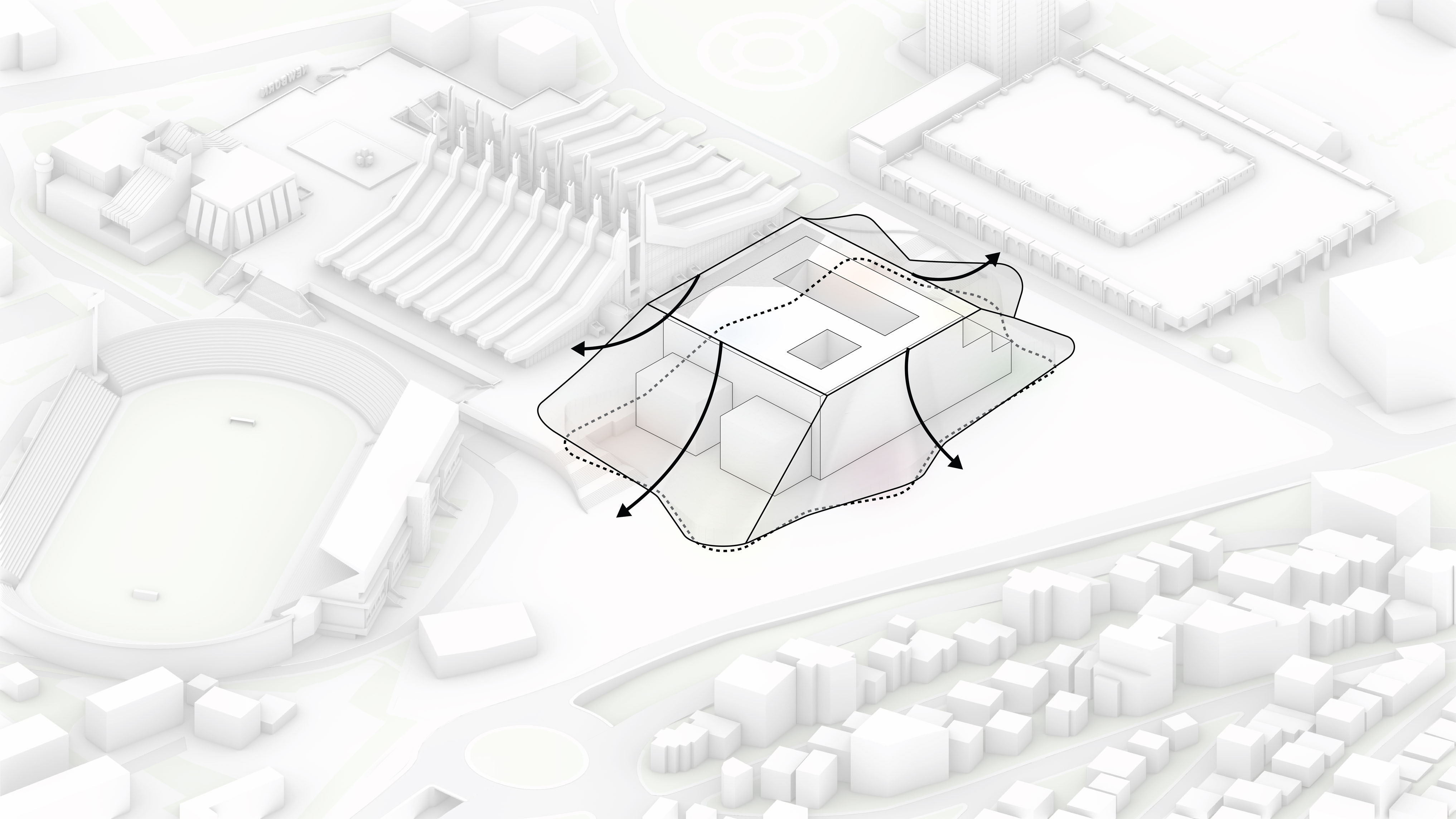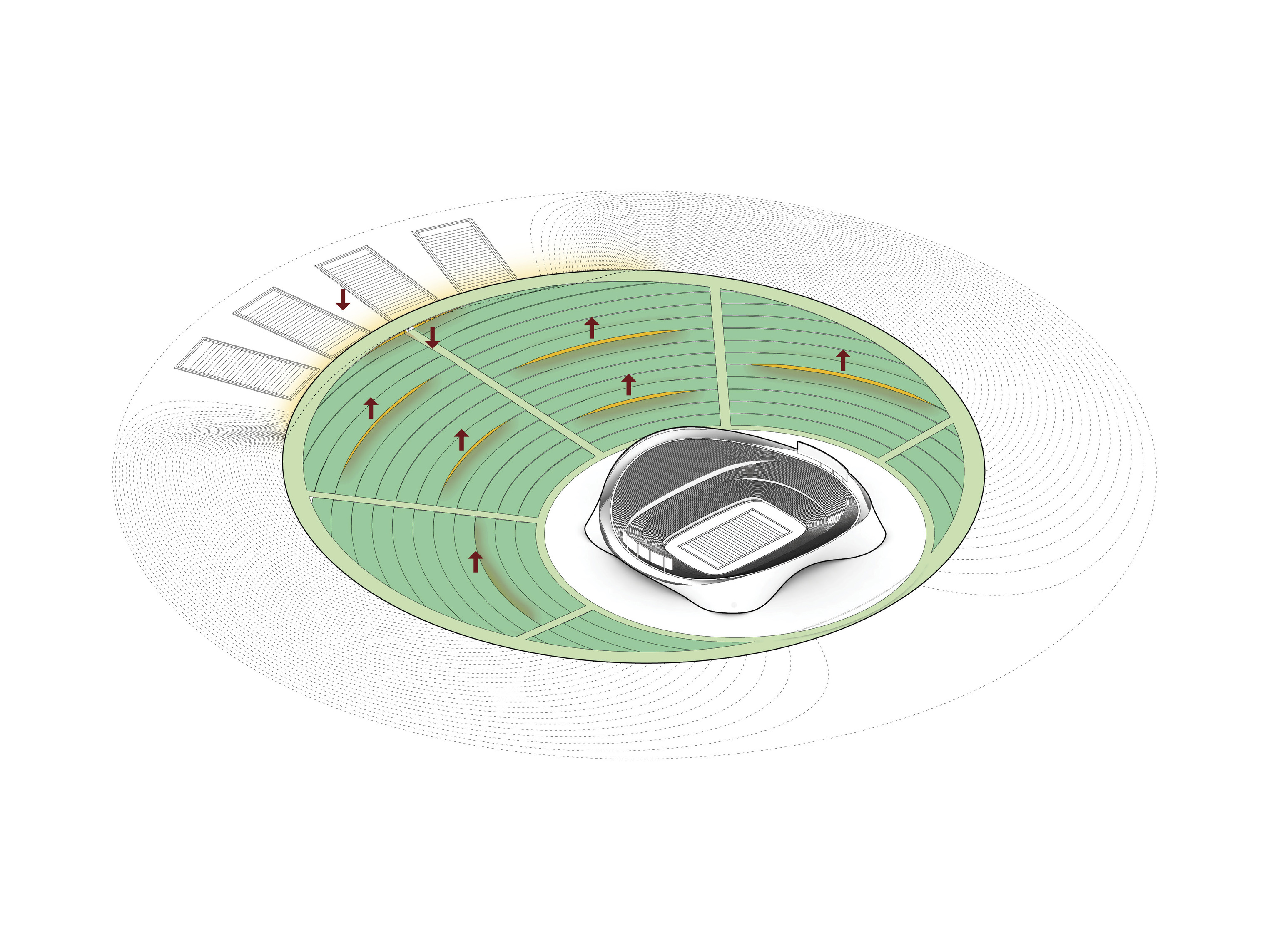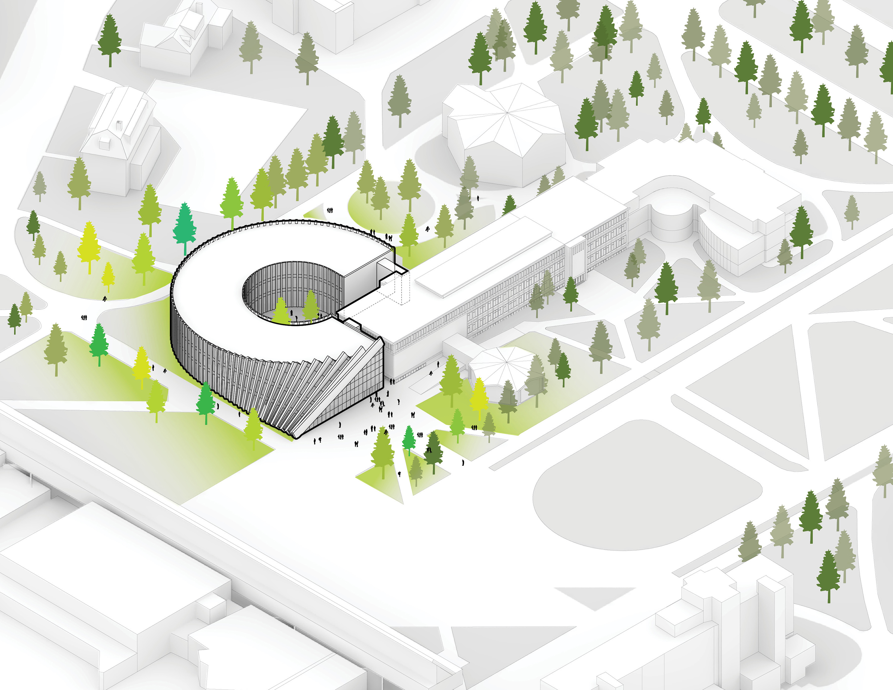 "Suzhou is the cradle of the Chinese garden. Our design for the Suzhou Museum of Contemporary Art is conceived as a garden of pavilions and courtyards. Individual pavilions are woven together by glazed galleries and porticoes, creating a Chinese knot of interconnected sculpture courtyards and exhibition spaces. Weaving between the legs of the Ferris wheel, the museum branches out like a rhizome, connecting the city to the lake. The result is a manmade maze of plants and artworks to get lost within. Its nodular logic only becomes distinctly discernible when seen from the gondolas above. Against the open space of the lake, the gentle conical curvature of the roofs forms a graceful silhouette on the waterfront. From above, the stainless roof tiles form a true fifth facade."