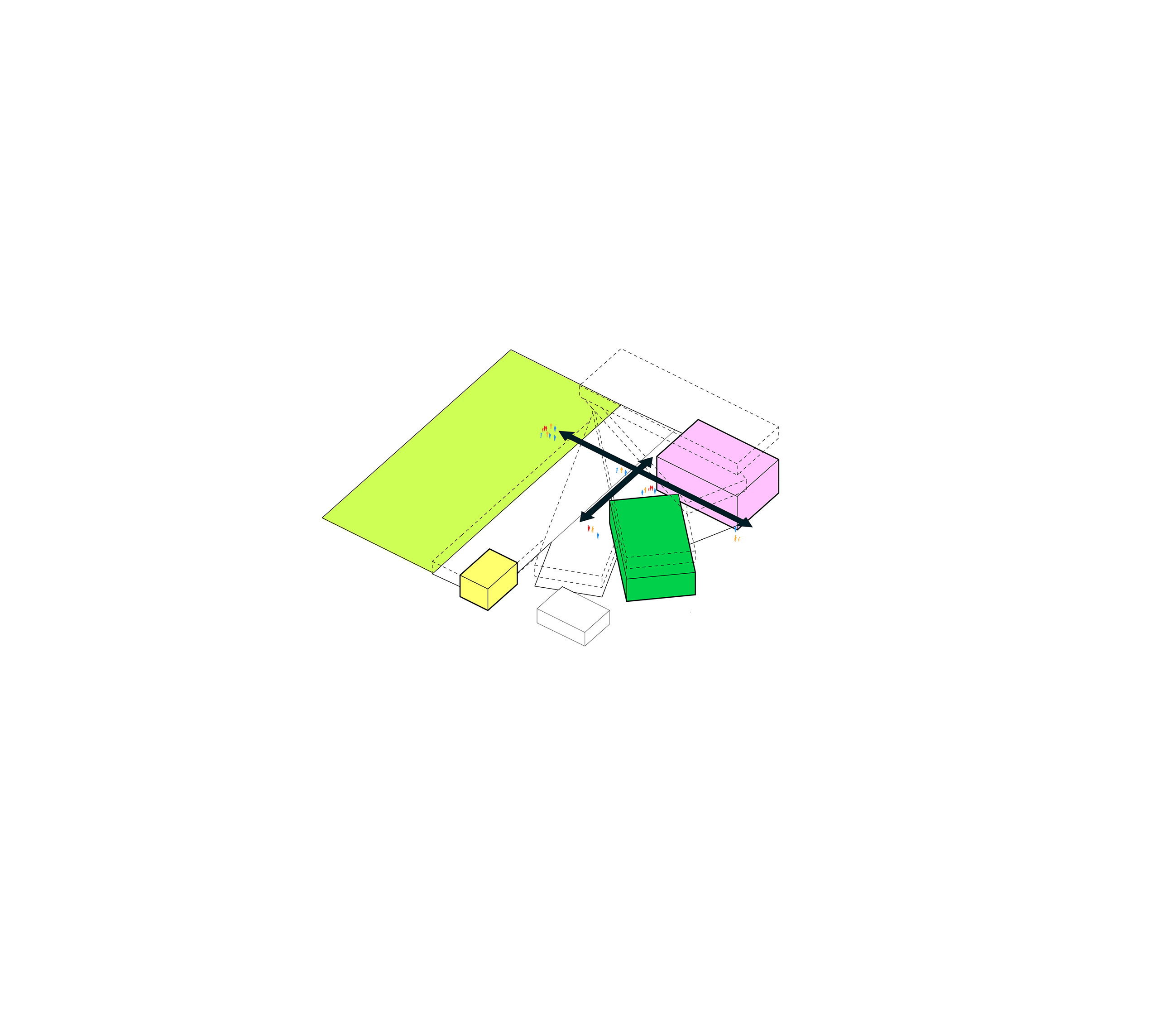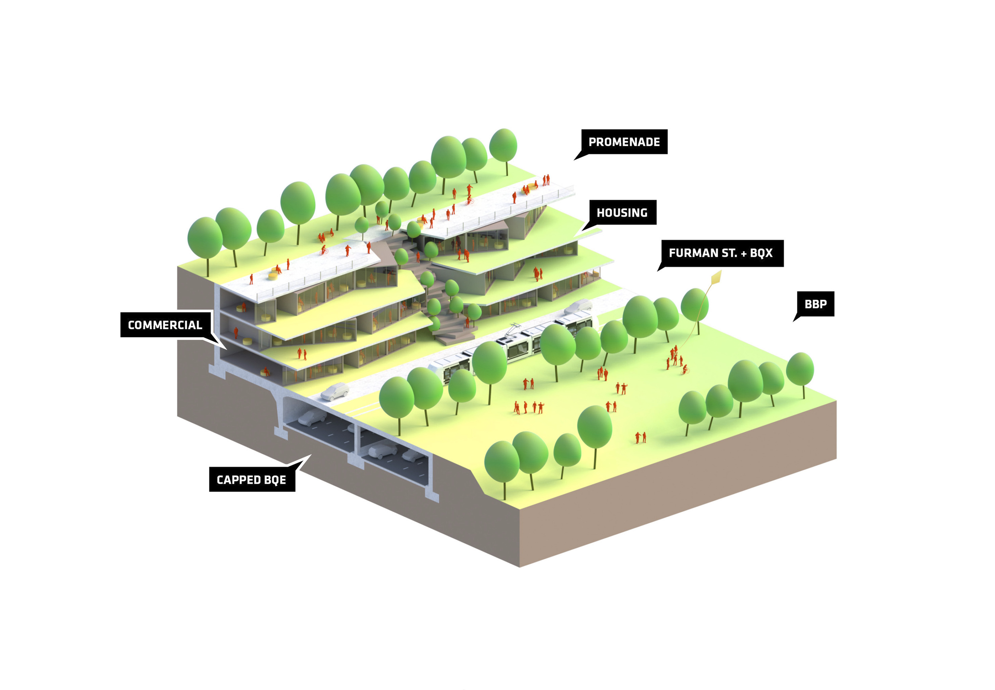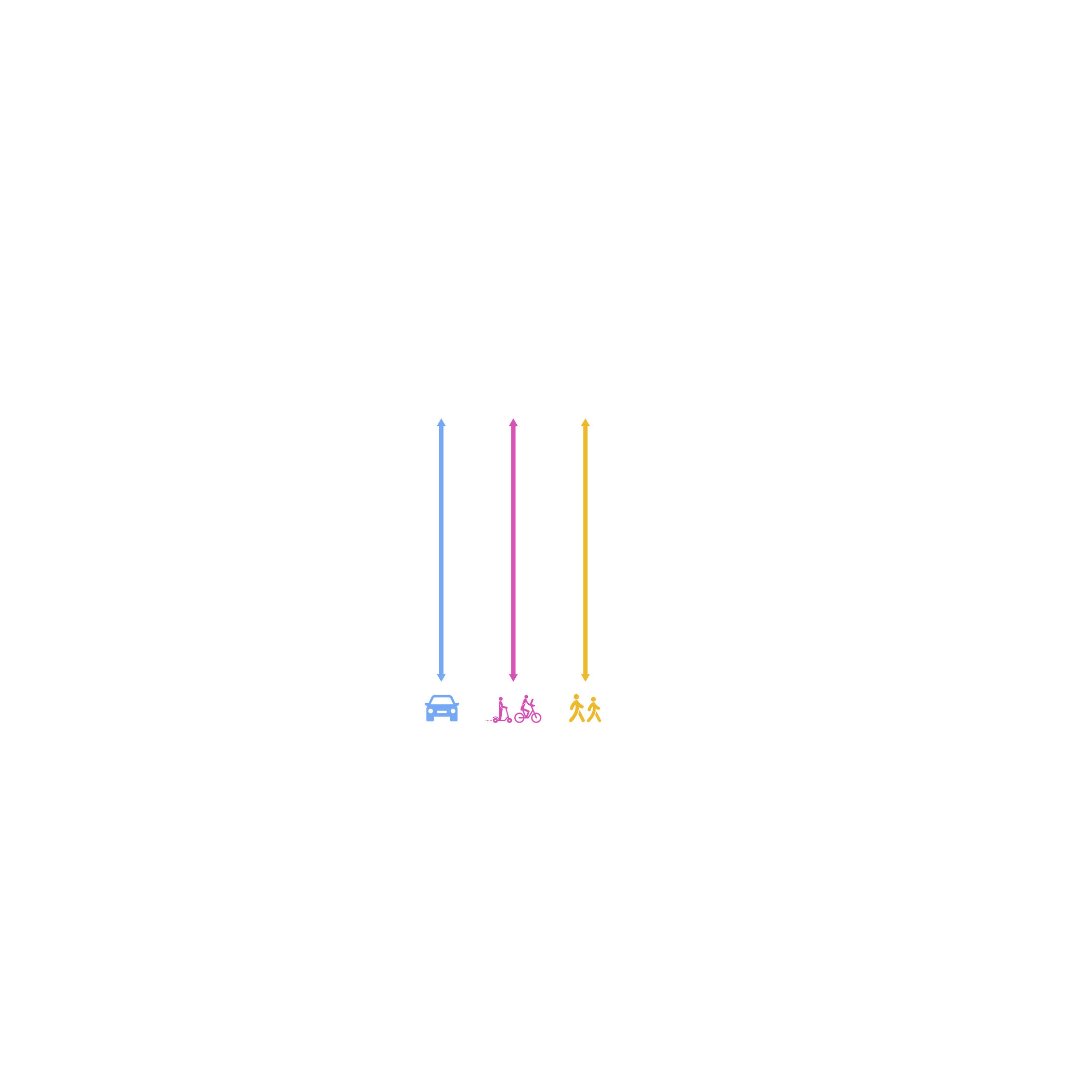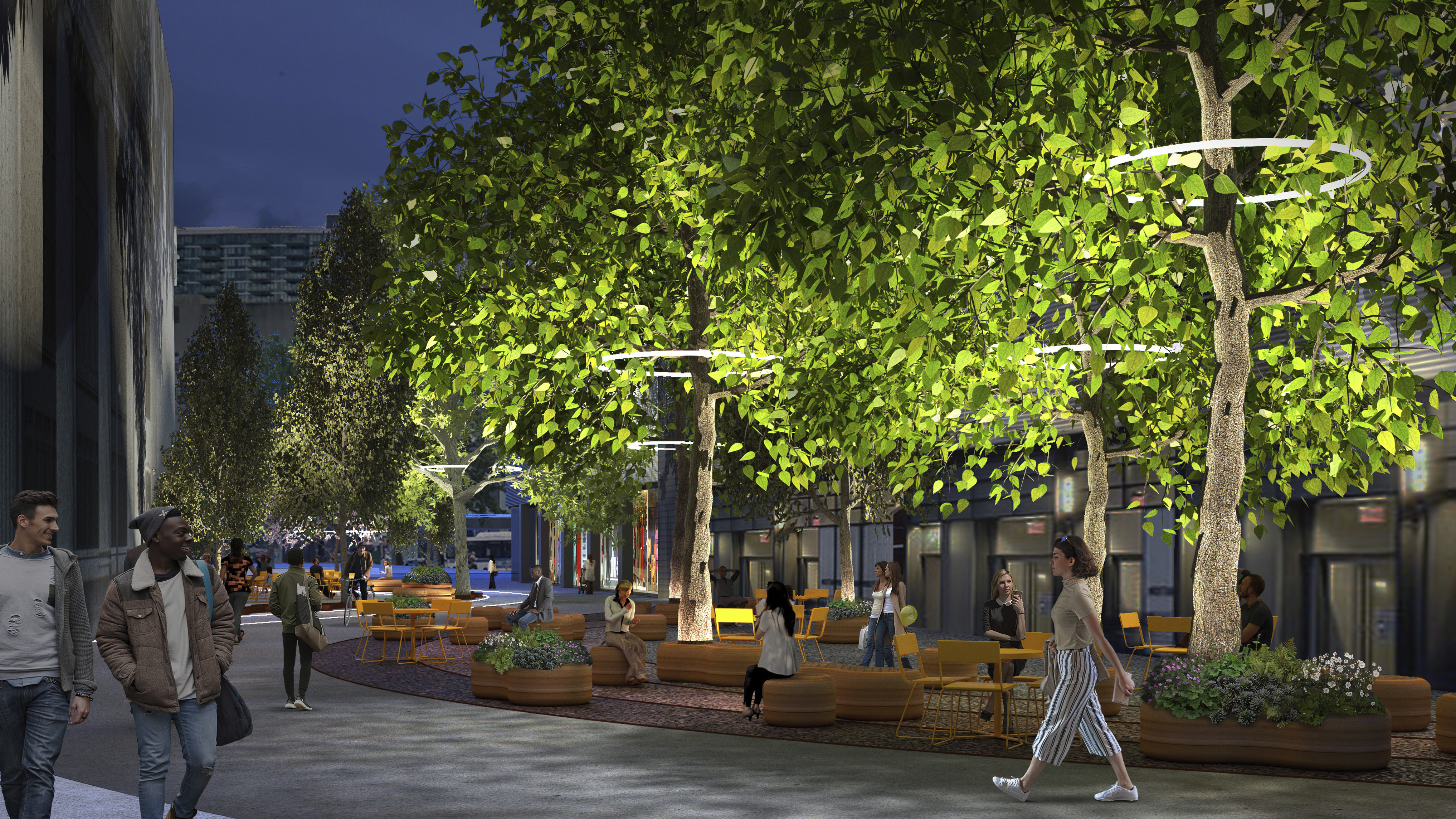 The recreational promenade is occupied by micro-mobility types such as bicycles, scooters, and other modes of personal transport, including Toyota’s i-Walk. The shared street allows residents to freely meander at a reduced speed with increasing amount of nature and space.