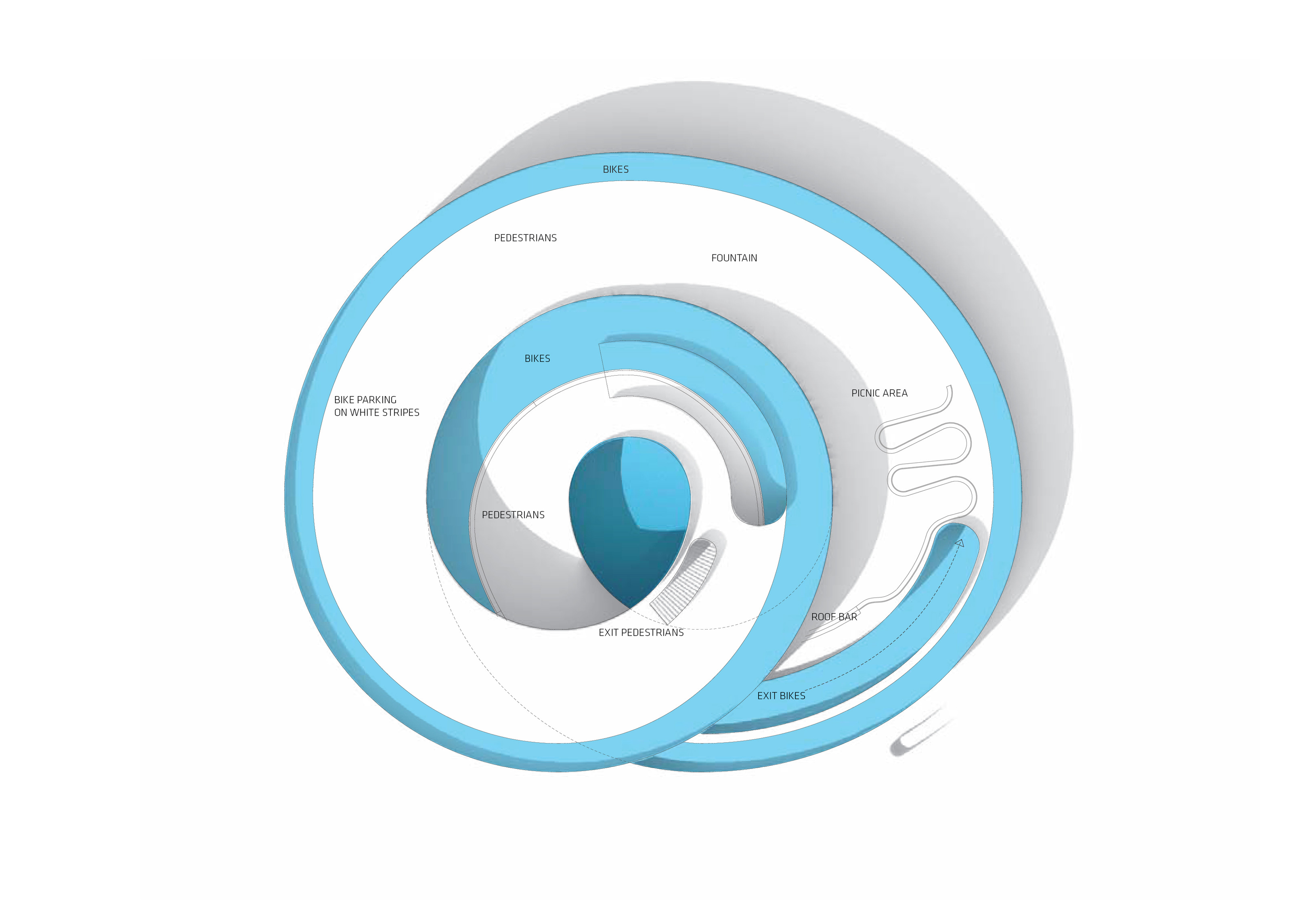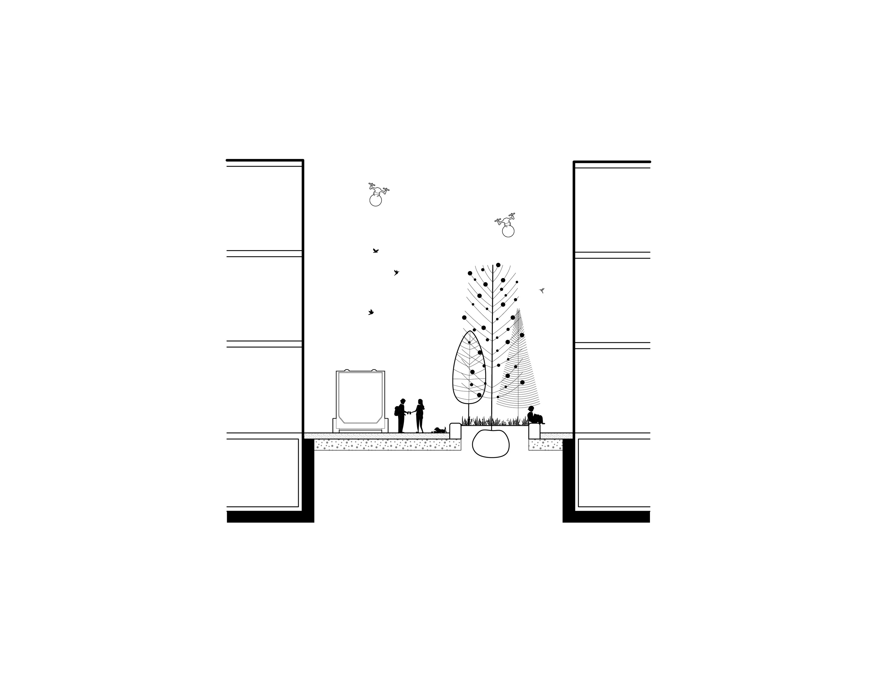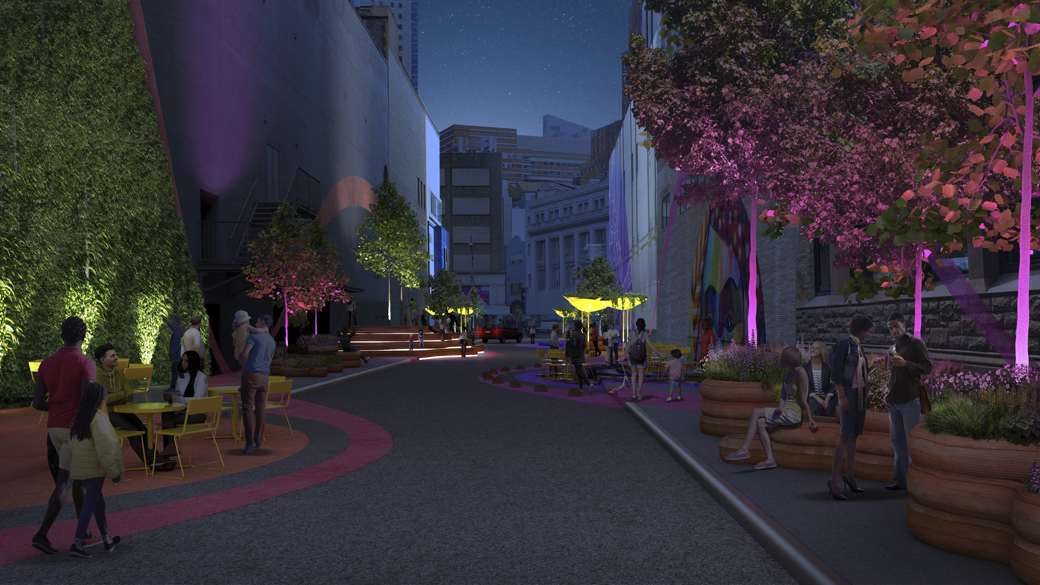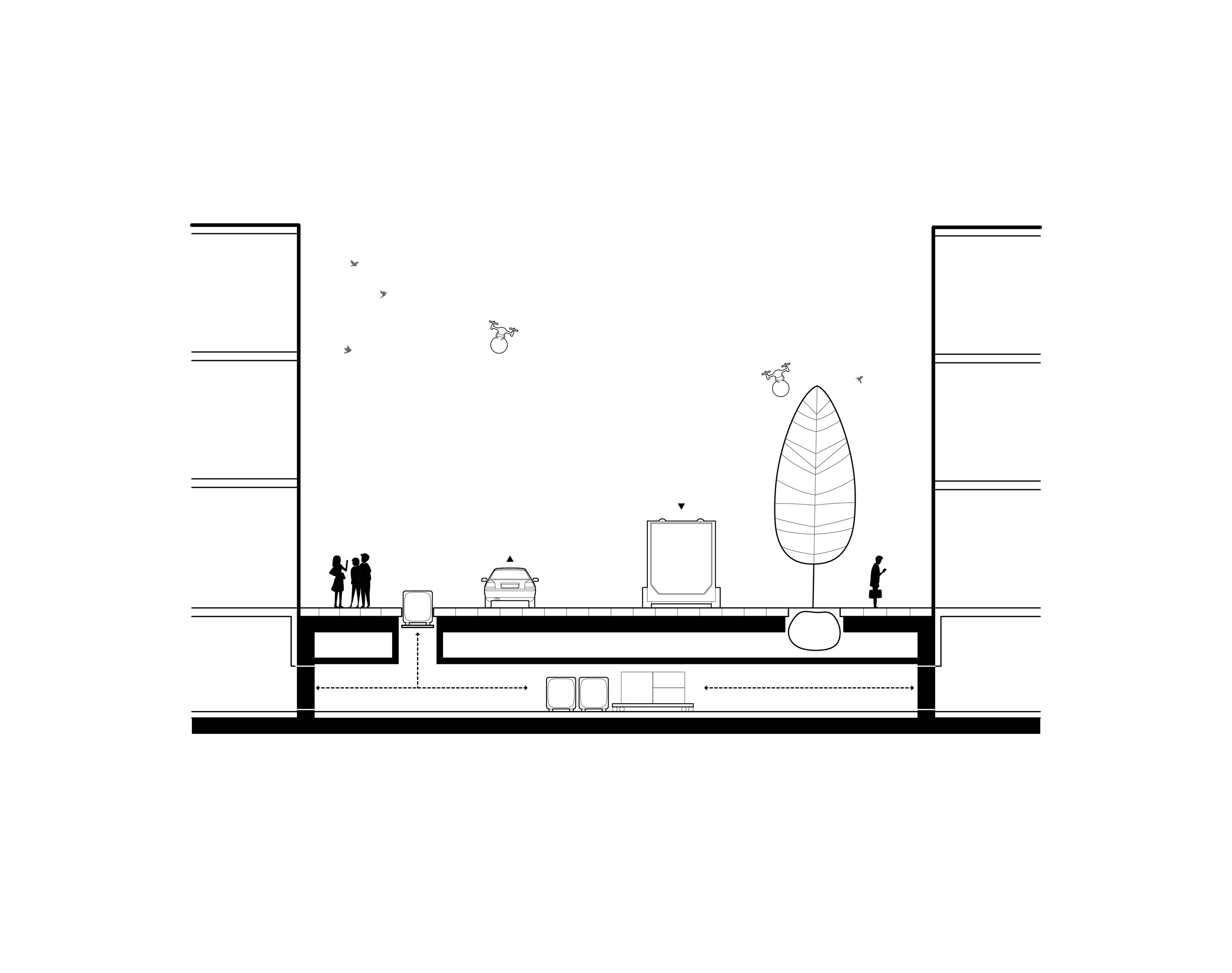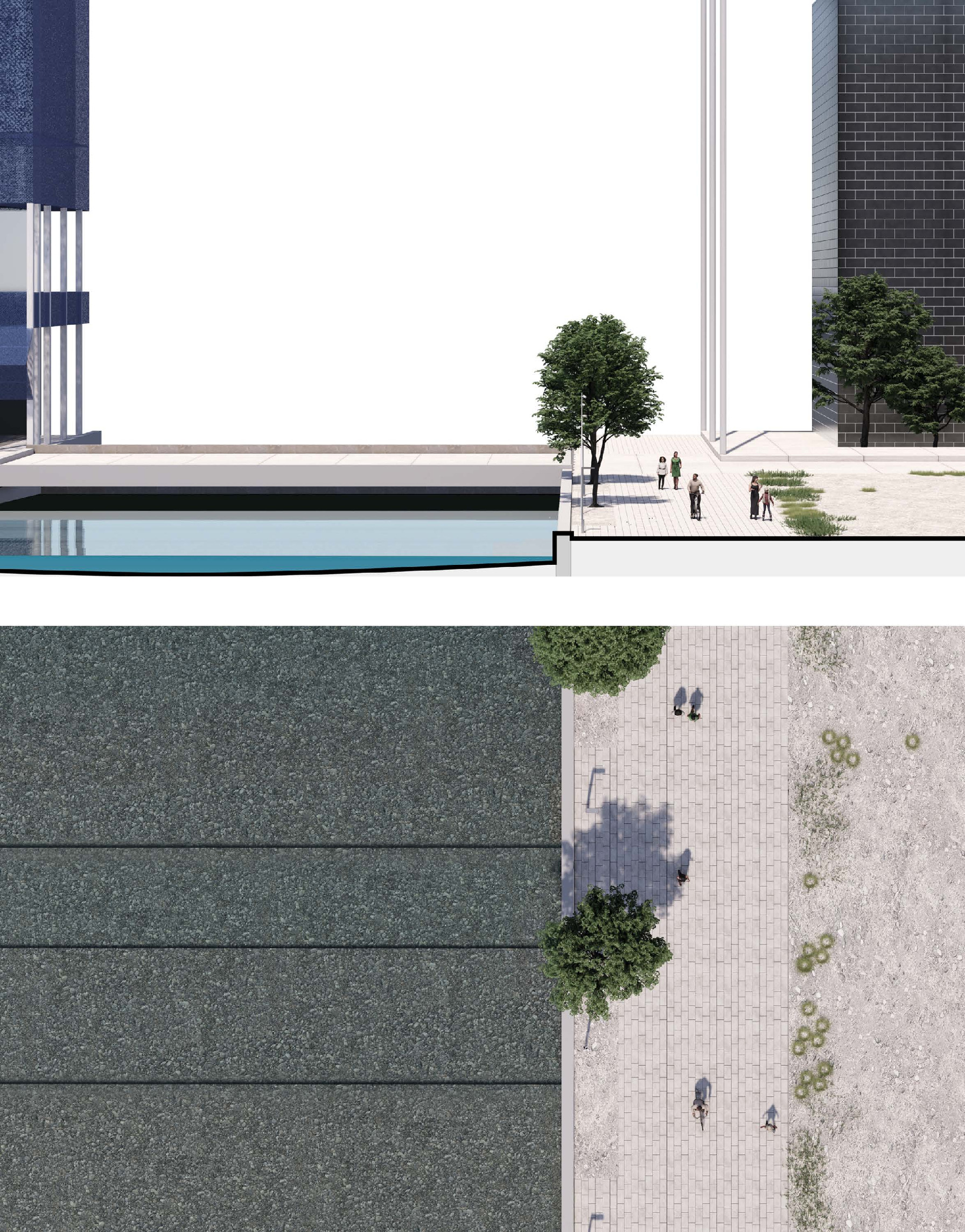The recreational promenade is occupied by micro-mobility types such as bicycles, scooters, and other modes of personal transport, including Toyota’s i-Walk. The shared street allows residents to freely meander at a reduced speed with increasing amount of nature and space.
