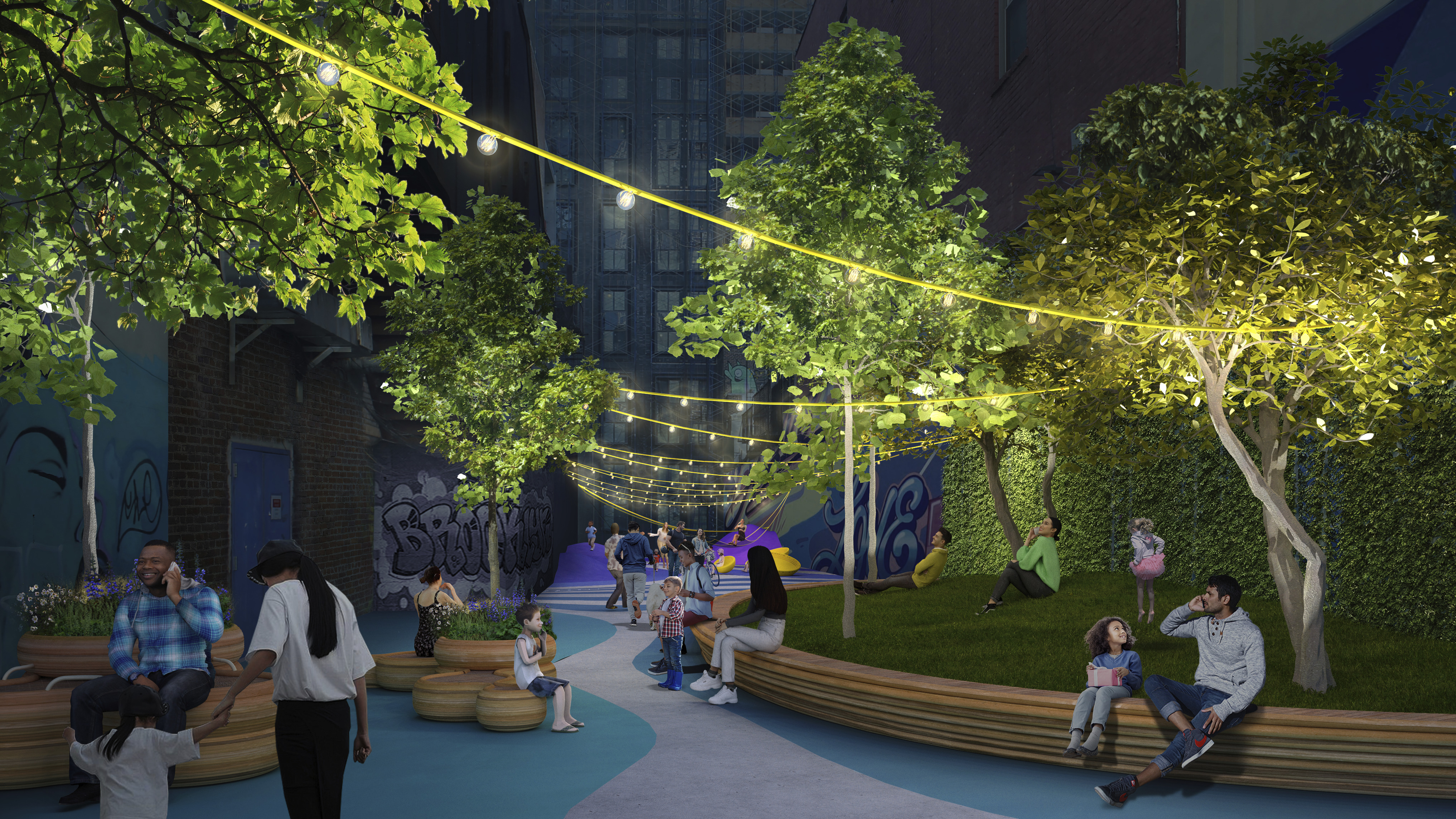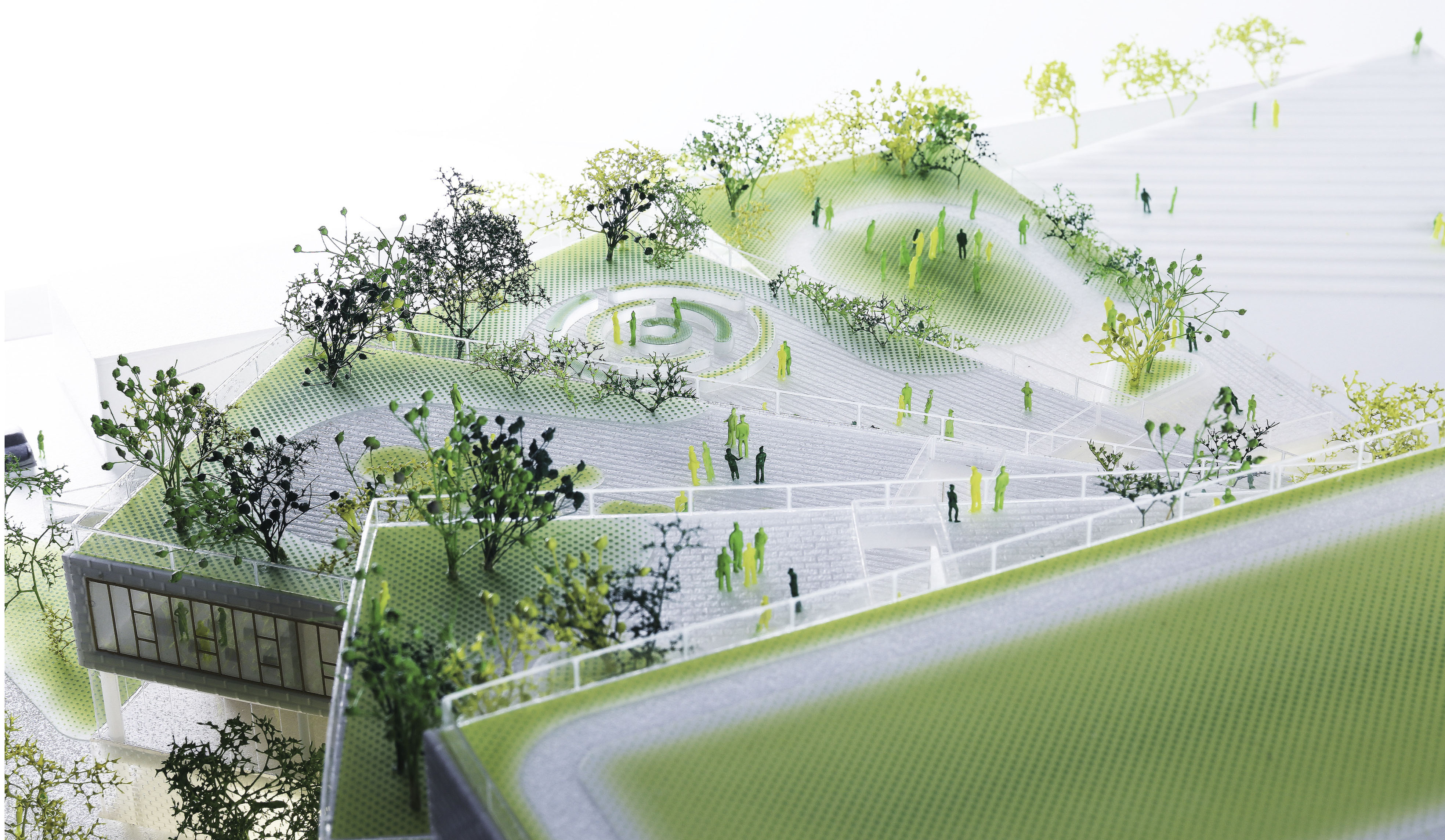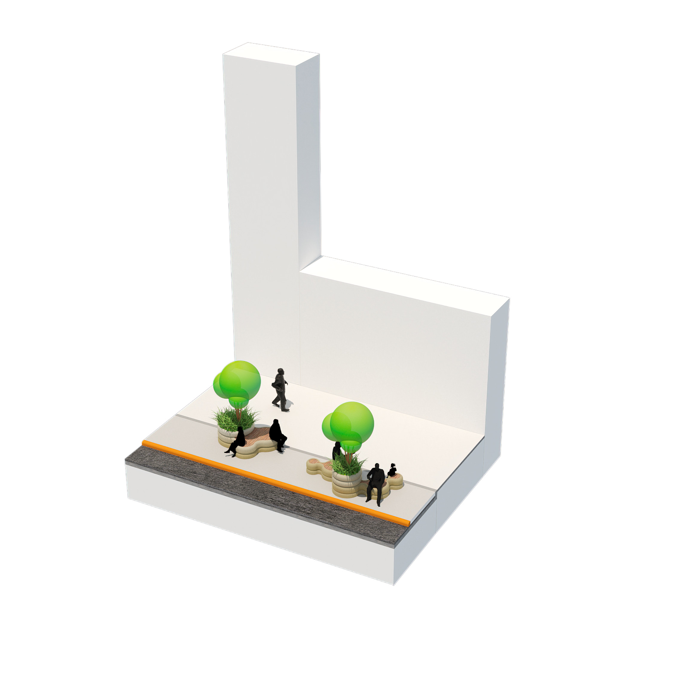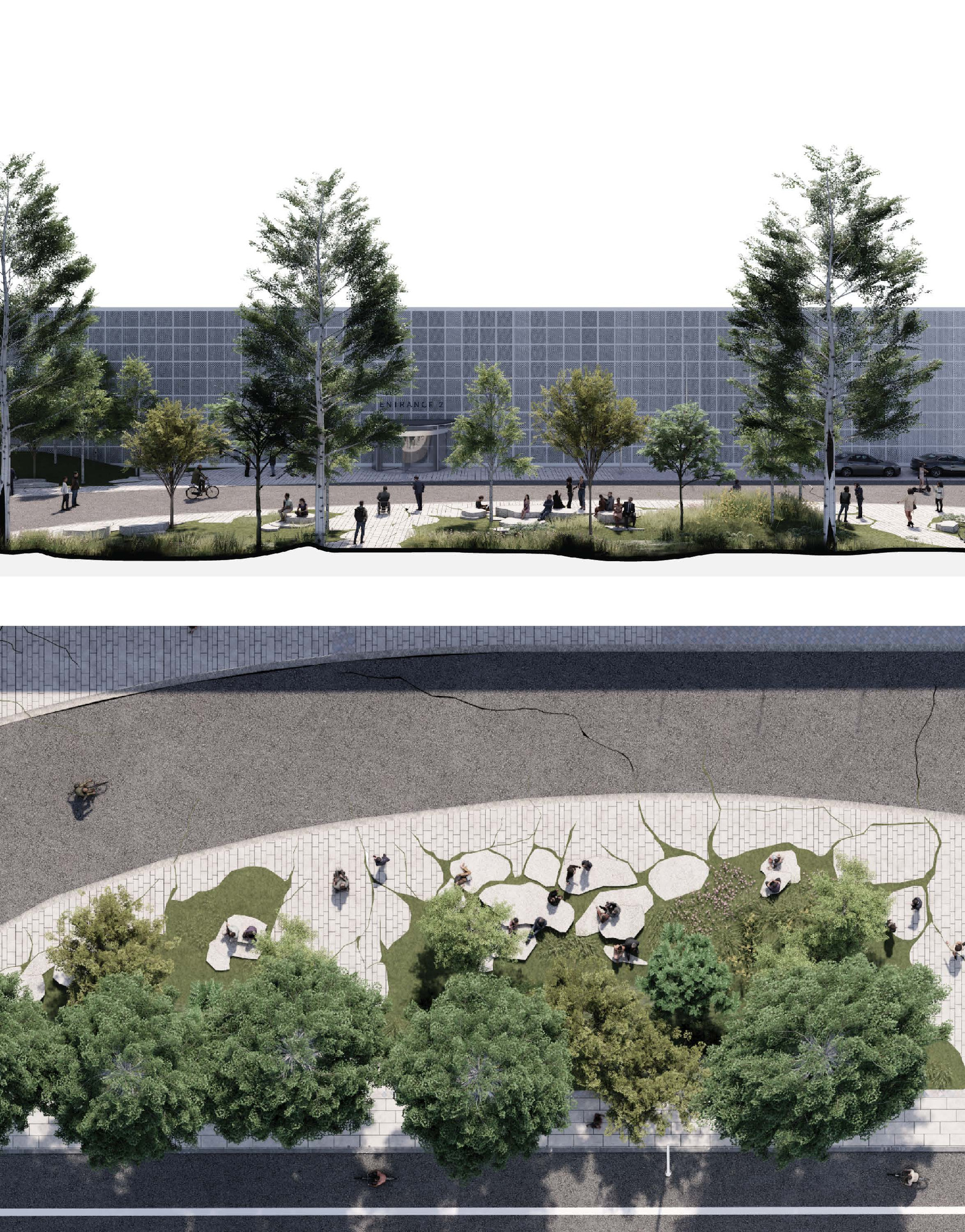 The recreational promenade is occupied by micro-mobility types such as bicycles, scooters, and other modes of personal transport, including Toyota’s i-Walk. The shared street allows residents to freely meander at a reduced speed with increasing amount of nature and space.