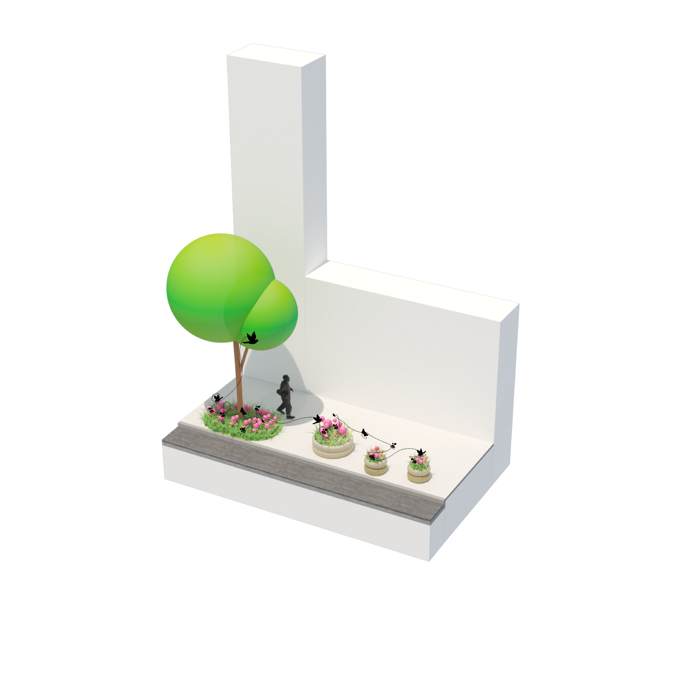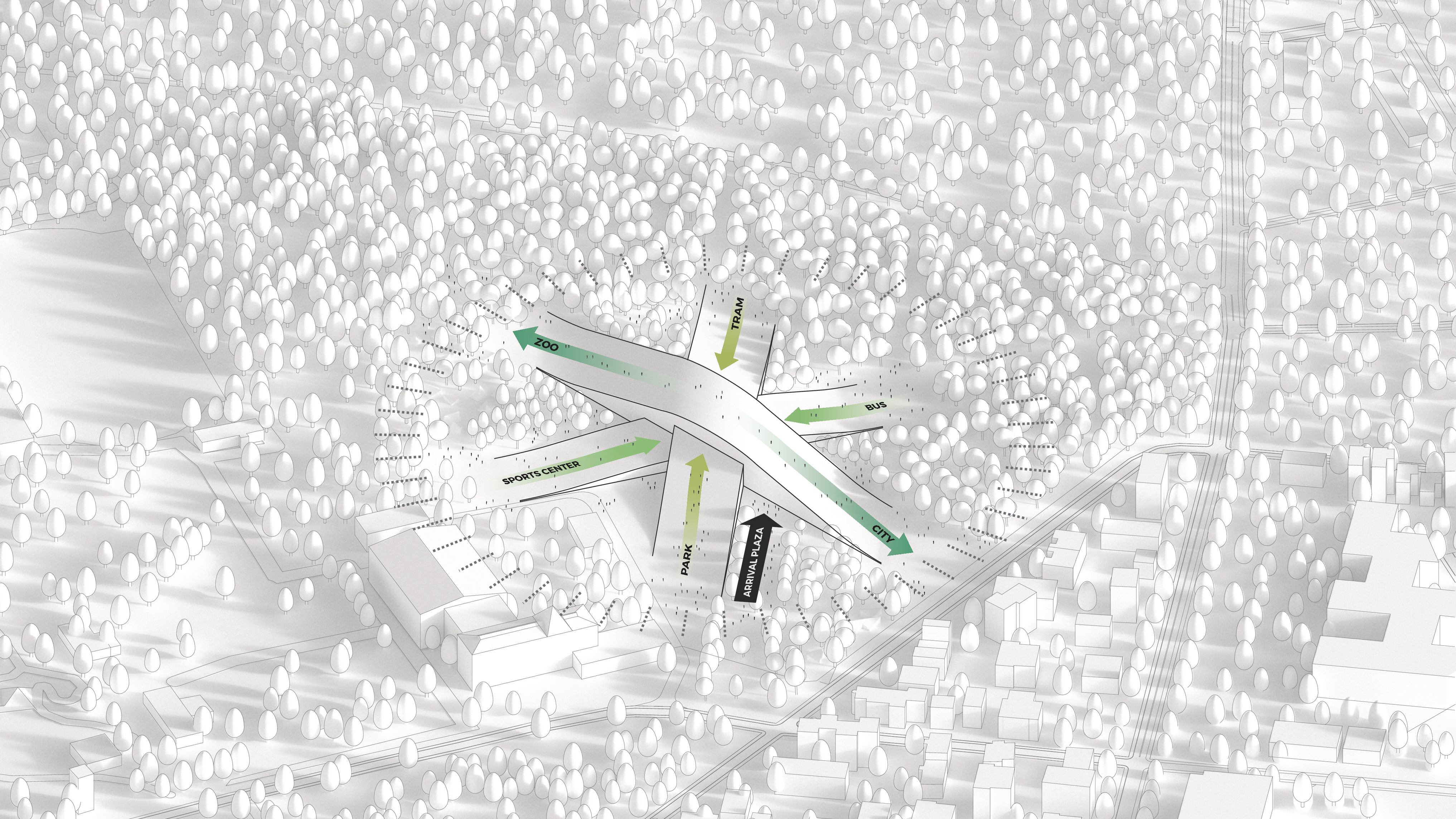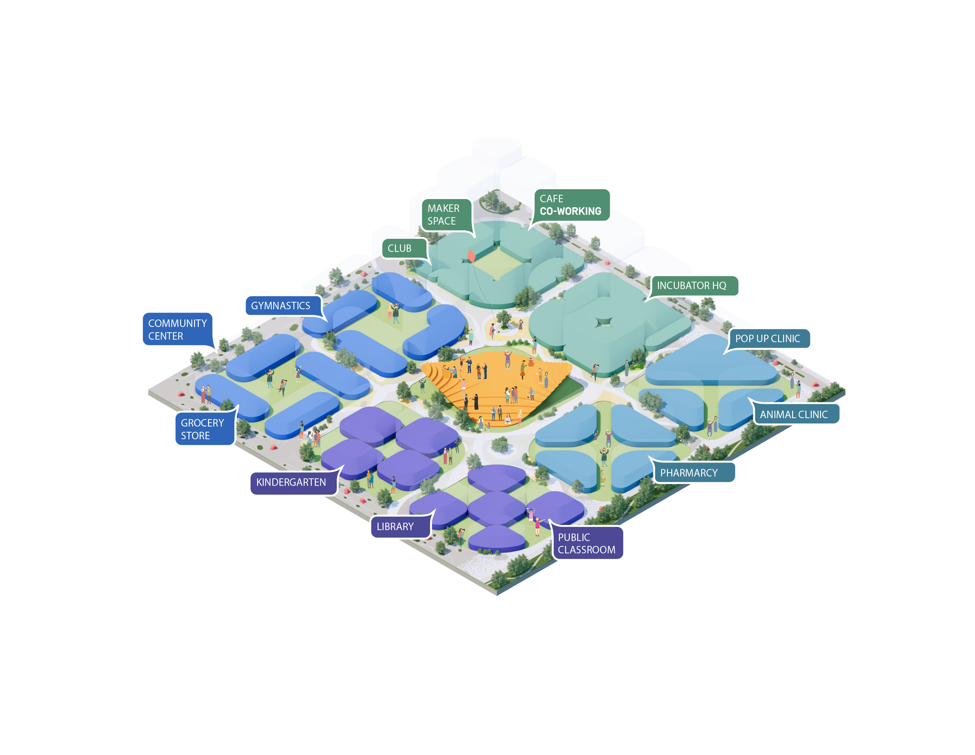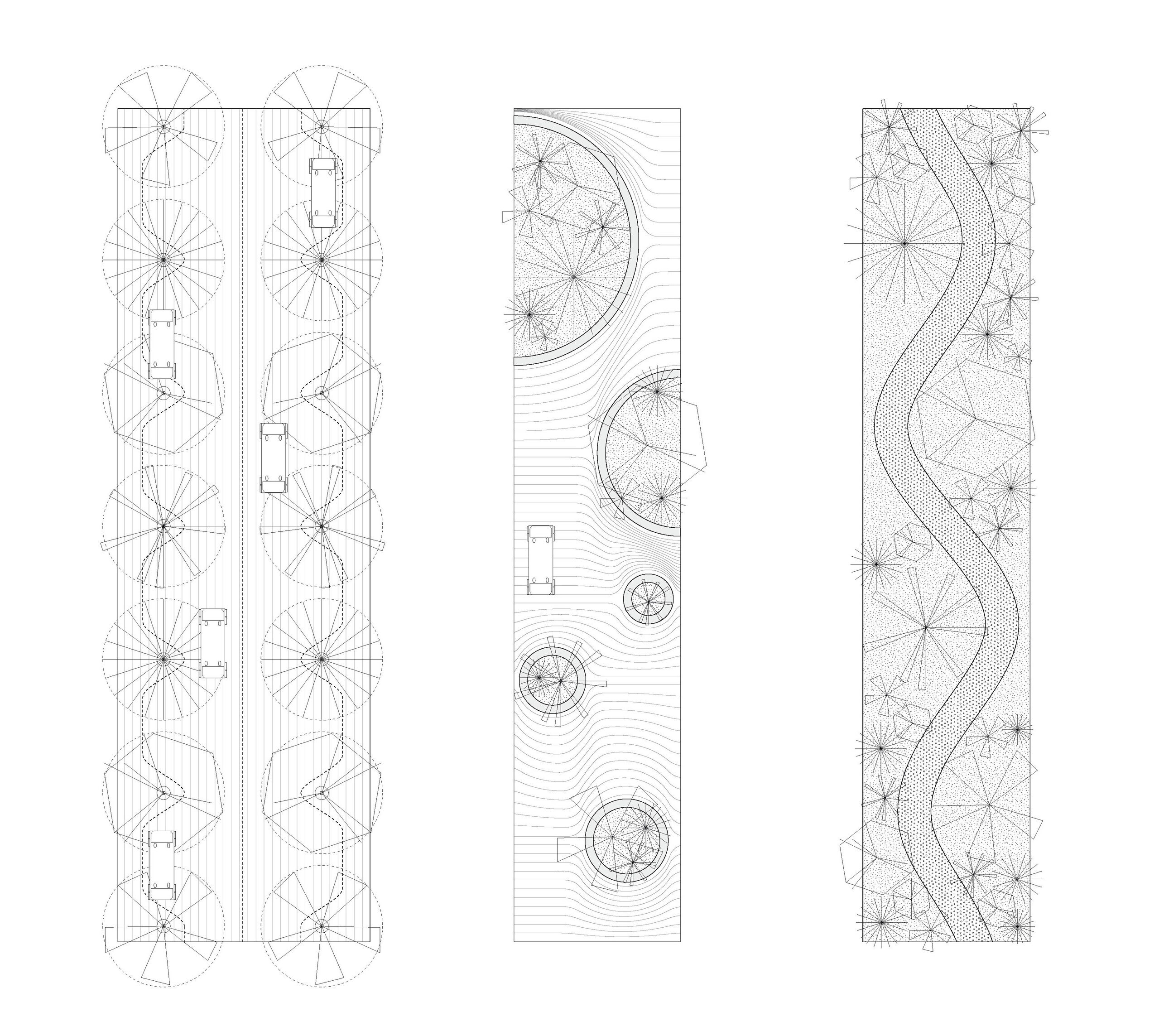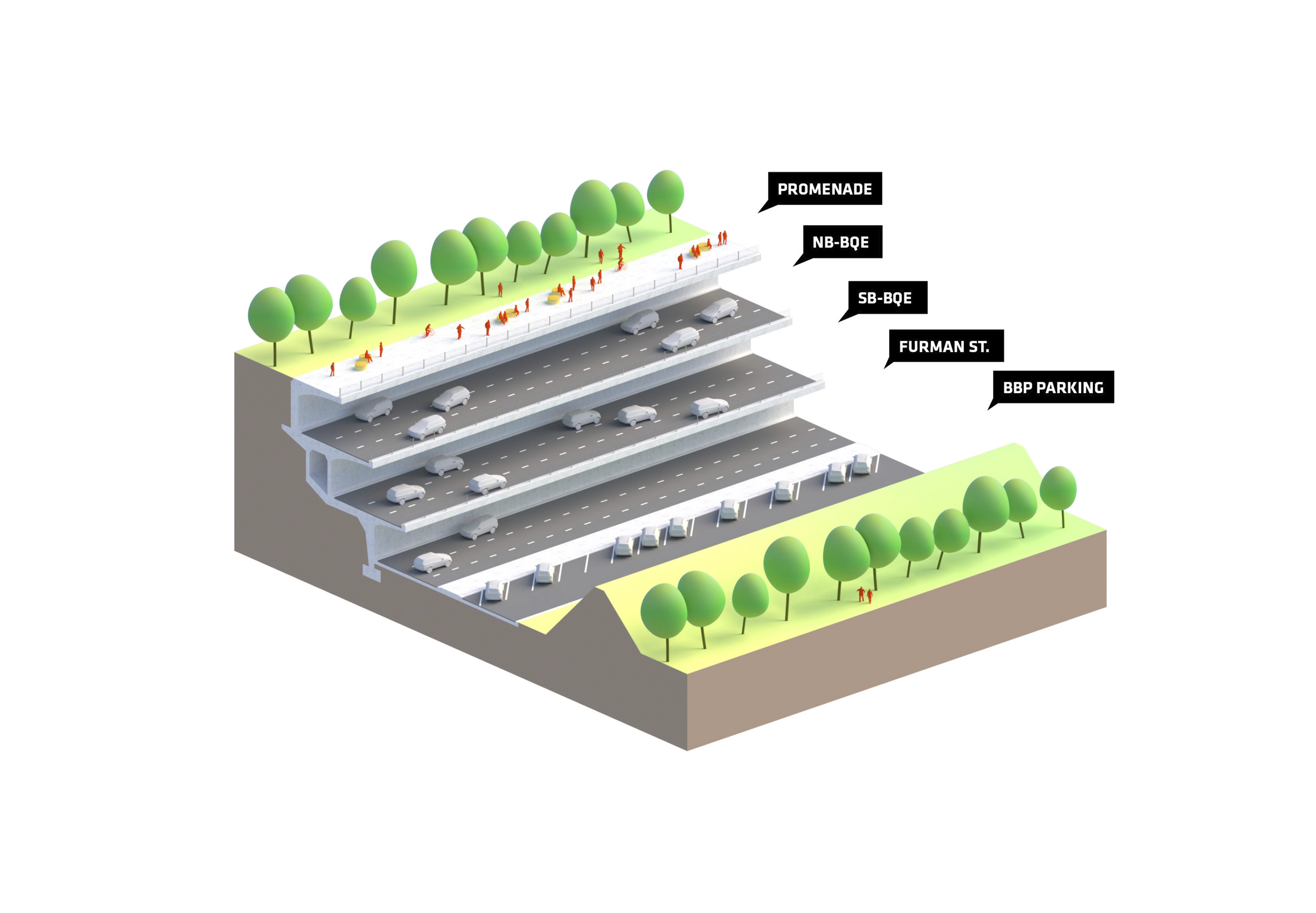 The recreational promenade is occupied by micro-mobility types such as bicycles, scooters, and other modes of personal transport, including Toyota’s i-Walk. The shared street allows residents to freely meander at a reduced speed with increasing amount of nature and space.