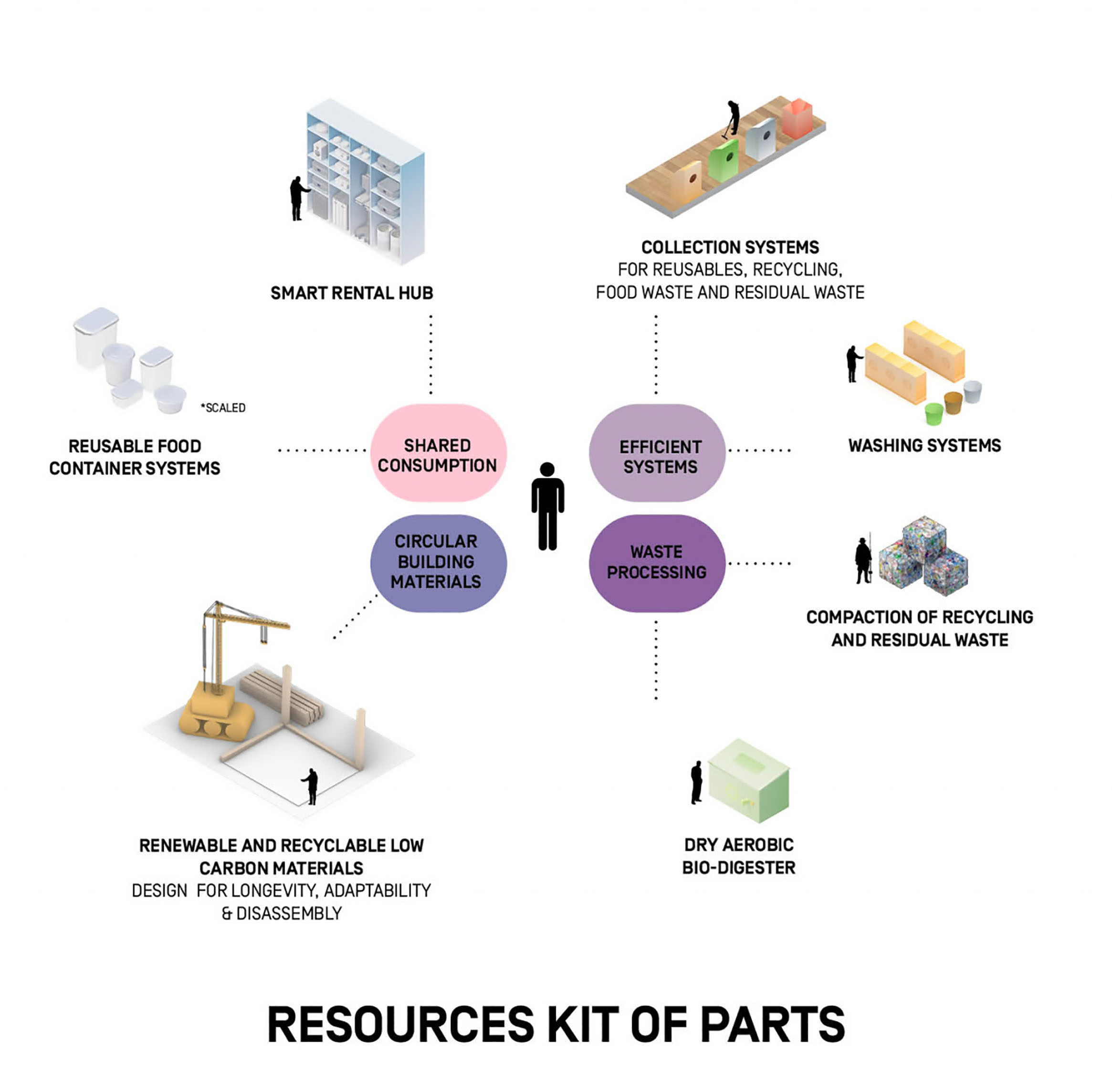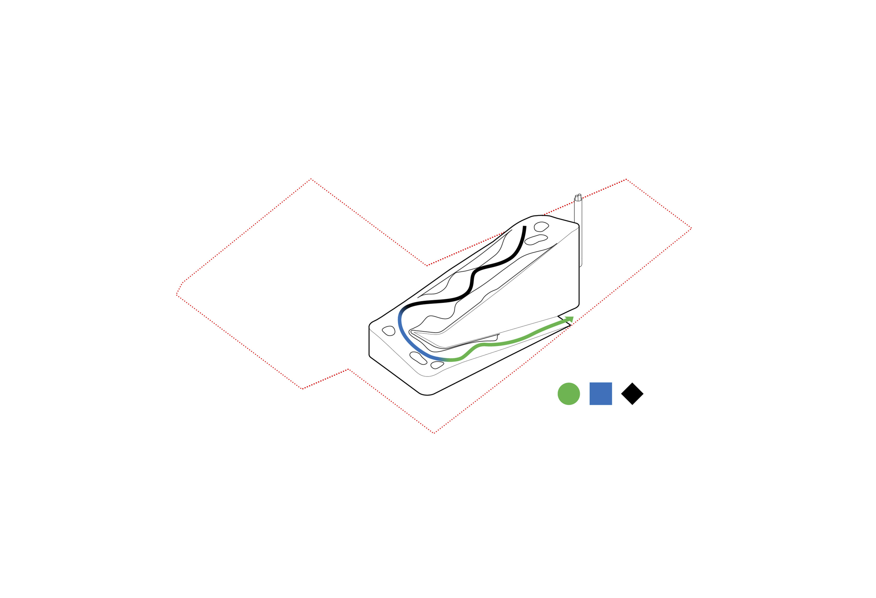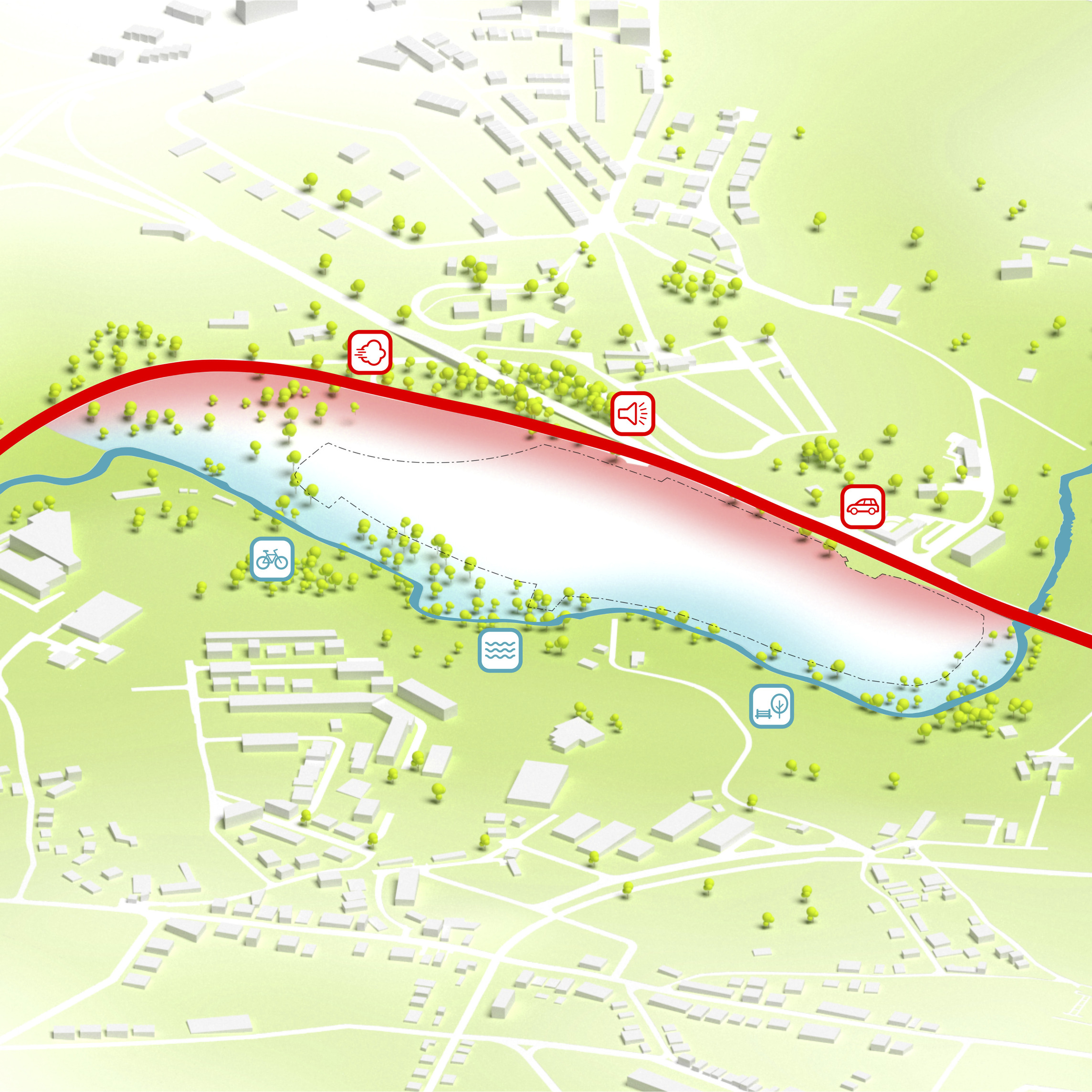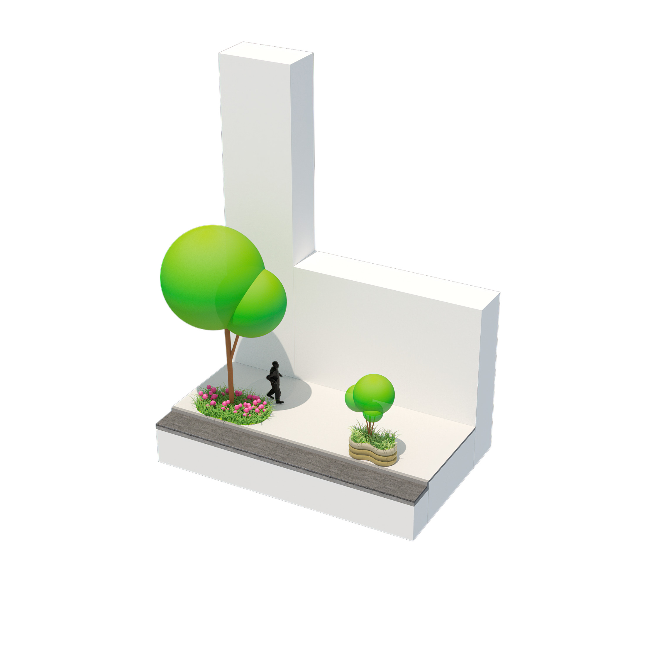 The recreational promenade is occupied by micro-mobility types such as bicycles, scooters, and other modes of personal transport, including Toyota’s i-Walk. The shared street allows residents to freely meander at a reduced speed with increasing amount of nature and space.