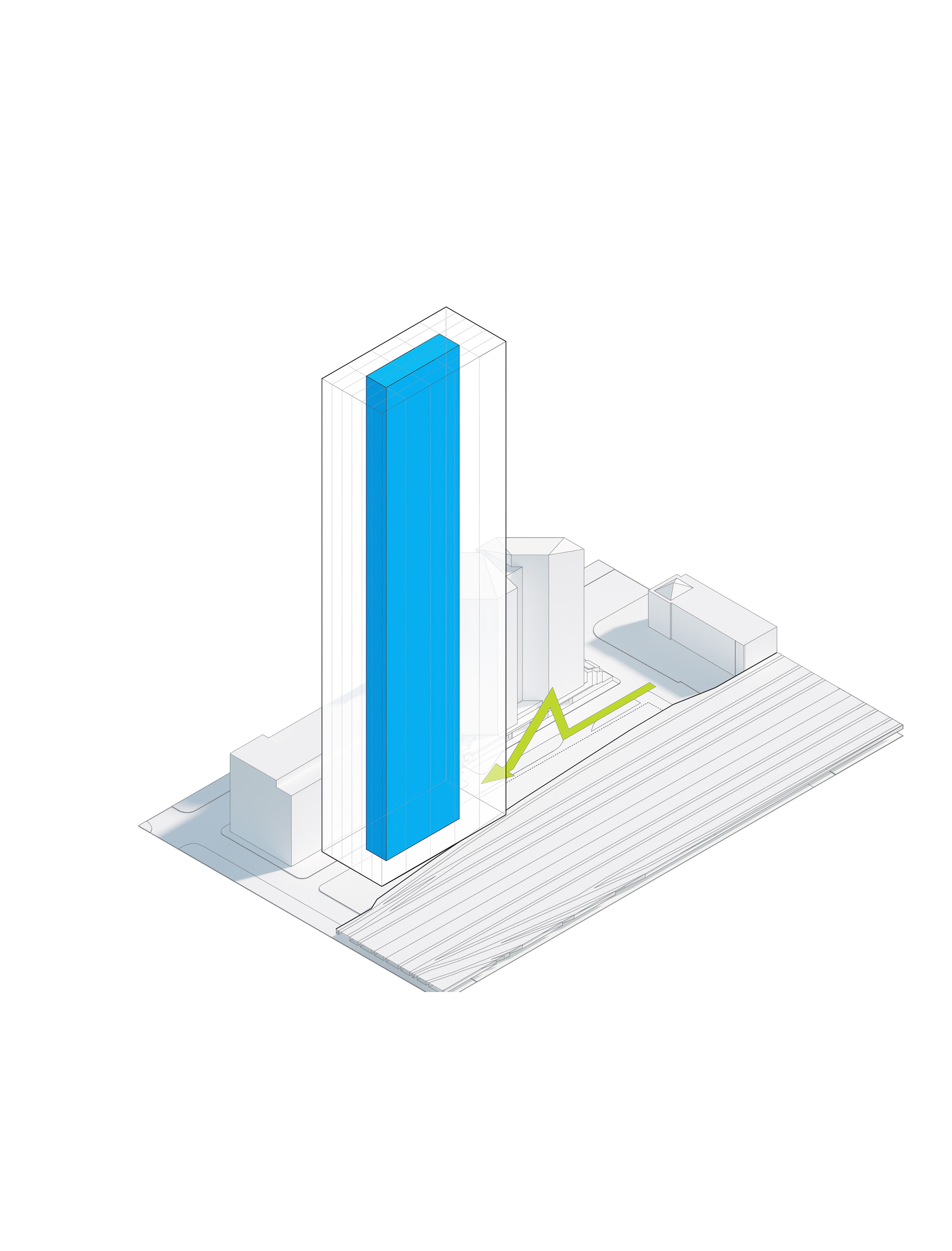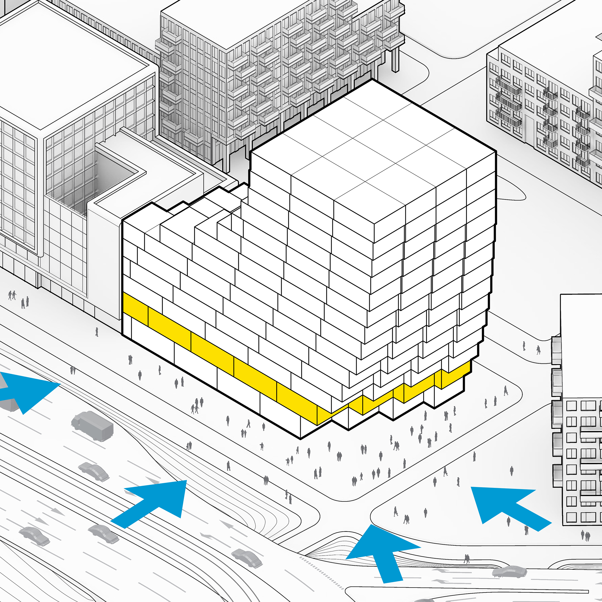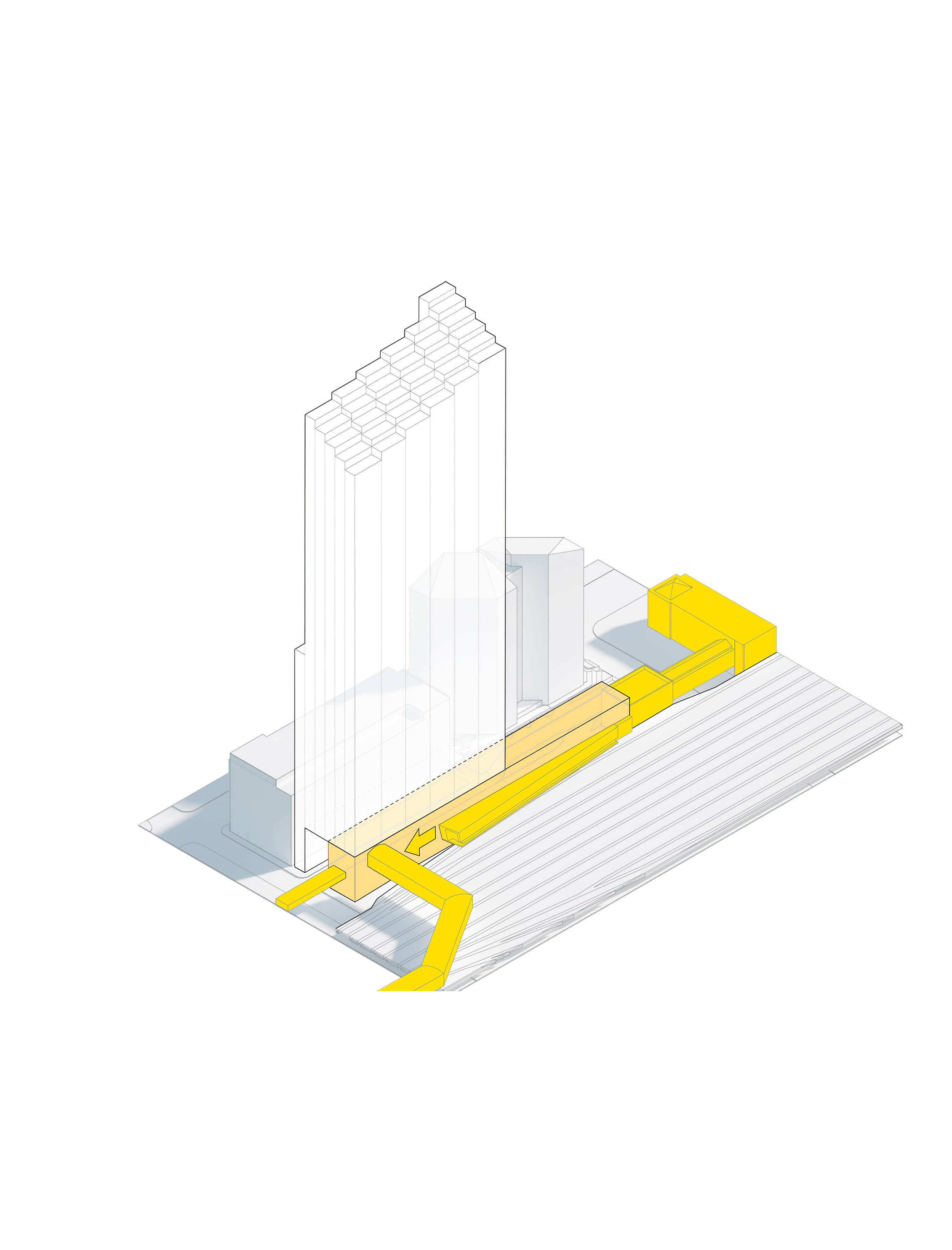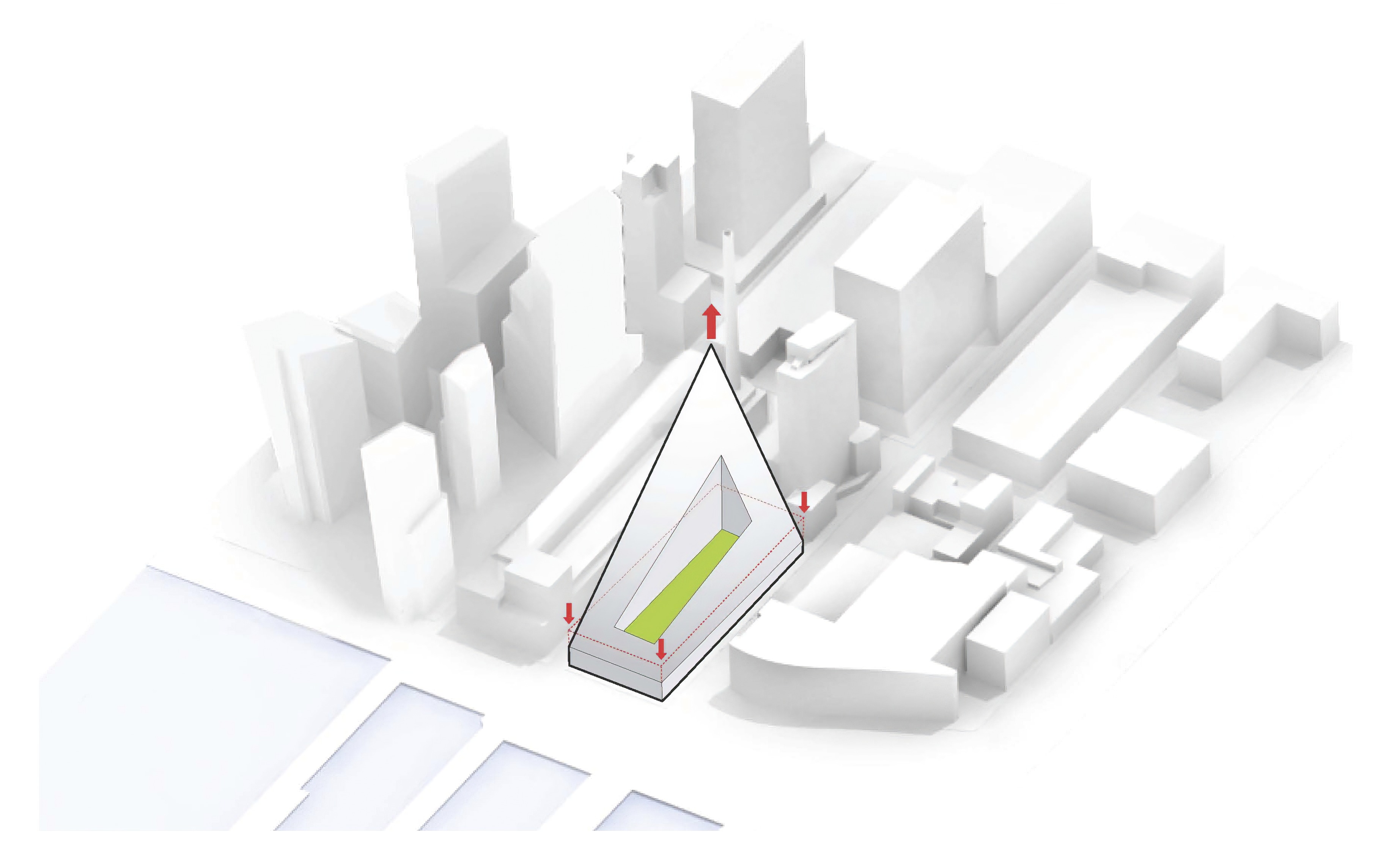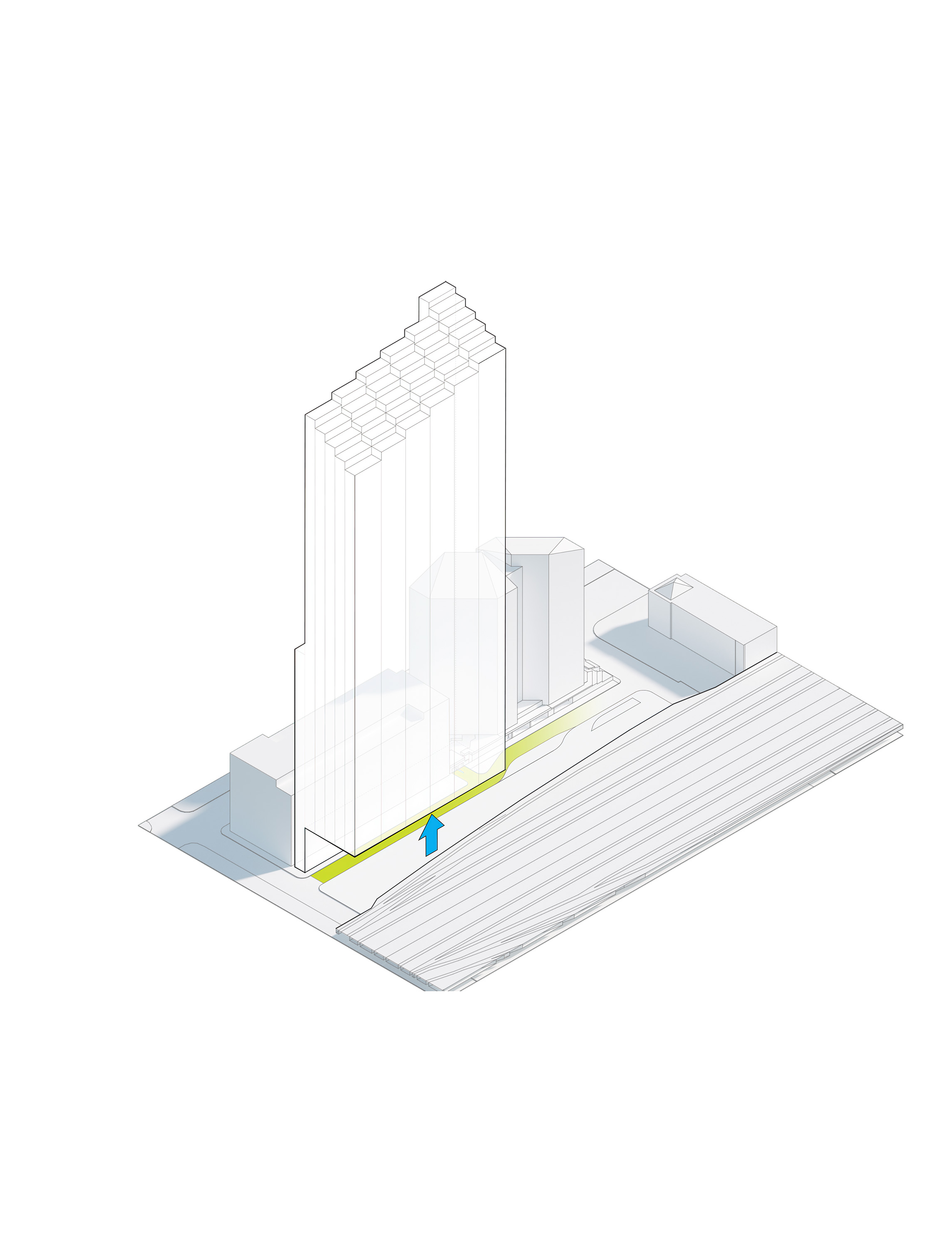 The building footprint results from expanding the public realm, significantly increasing public park space while minimizing the building area at the ground level. Framing the new park are public facing programs – a new 47,000 sq ft YMCA; 30,000 sq ft of neighborhood-oriented retail space; and 4,500 sq ft of community occupied kiosks.