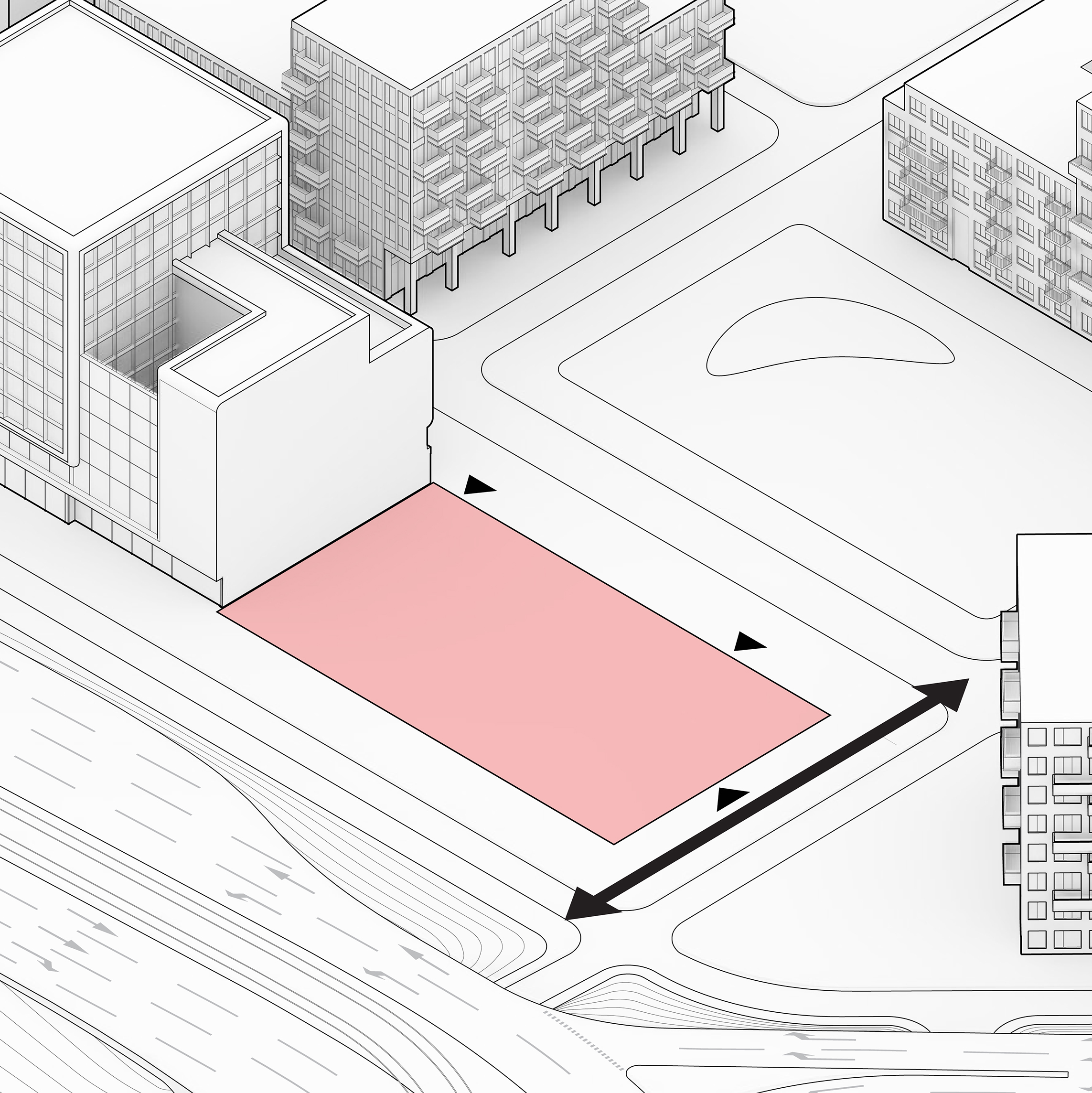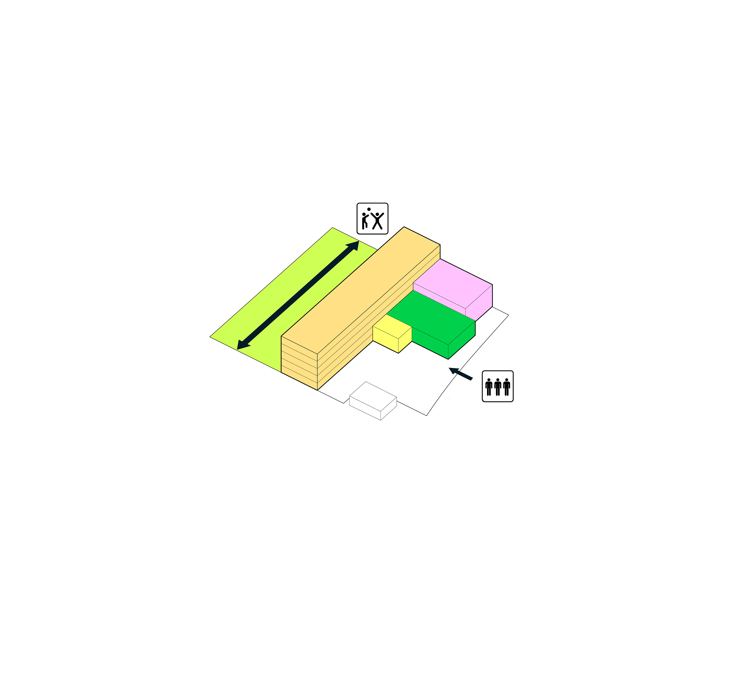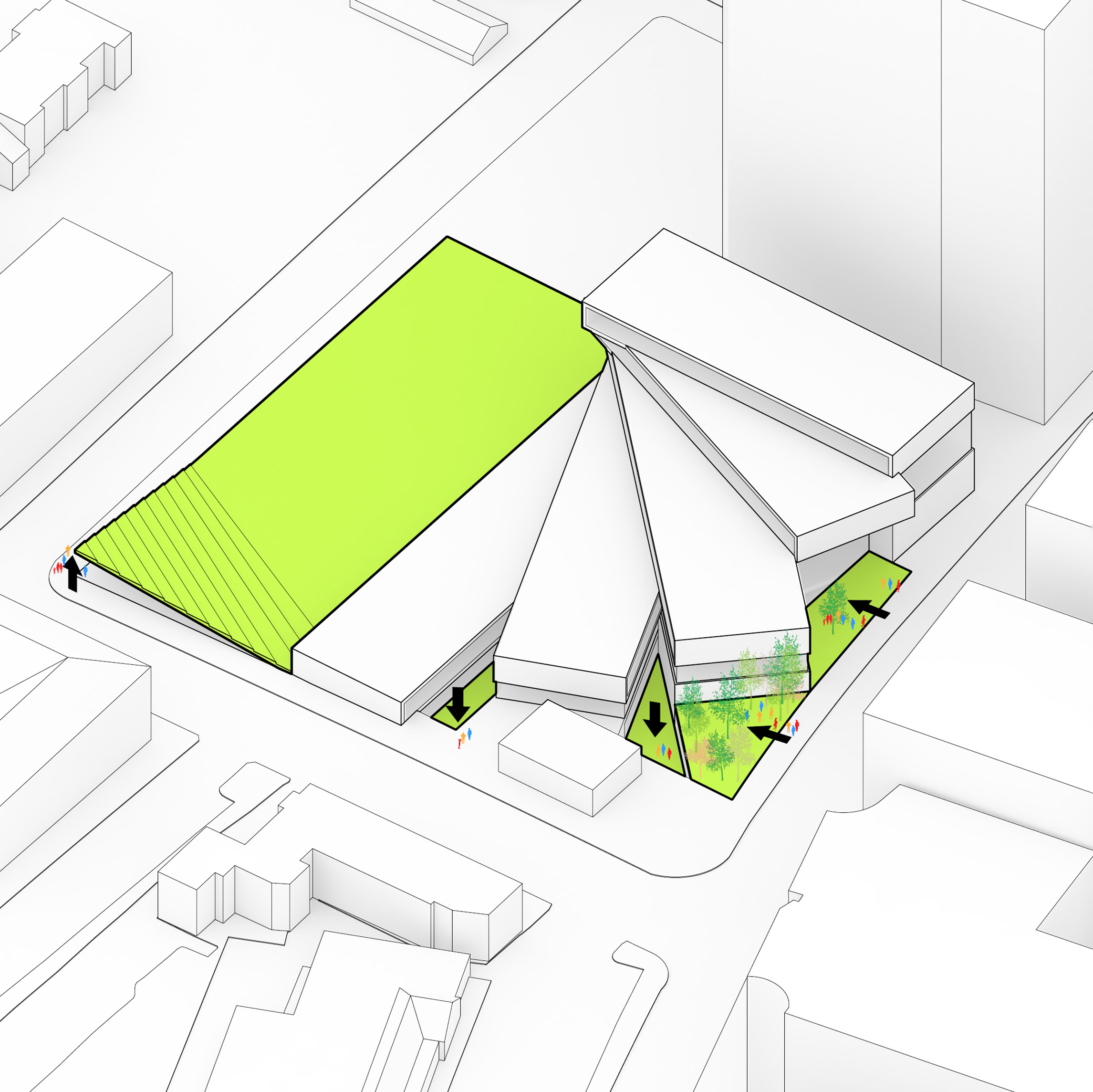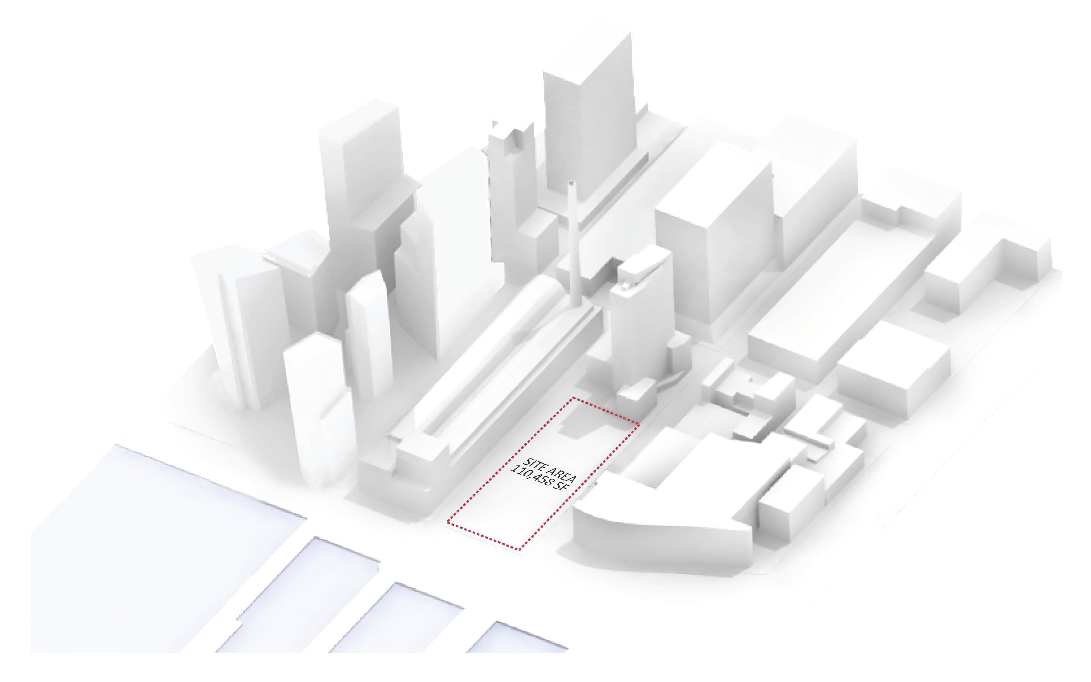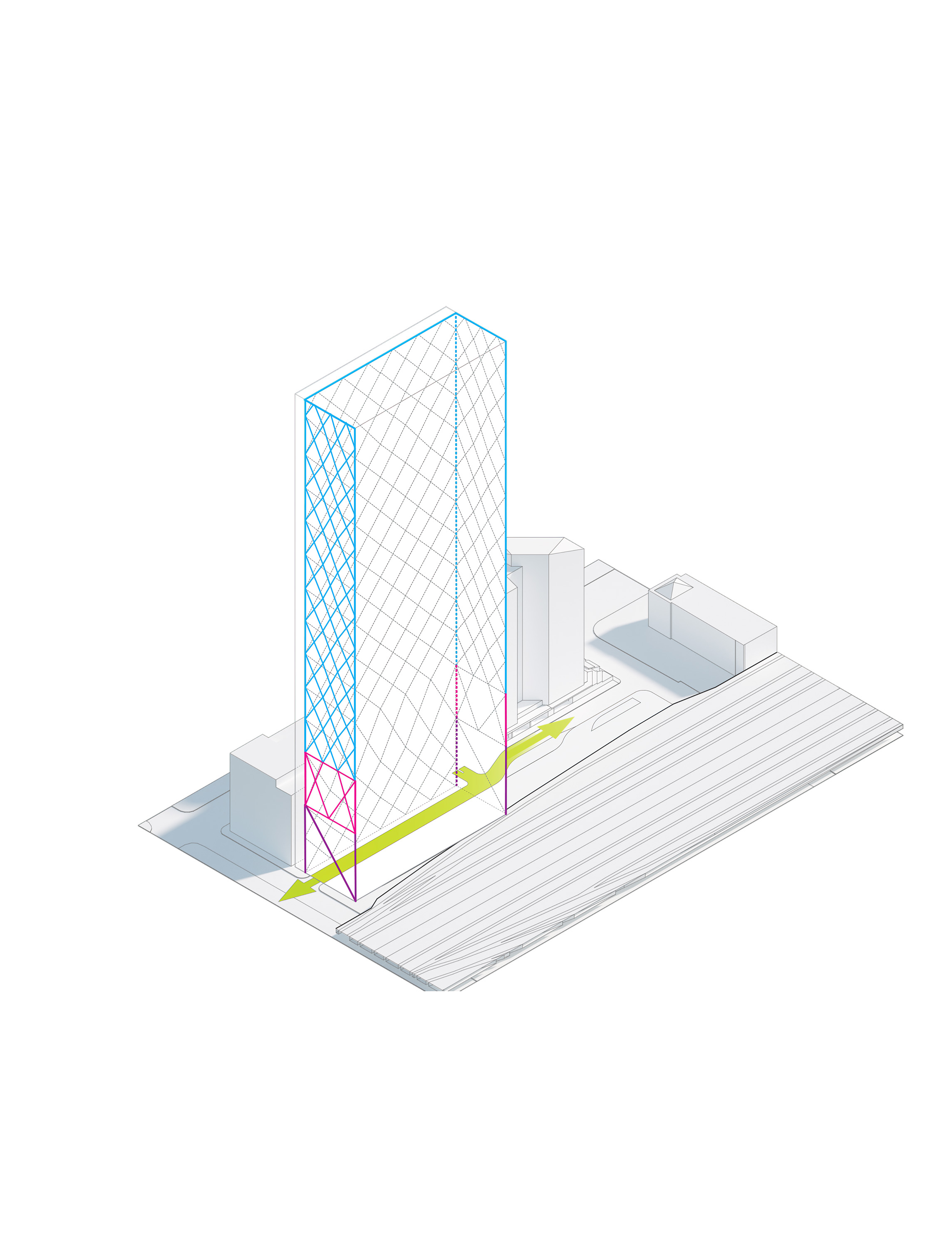 The building footprint results from expanding the public realm, significantly increasing public park space while minimizing the building area at the ground level. Framing the new park are public facing programs – a new 47,000 sq ft YMCA; 30,000 sq ft of neighborhood-oriented retail space; and 4,500 sq ft of community occupied kiosks.