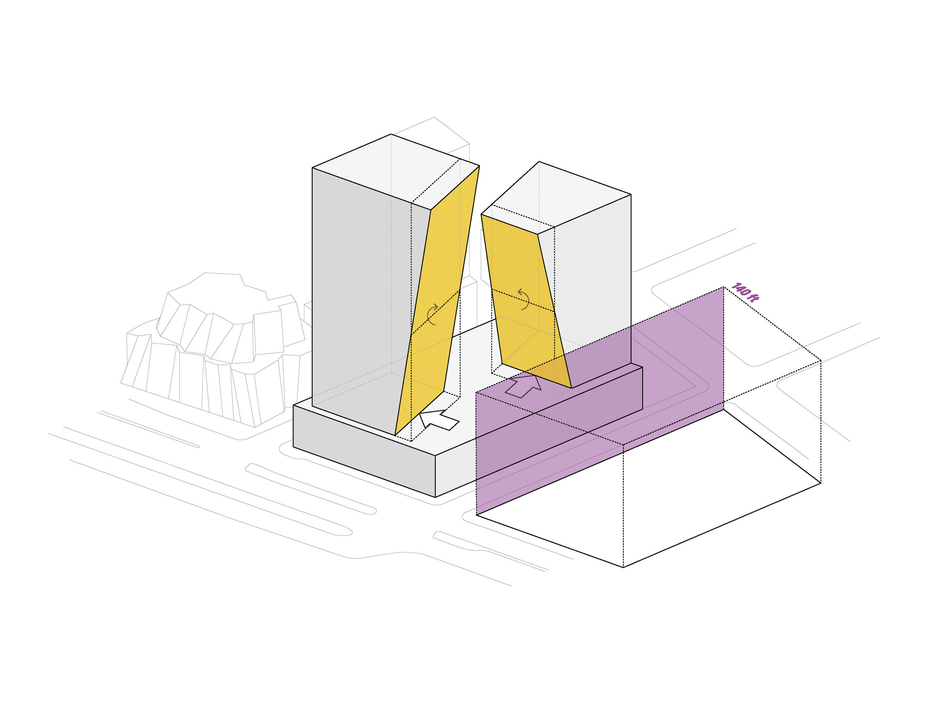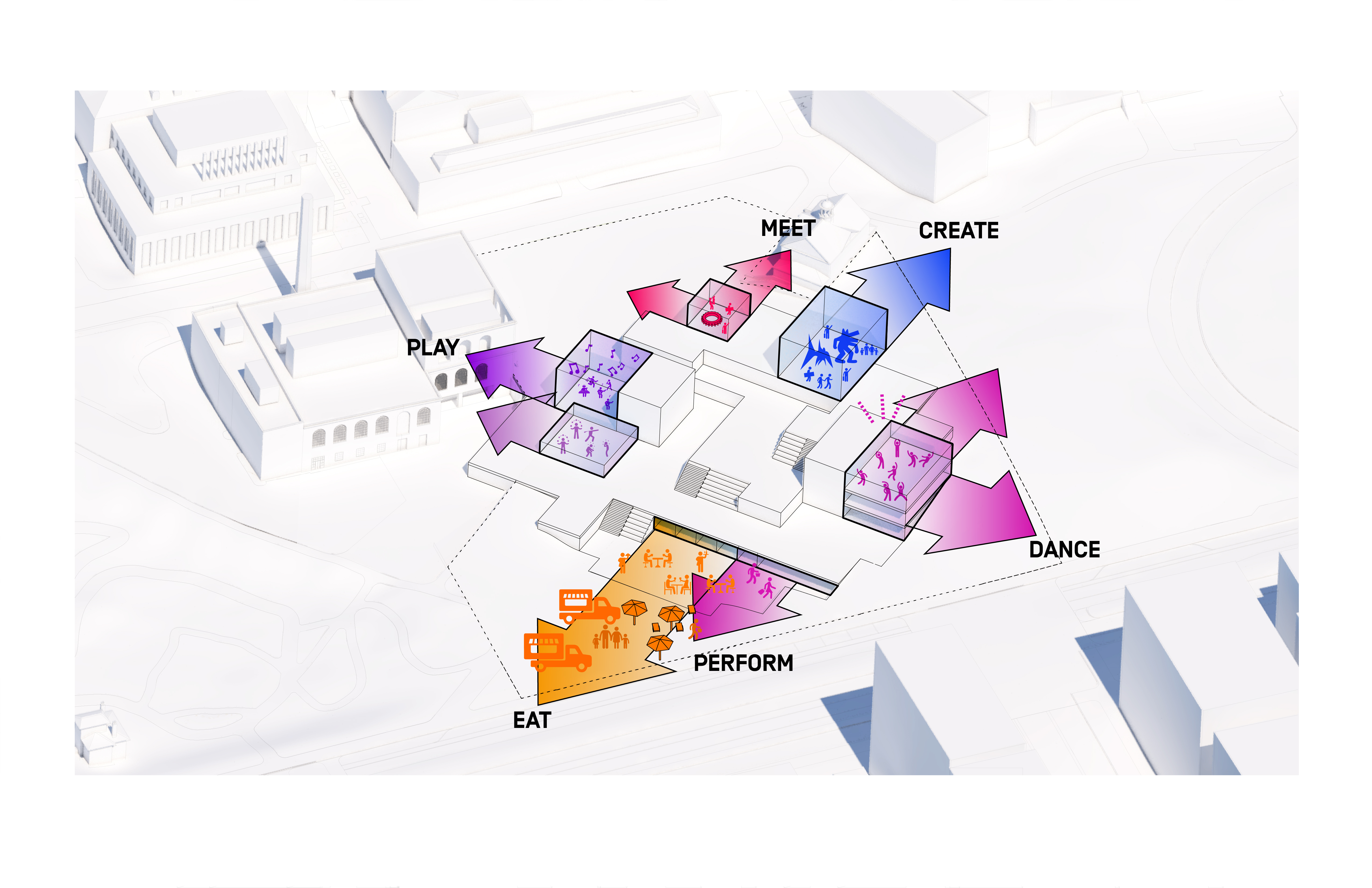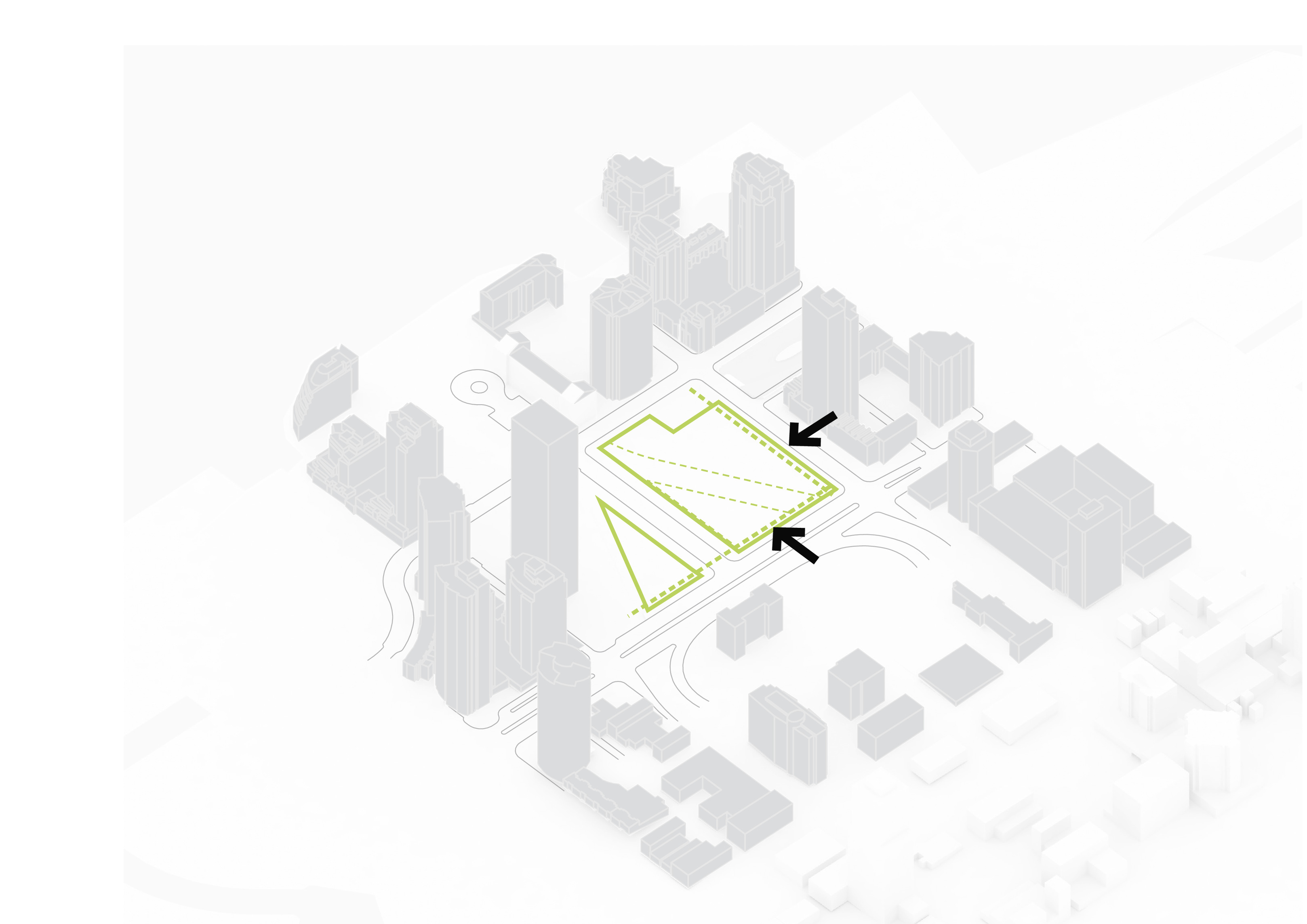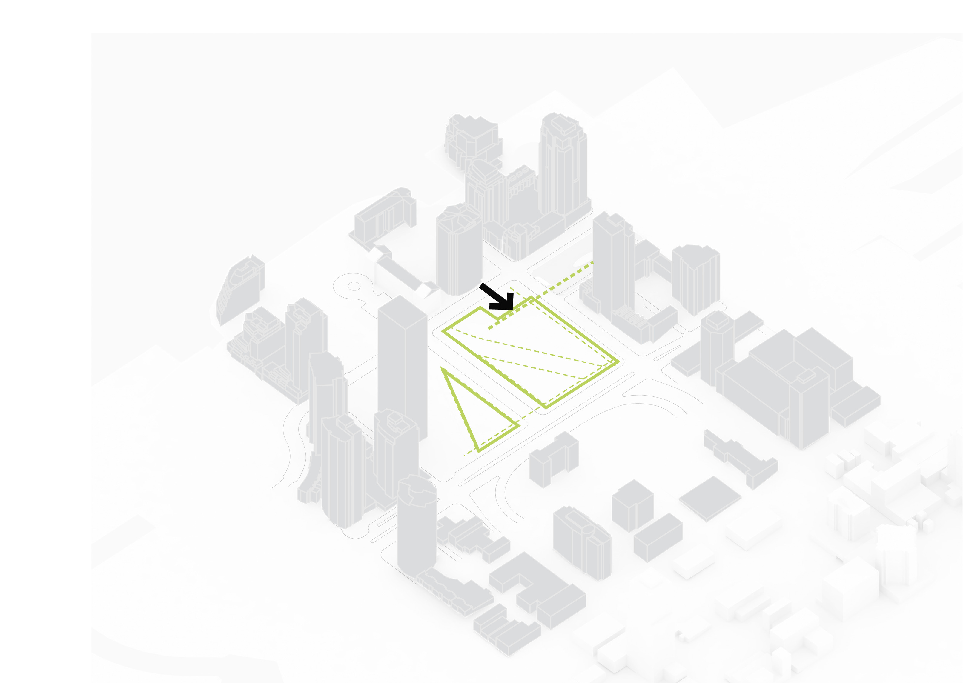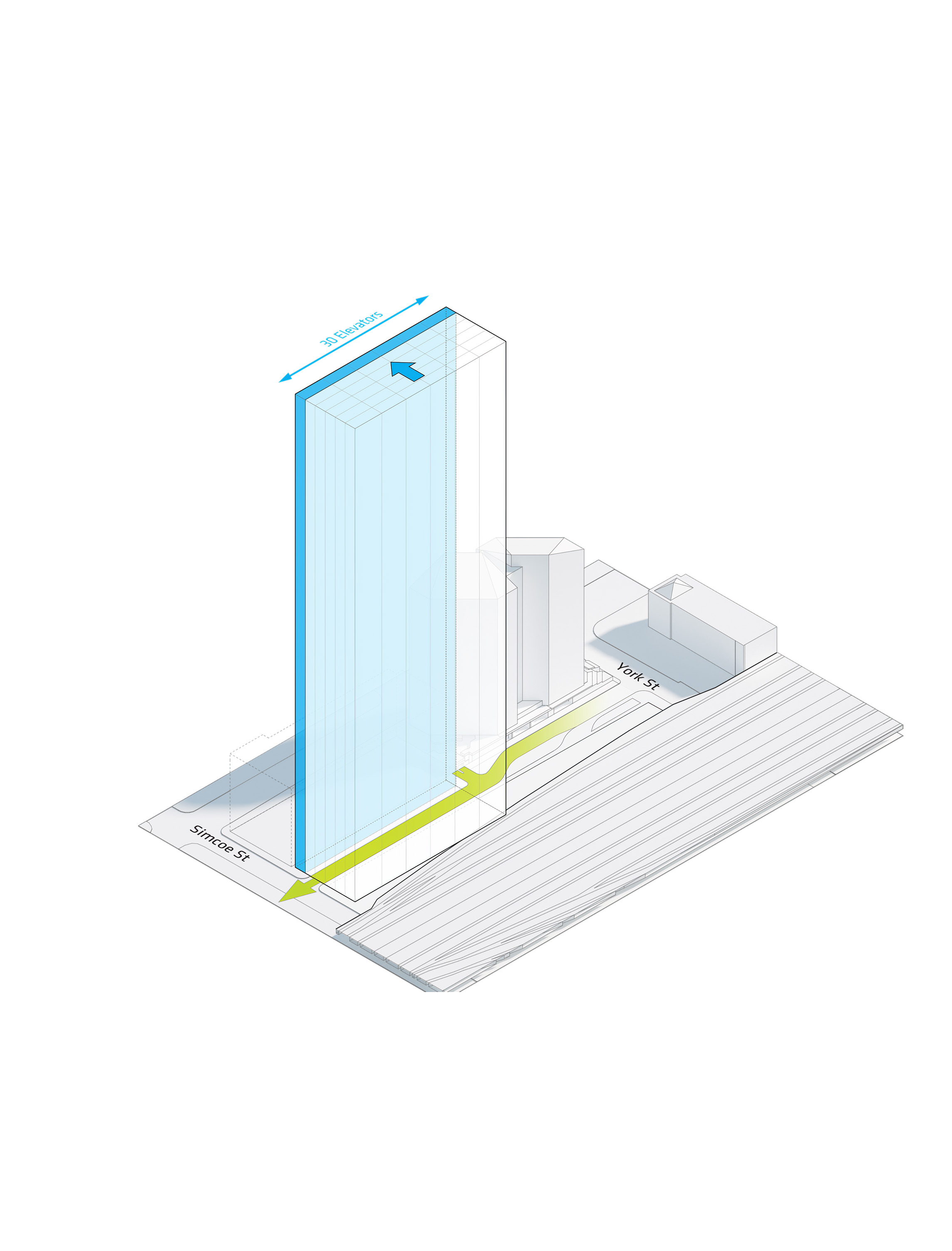 The building footprint results from expanding the public realm, significantly increasing public park space while minimizing the building area at the ground level. Framing the new park are public facing programs – a new 47,000 sq ft YMCA; 30,000 sq ft of neighborhood-oriented retail space; and 4,500 sq ft of community occupied kiosks.