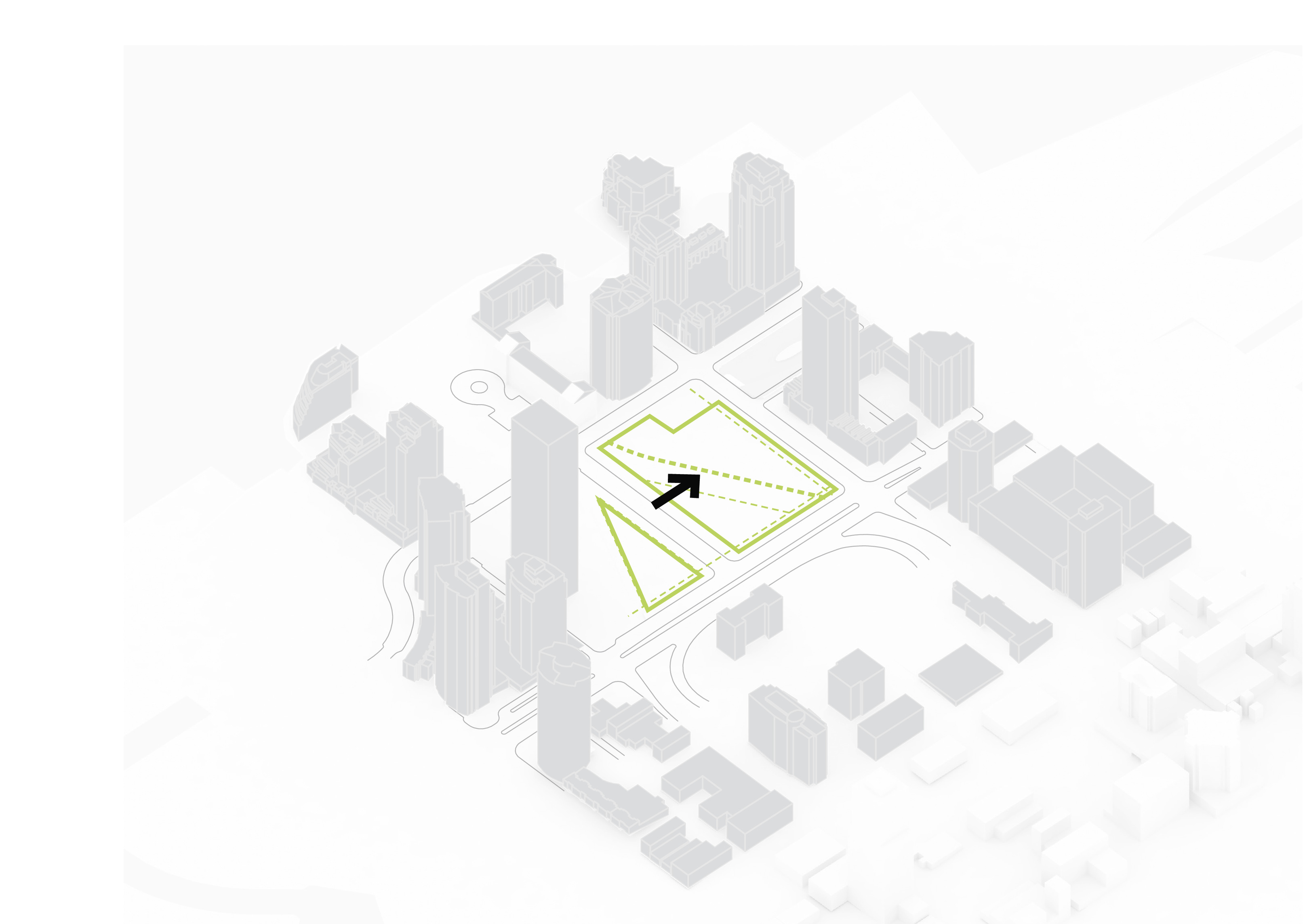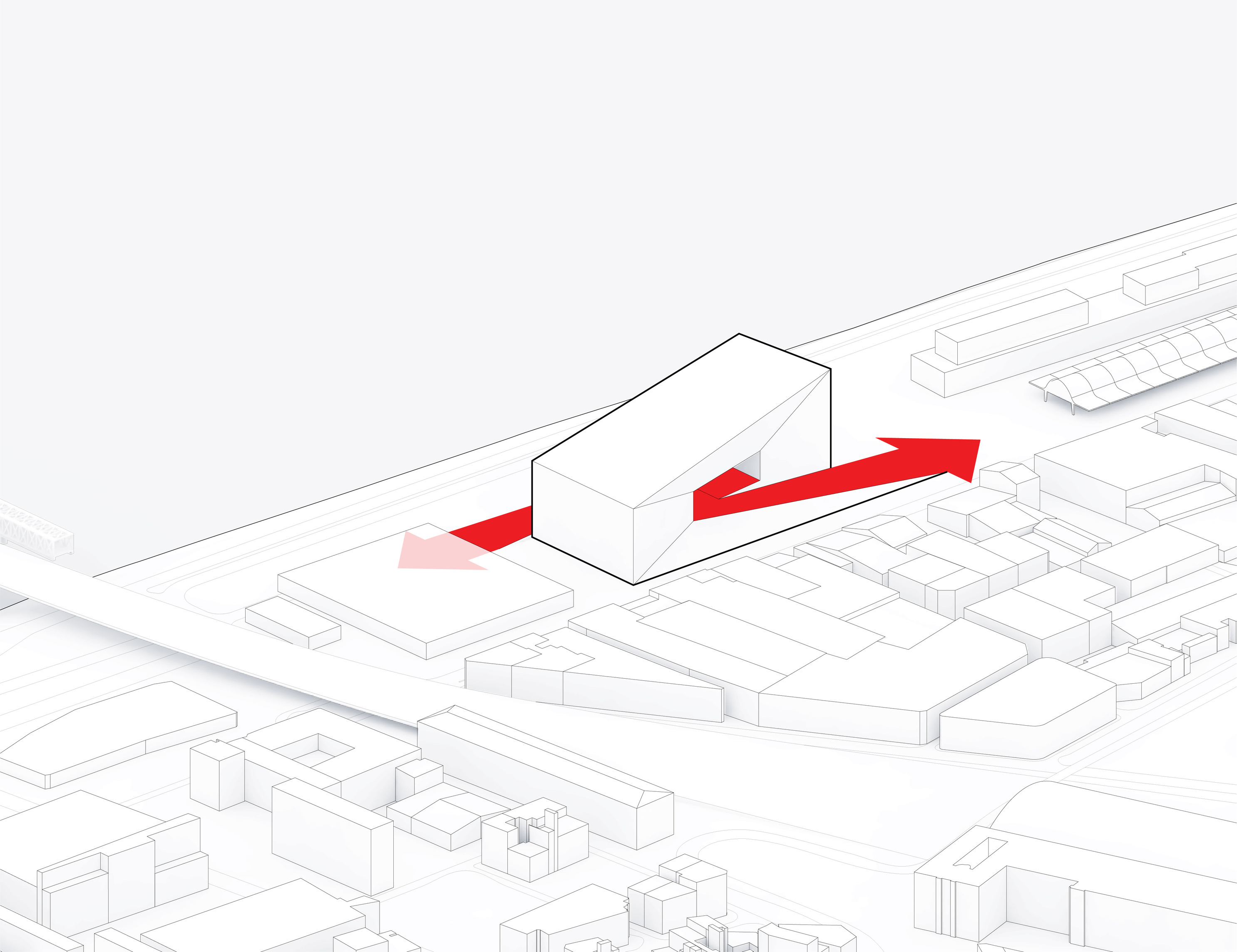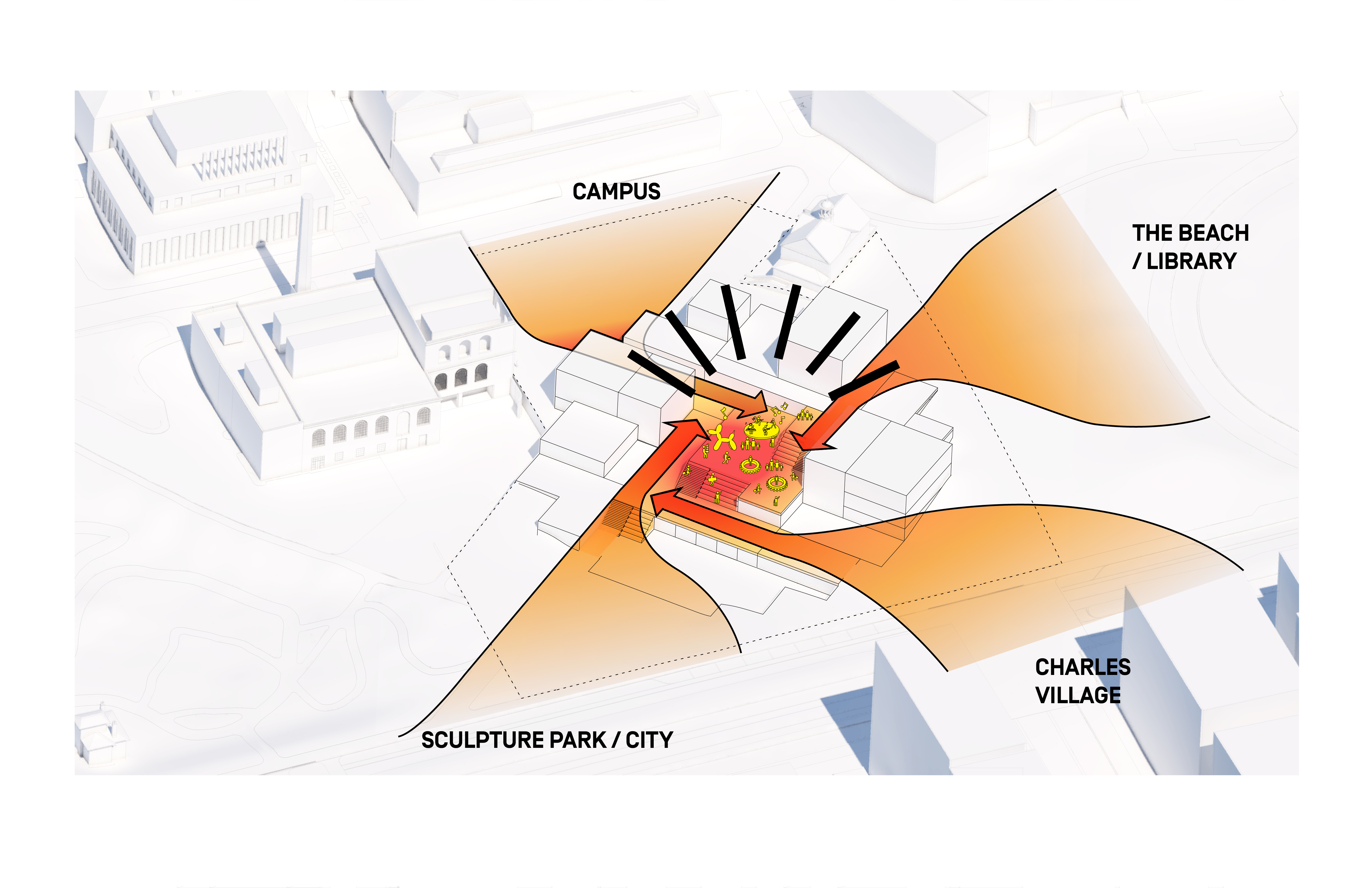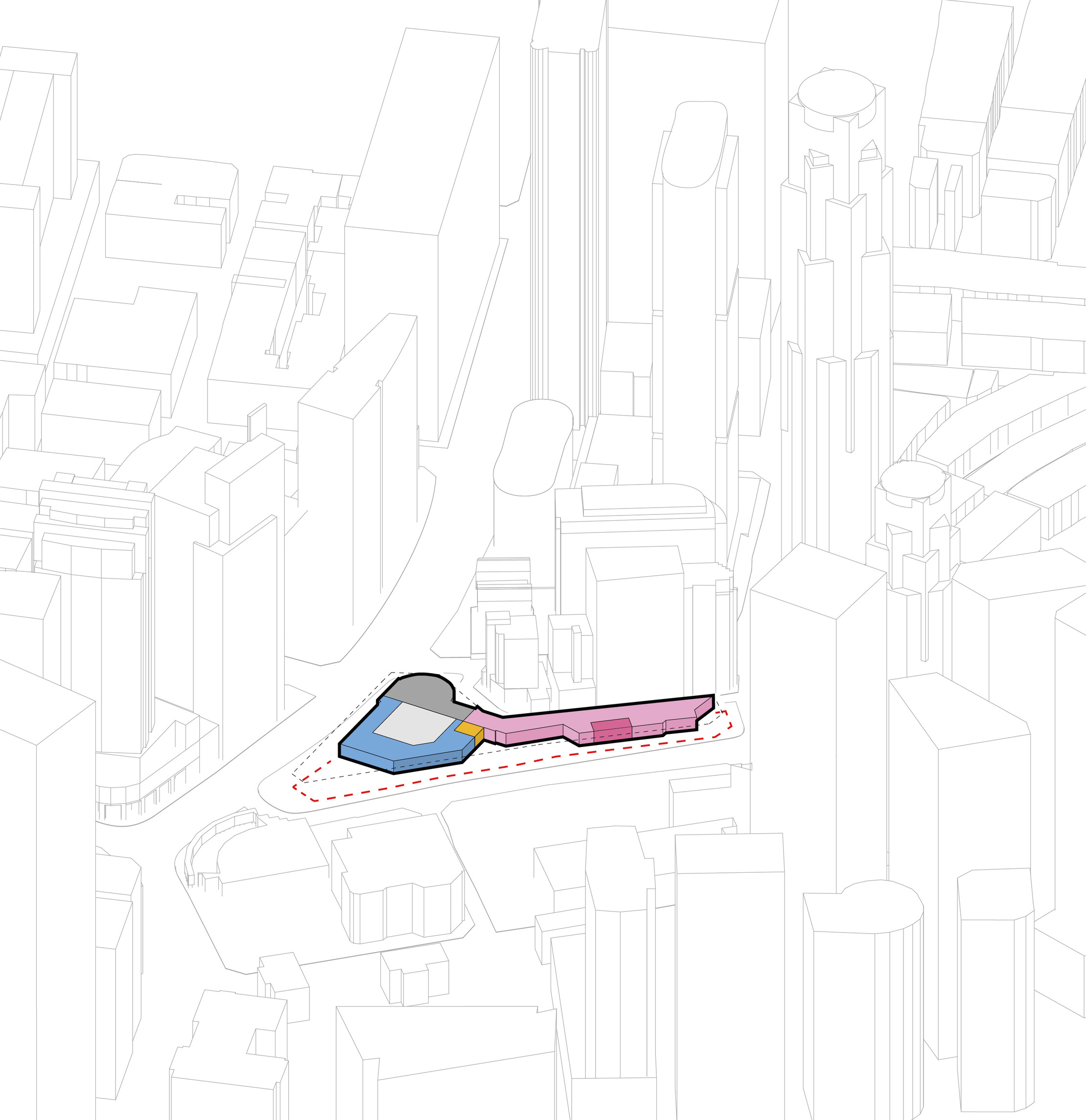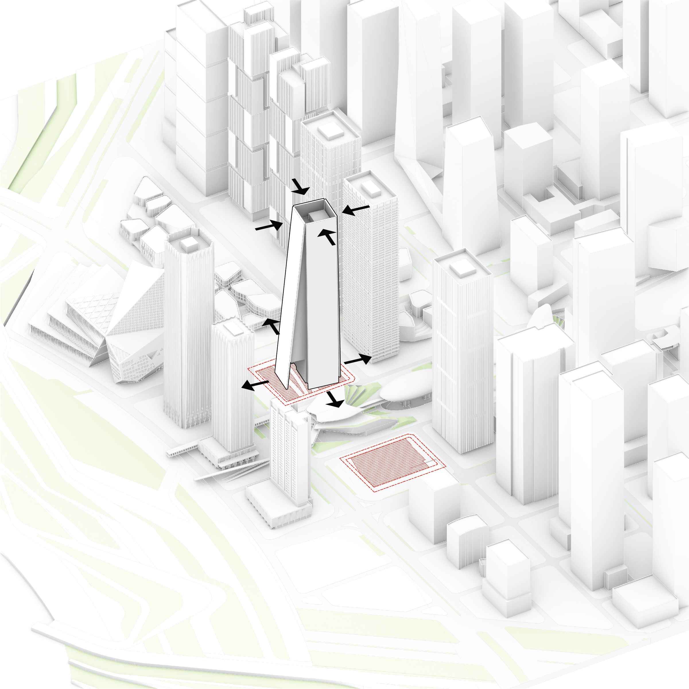The building footprint results from expanding the public realm, significantly increasing public park space while minimizing the building area at the ground level. Framing the new park are public facing programs – a new 47,000 sq ft YMCA; 30,000 sq ft of neighborhood-oriented retail space; and 4,500 sq ft of community occupied kiosks.