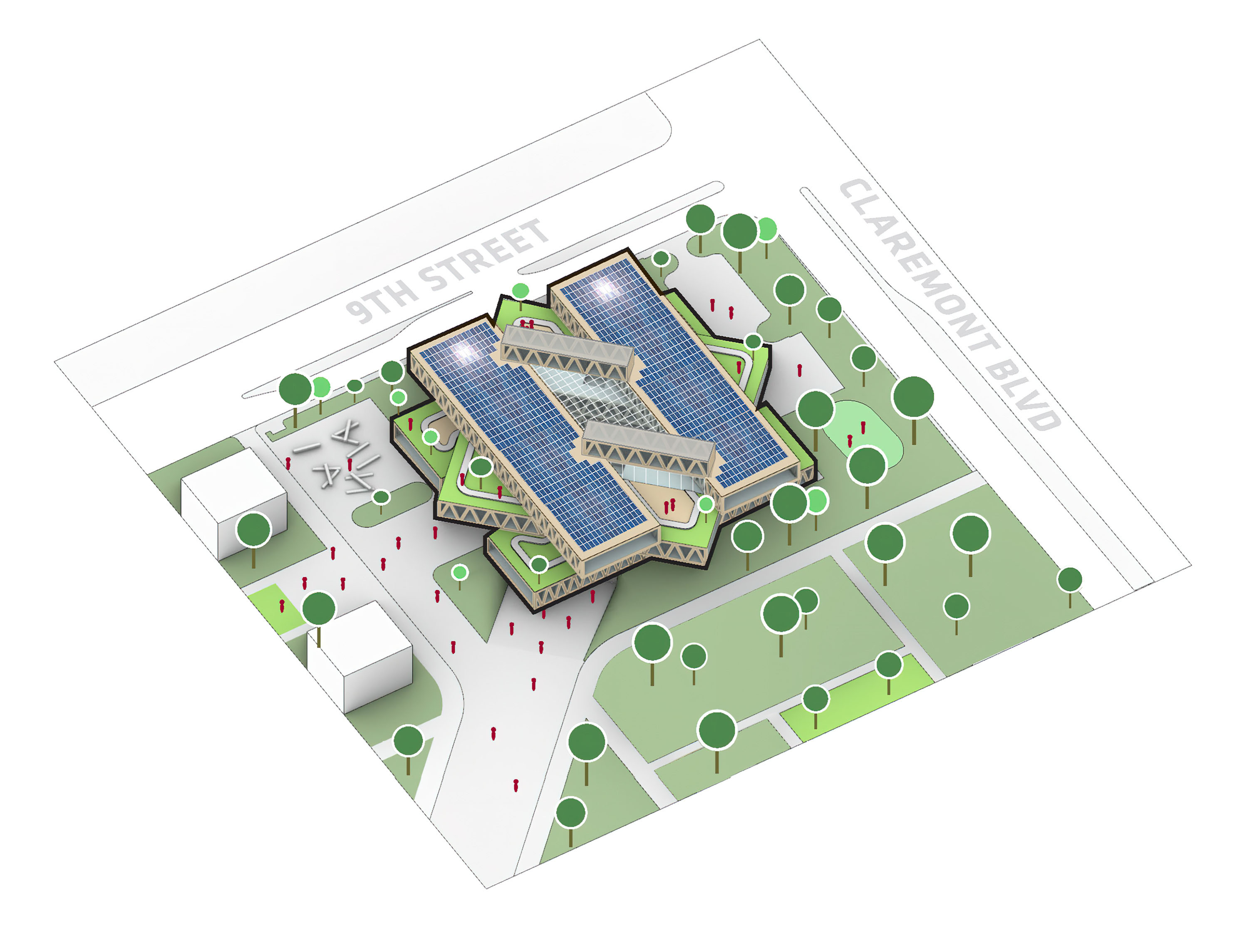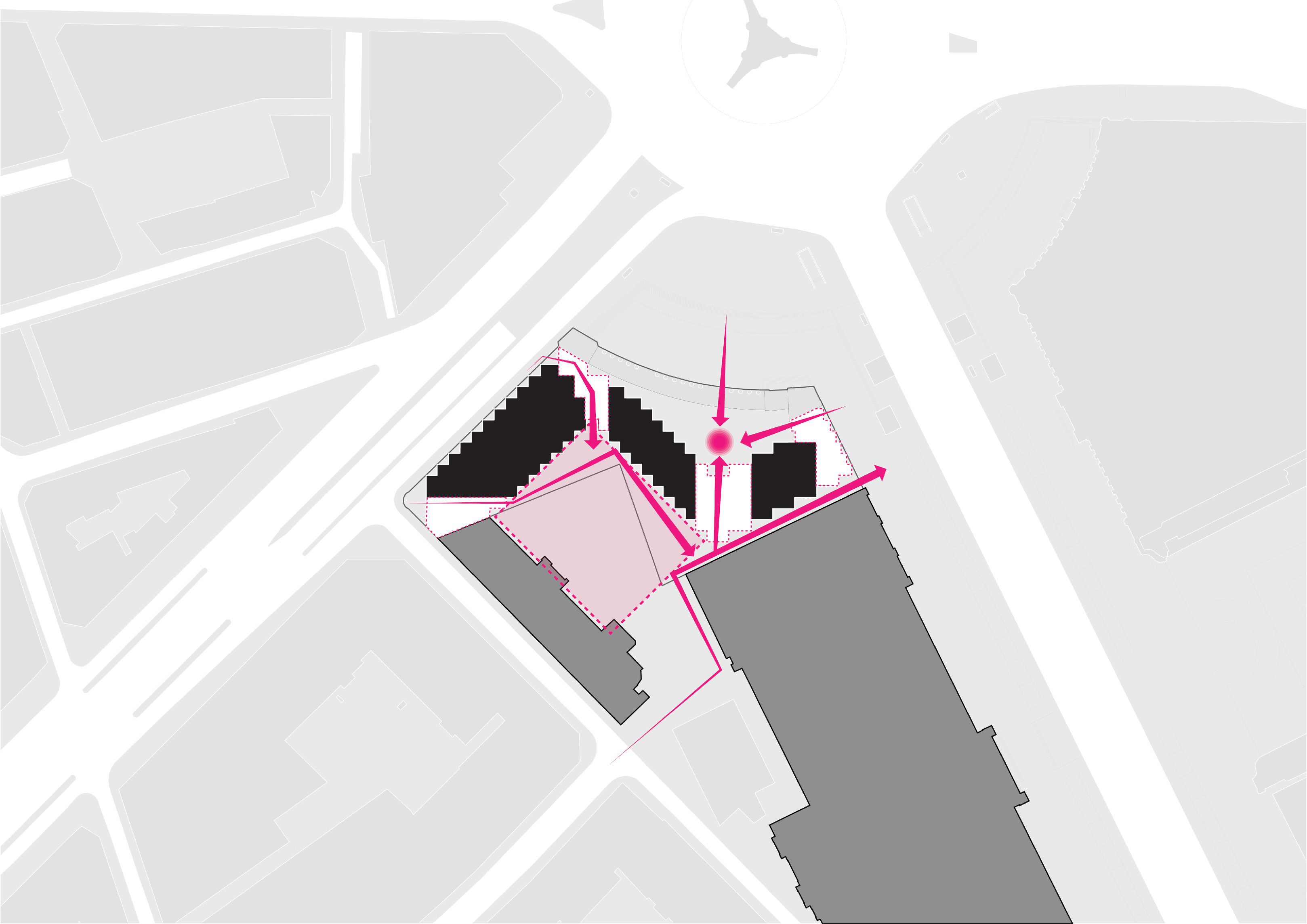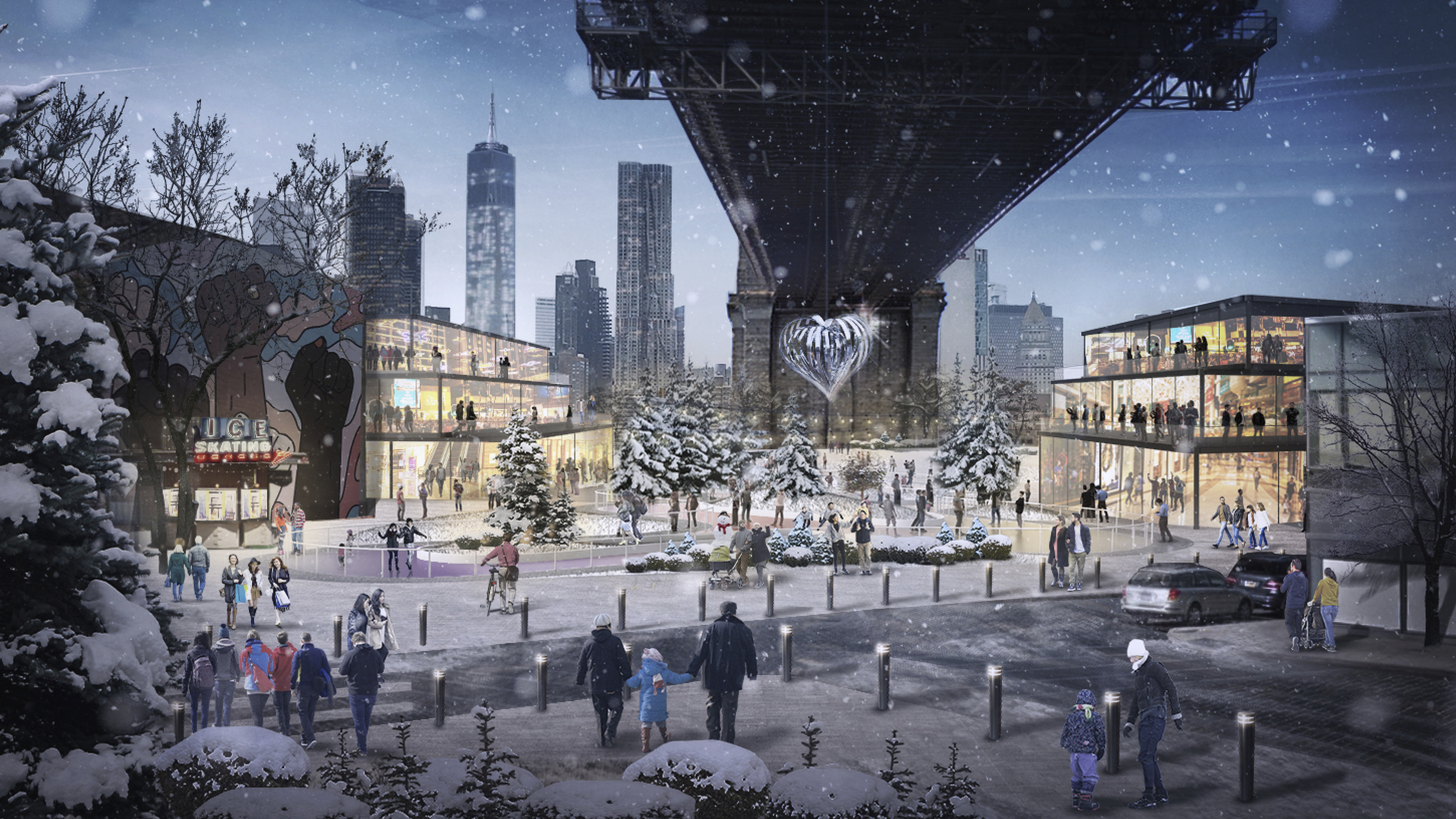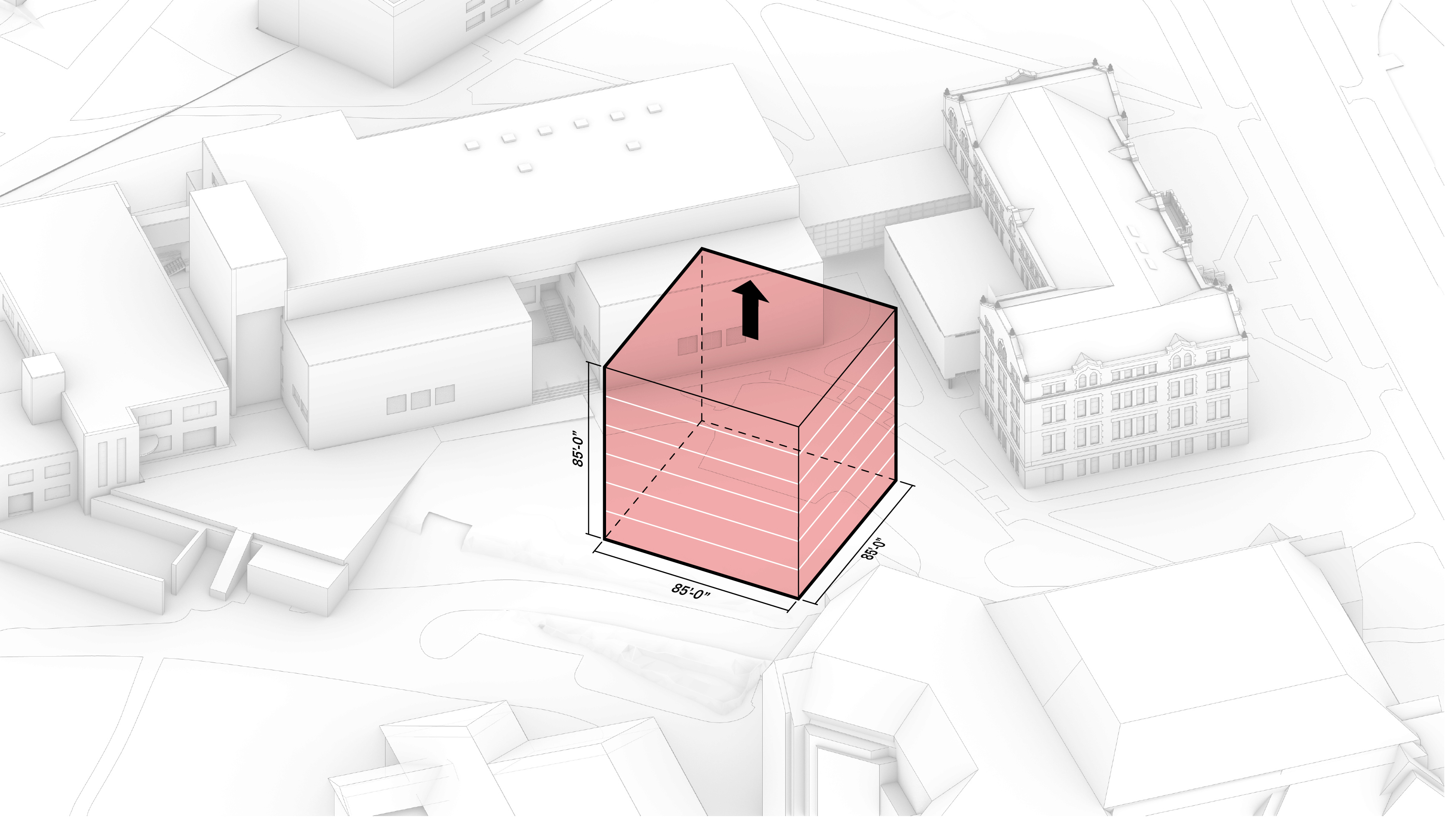 The building footprint results from expanding the public realm, significantly increasing public park space while minimizing the building area at the ground level. Framing the new park are public facing programs – a new 47,000 sq ft YMCA; 30,000 sq ft of neighborhood-oriented retail space; and 4,500 sq ft of community occupied kiosks.
