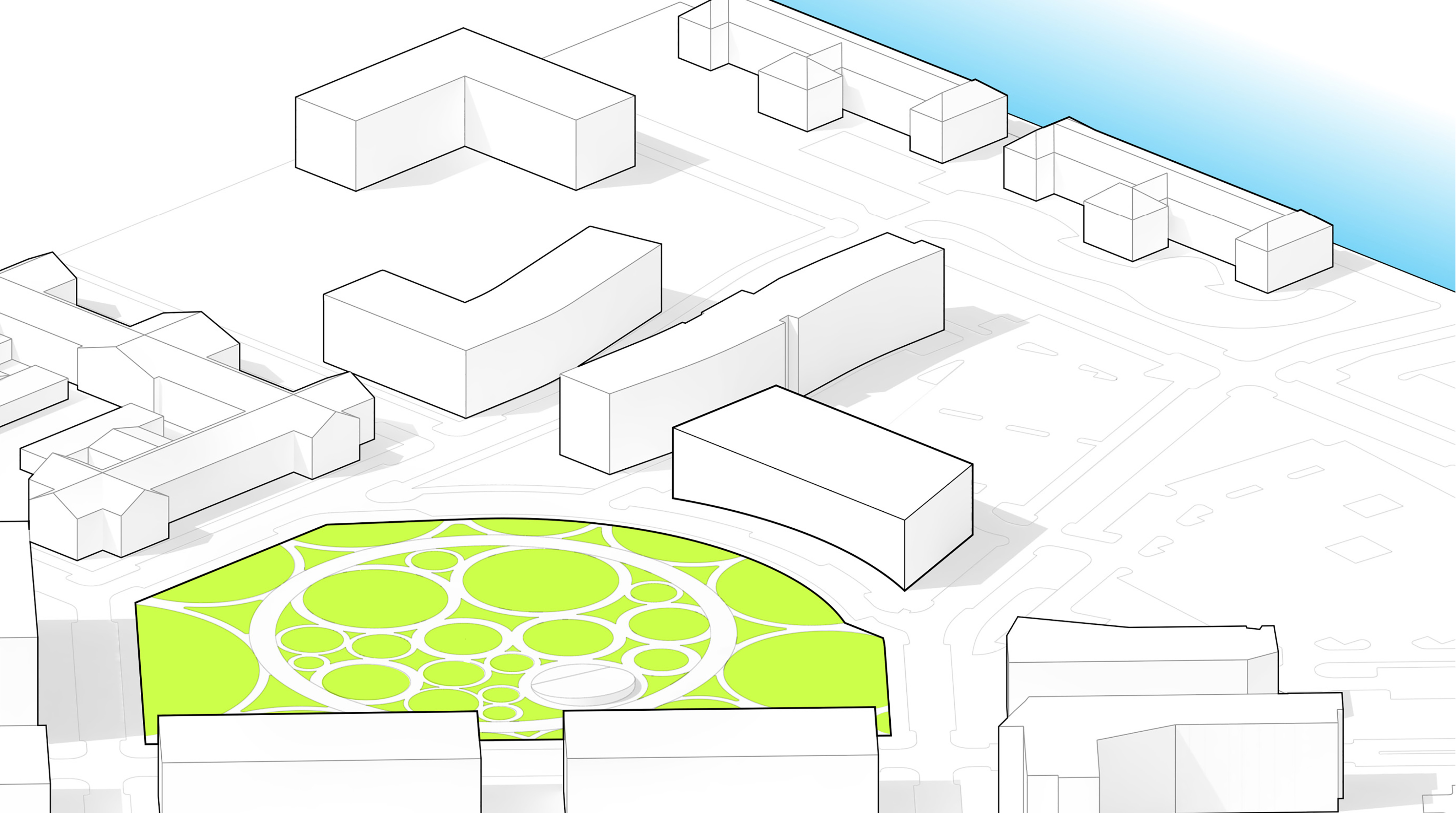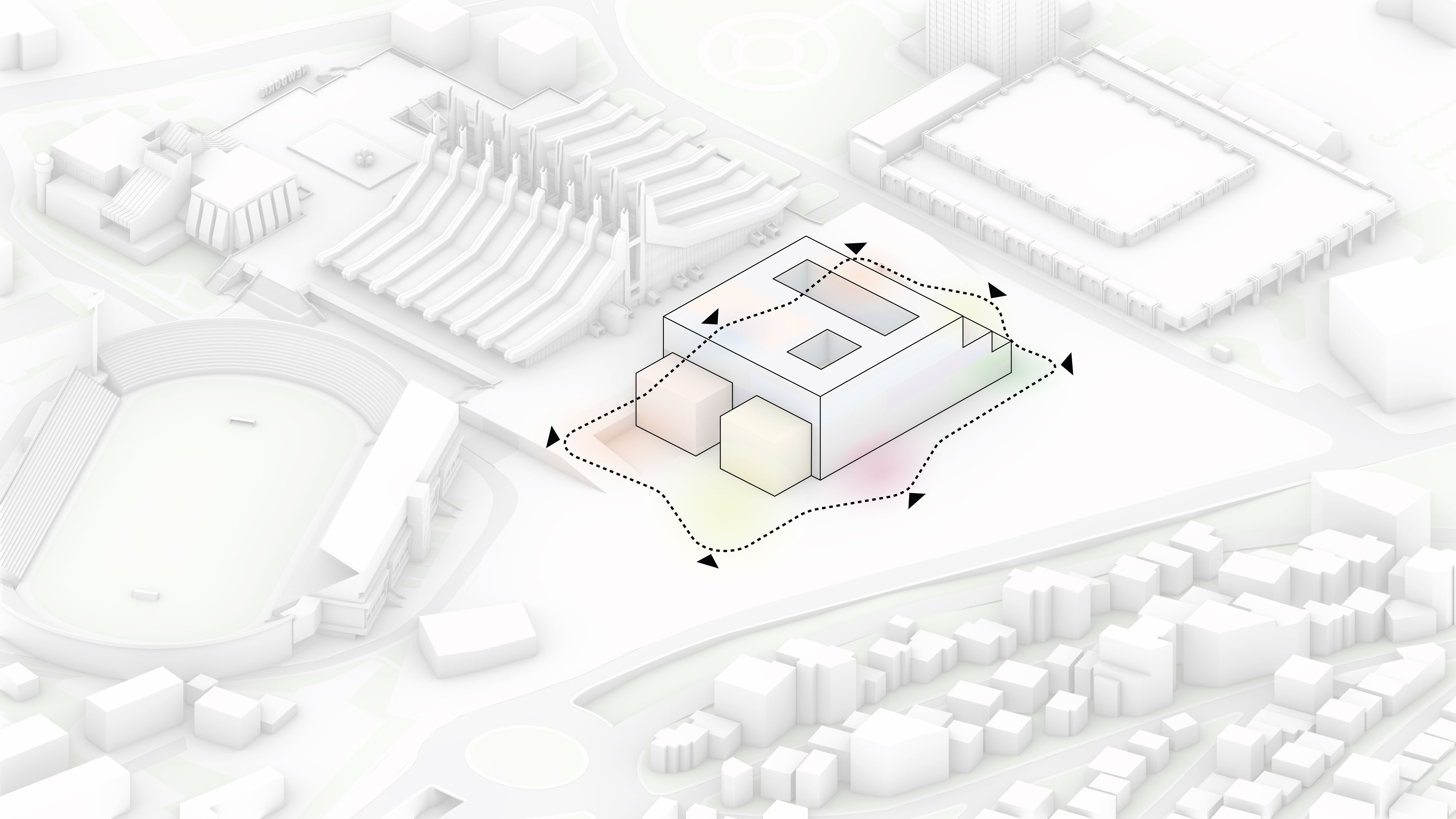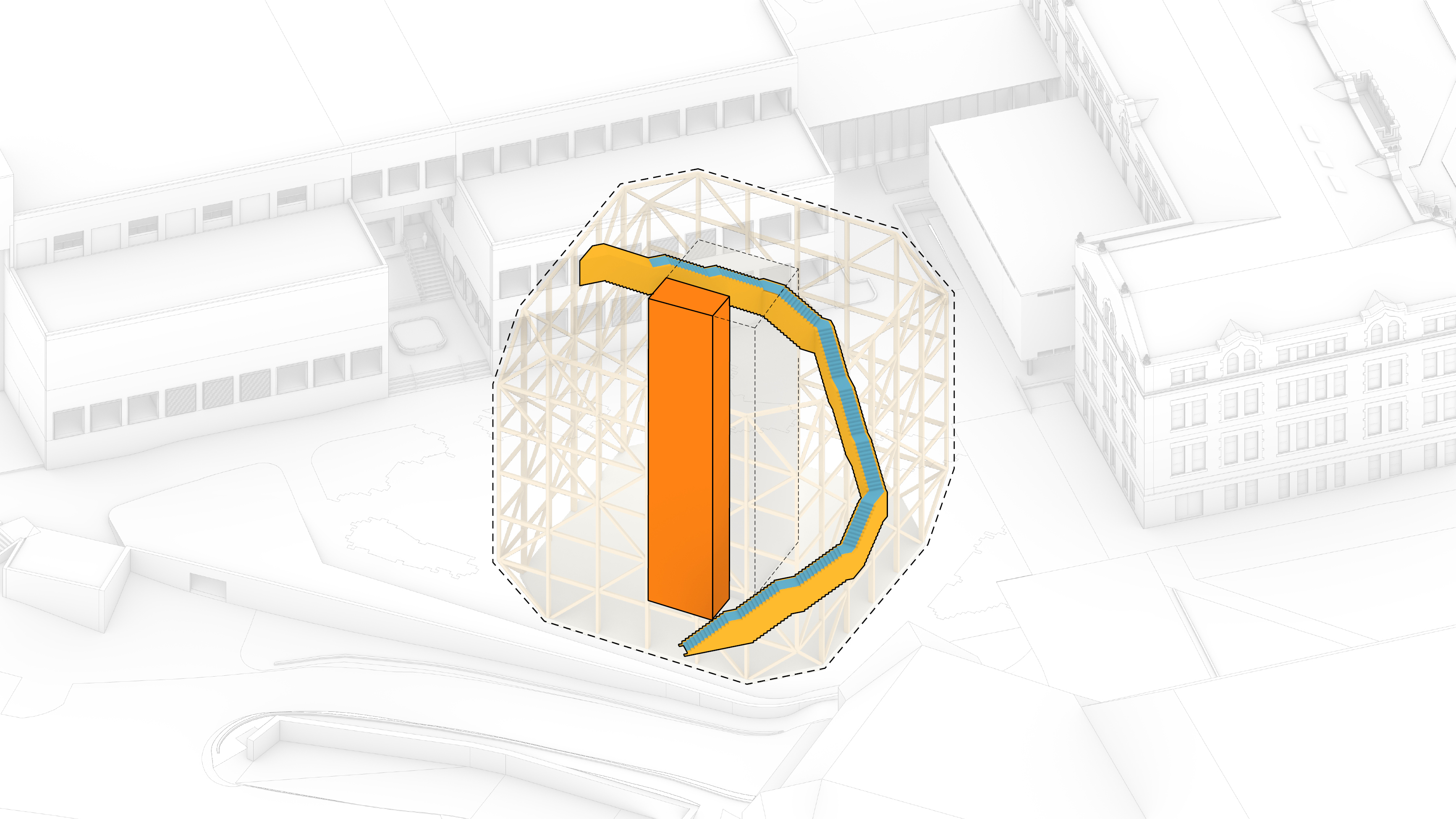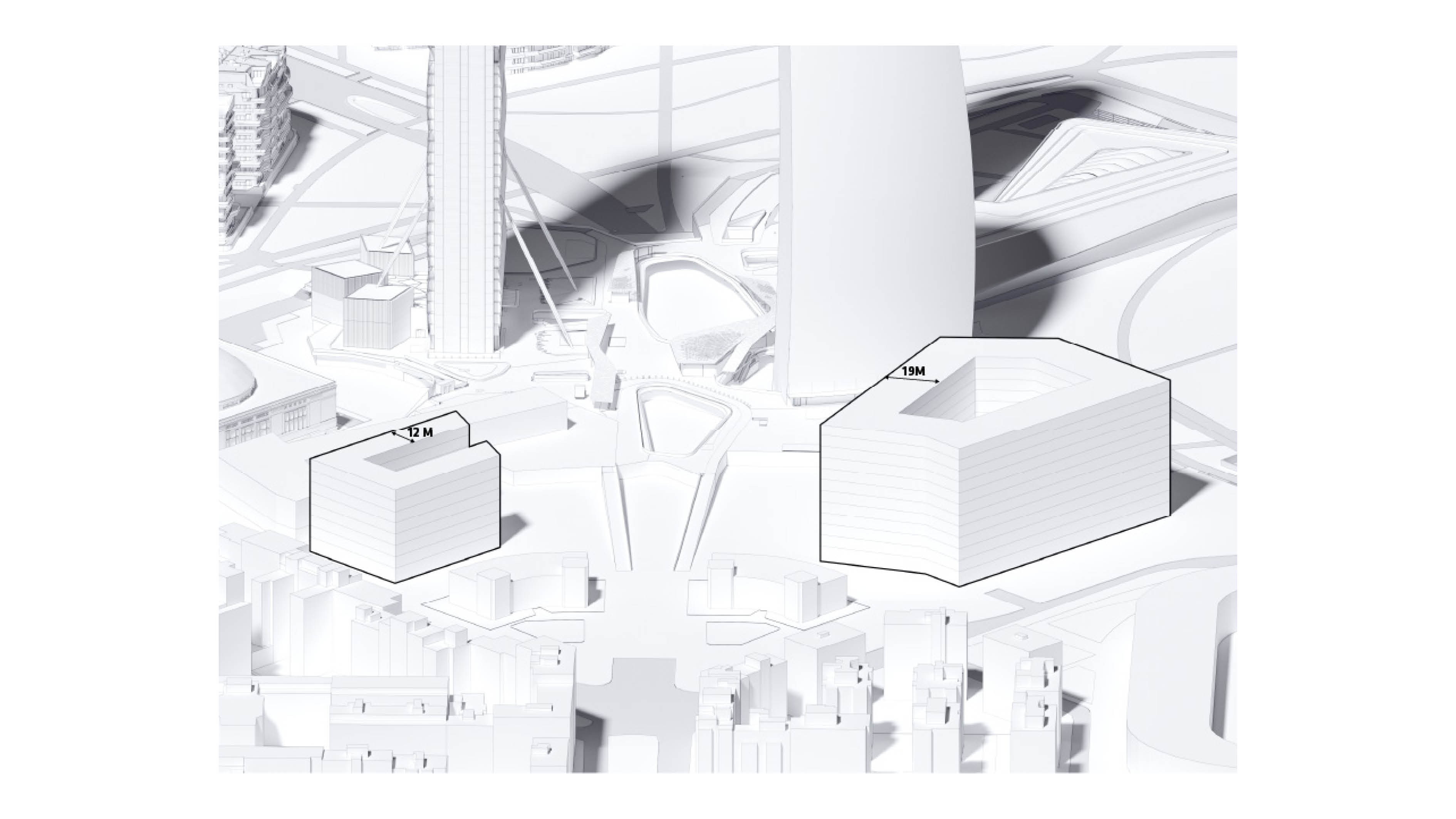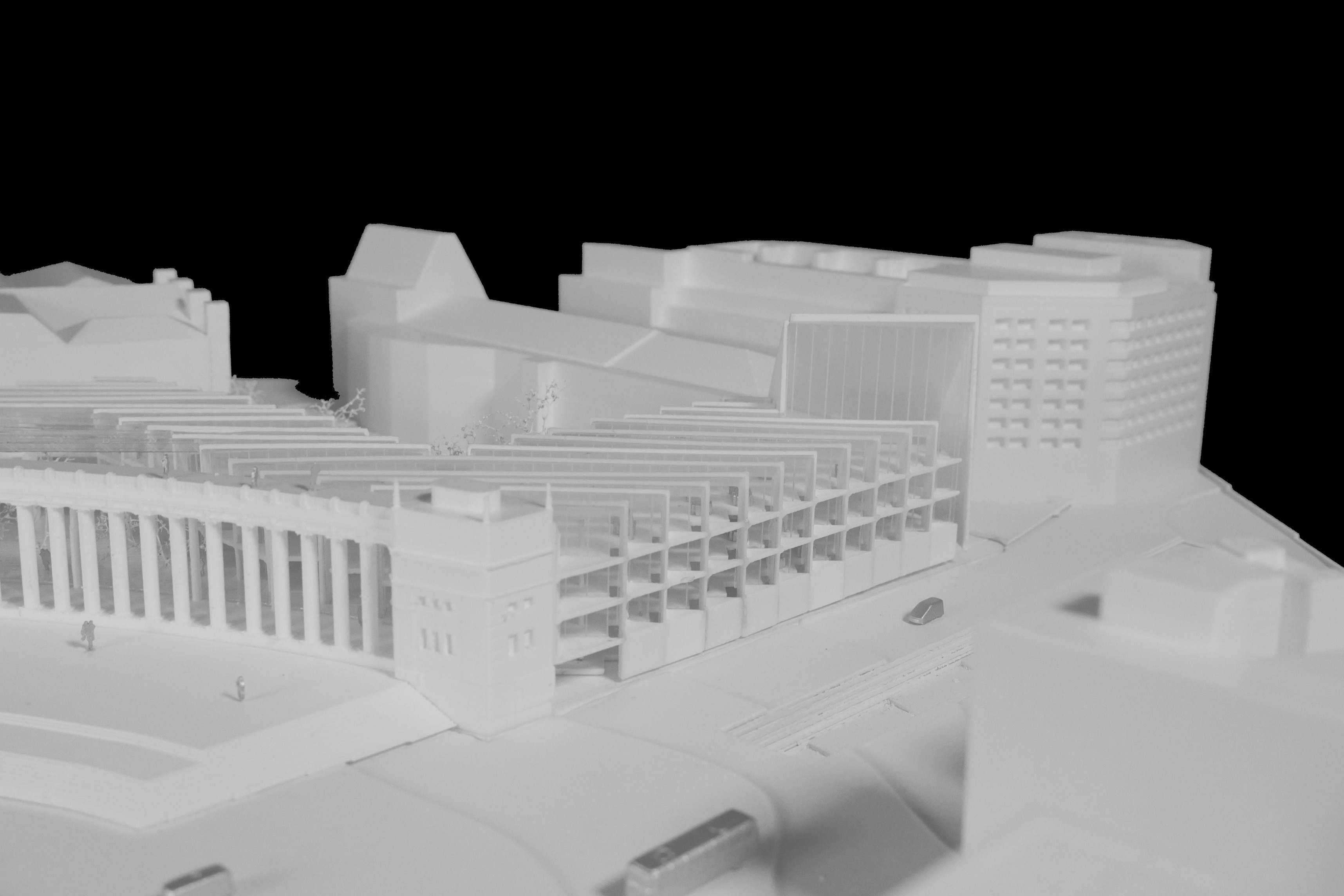 The building footprint results from expanding the public realm, significantly increasing public park space while minimizing the building area at the ground level. Framing the new park are public facing programs – a new 47,000 sq ft YMCA; 30,000 sq ft of neighborhood-oriented retail space; and 4,500 sq ft of community occupied kiosks.