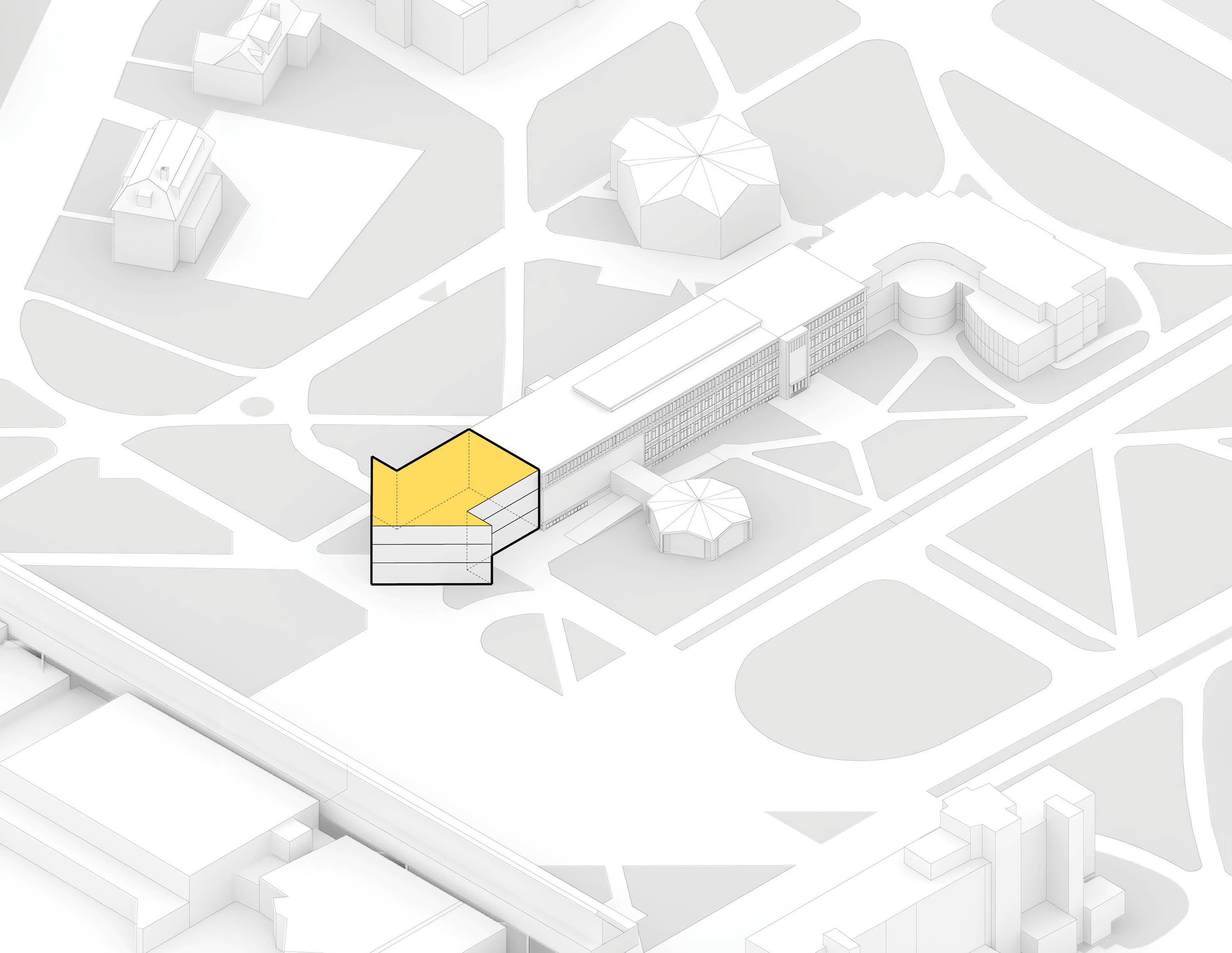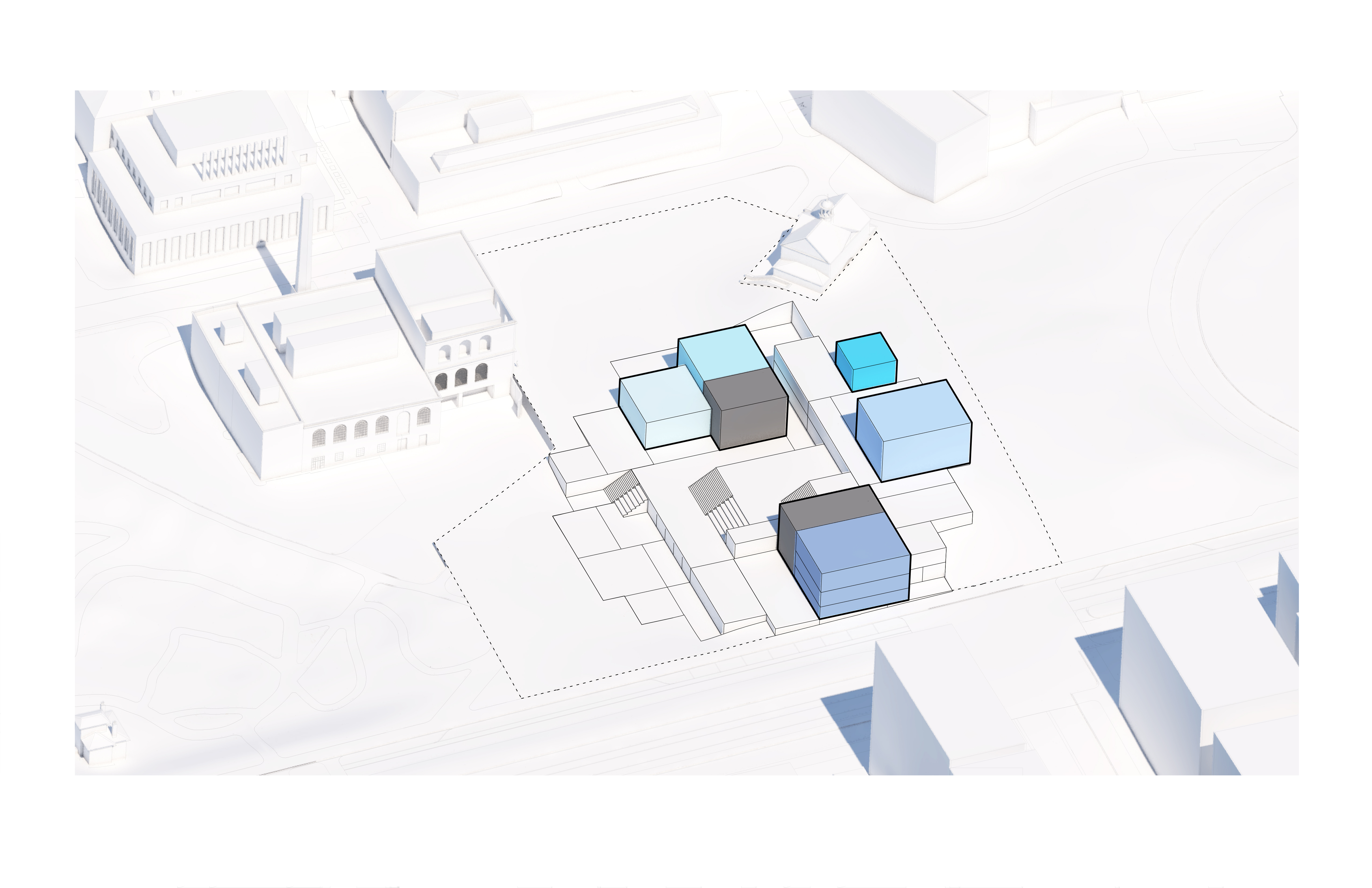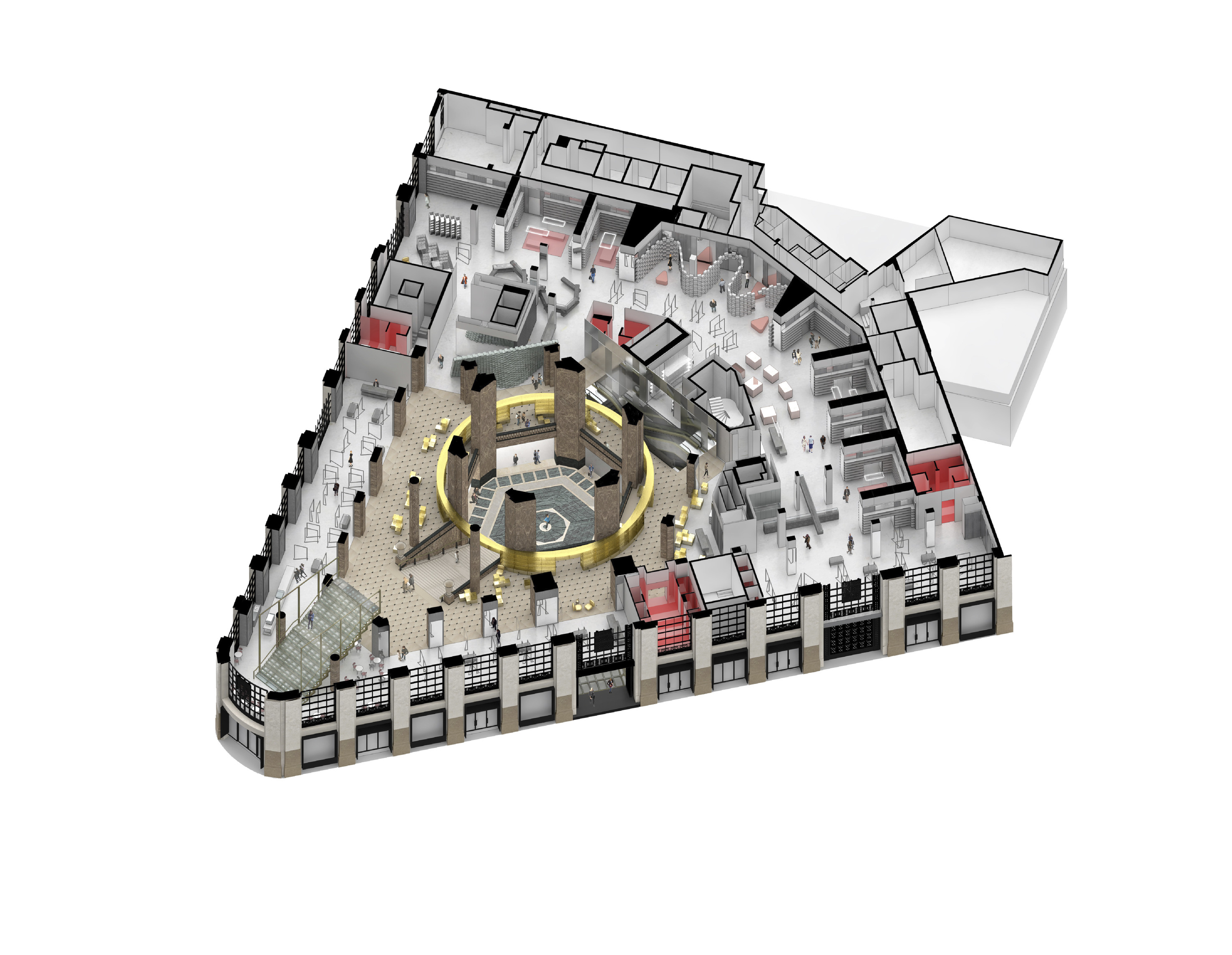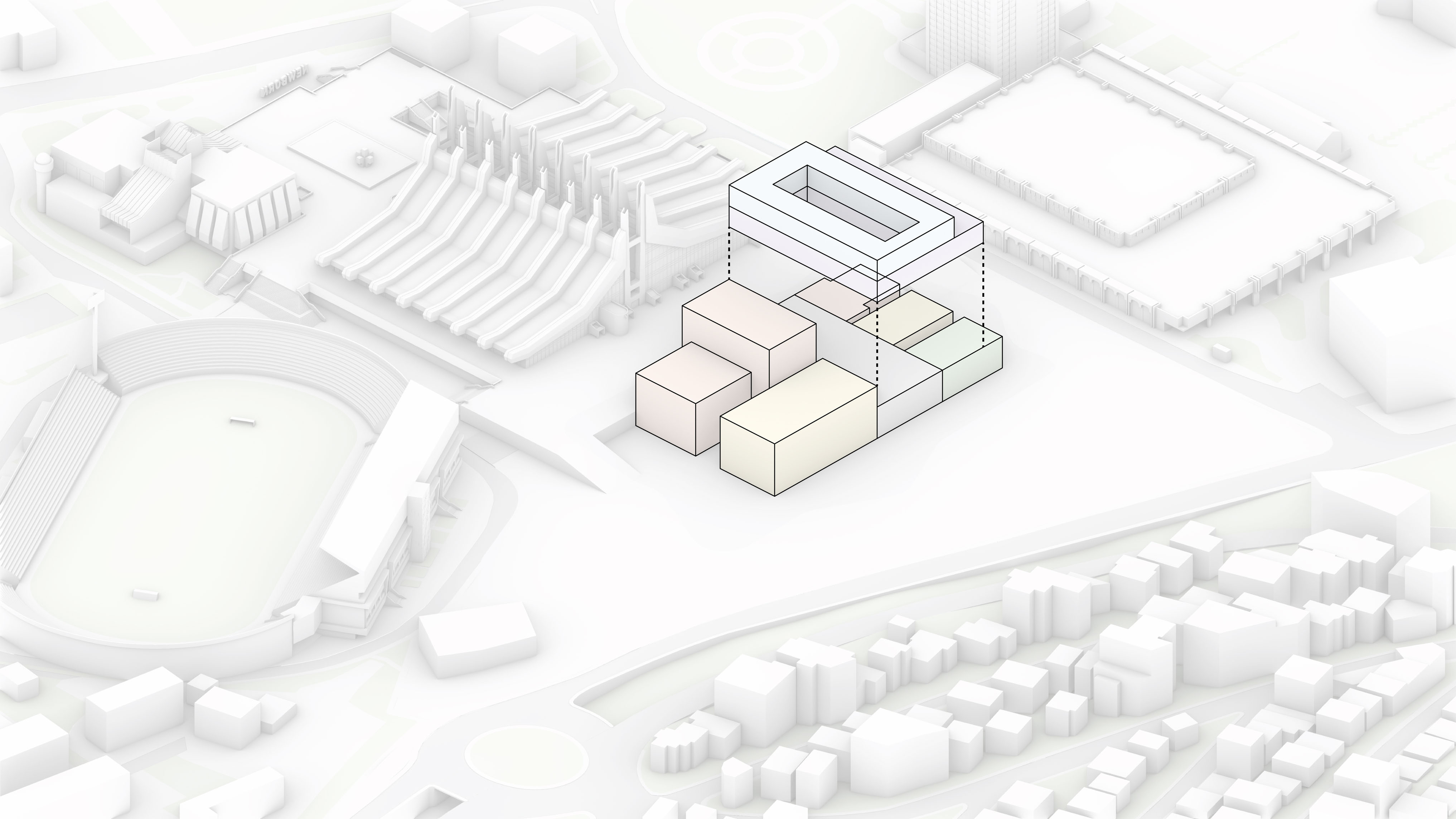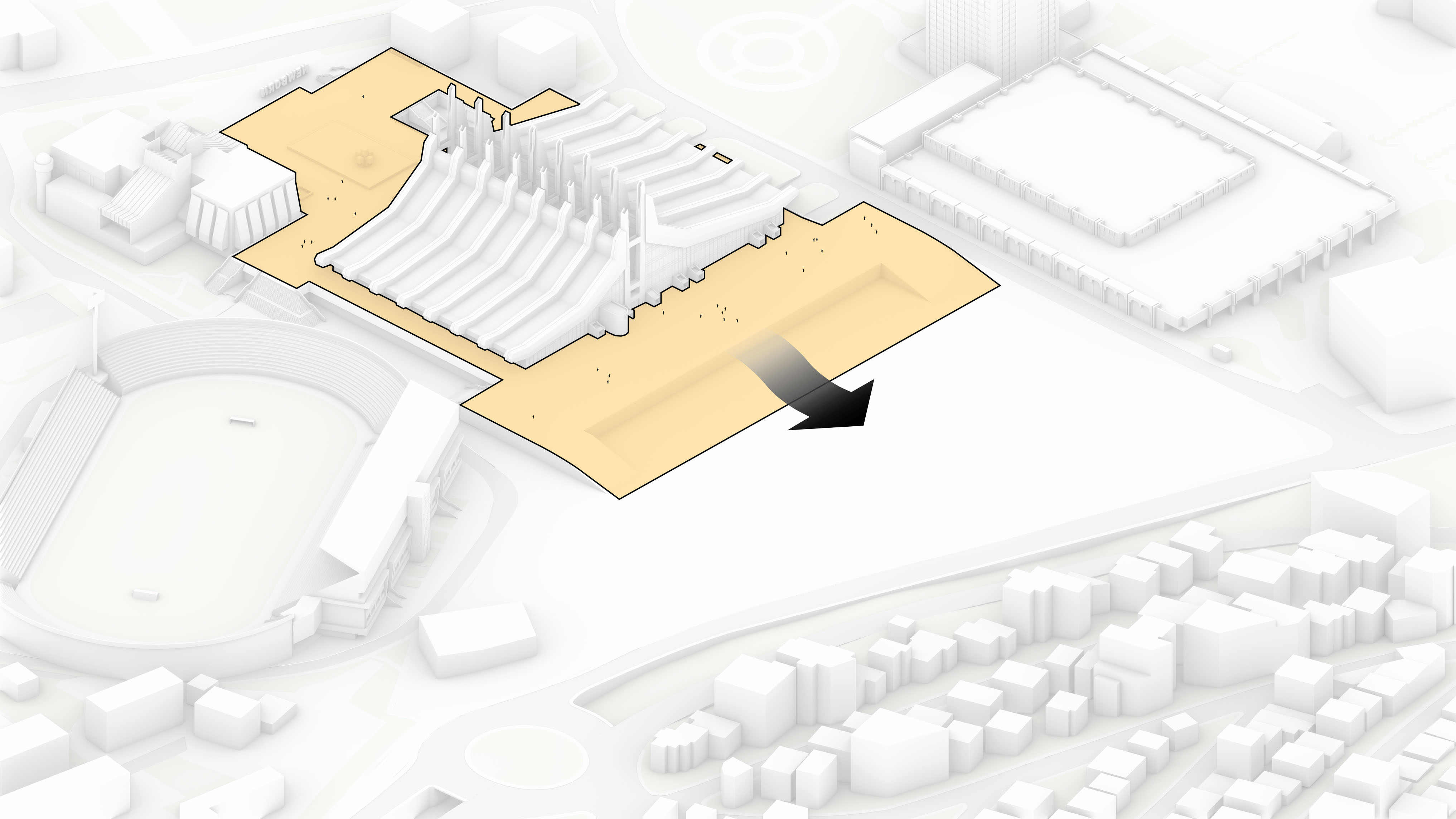 The building footprint results from expanding the public realm, significantly increasing public park space while minimizing the building area at the ground level. Framing the new park are public facing programs – a new 47,000 sq ft YMCA; 30,000 sq ft of neighborhood-oriented retail space; and 4,500 sq ft of community occupied kiosks.