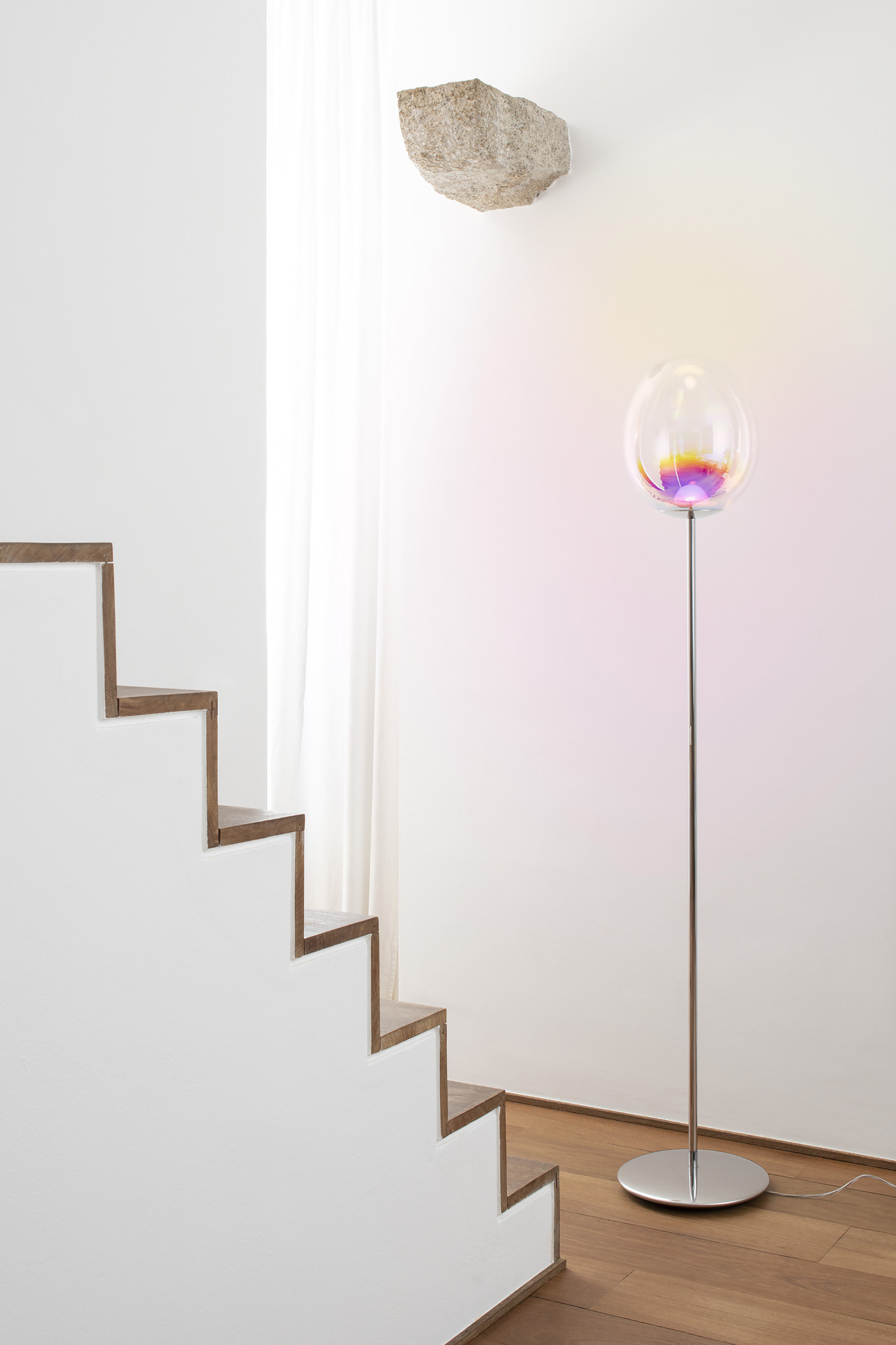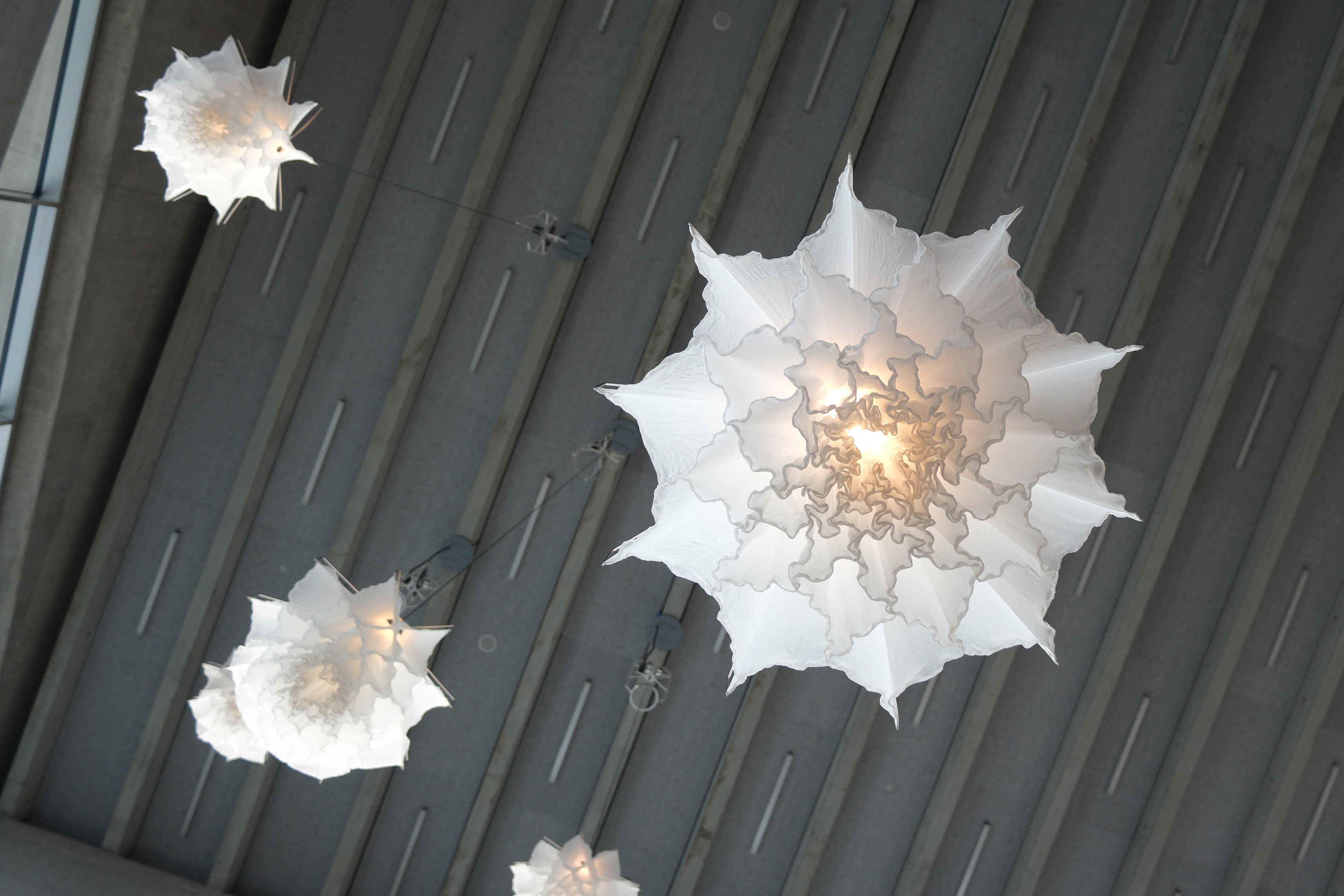 Suspended 30 ft in the air, Magnetic Field by Damien Ortega – an intricate sculpture of Earth’s magnetosphere – floats in orbit, composed of 18 metal rings and 1,476 vibrant glass spheres.