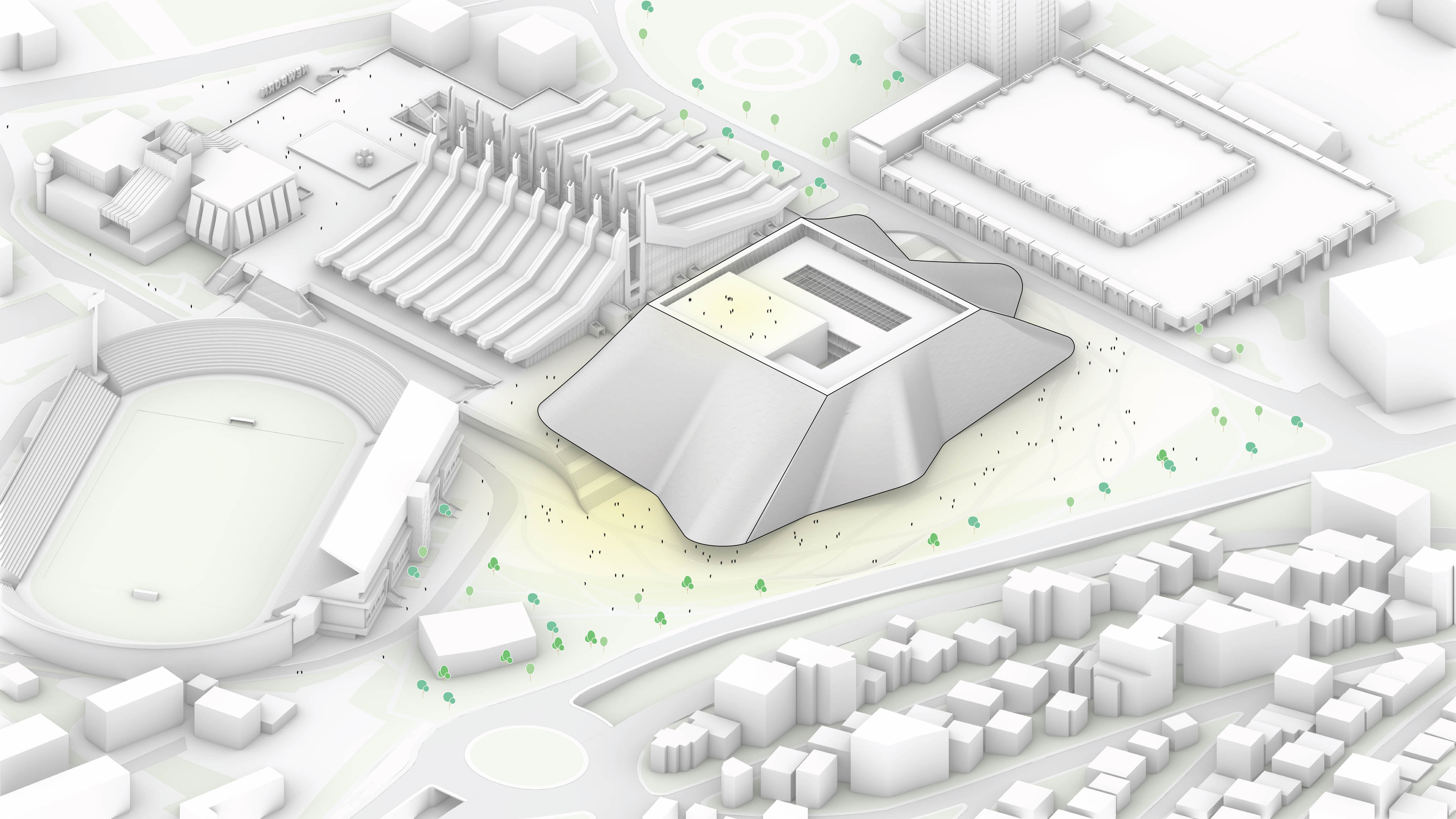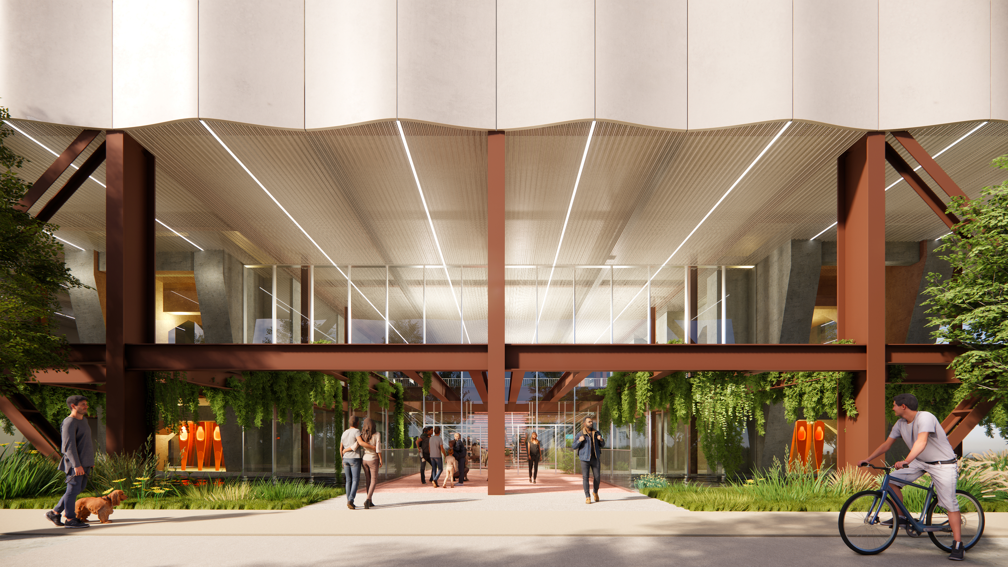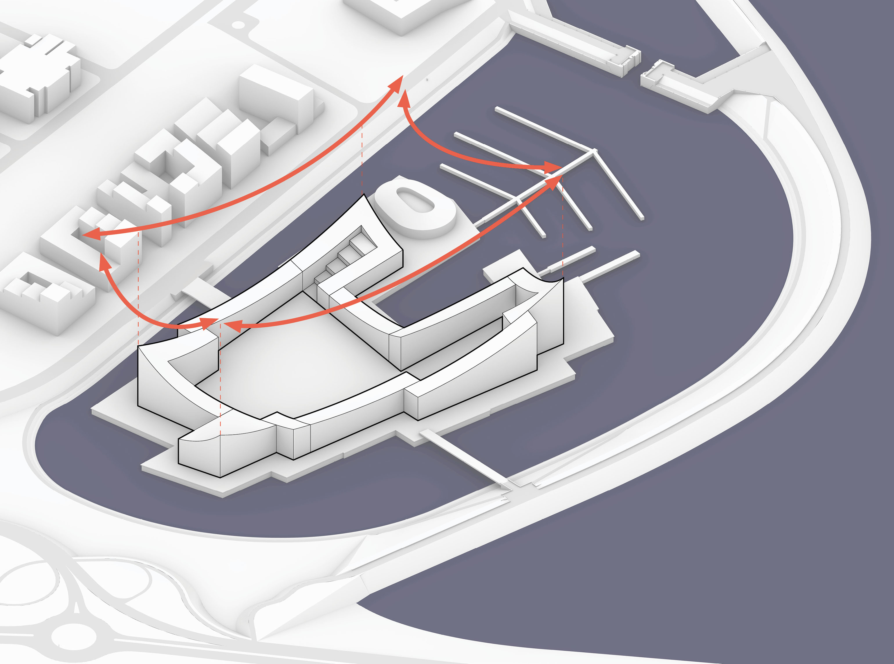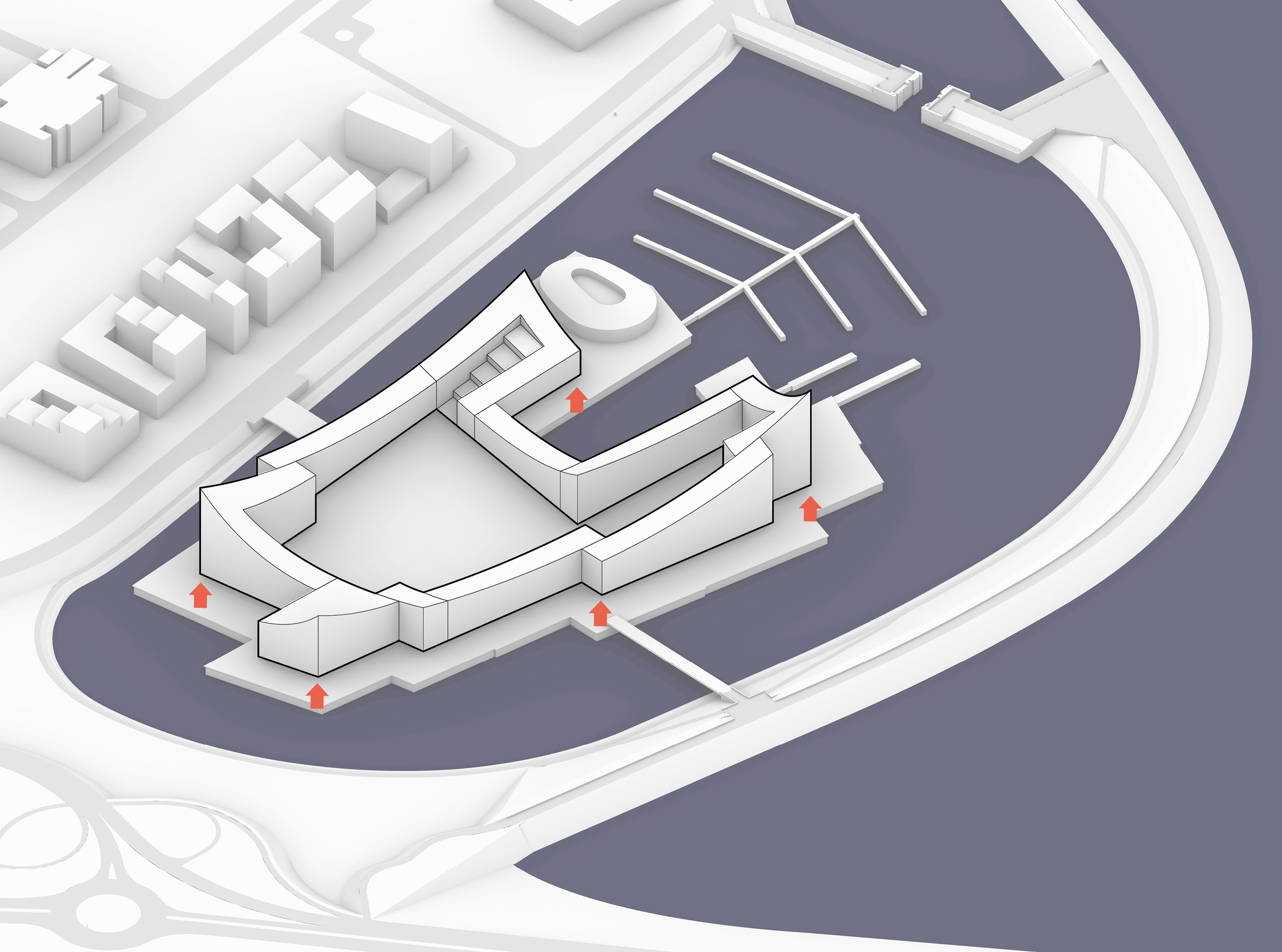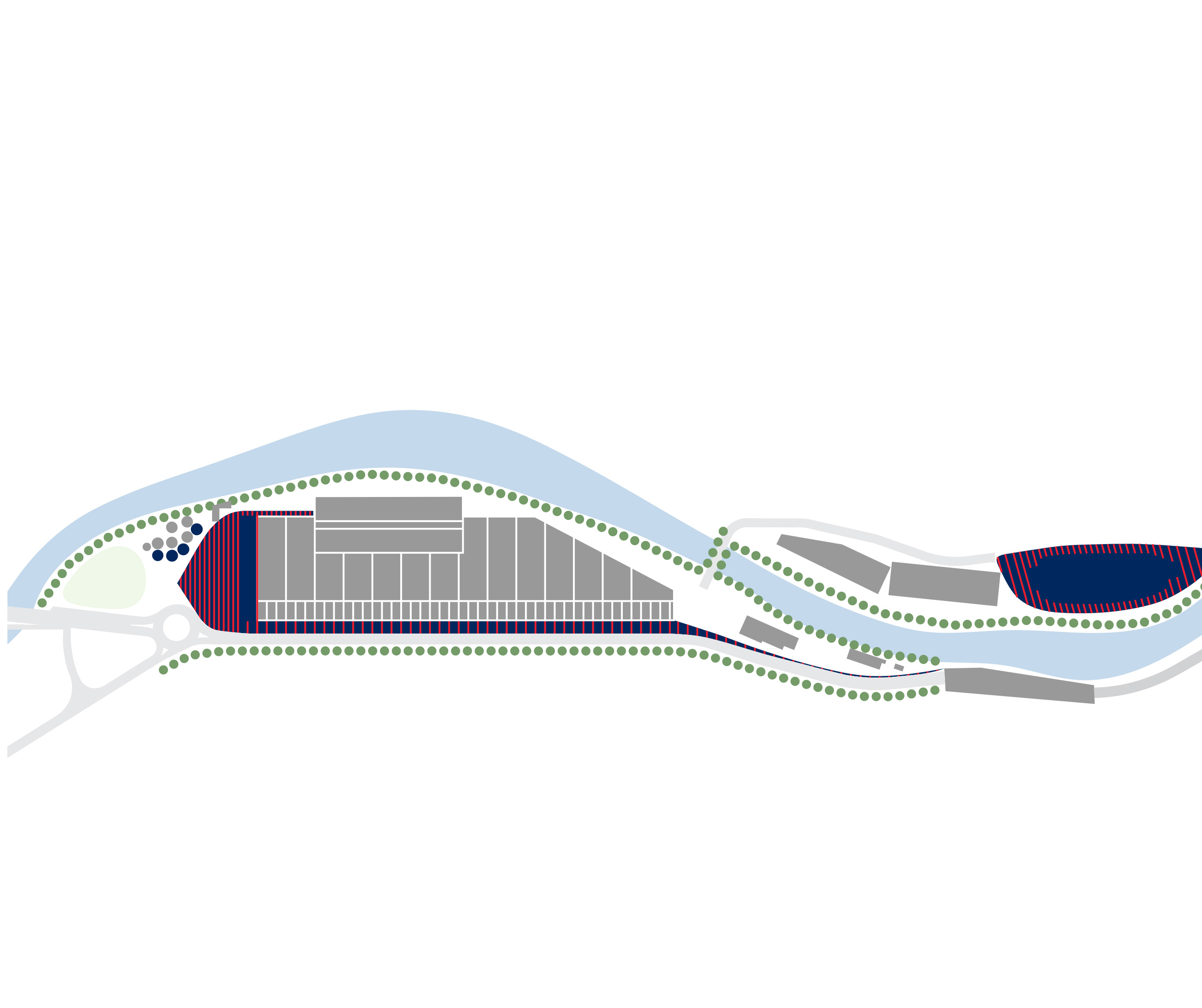 The building’s double curved, precast concrete façade bows inwards to create a generous urban canopy that responds to the ‘shock wave’ of the park’s circular running track, activity pods and planting vignettes – rippling outwards like rings in water to invade the building’s footprint. Visitors and employees can admire the mothballed ships sitting in the adjacent docks while embracing the Central Green Park.