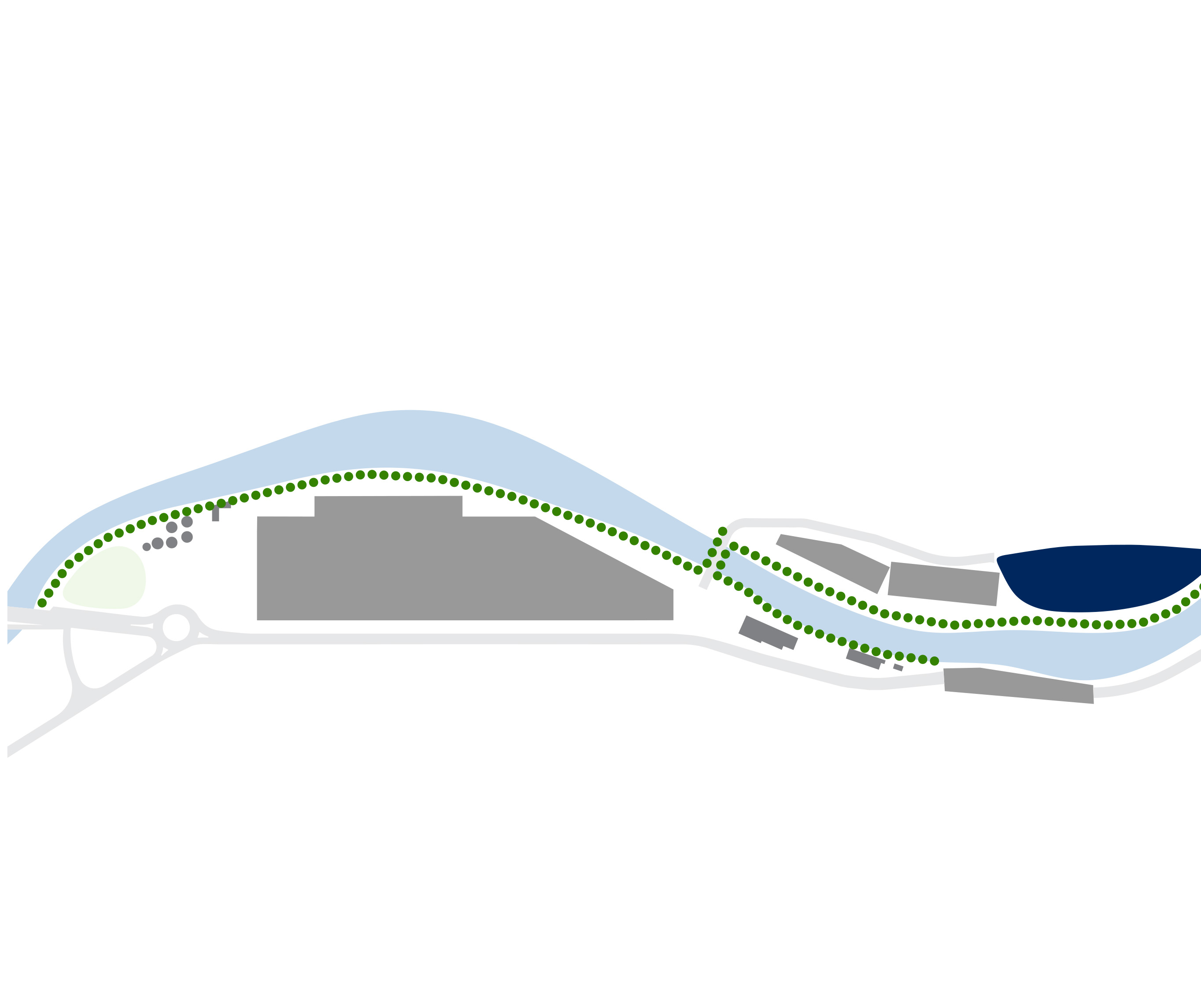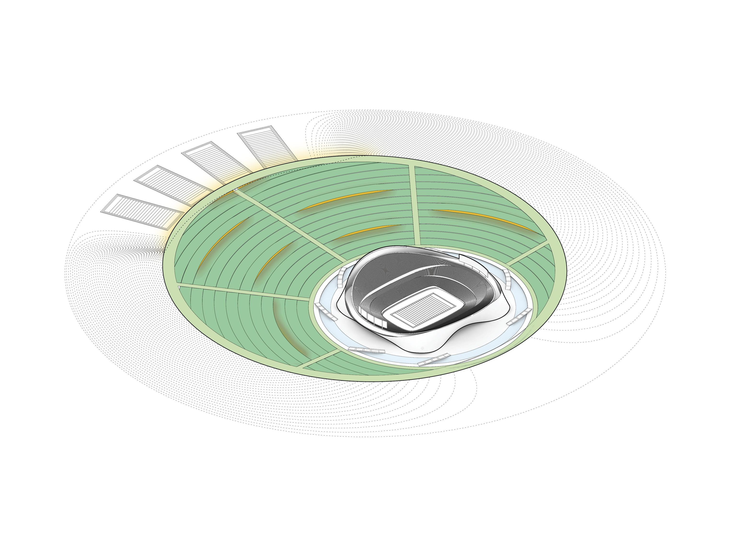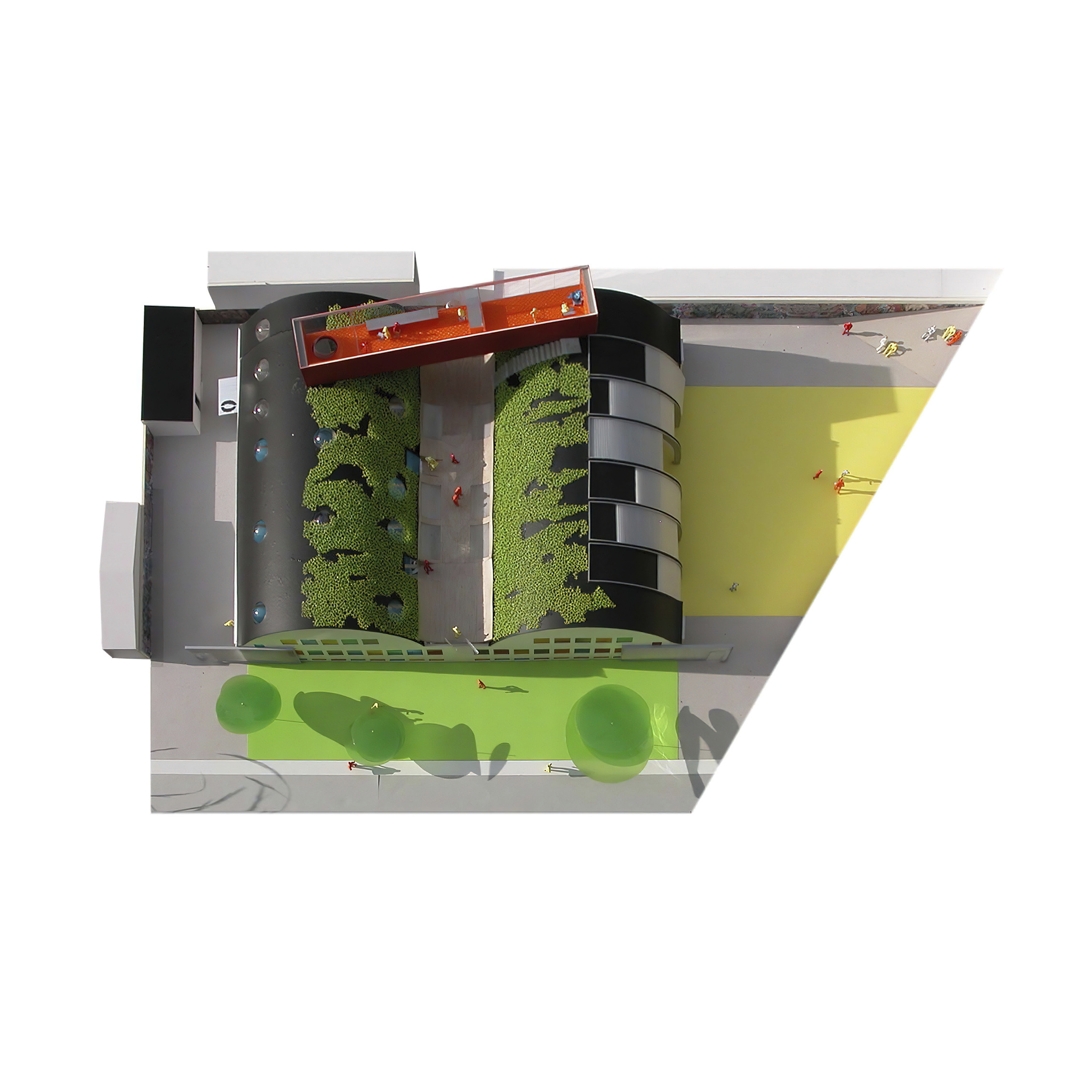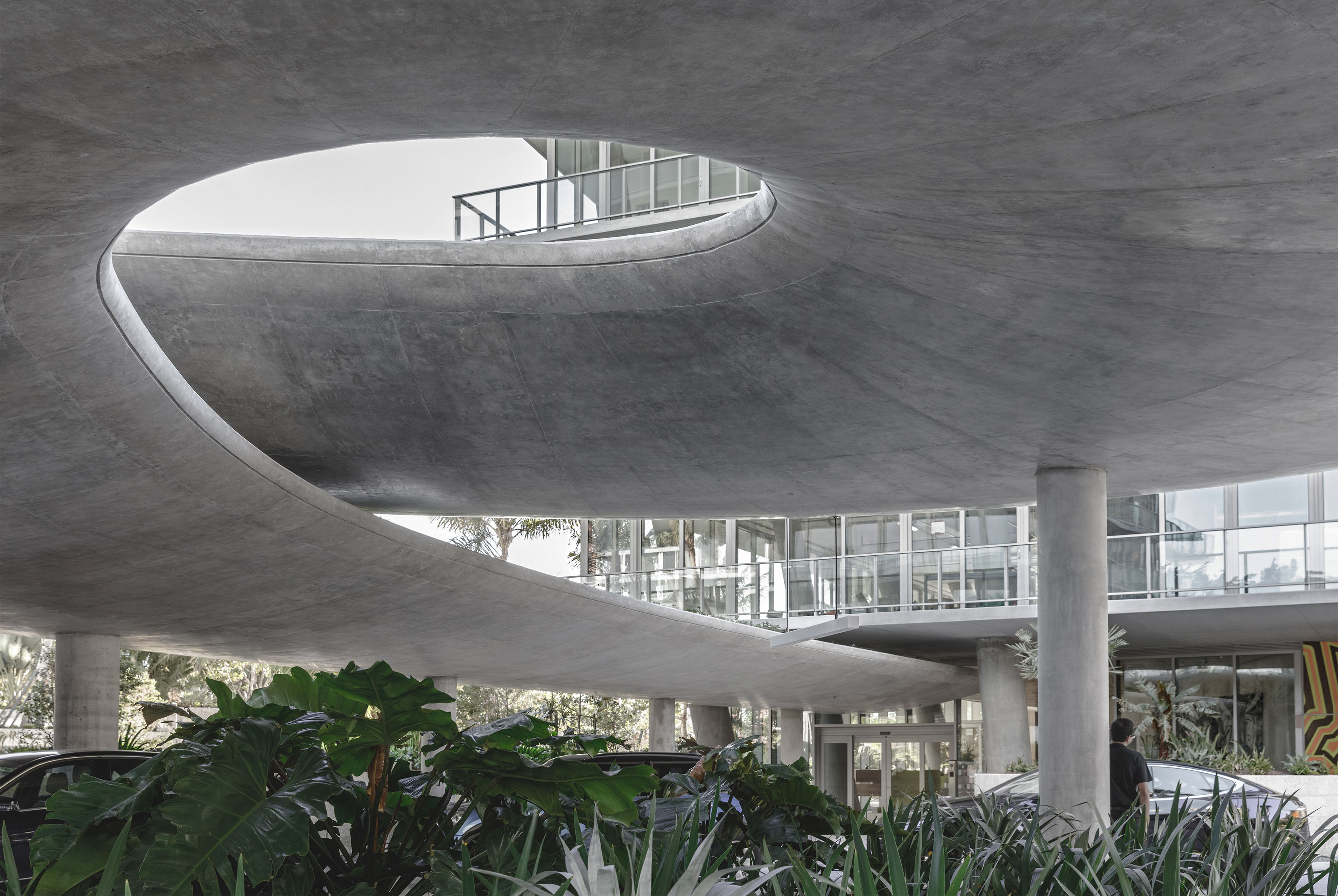 The building’s double curved, precast concrete façade bows inwards to create a generous urban canopy that responds to the ‘shock wave’ of the park’s circular running track, activity pods and planting vignettes – rippling outwards like rings in water to invade the building’s footprint. Visitors and employees can admire the mothballed ships sitting in the adjacent docks while embracing the Central Green Park.