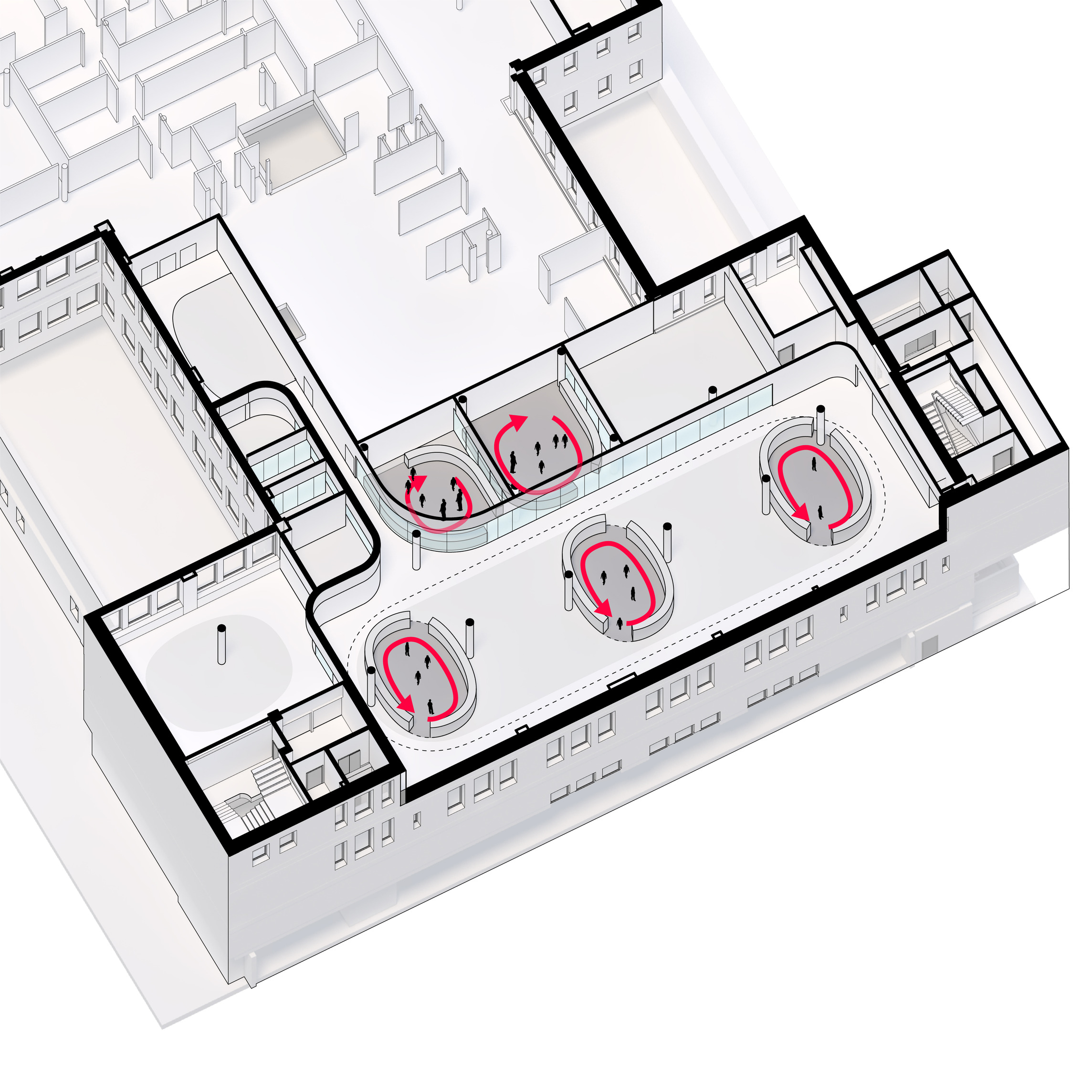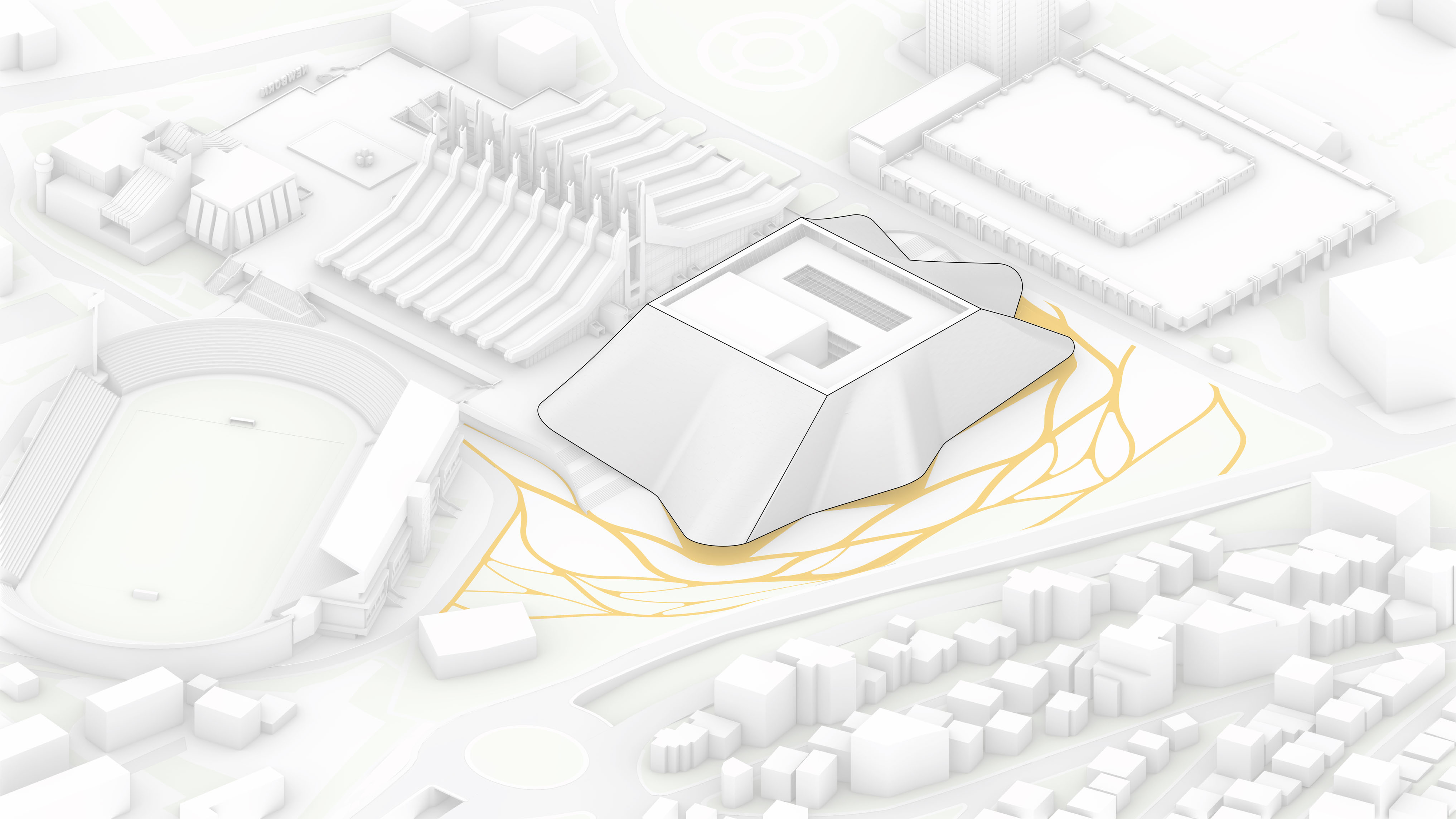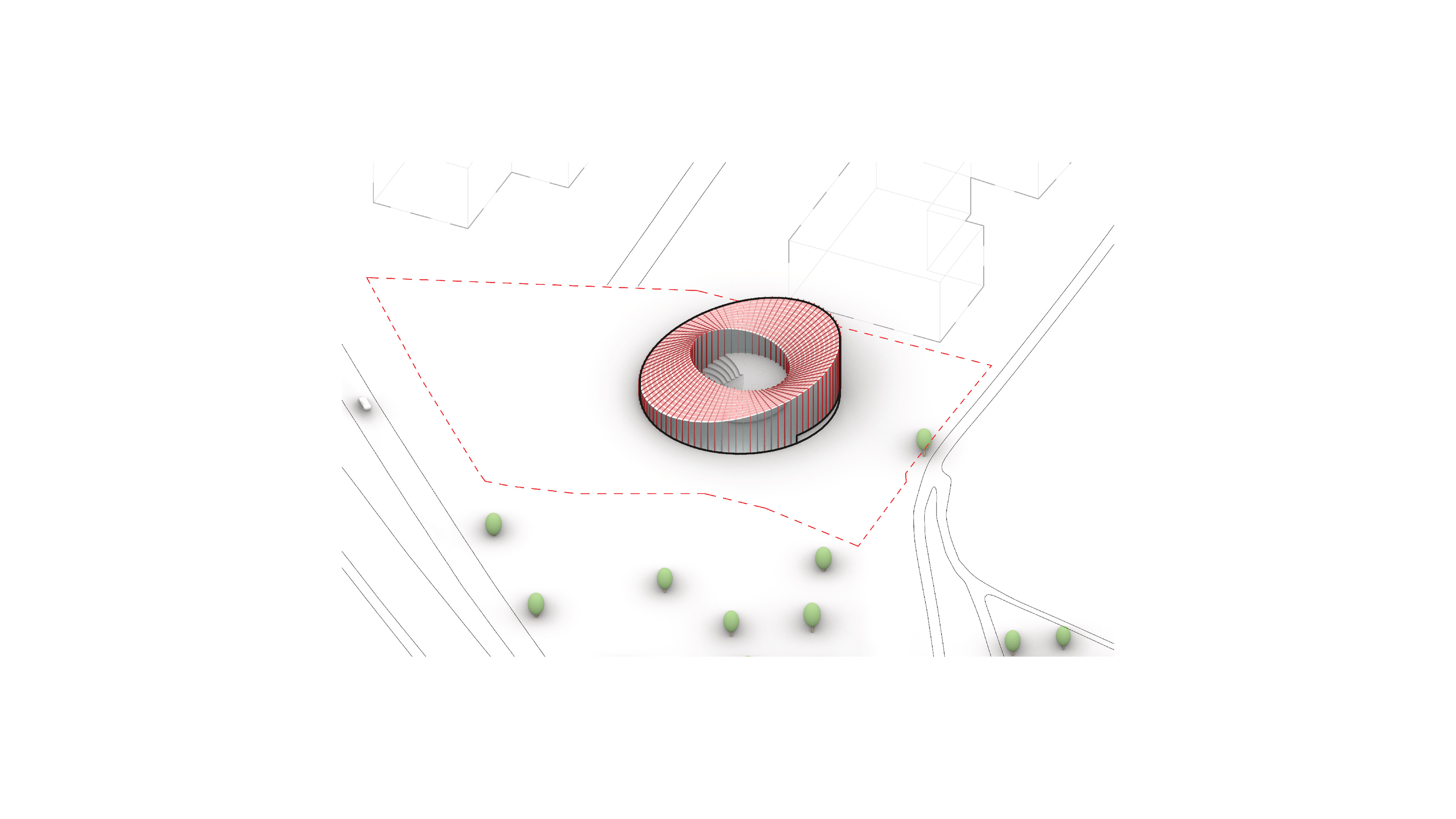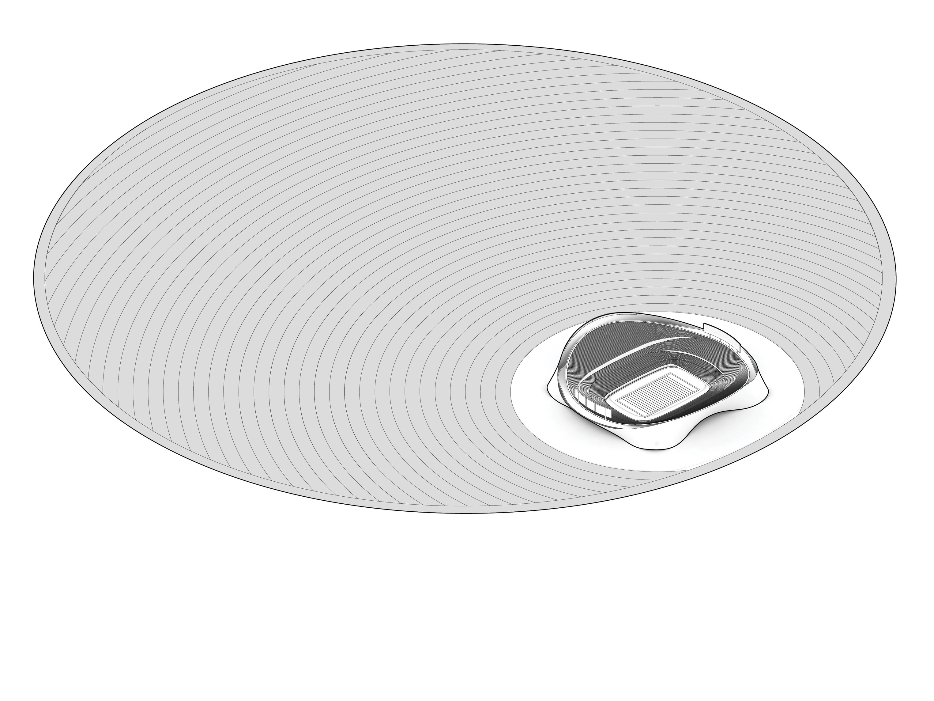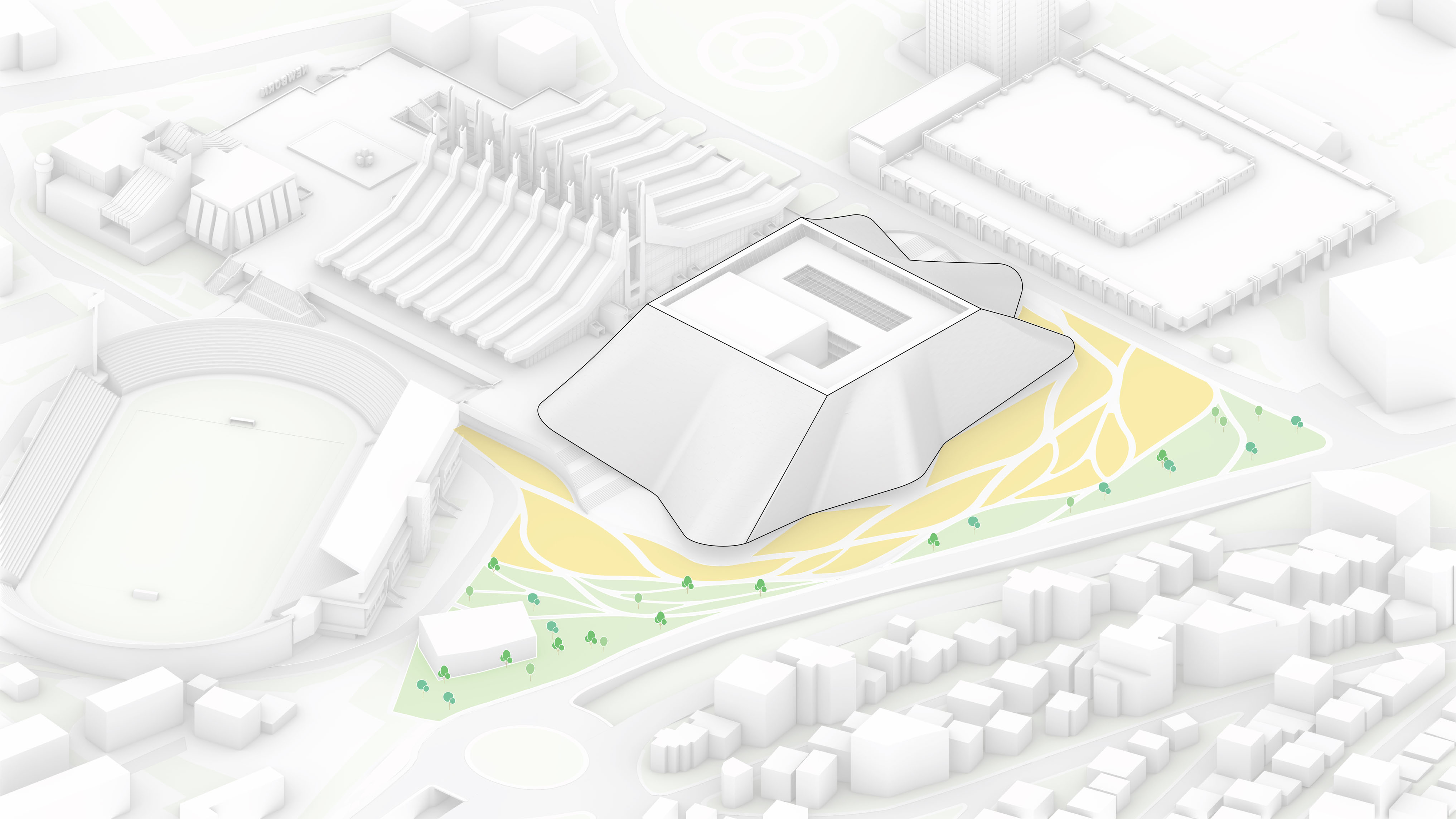 The building’s double curved, precast concrete façade bows inwards to create a generous urban canopy that responds to the ‘shock wave’ of the park’s circular running track, activity pods and planting vignettes – rippling outwards like rings in water to invade the building’s footprint. Visitors and employees can admire the mothballed ships sitting in the adjacent docks while embracing the Central Green Park.