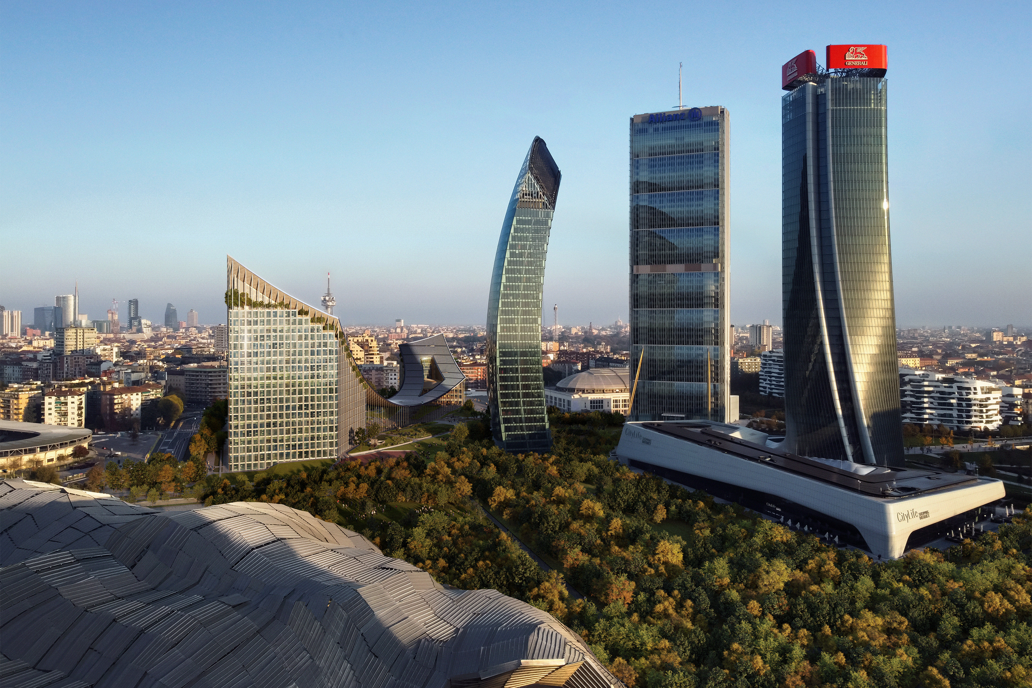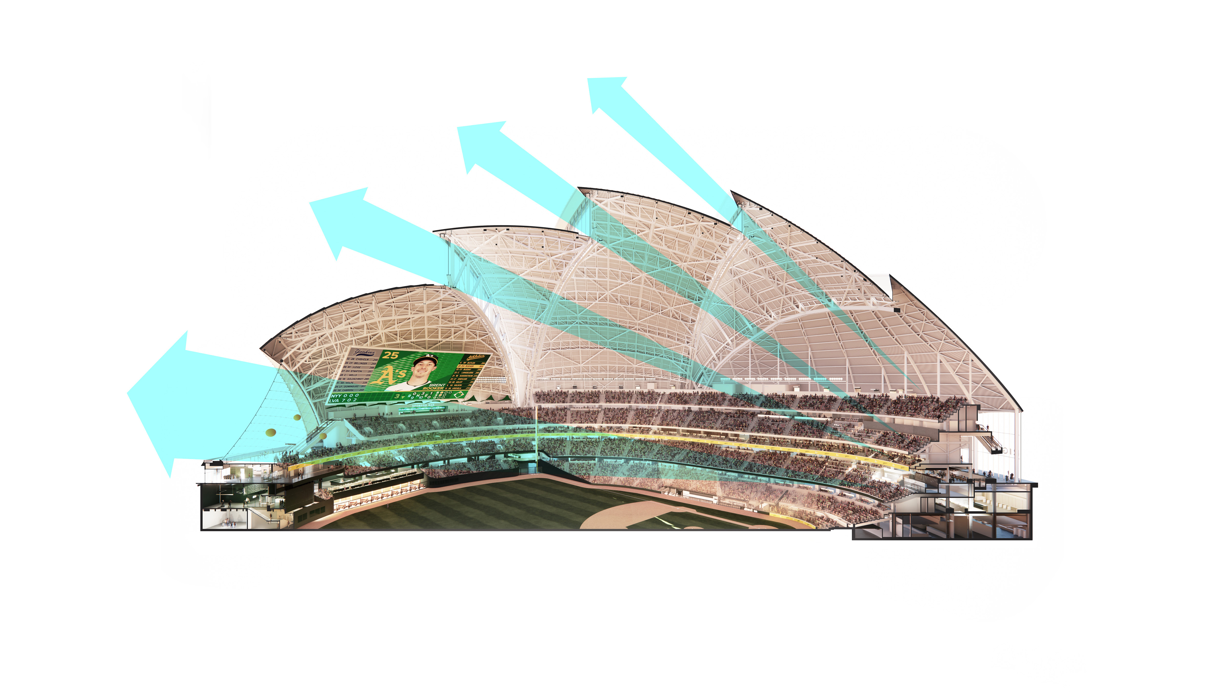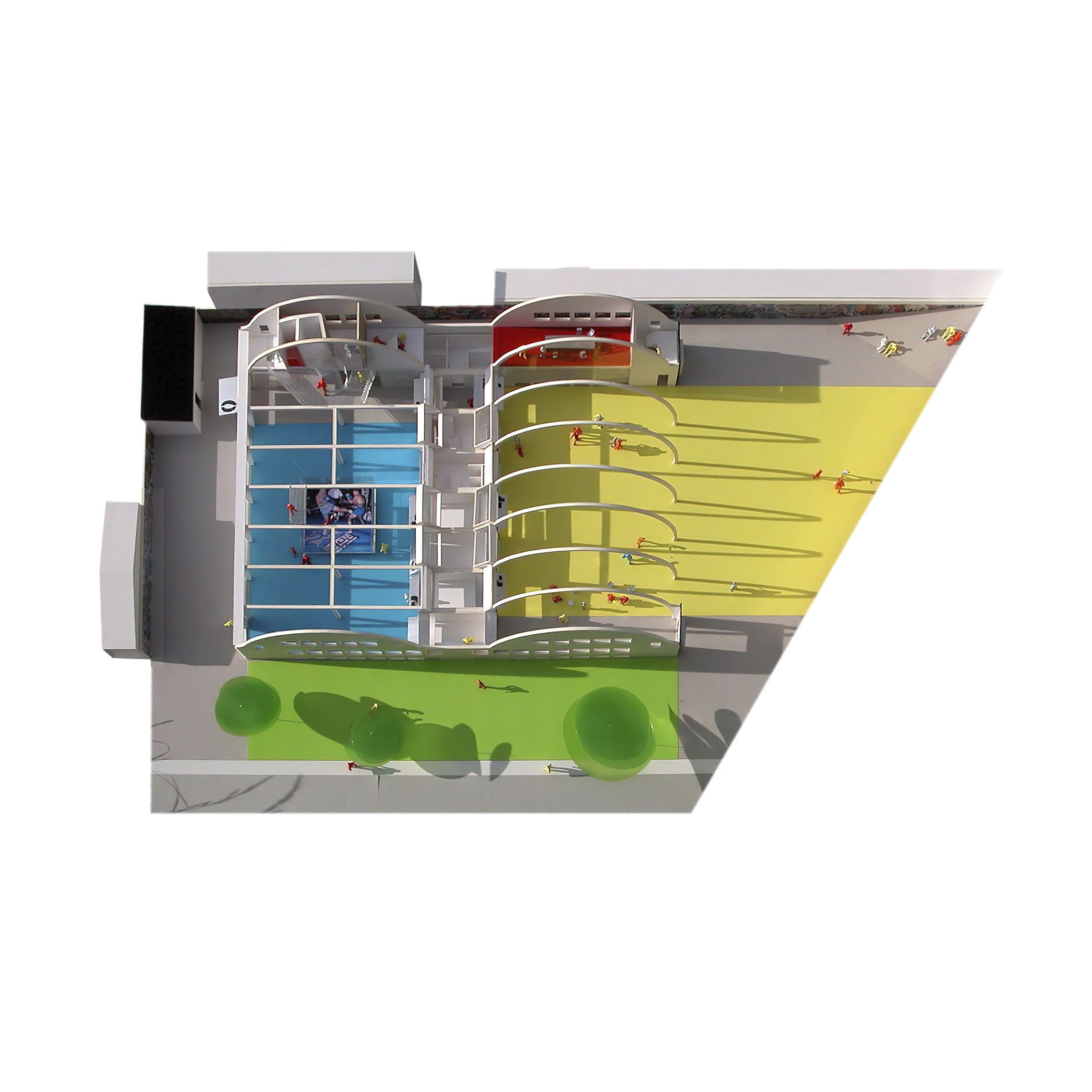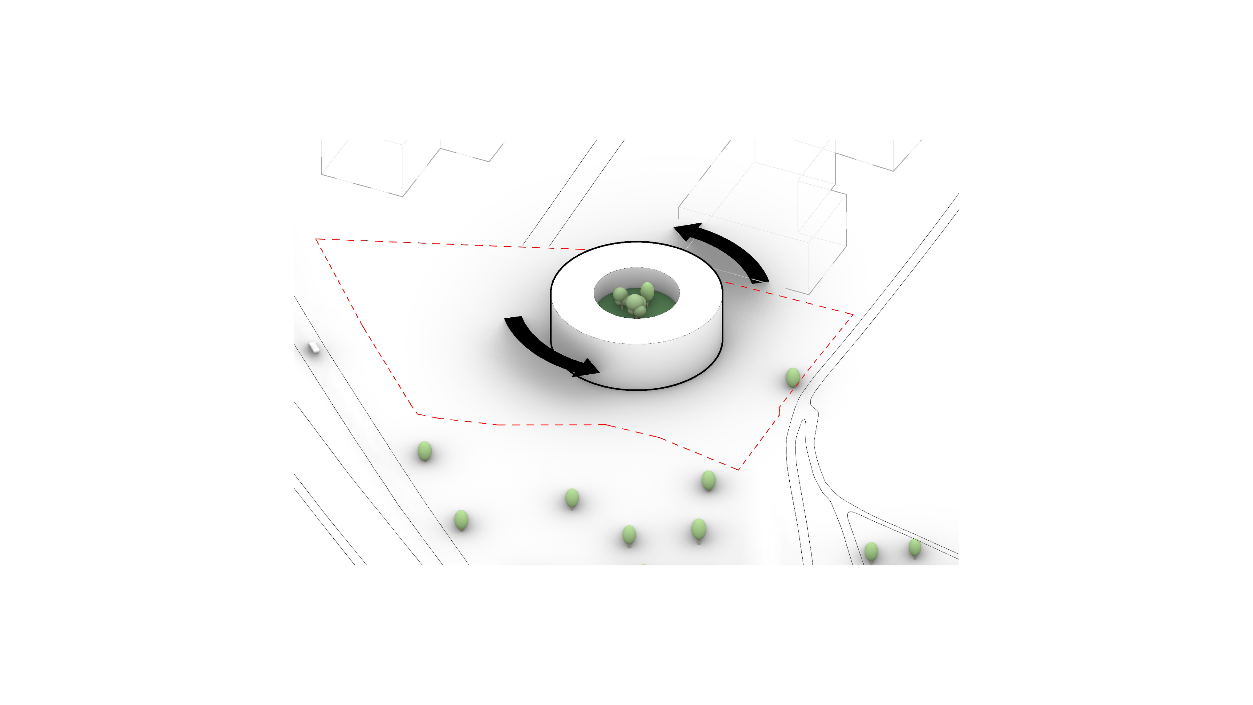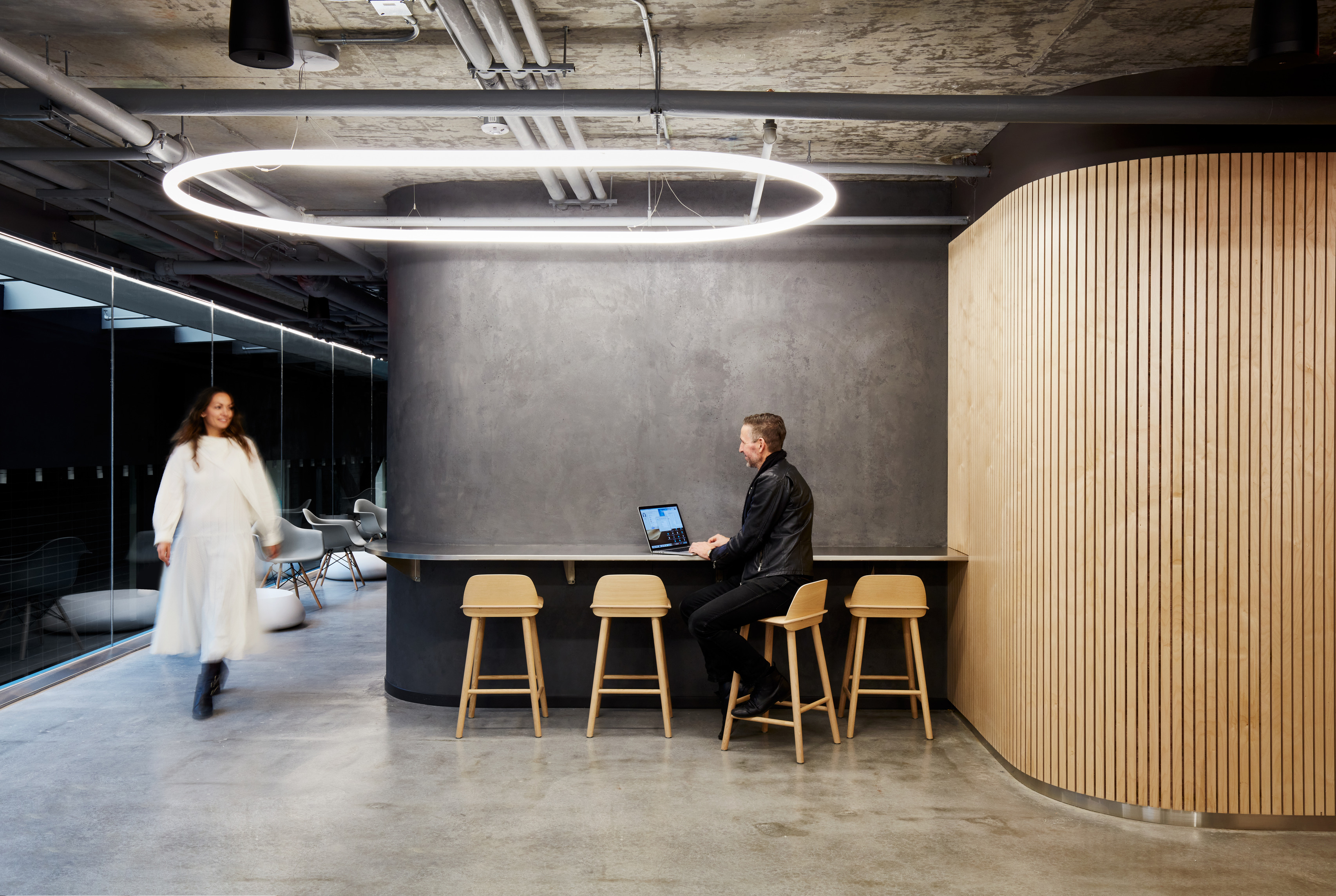 The building’s double curved, precast concrete façade bows inwards to create a generous urban canopy that responds to the ‘shock wave’ of the park’s circular running track, activity pods and planting vignettes – rippling outwards like rings in water to invade the building’s footprint. Visitors and employees can admire the mothballed ships sitting in the adjacent docks while embracing the Central Green Park.