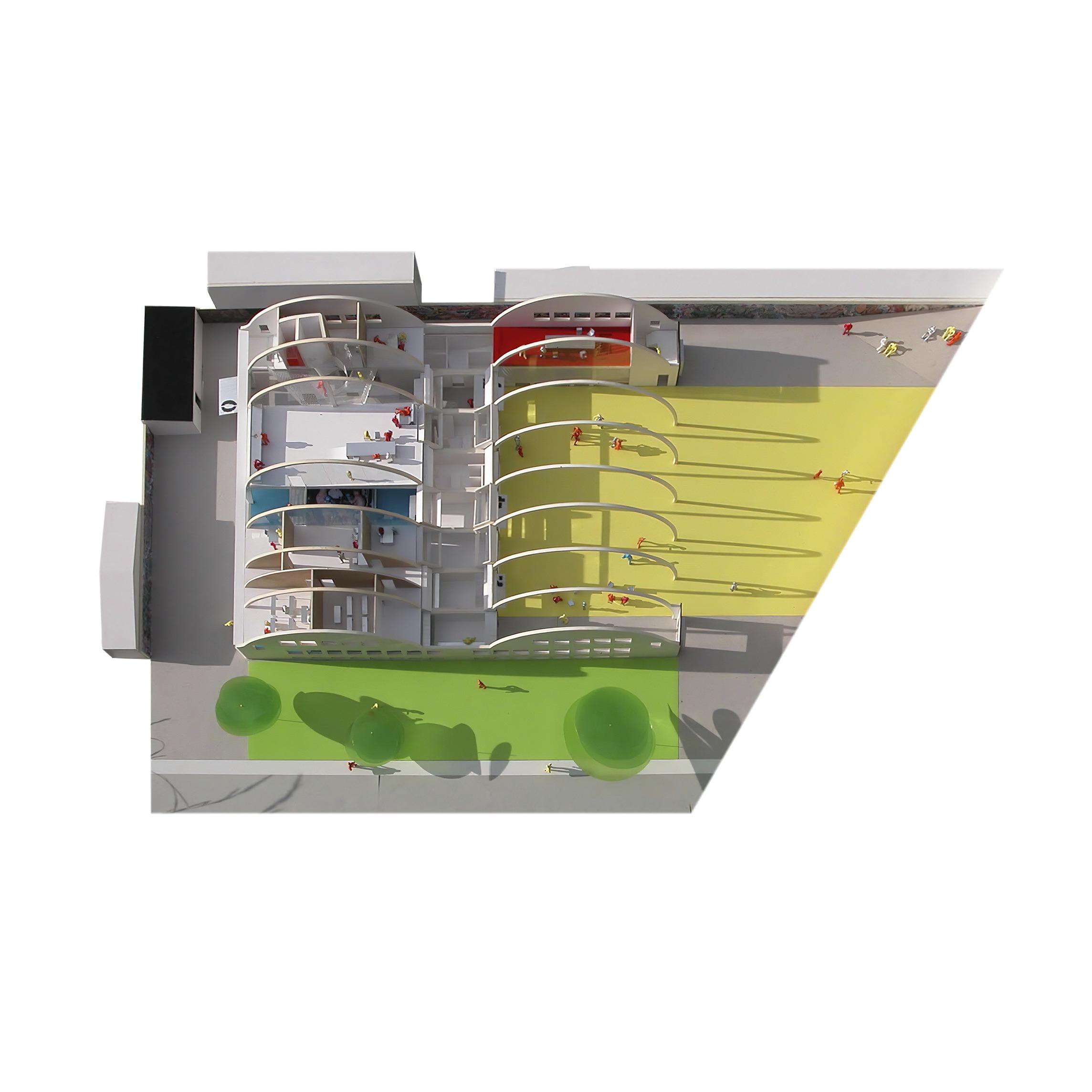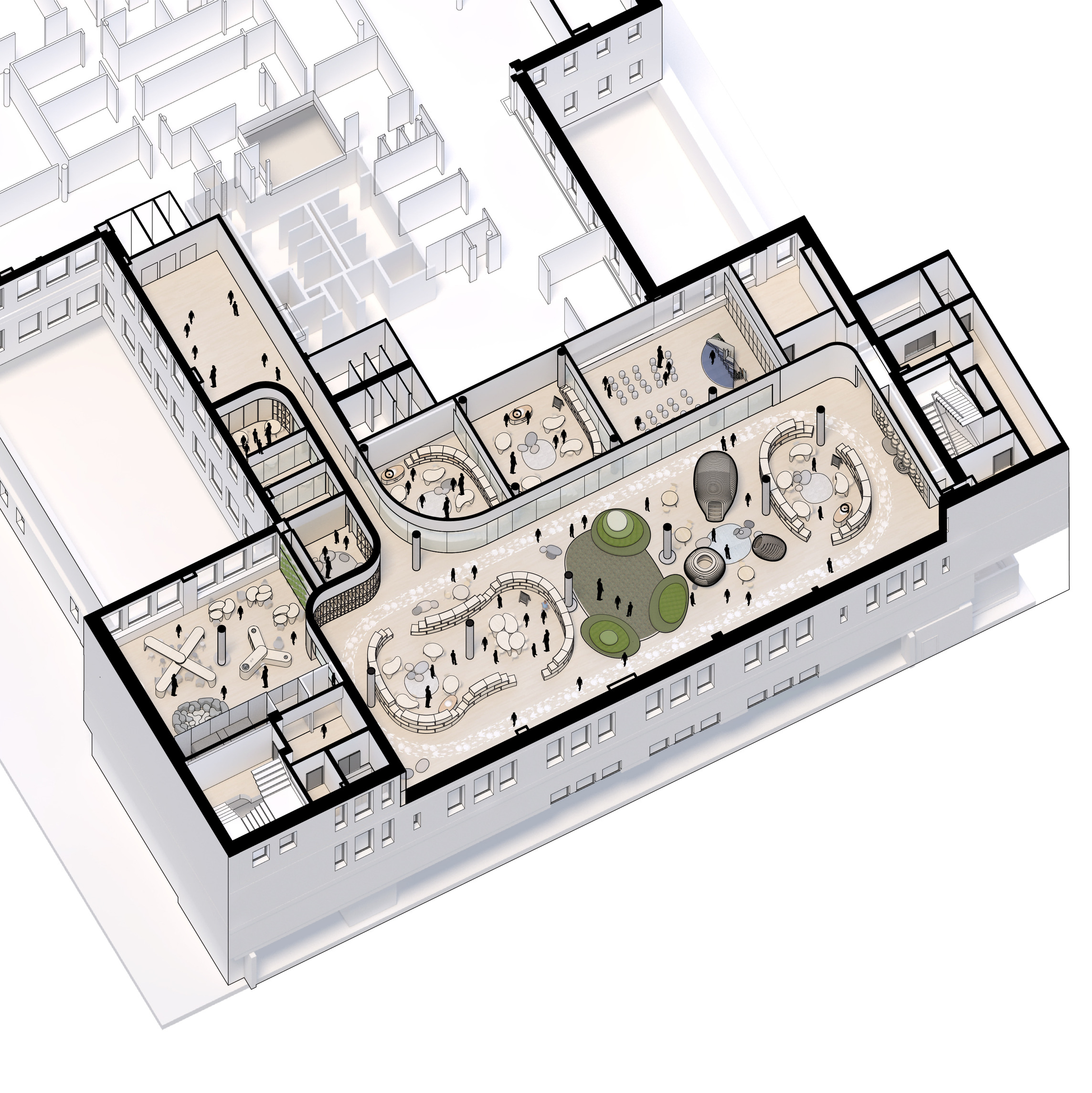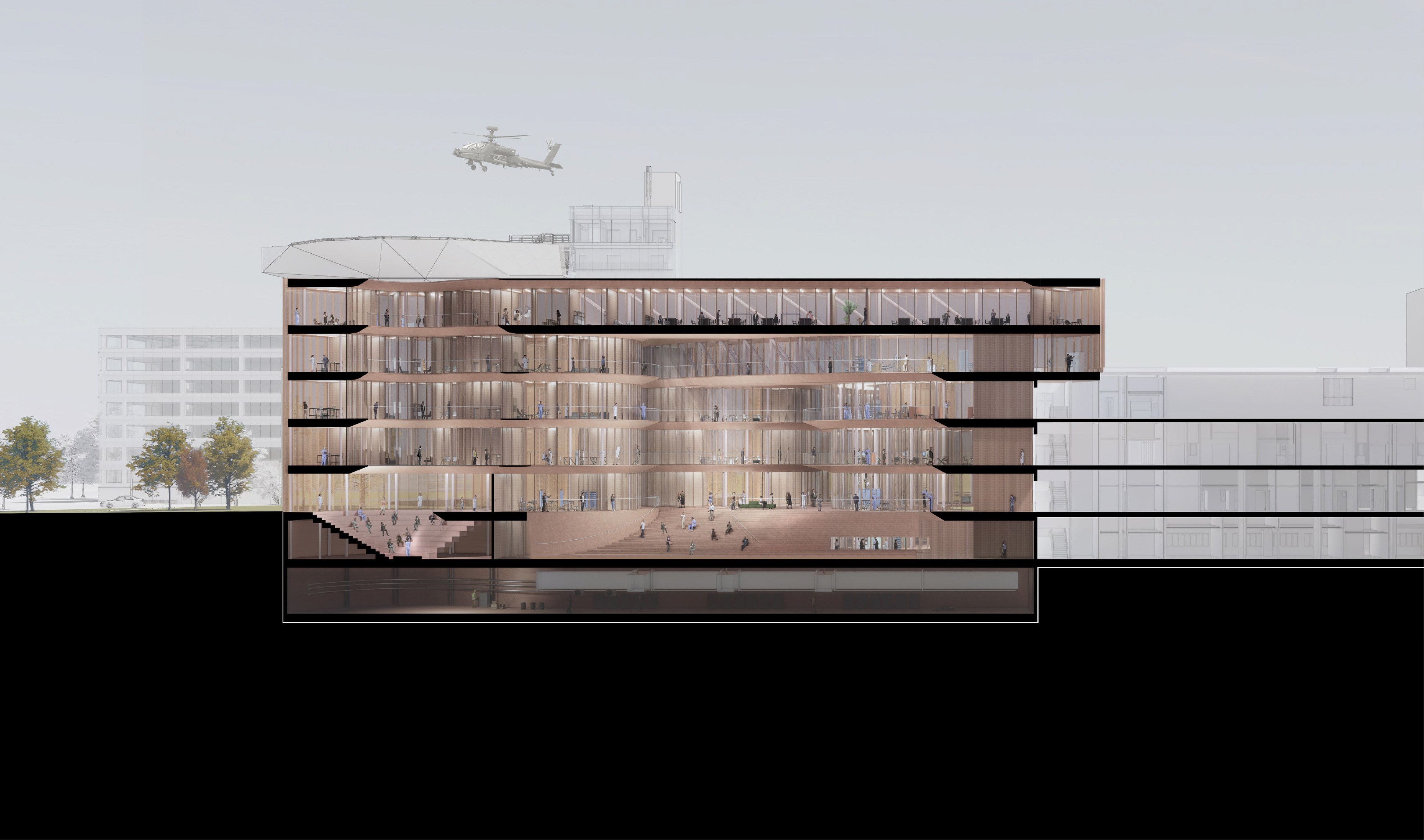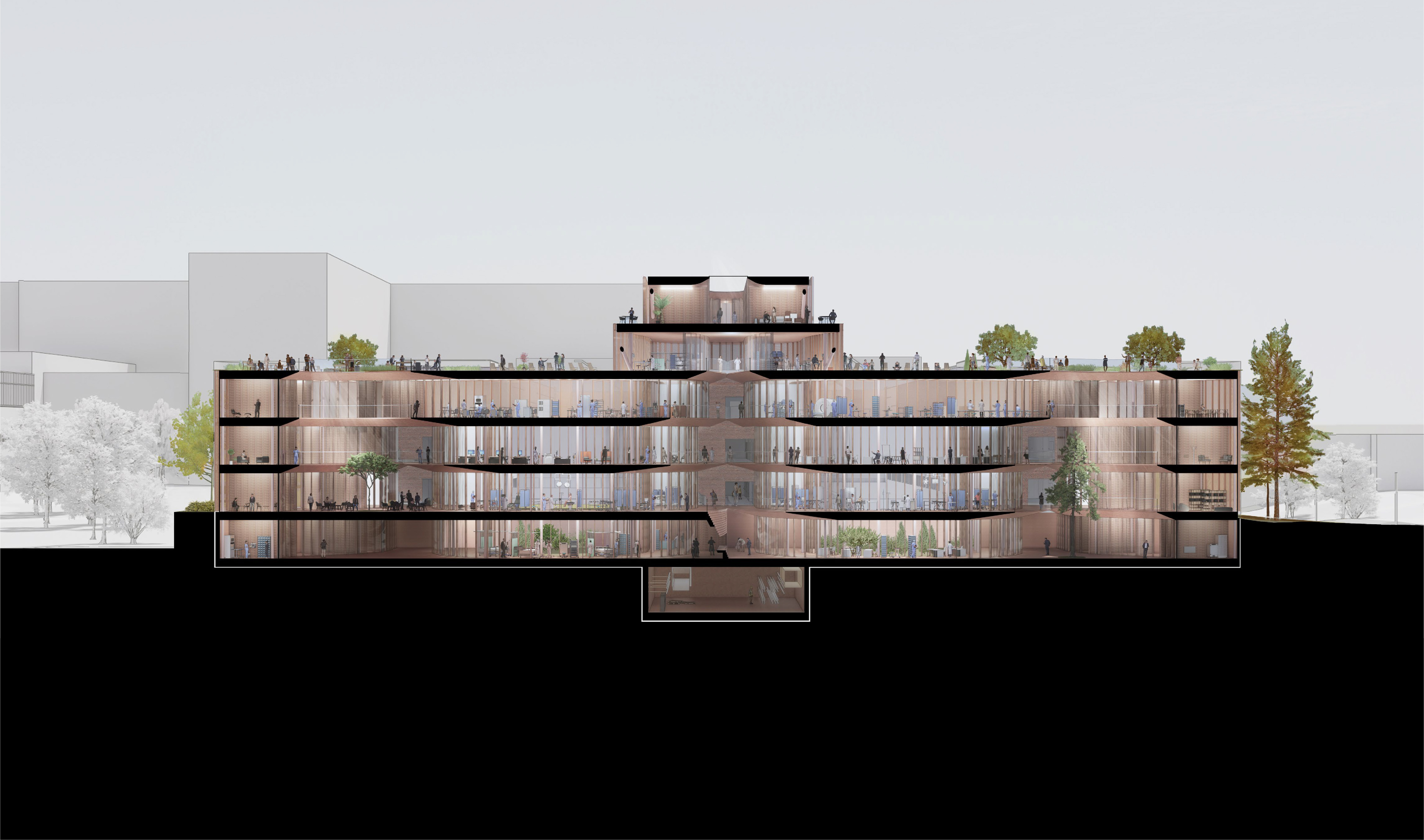 The design of the hospital minimizes walking distance across the building, and at the same time provides individual sections with a maximum of autonomy and intimate spaces.