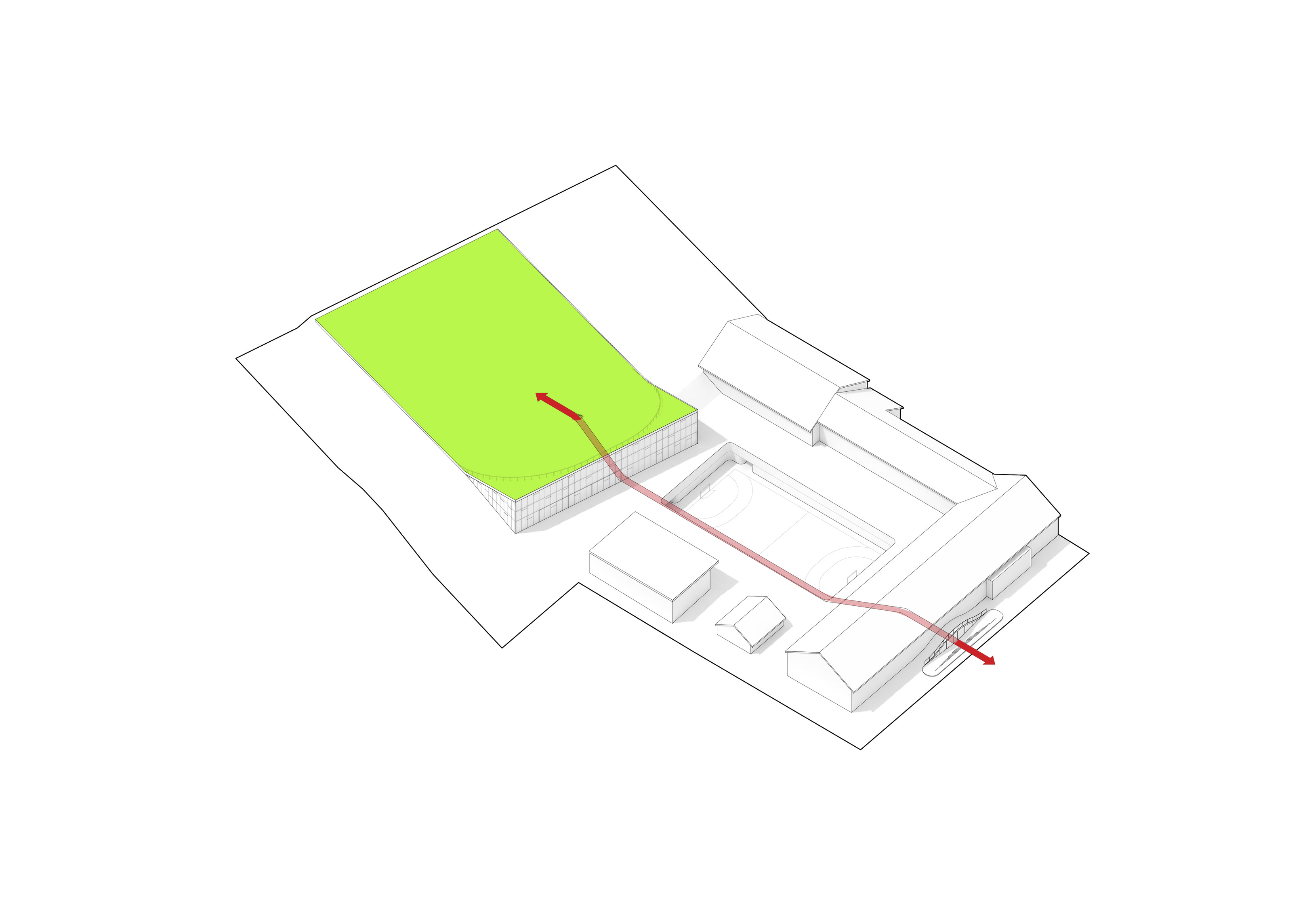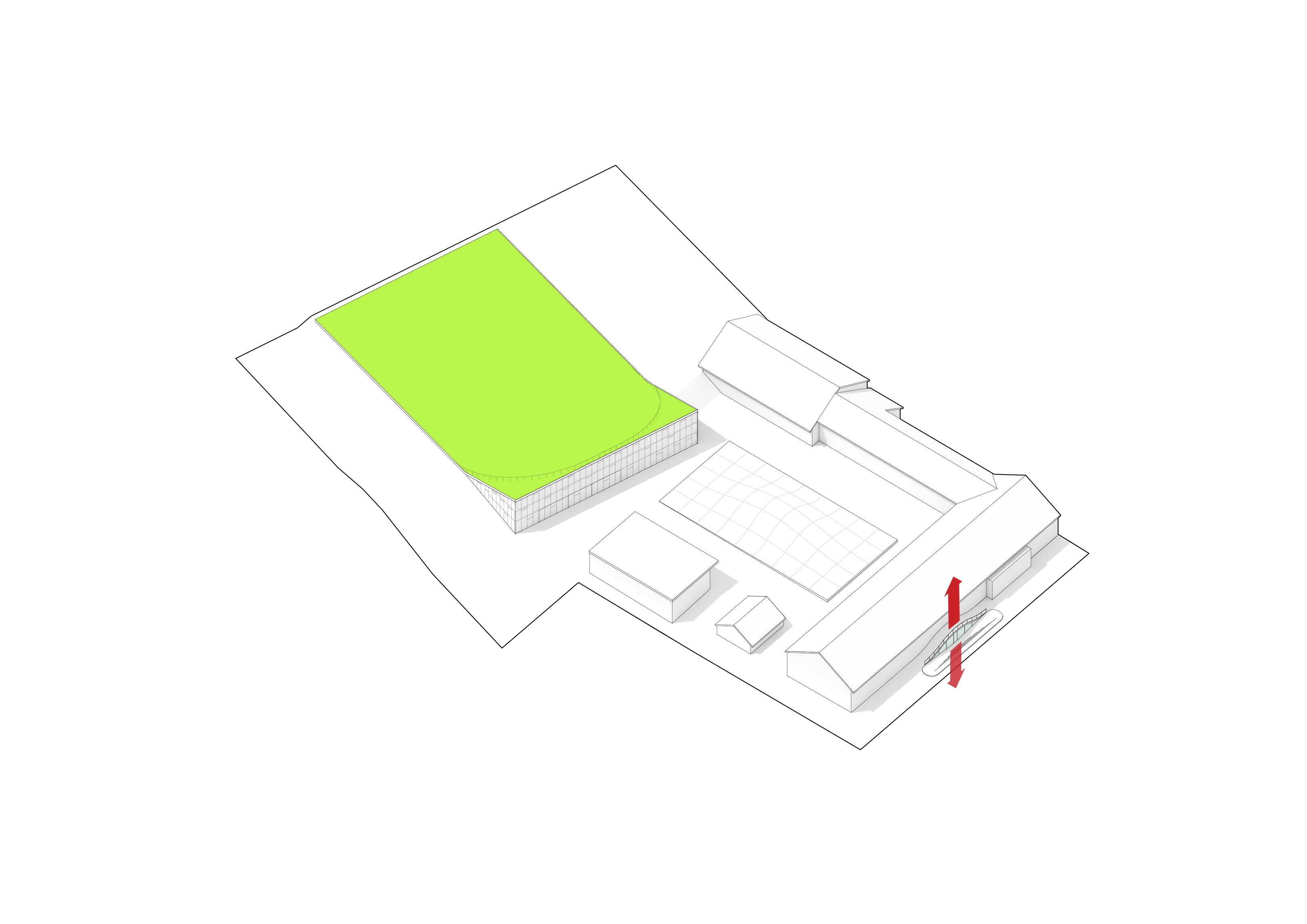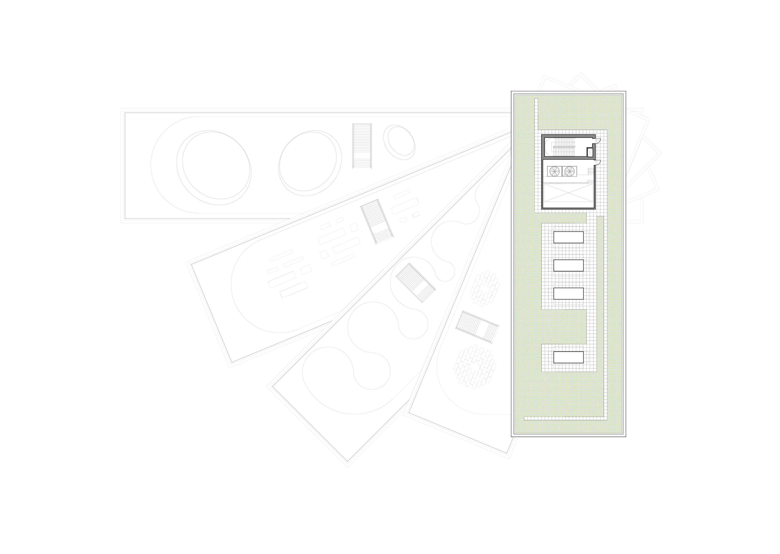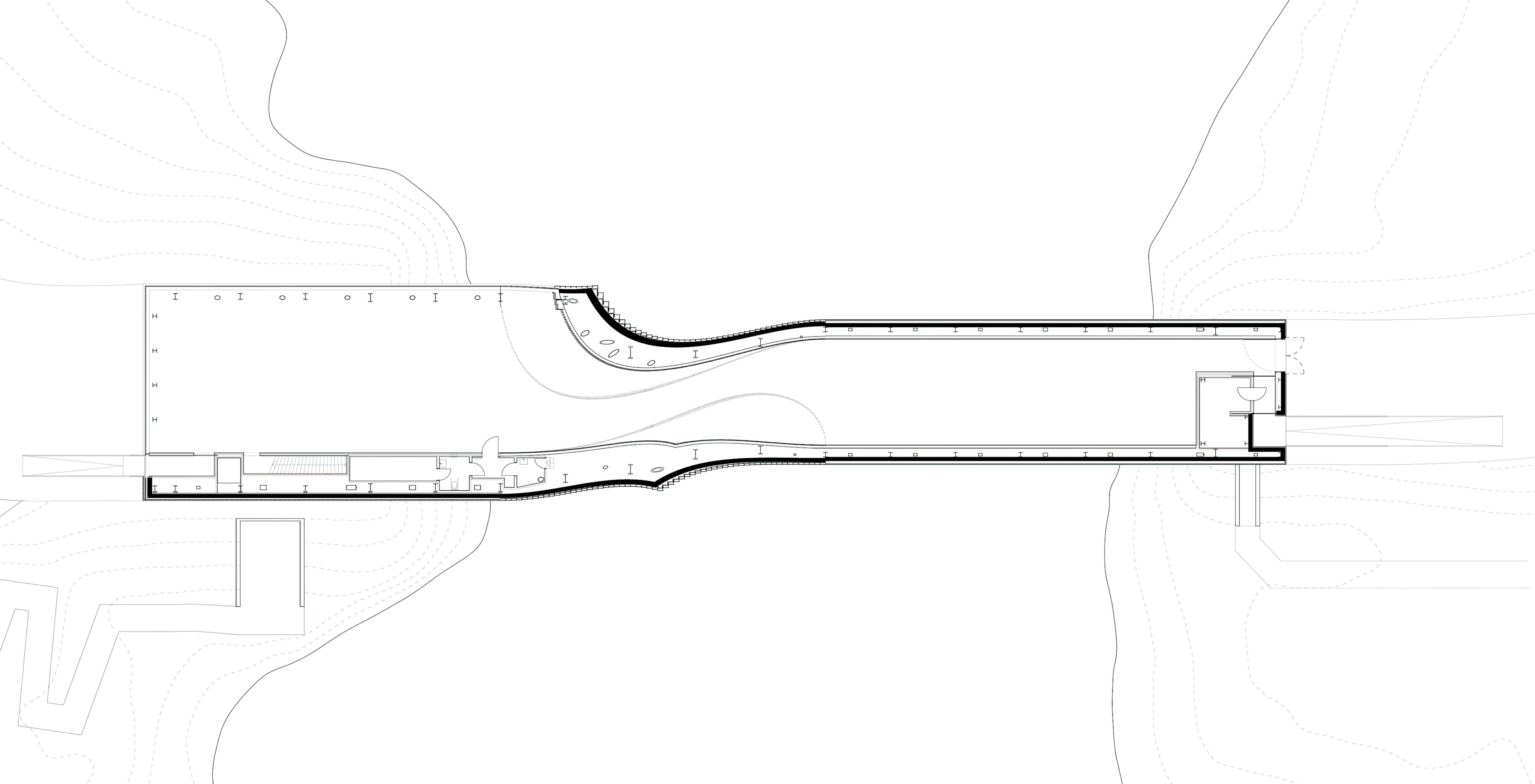 The roof construction of the building is a key element in the clinic’s contextual disguise. In places where the building is half rooted underground the green lawn slips over the roof, making the clinic a natural environment for the cure of mental illness.