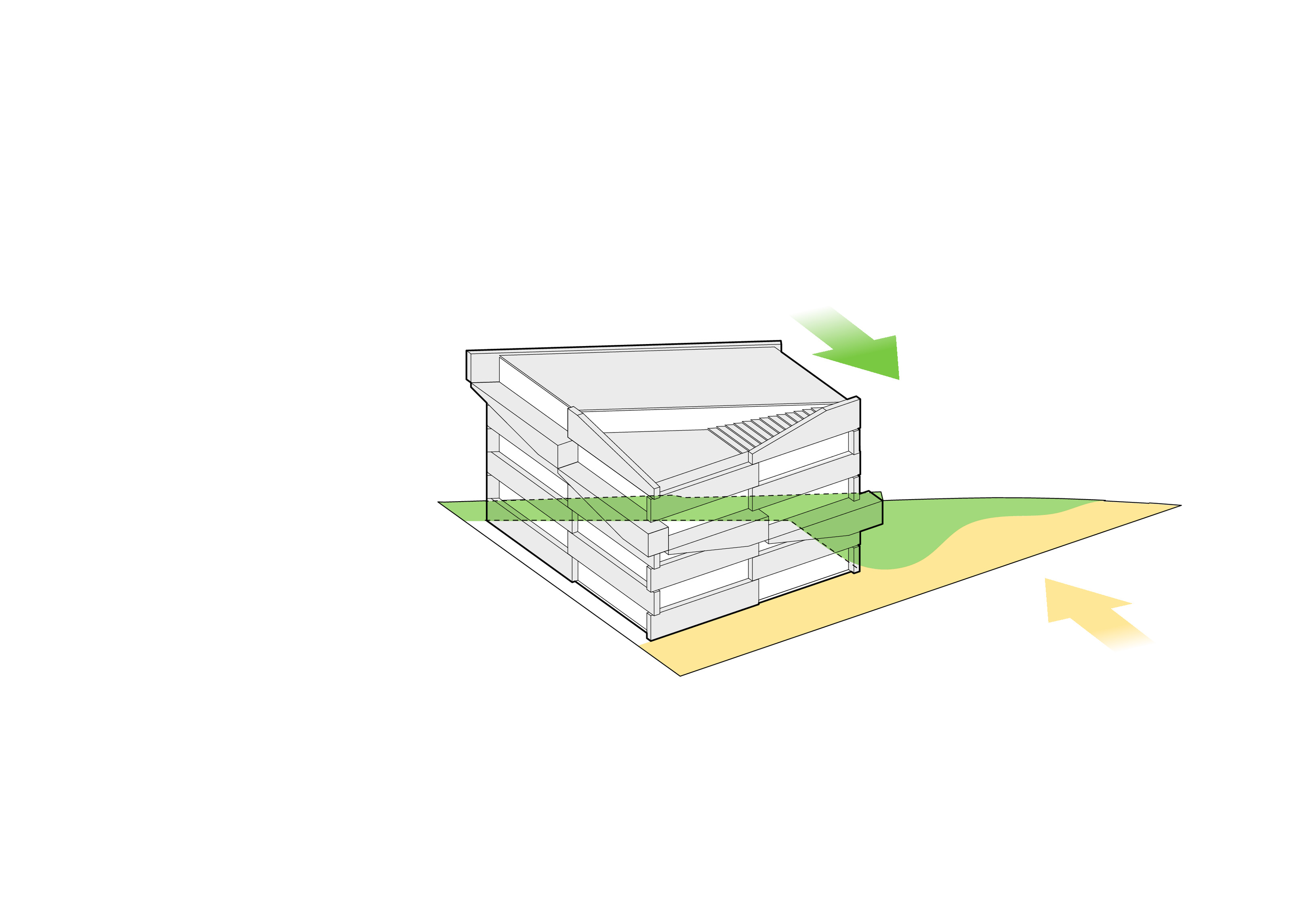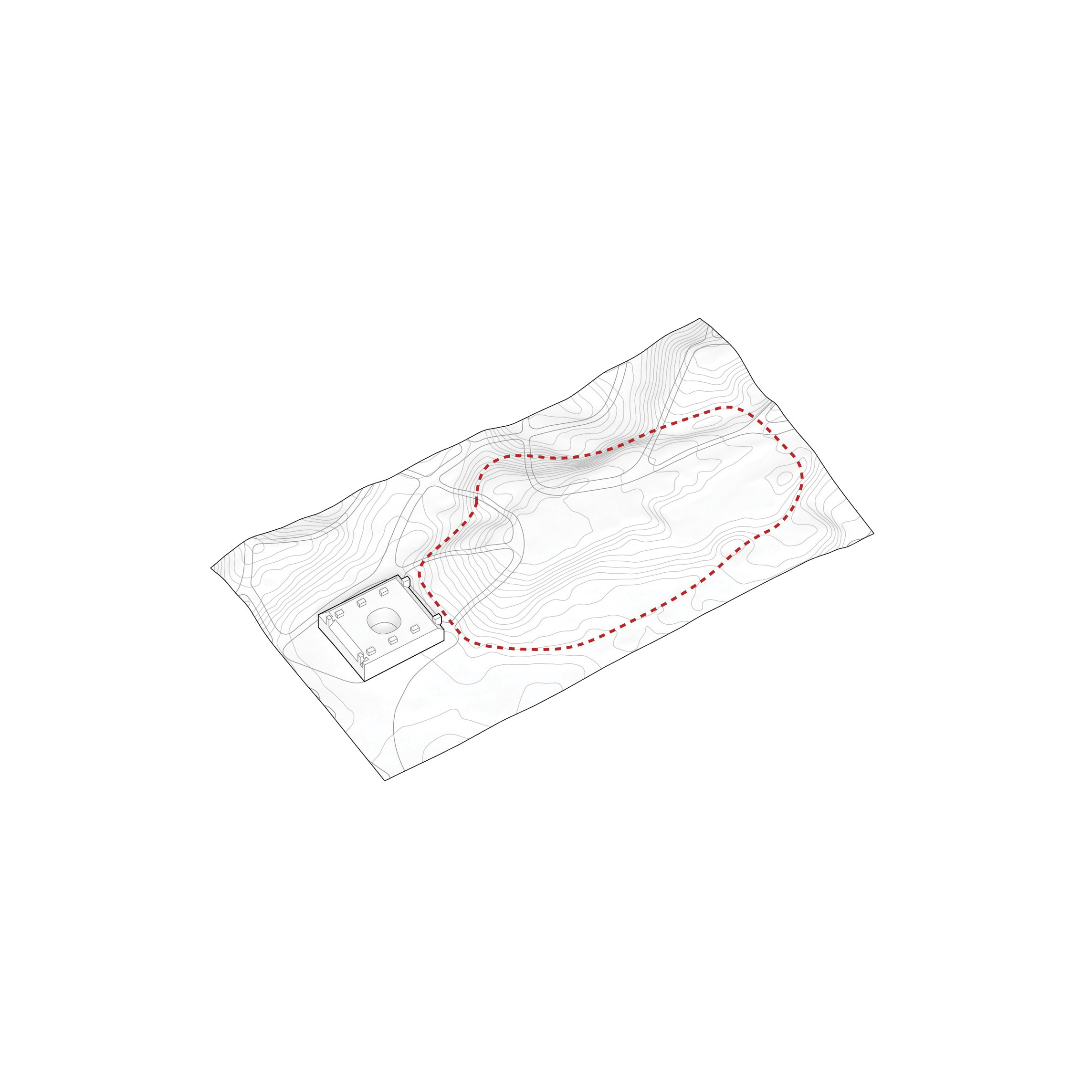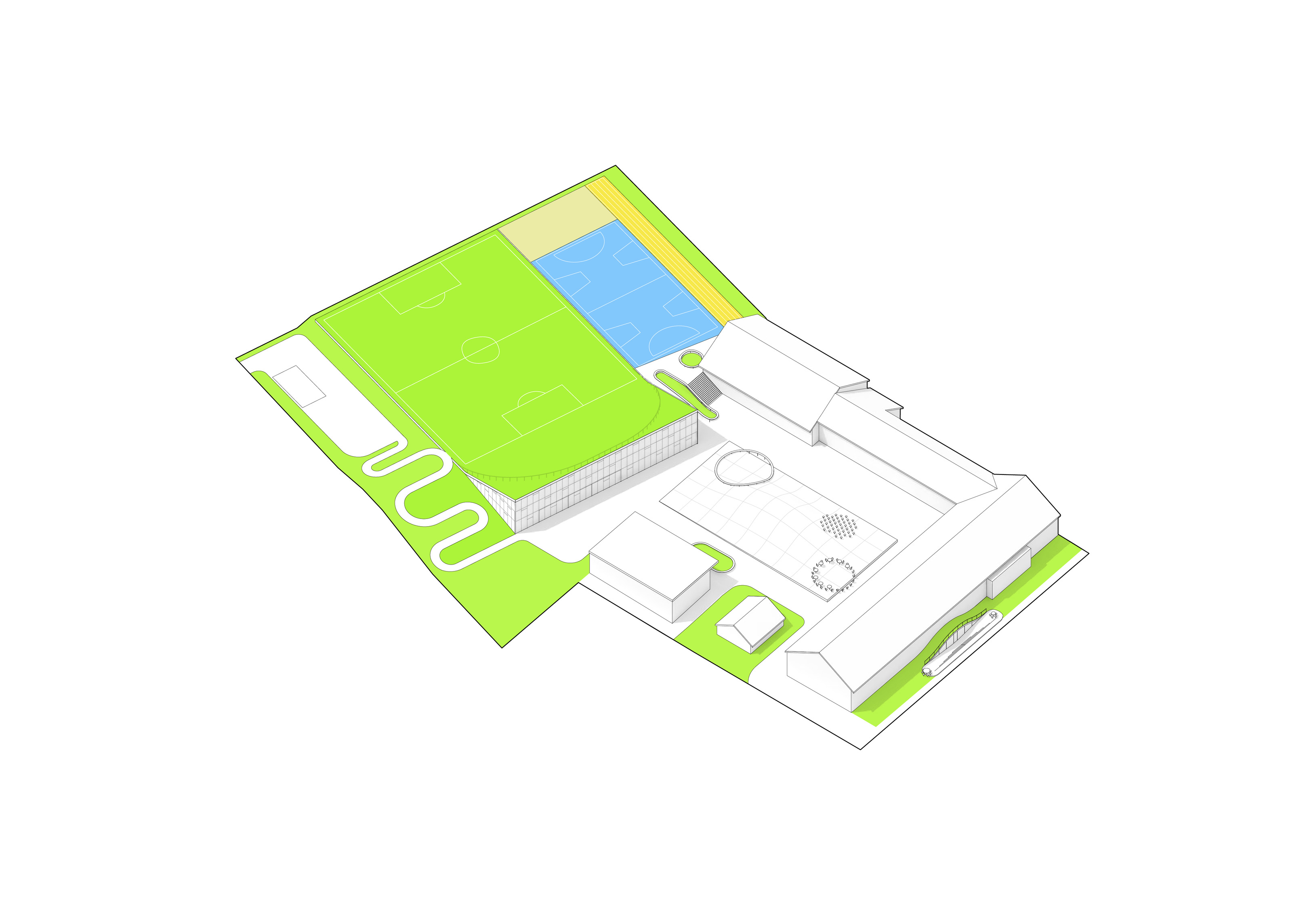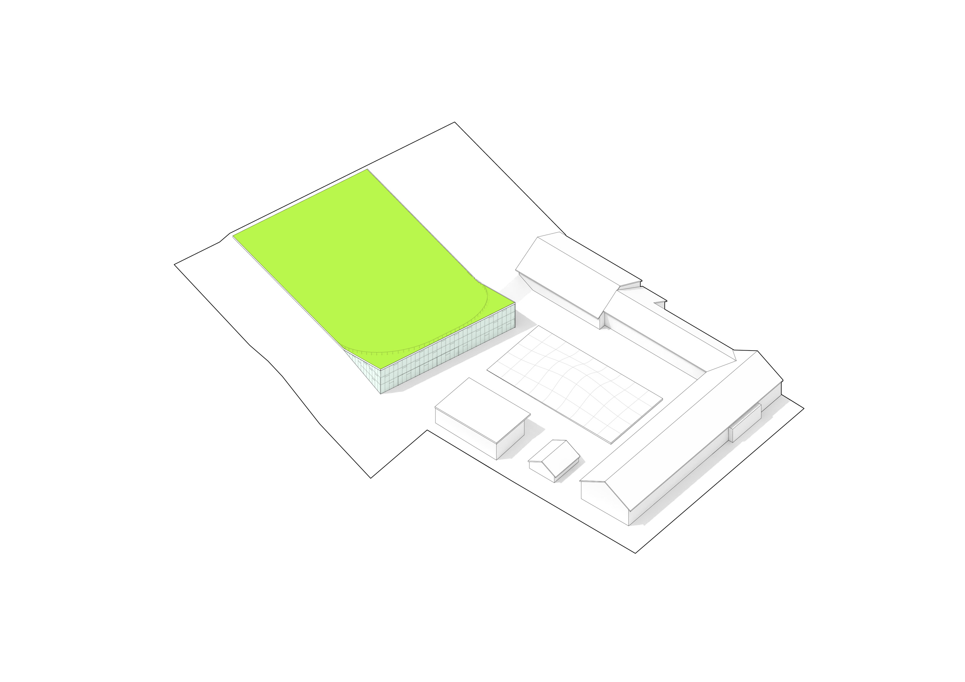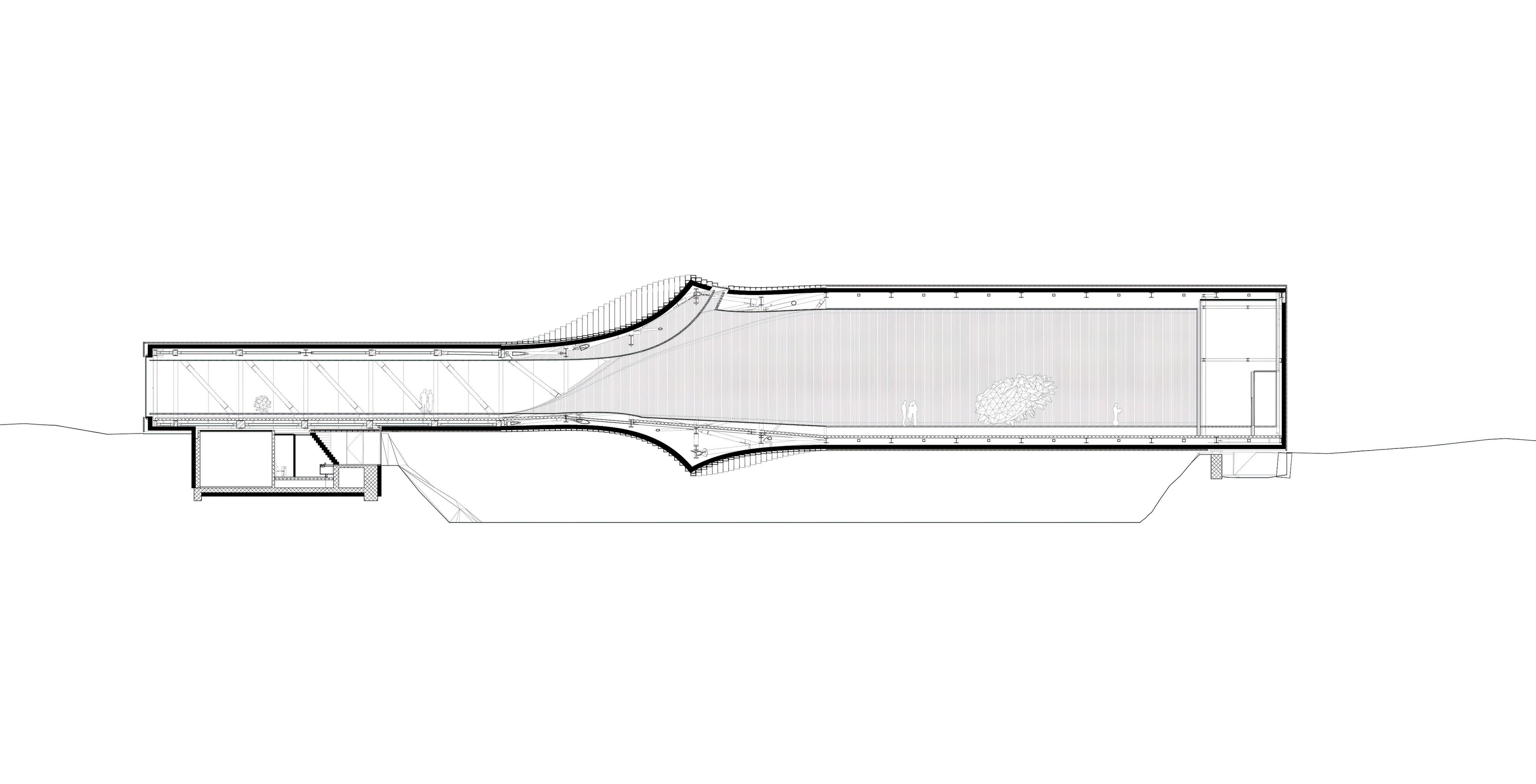 The roof construction of the building is a key element in the clinic’s contextual disguise. In places where the building is half rooted underground the green lawn slips over the roof, making the clinic a natural environment for the cure of mental illness.